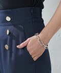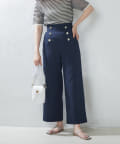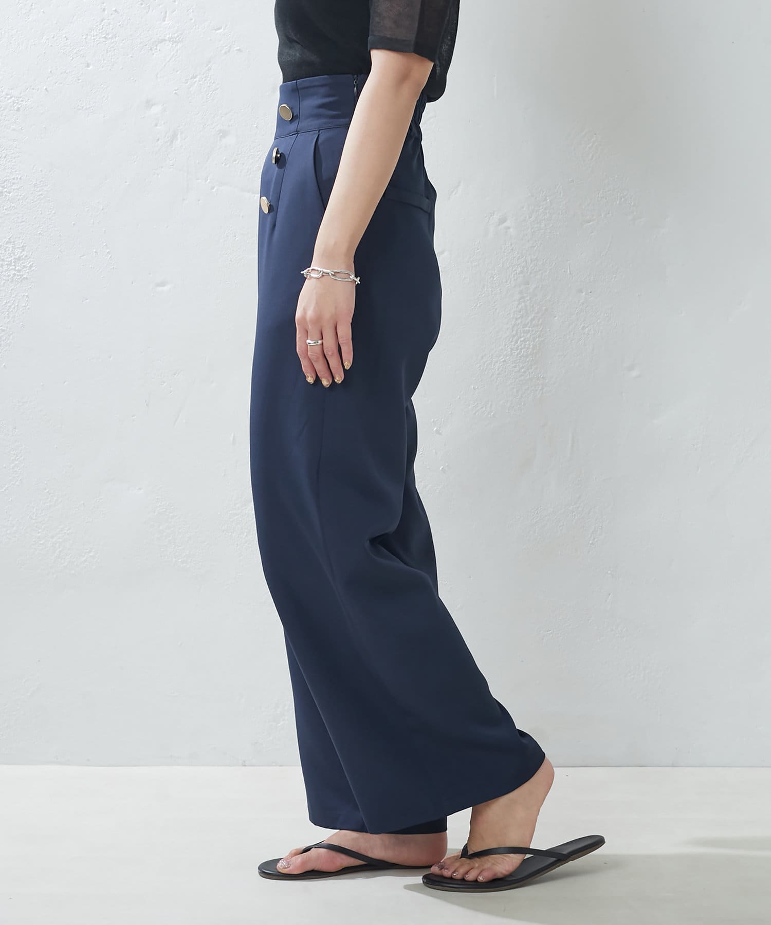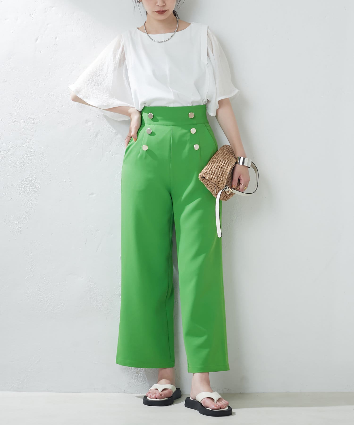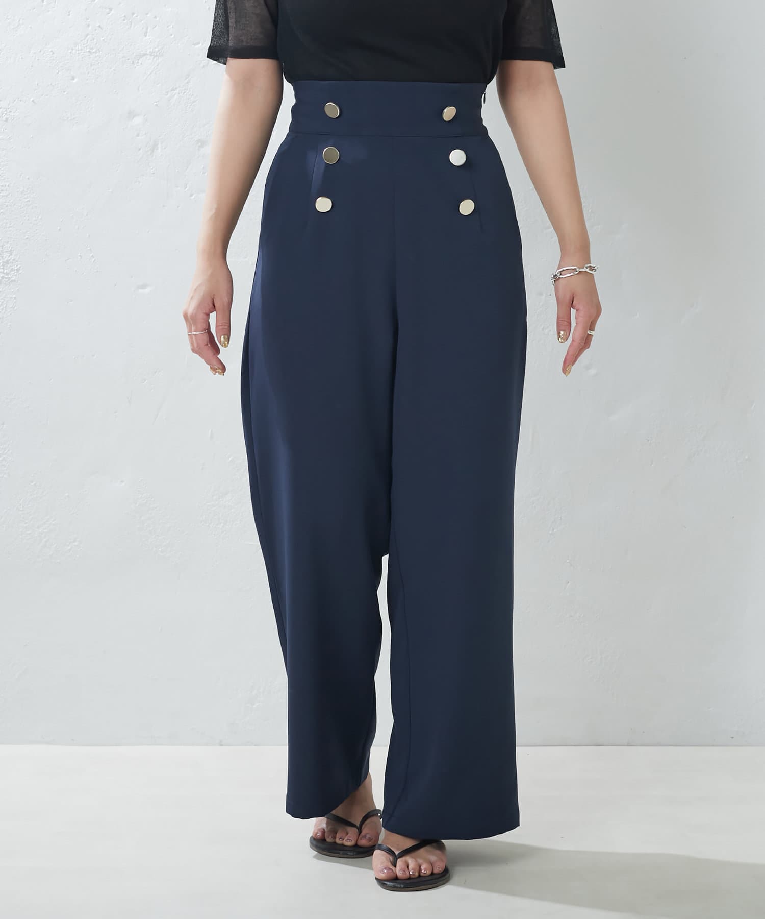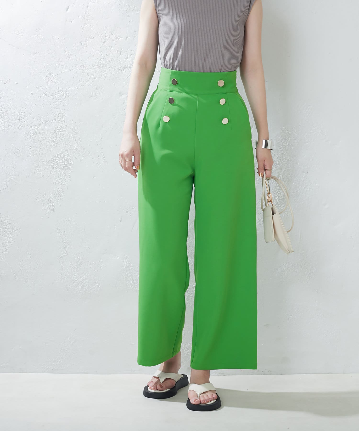 フロントに金ボタンがついているので、シンプルなトップスと合わせてもスタイリングが決まります。