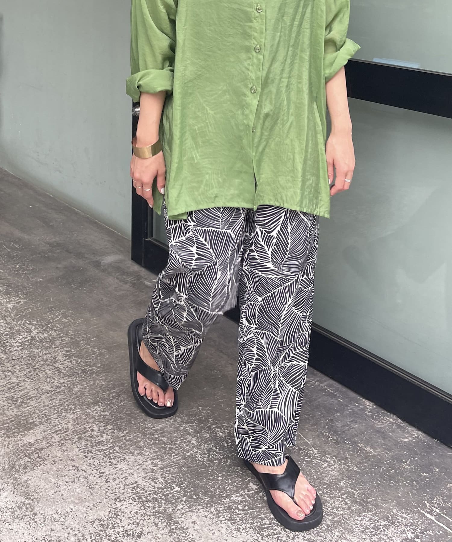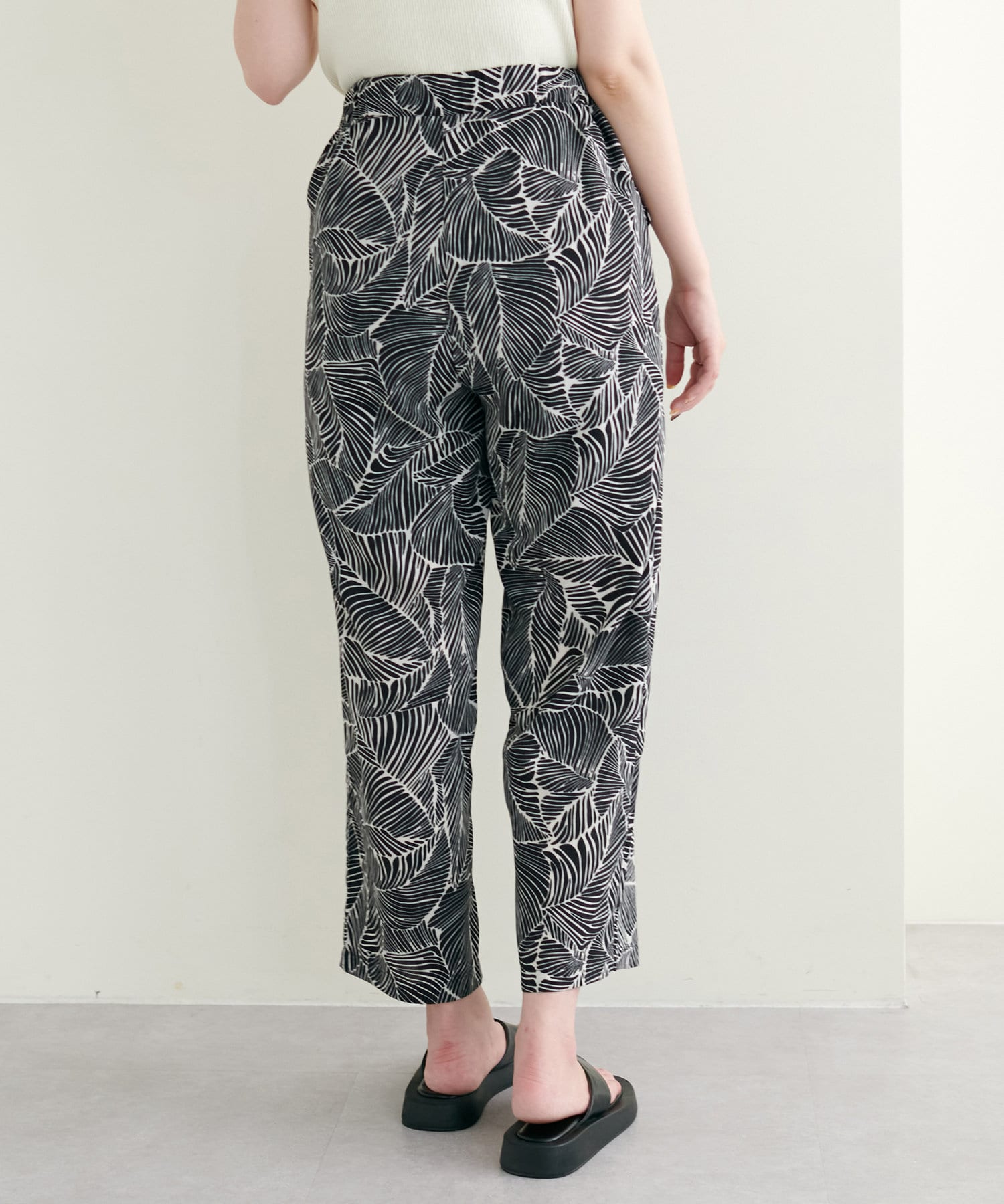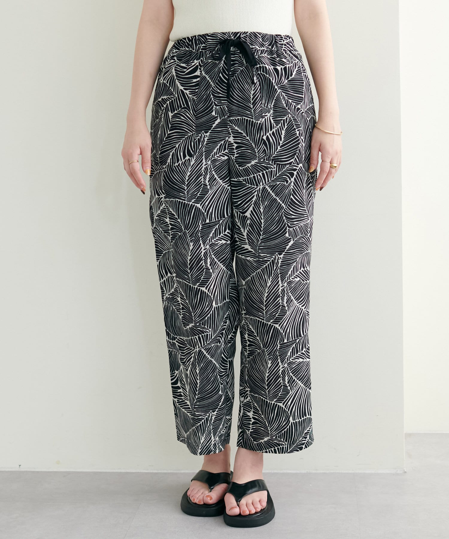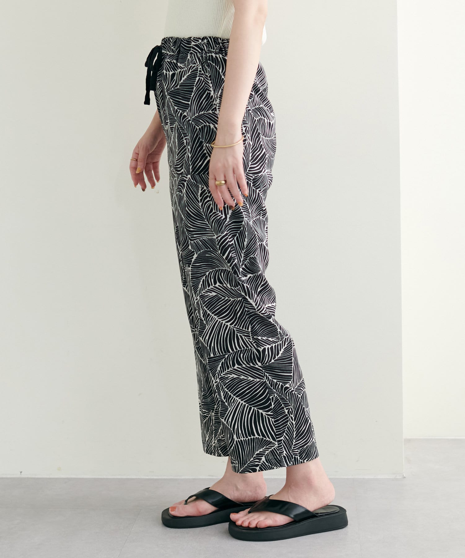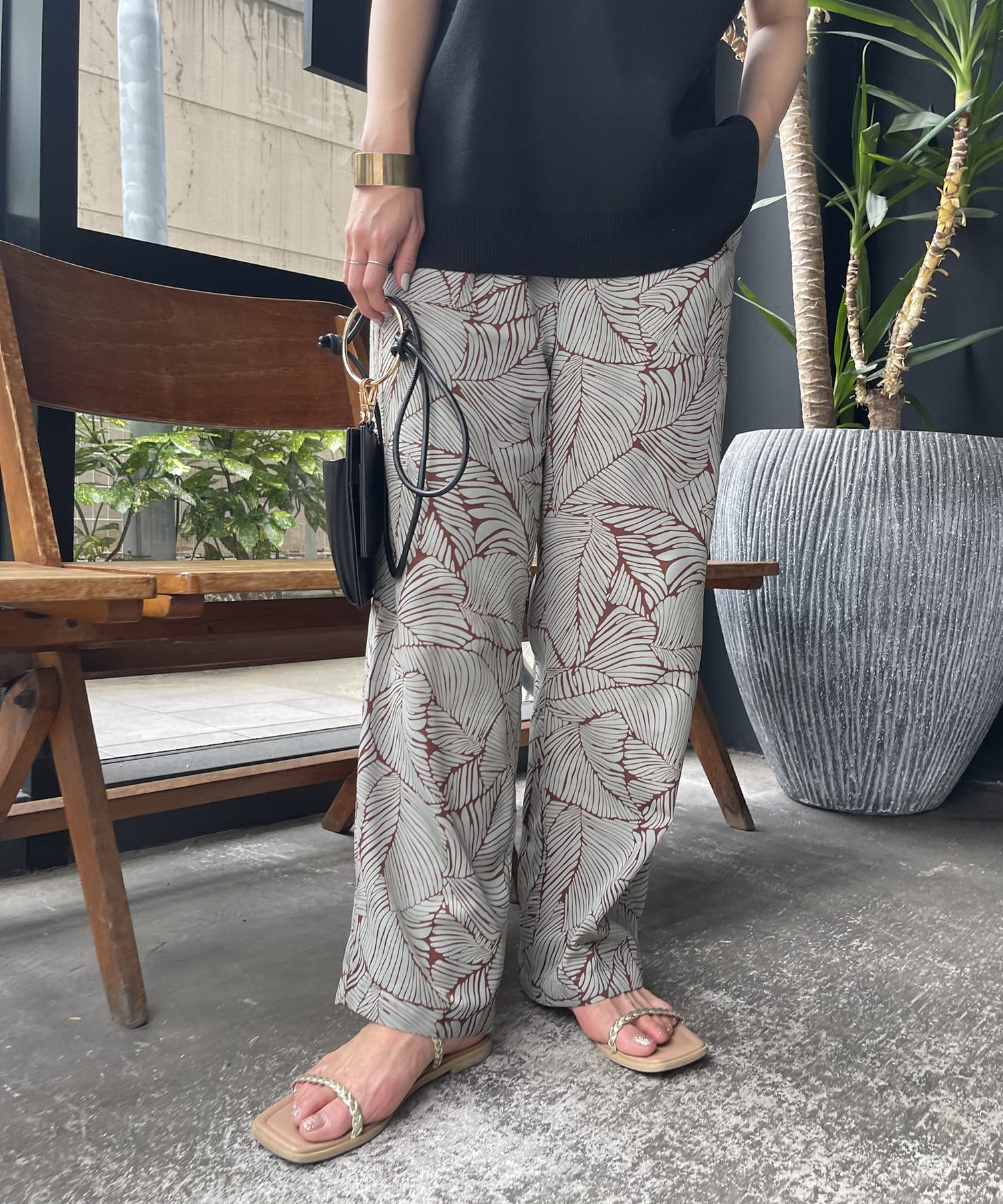 リゾートライクなボタニカルリーフ柄が目を惹くパンツ
