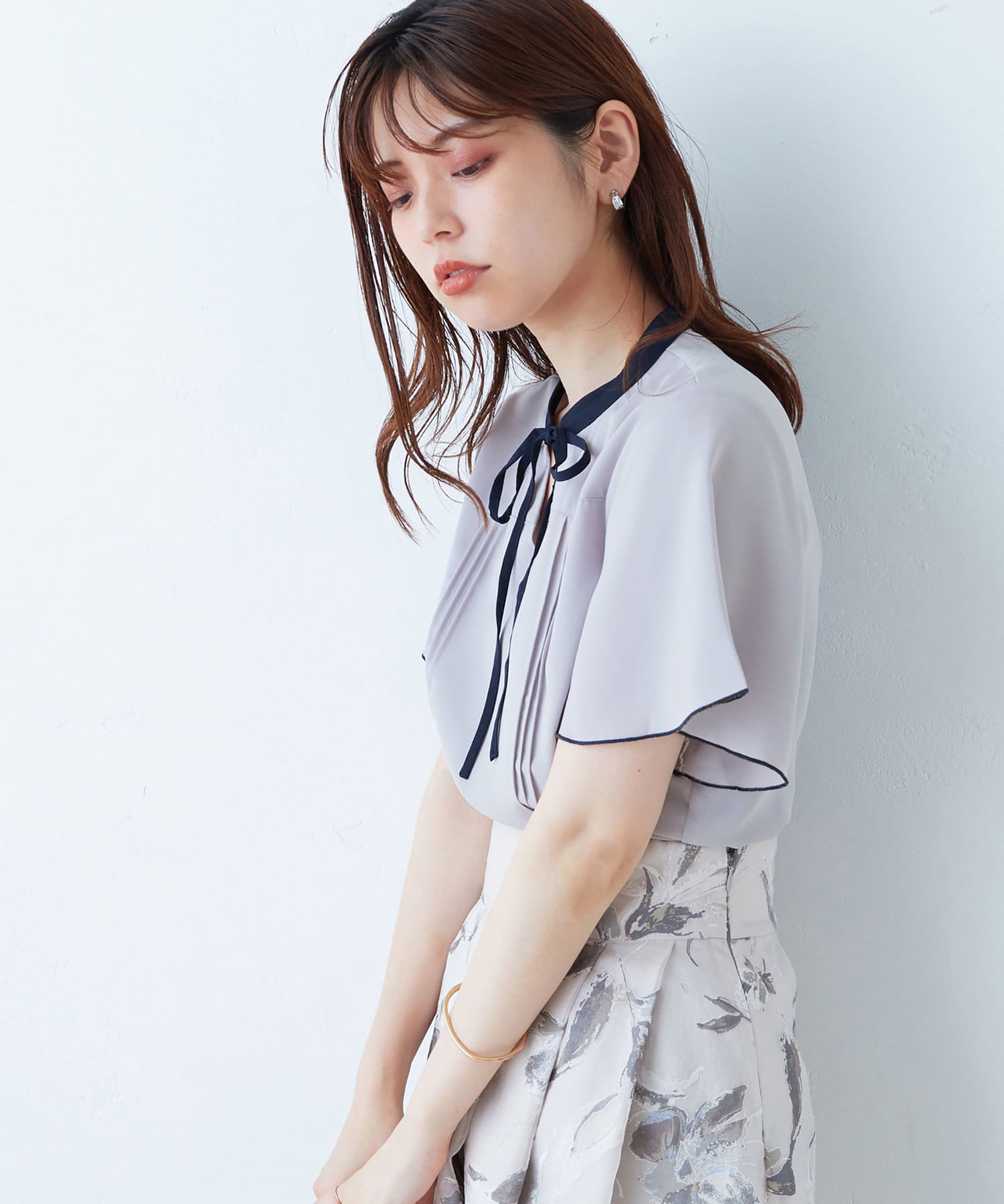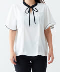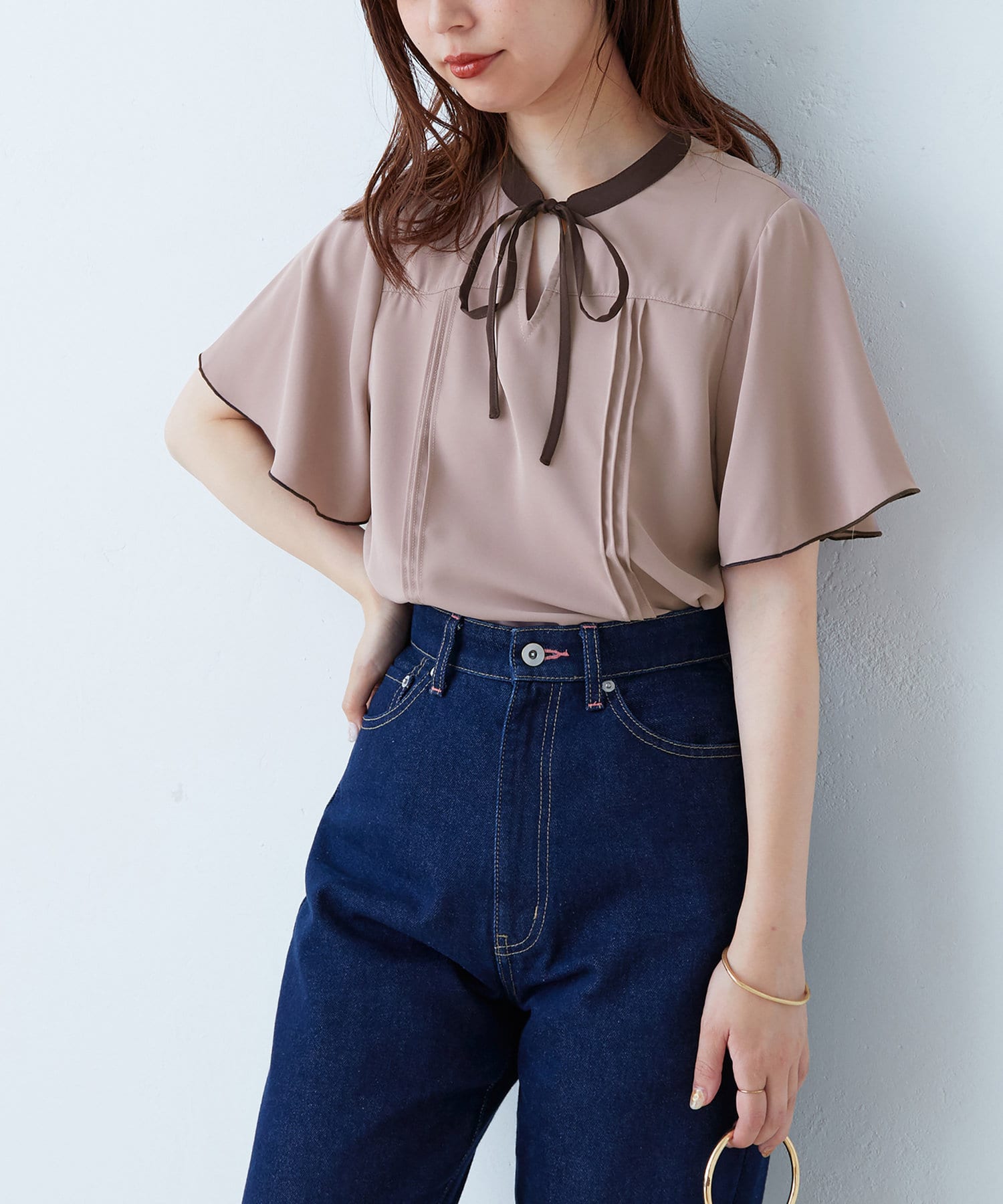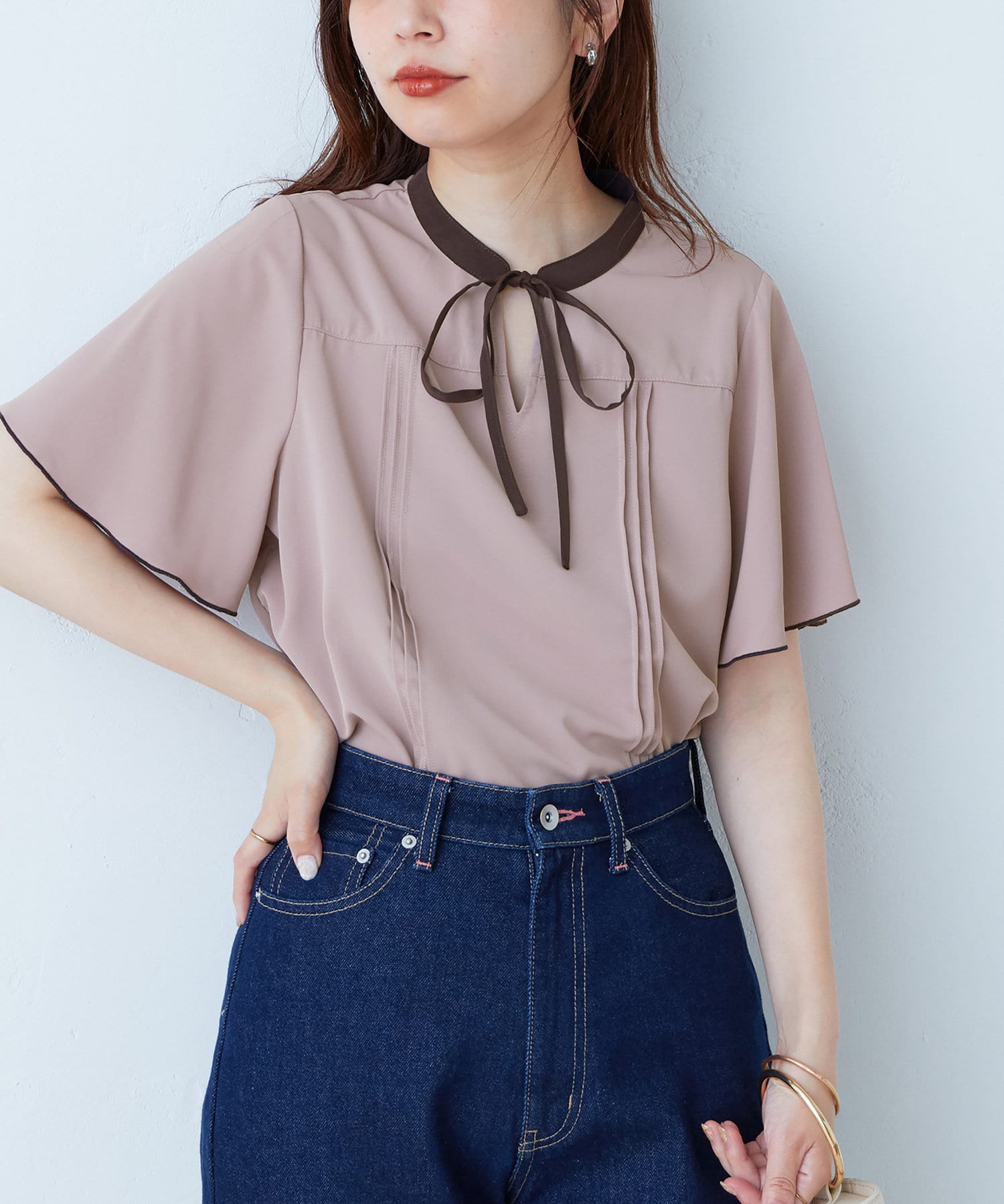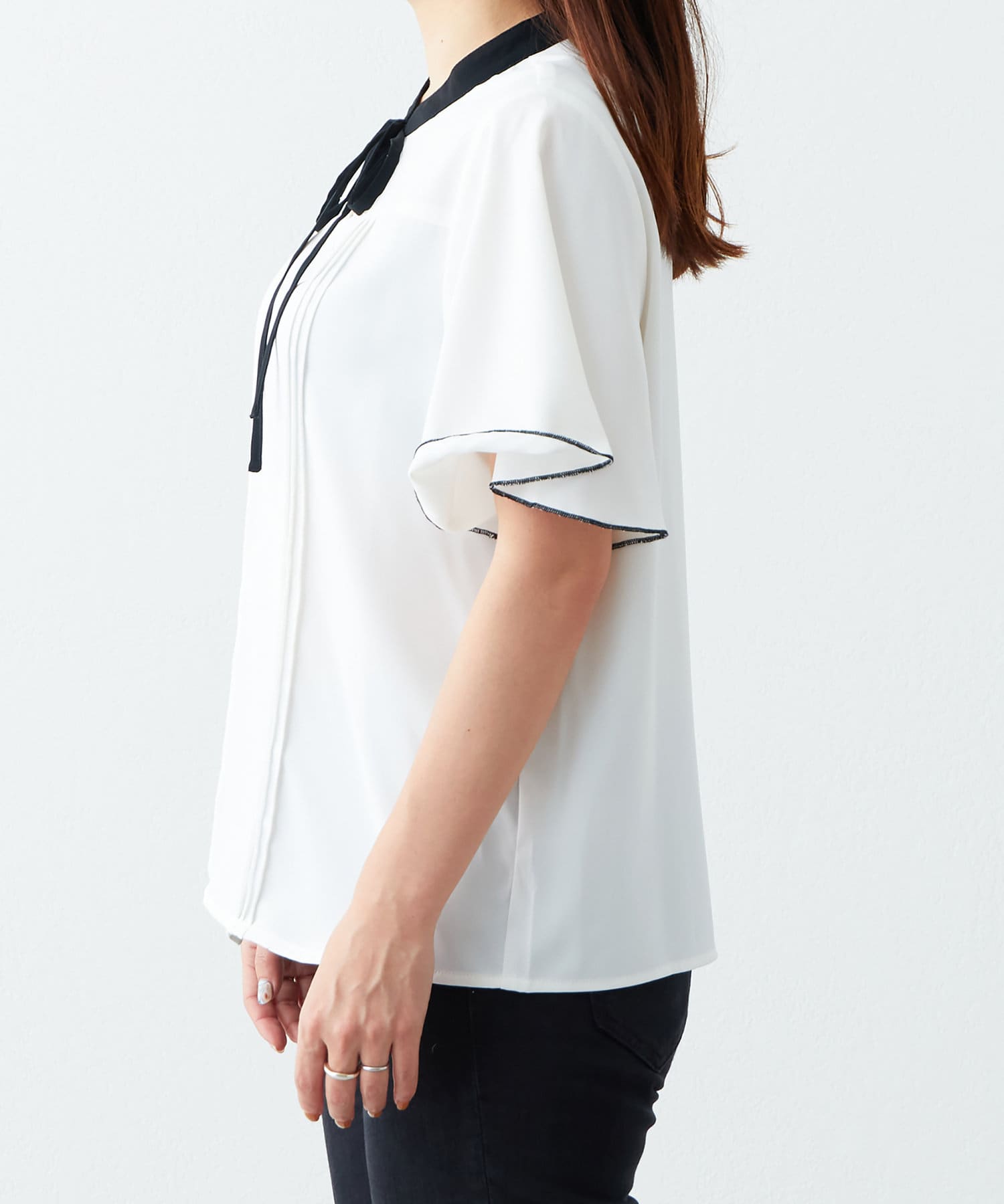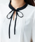 ピンタックデザインがポイント 配色リボンフレア袖ブラウス