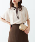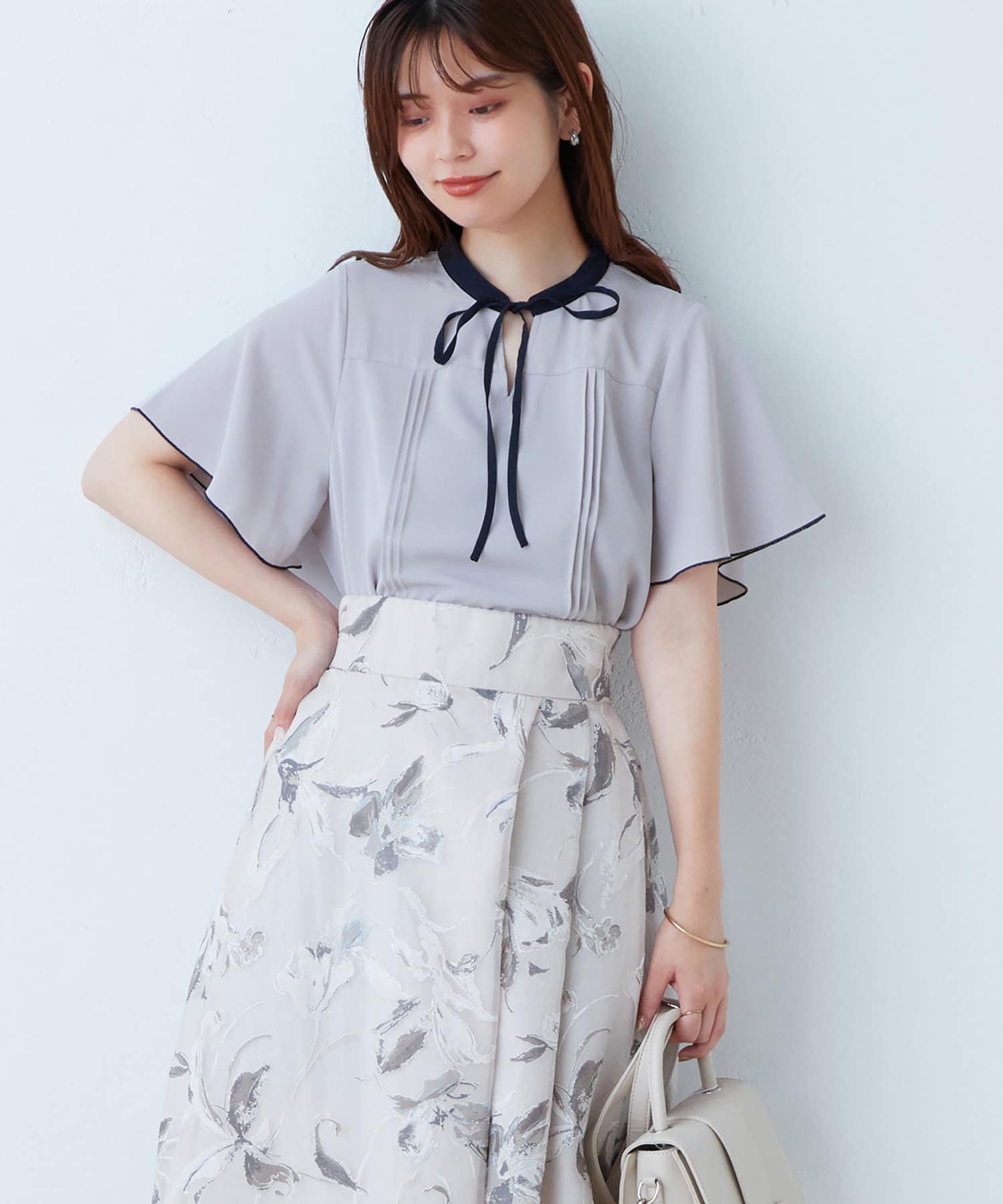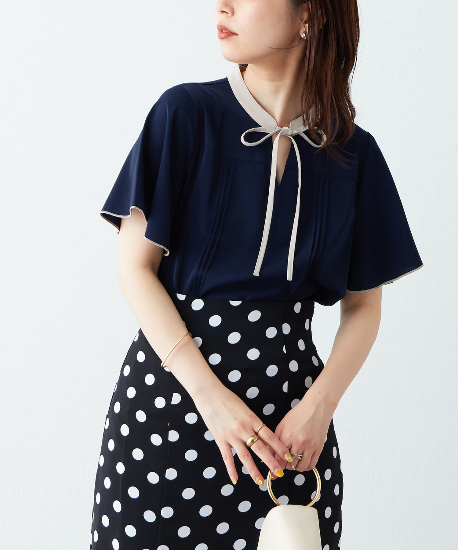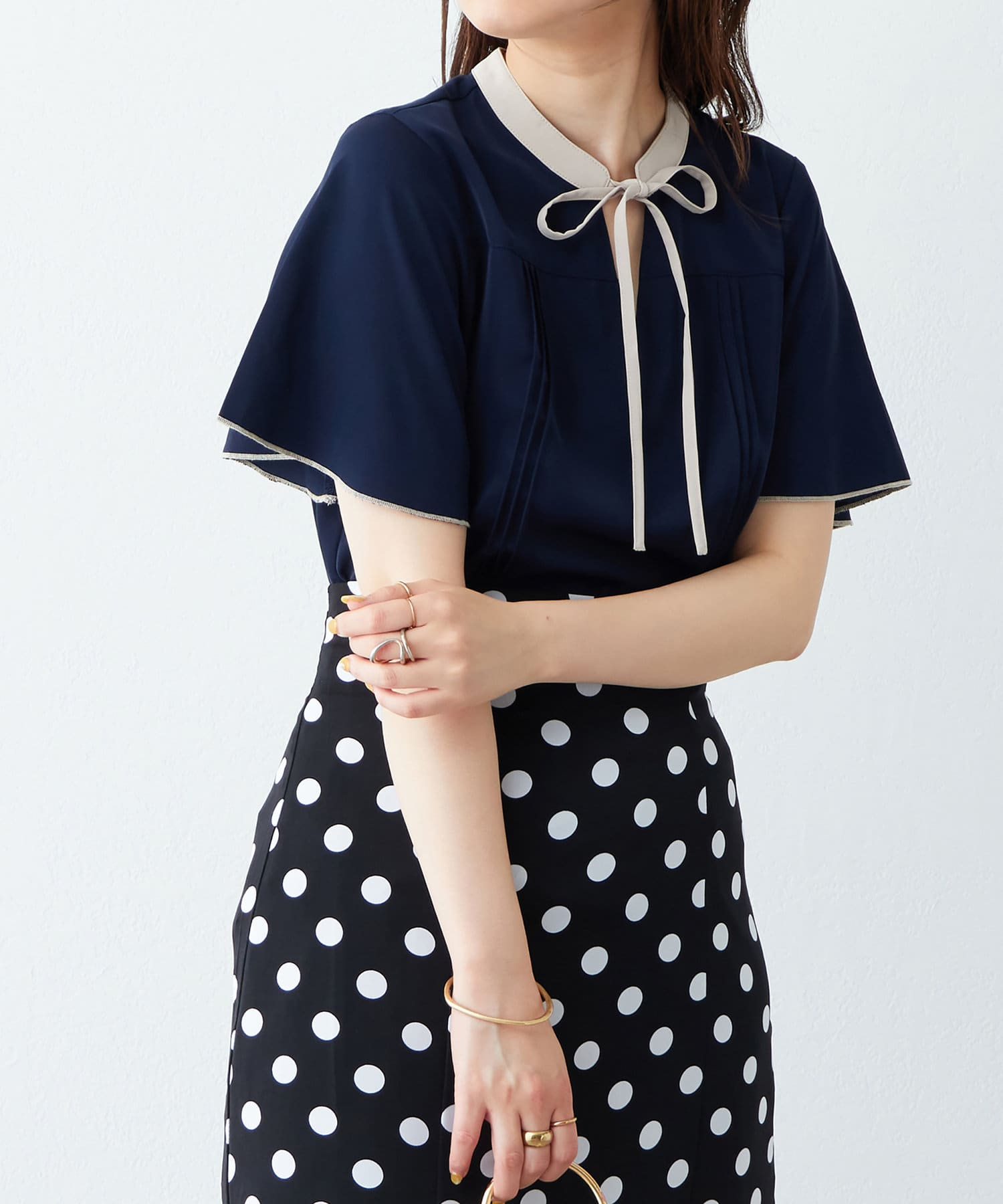 ピンタックデザインがポイント 配色リボンフレア袖ブラウス