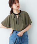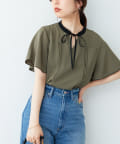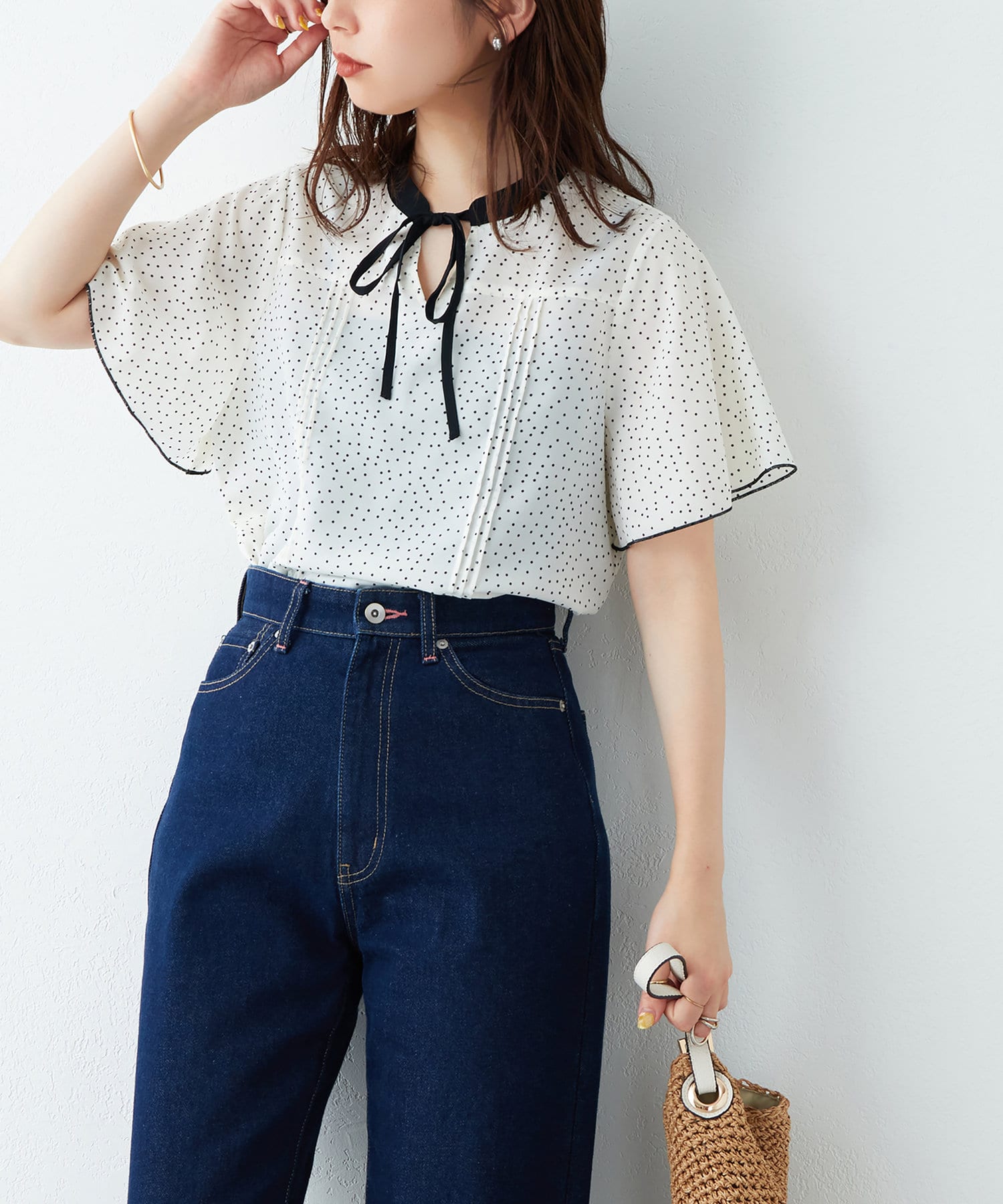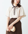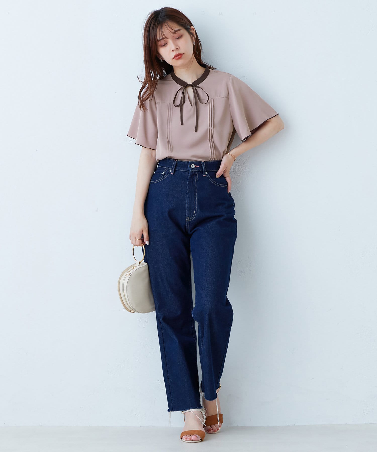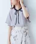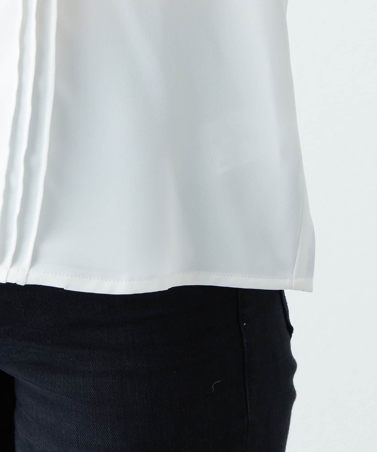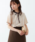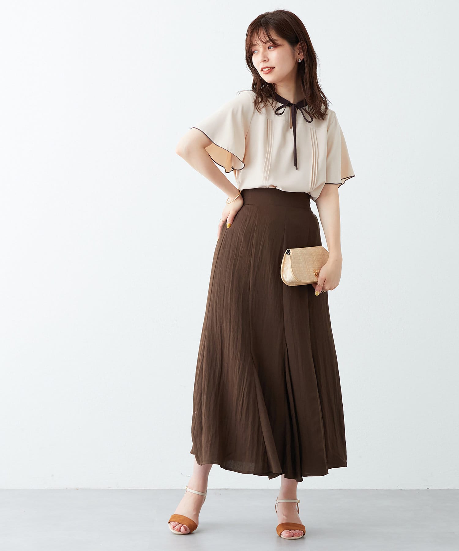 ピンタックデザインがポイント 配色リボンフレア袖ブラウス
