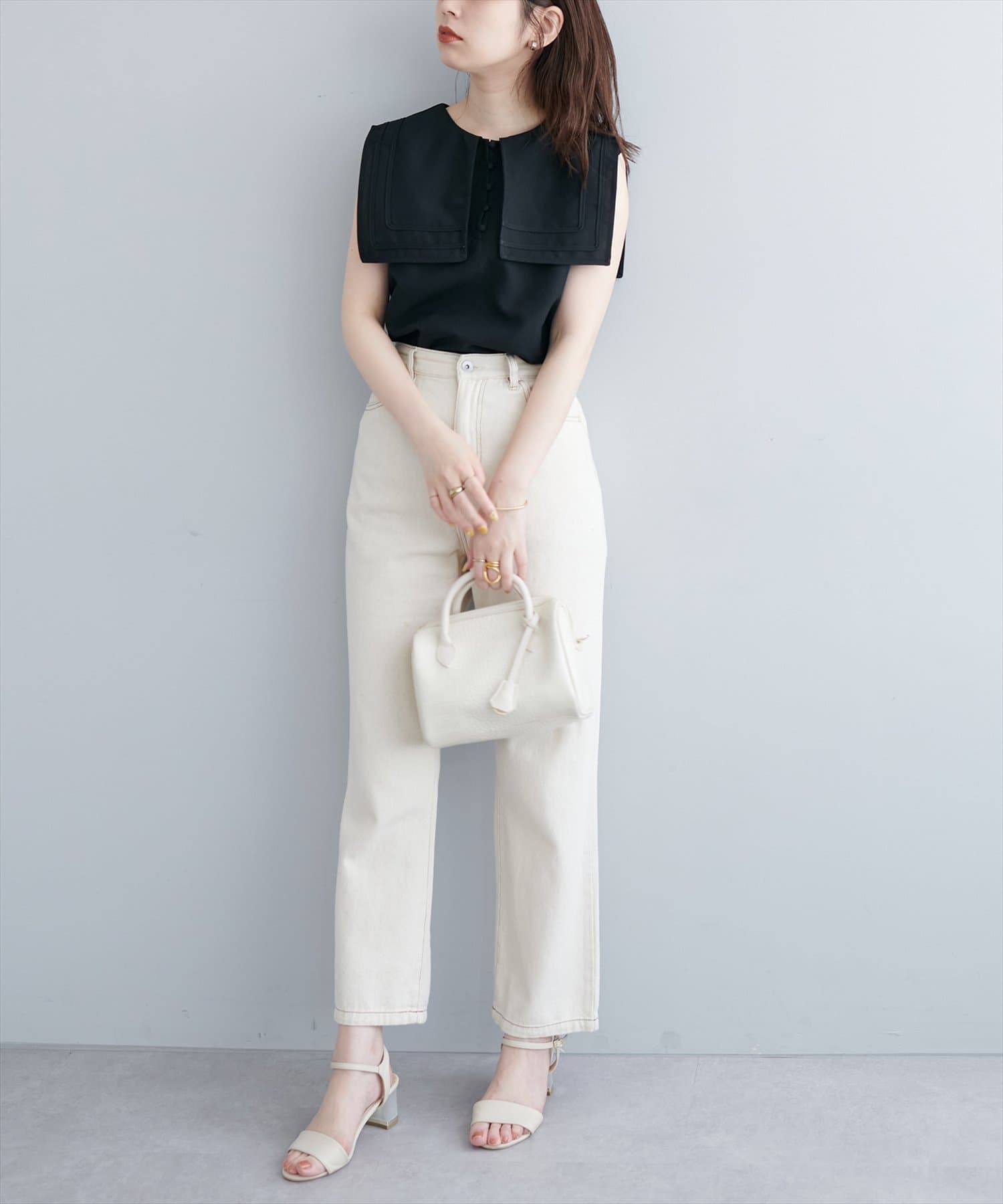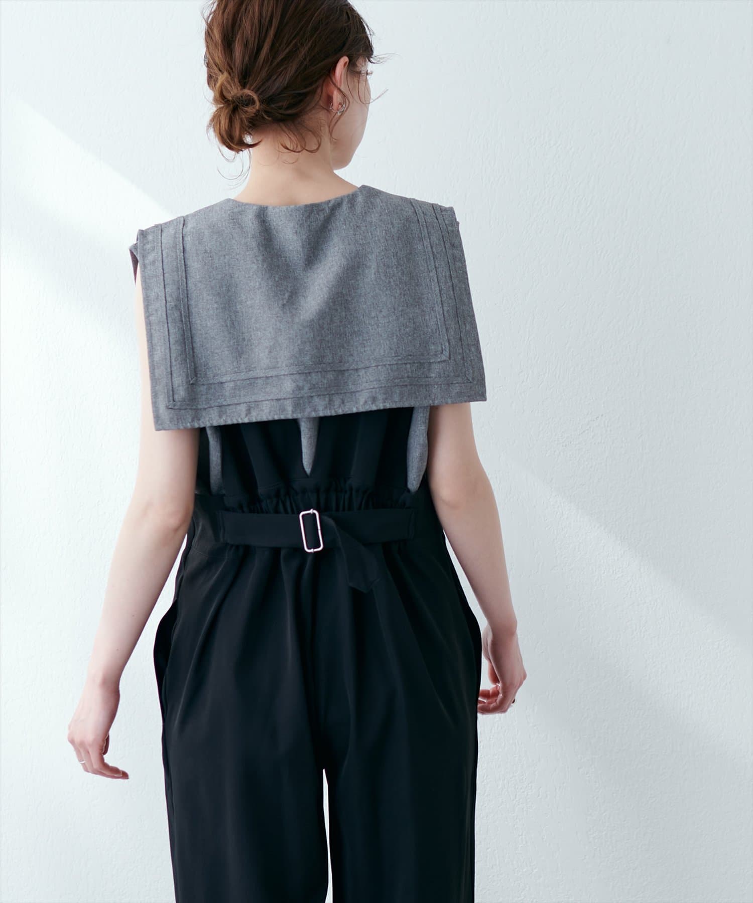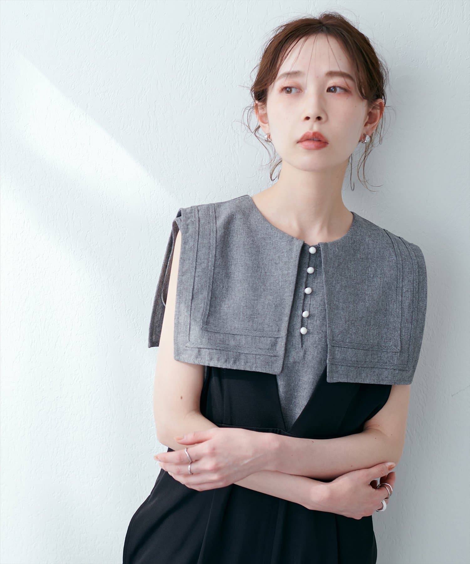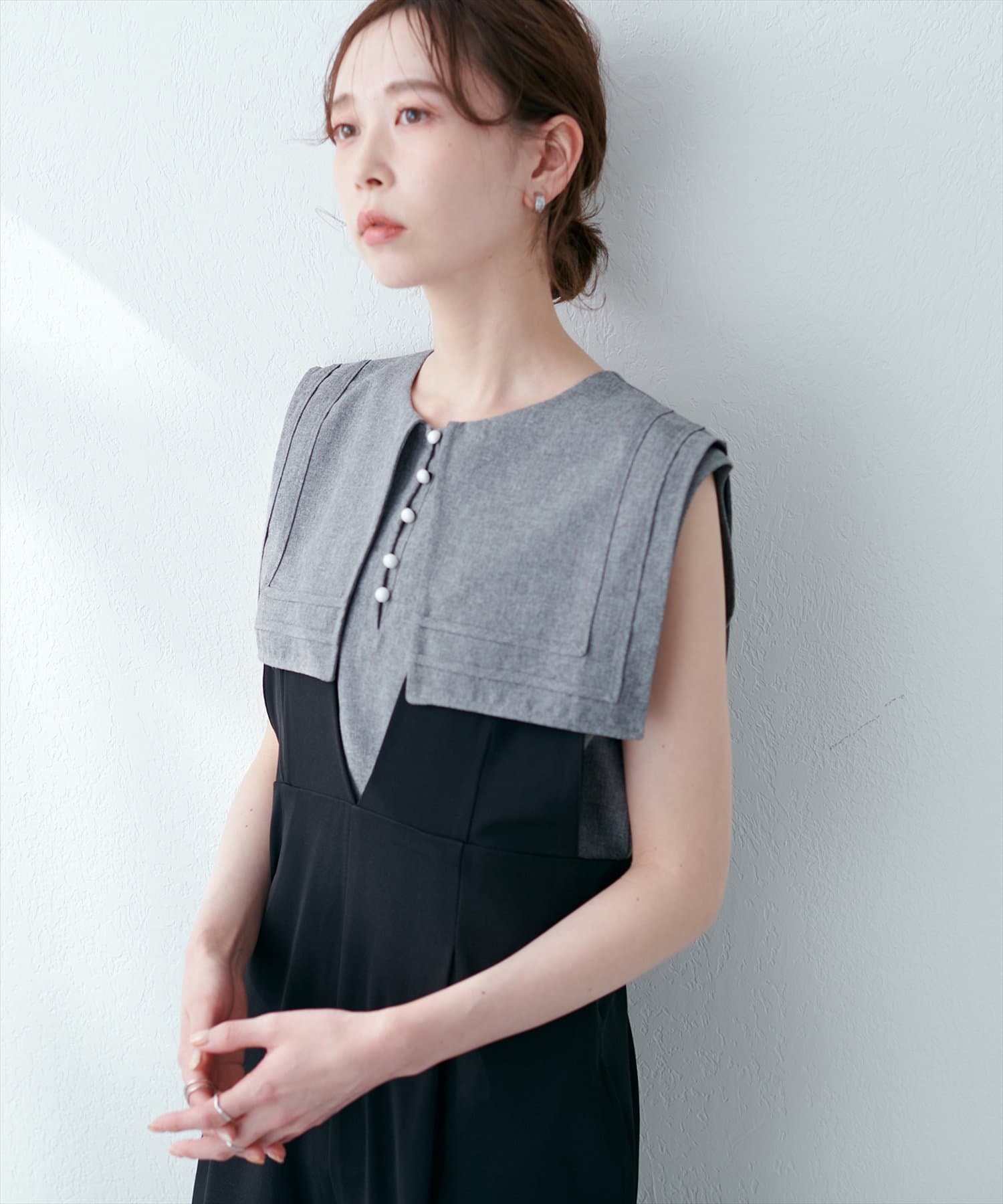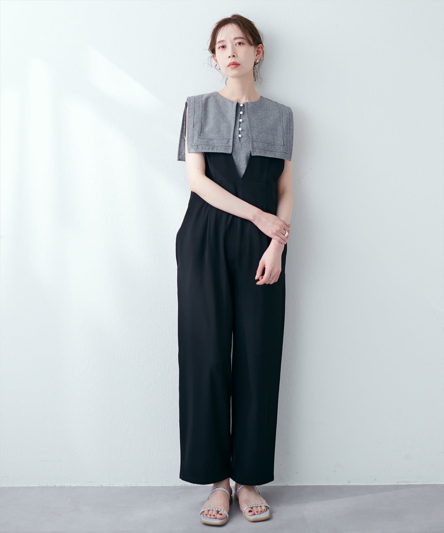 お好みで、深Vデザインのオールインワンやキャミワンピースとレイヤードして、衿のデザインをポイント見せしても◎