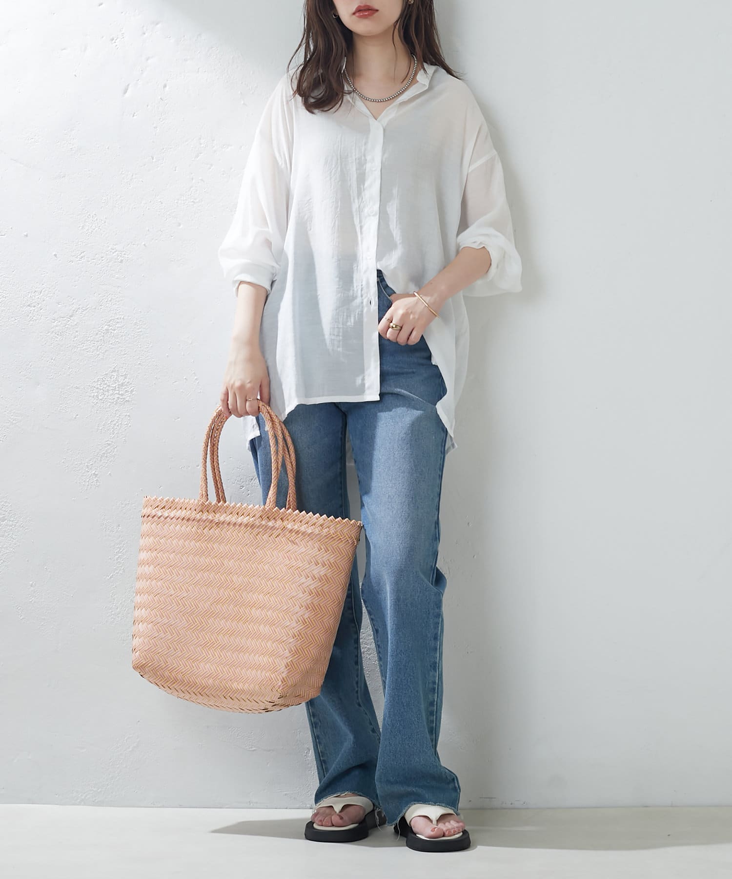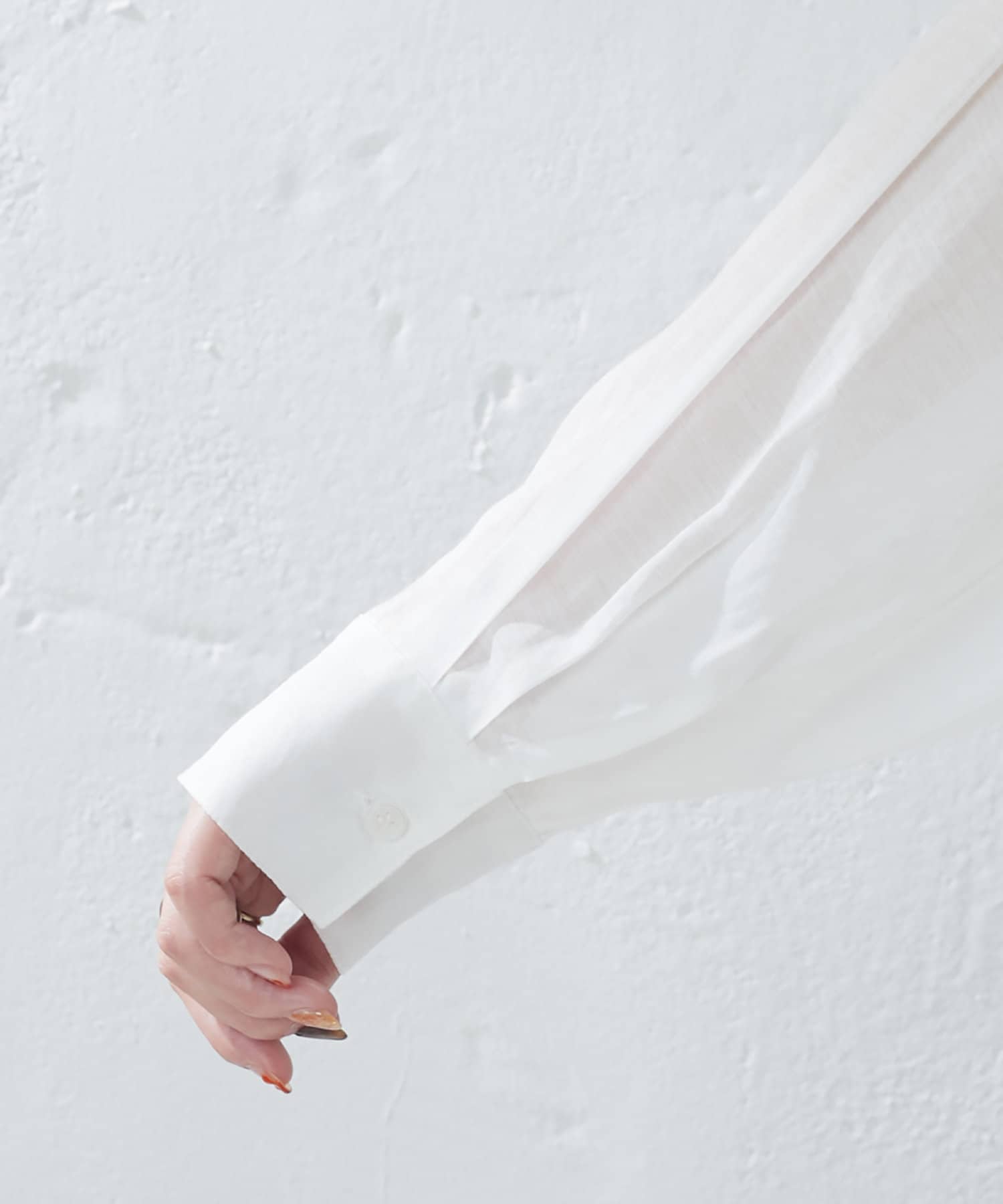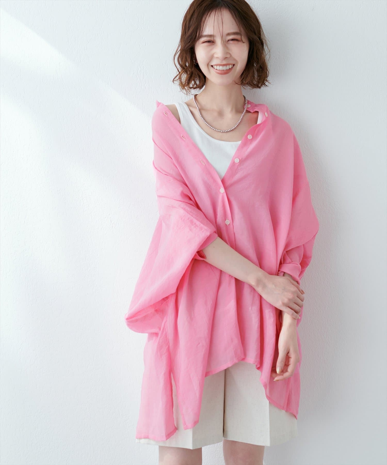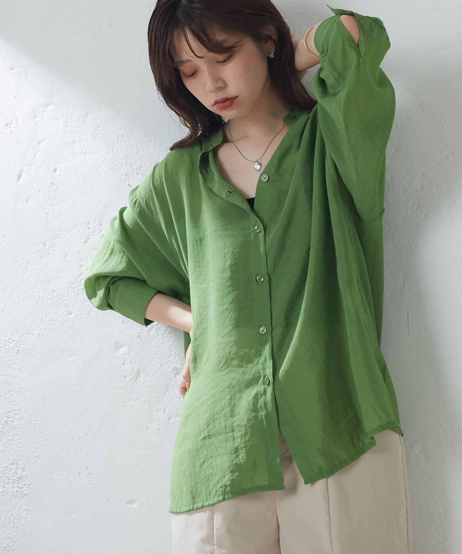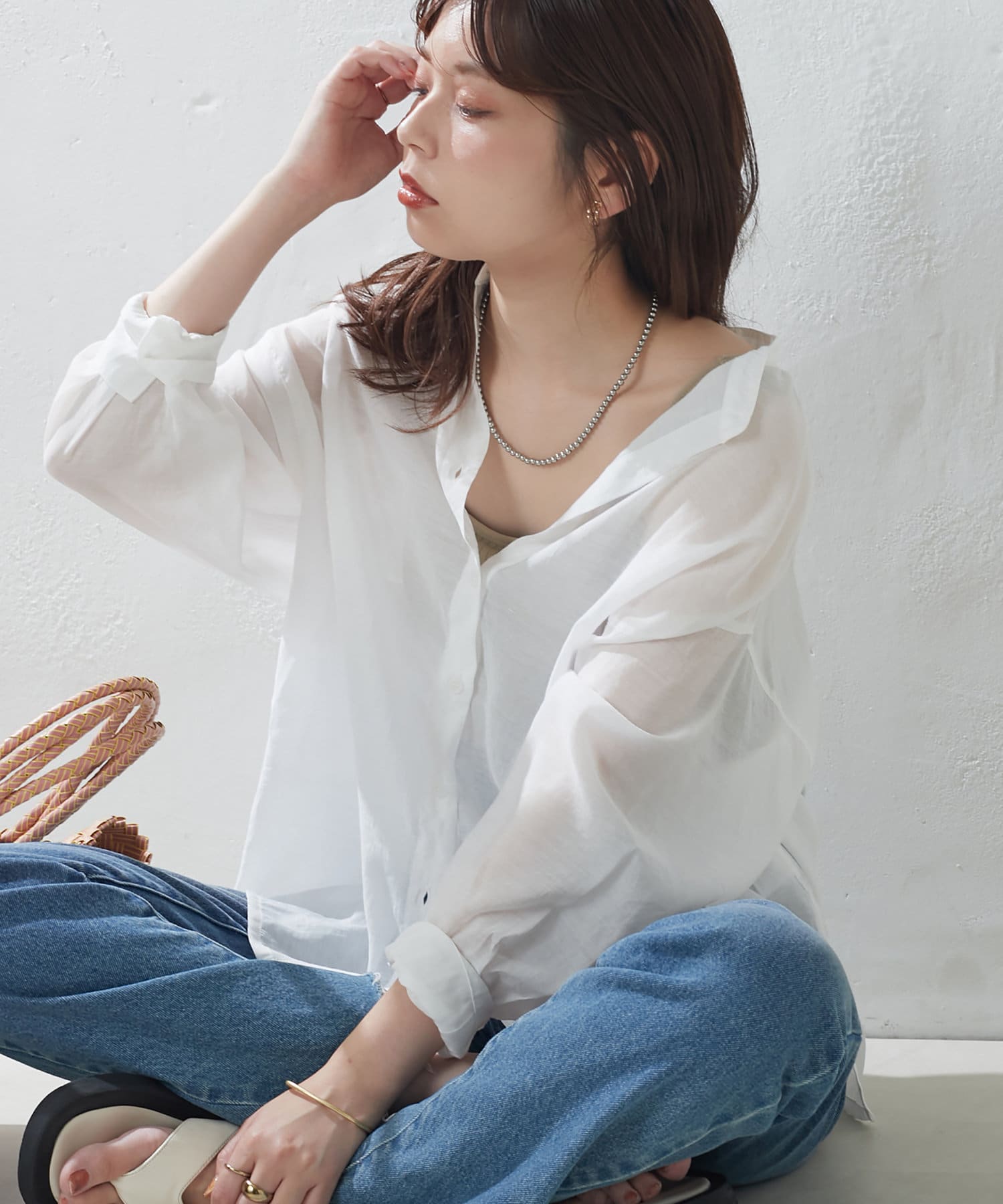 羽織りでお召し頂くのはもちろん、キャミソールやタンクトップなどのインナー合わせて頂ければ、ボタンを閉じてプルオーバーとしても1枚着でも決まります。今季は、シアーシャツを肩掛けやたすき掛けでポイント使いをするコーデもオススメです。