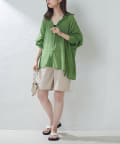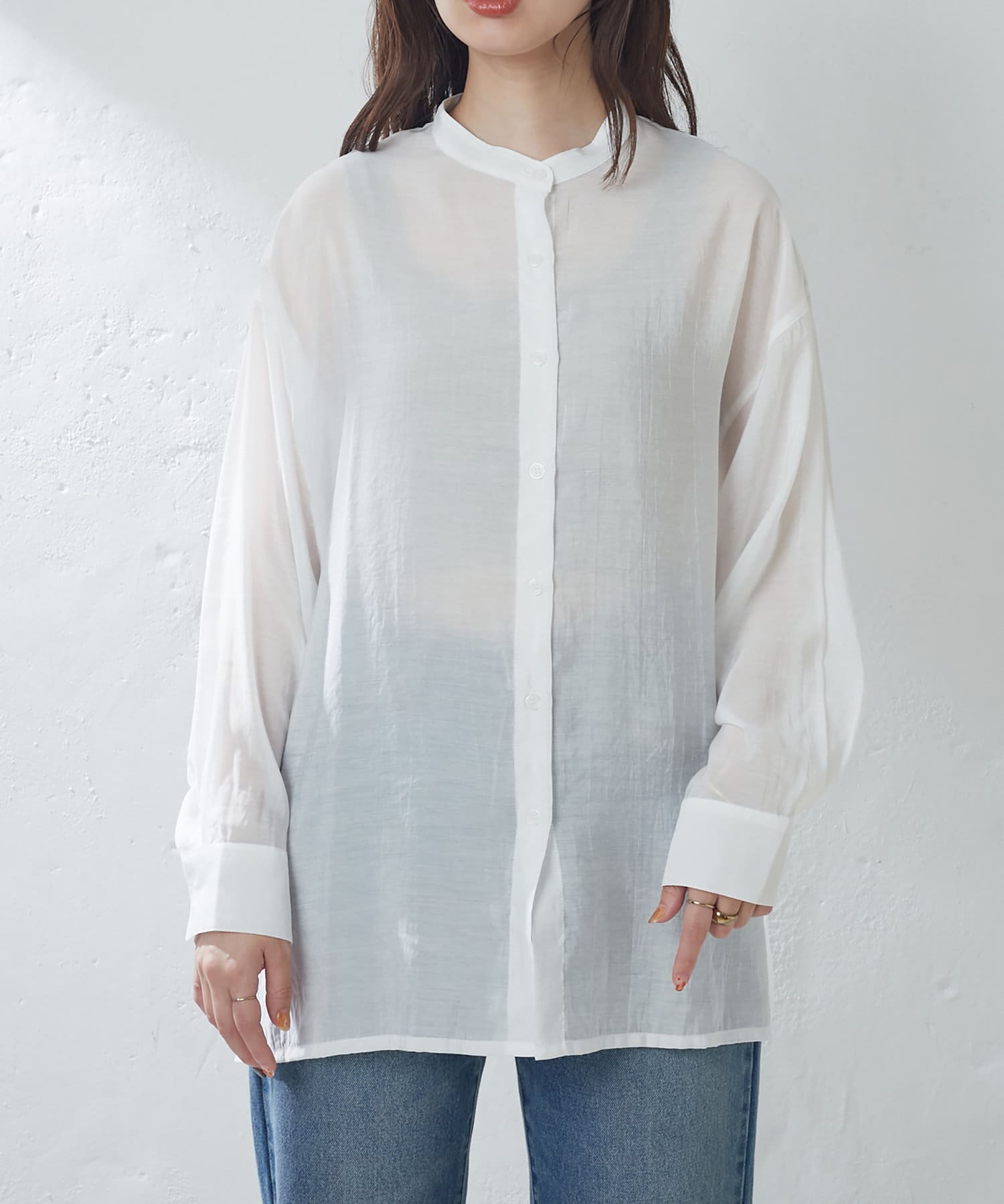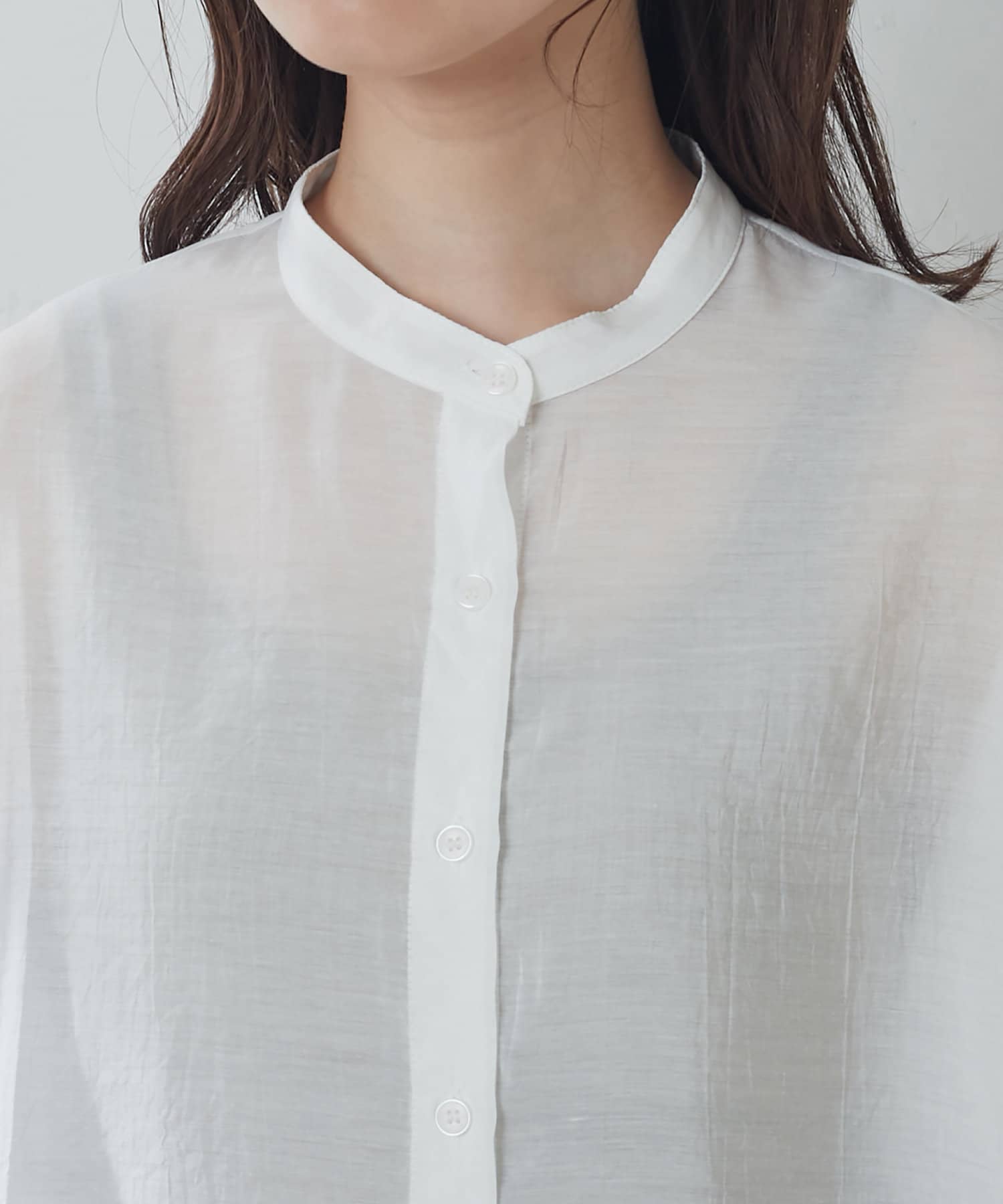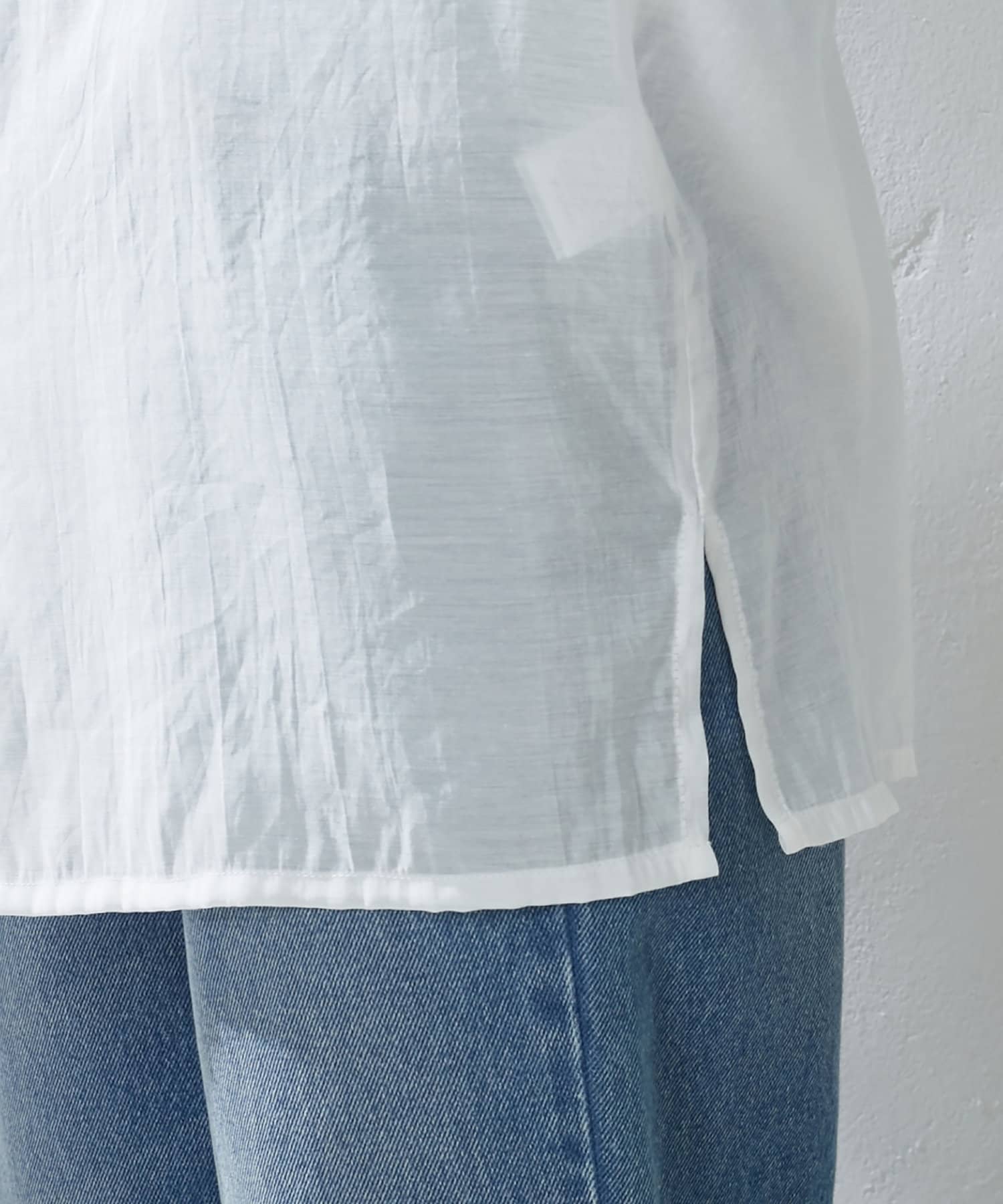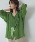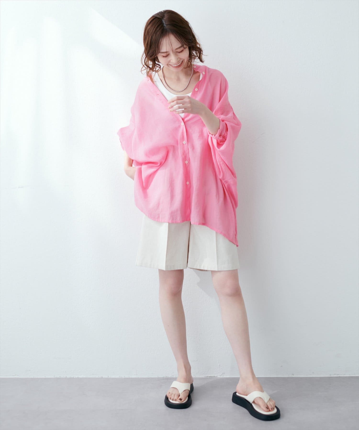 羽織りでお召し頂くのはもちろん、キャミソールやタンクトップなどのインナー合わせて頂ければ、ボタンを閉じてプルオーバーとしても1枚着でも決まります。今季は、シアーシャツを肩掛けやたすき掛けでポイント使いをするコーデもオススメです。
