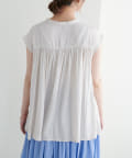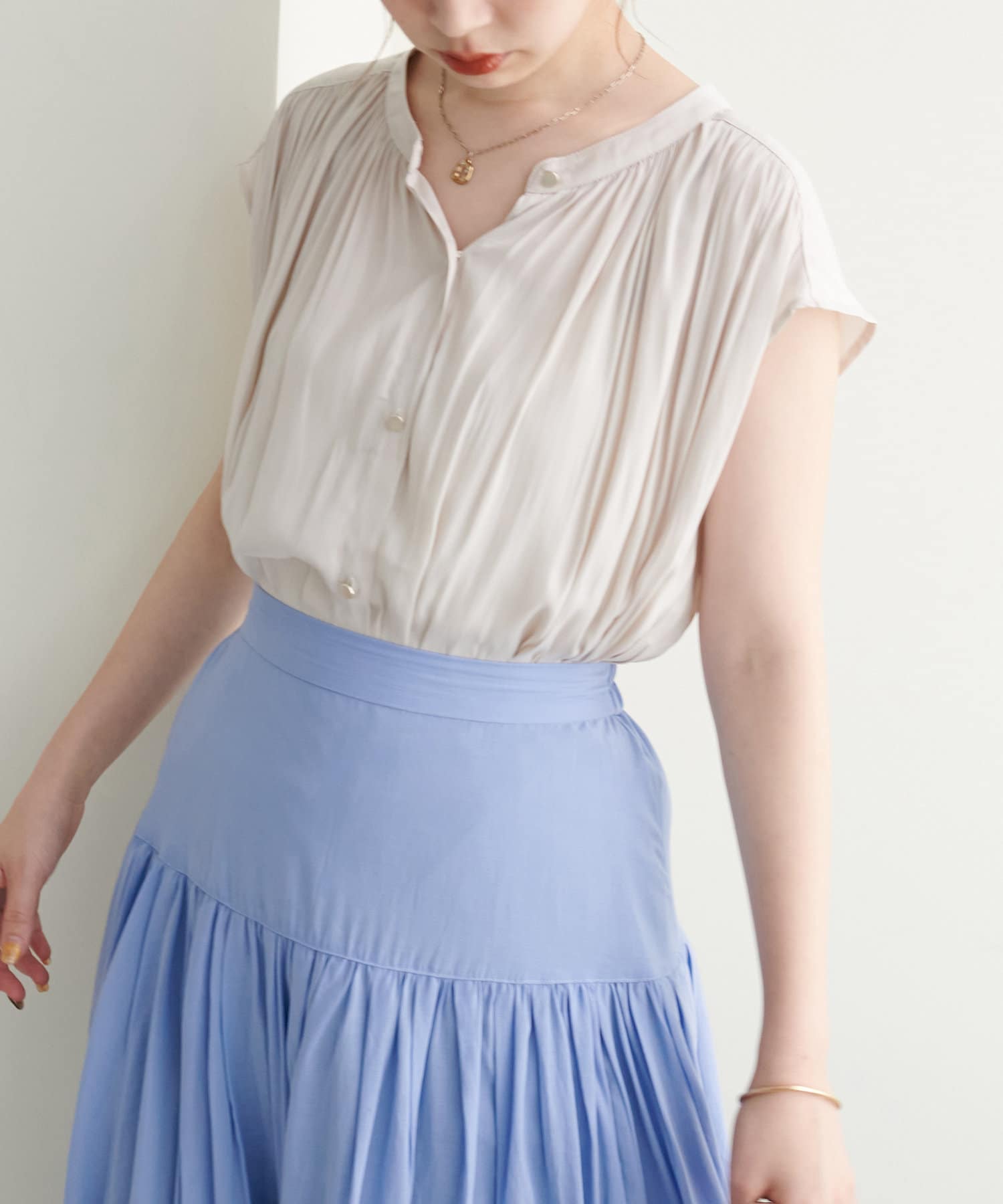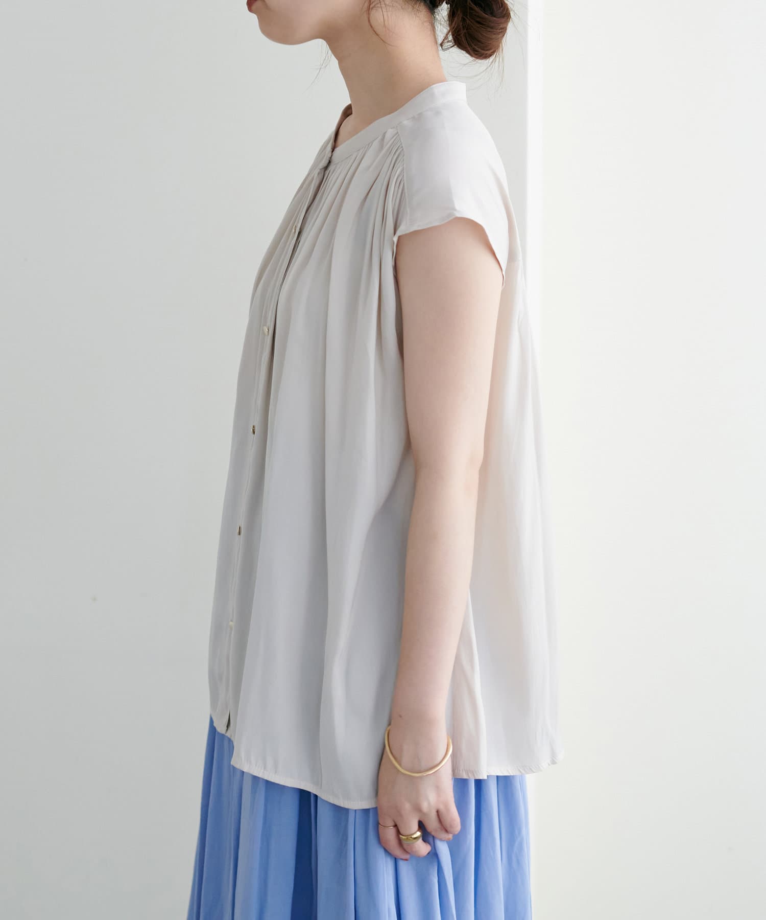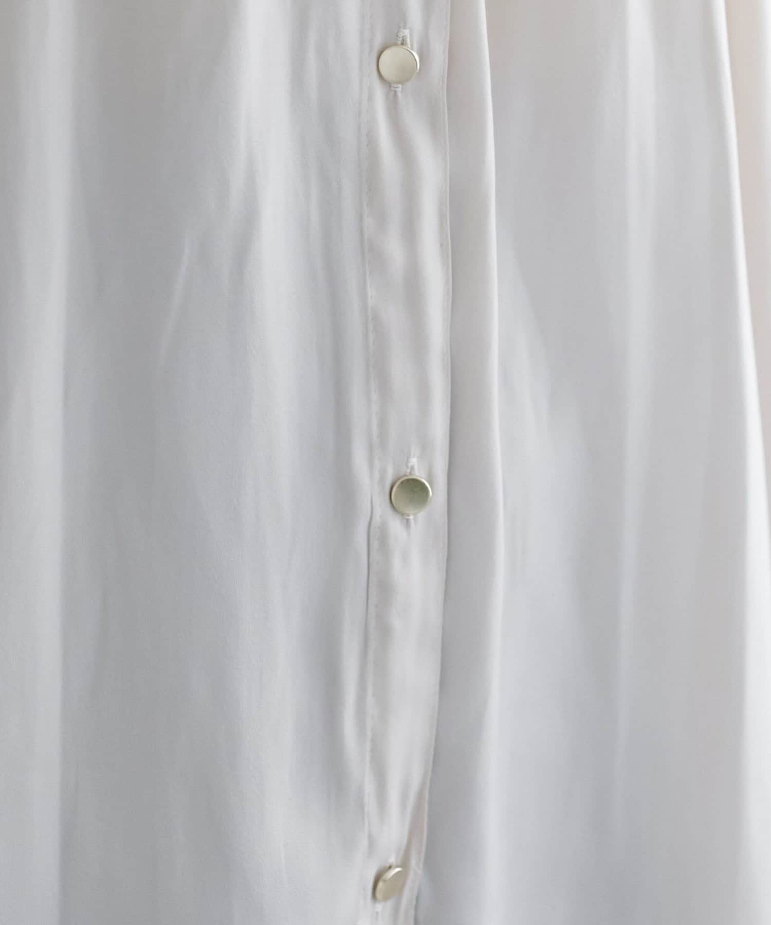 とろみサテン金釦ギャザーブラウス