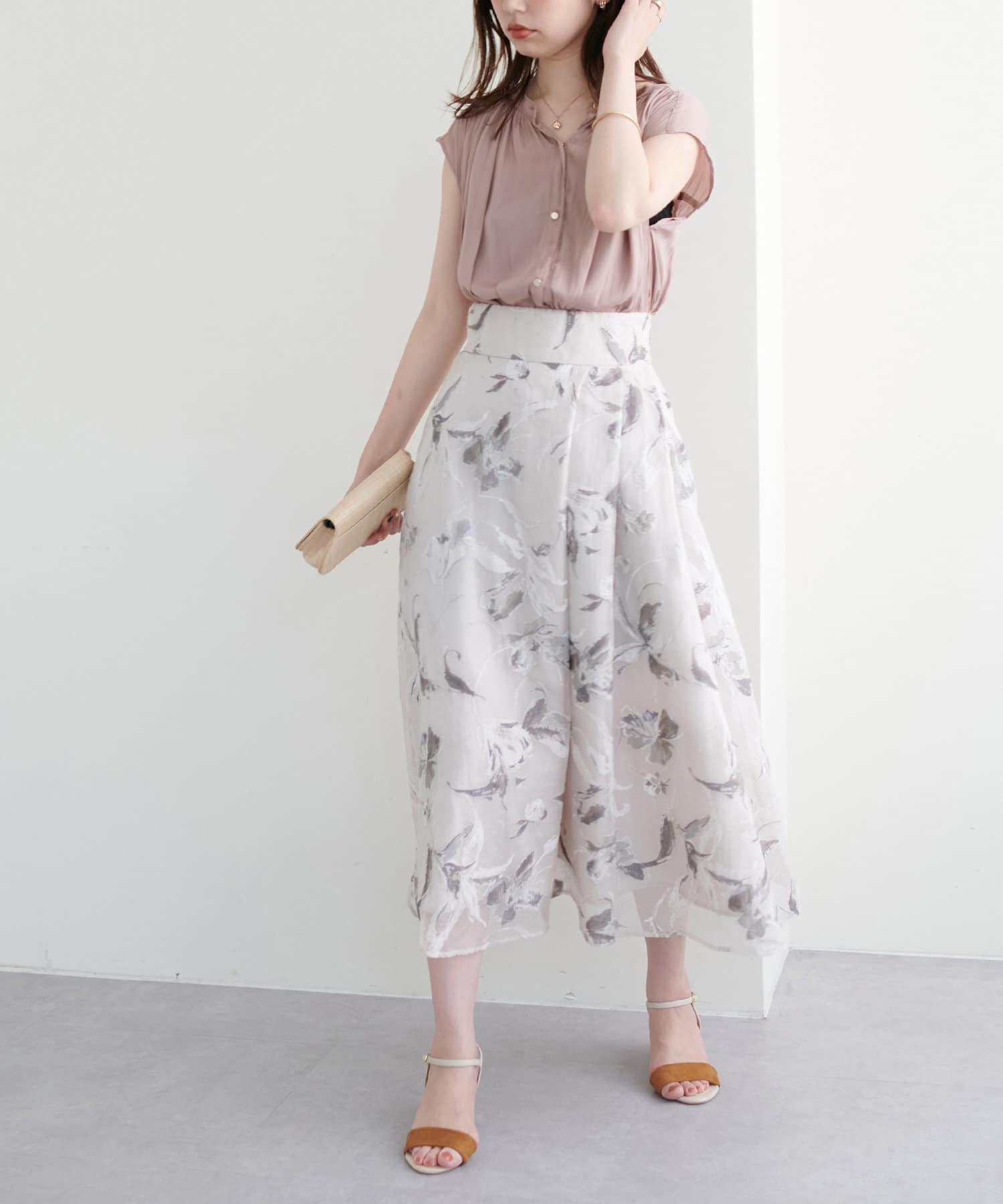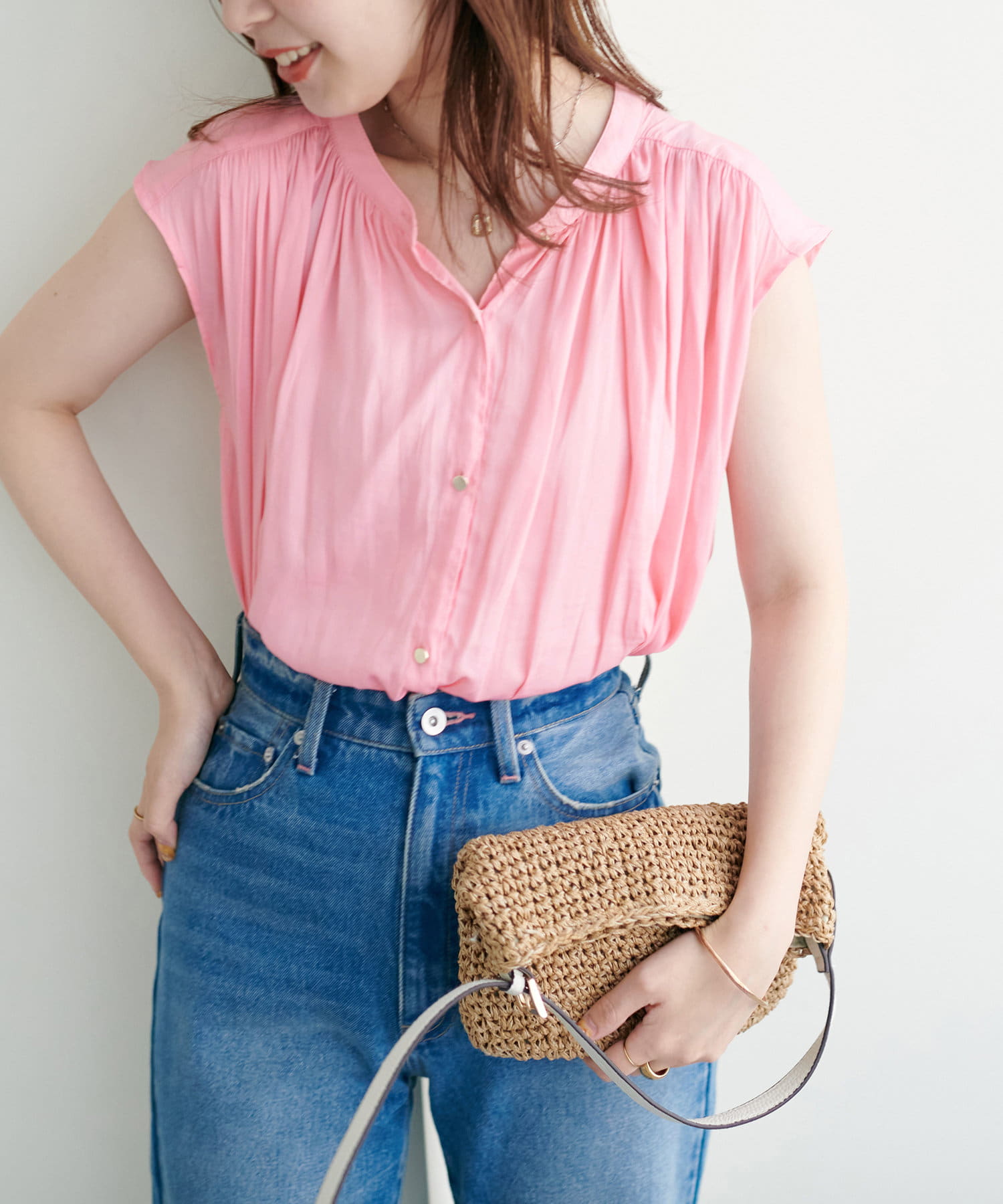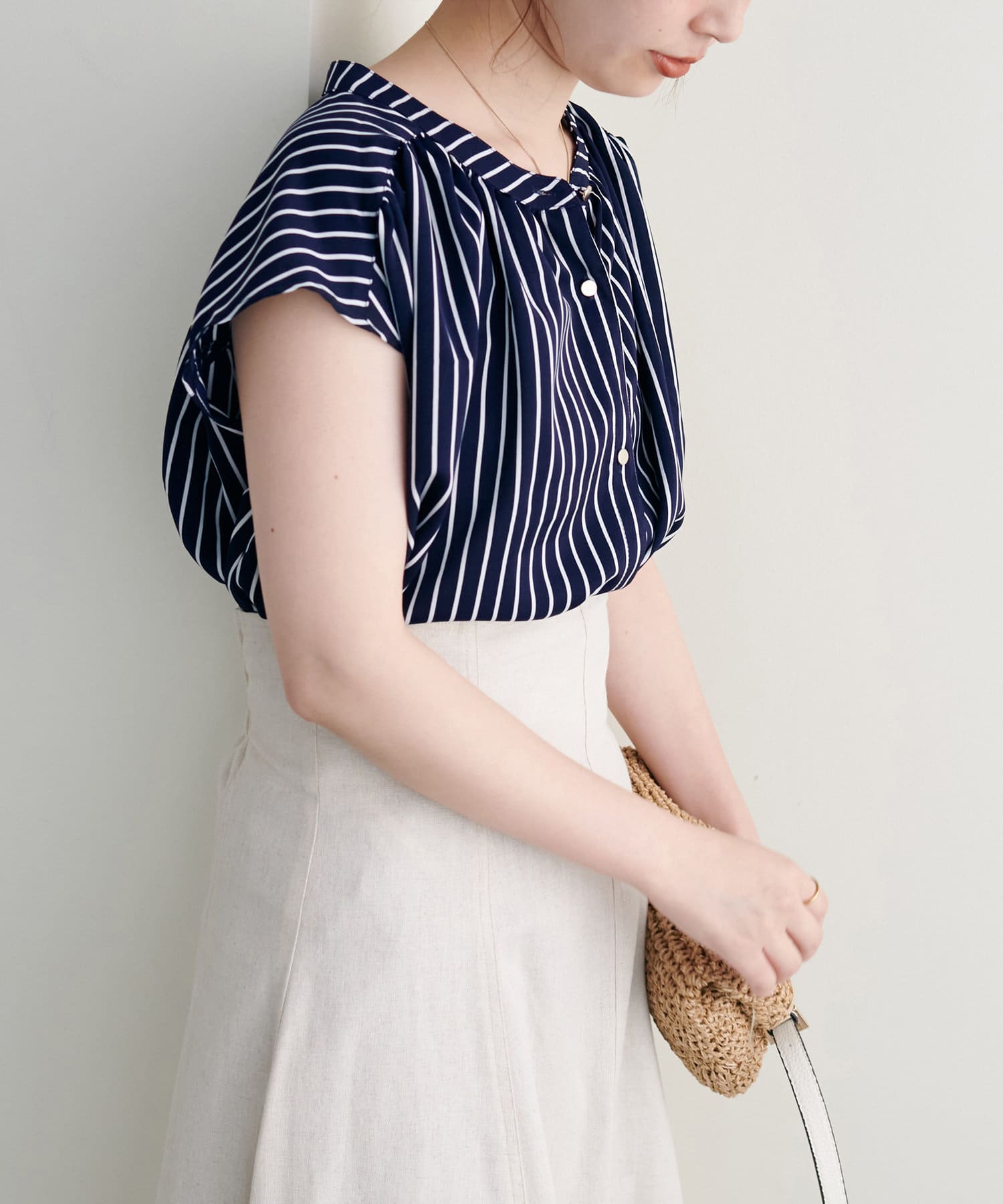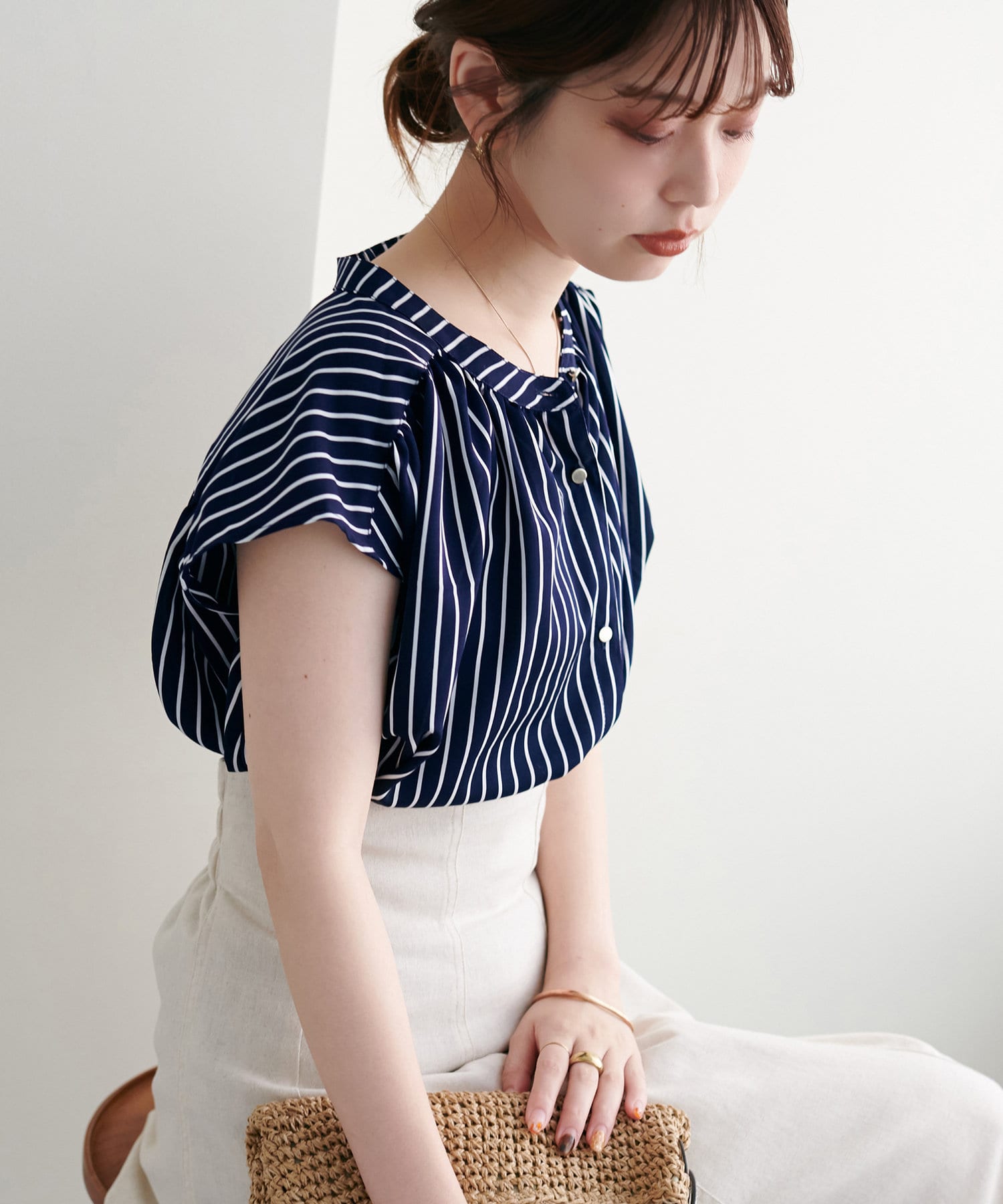身体のラインを拾わないシルエットで1枚でさらっと着れるブラウスは、これからの季節に大活躍。