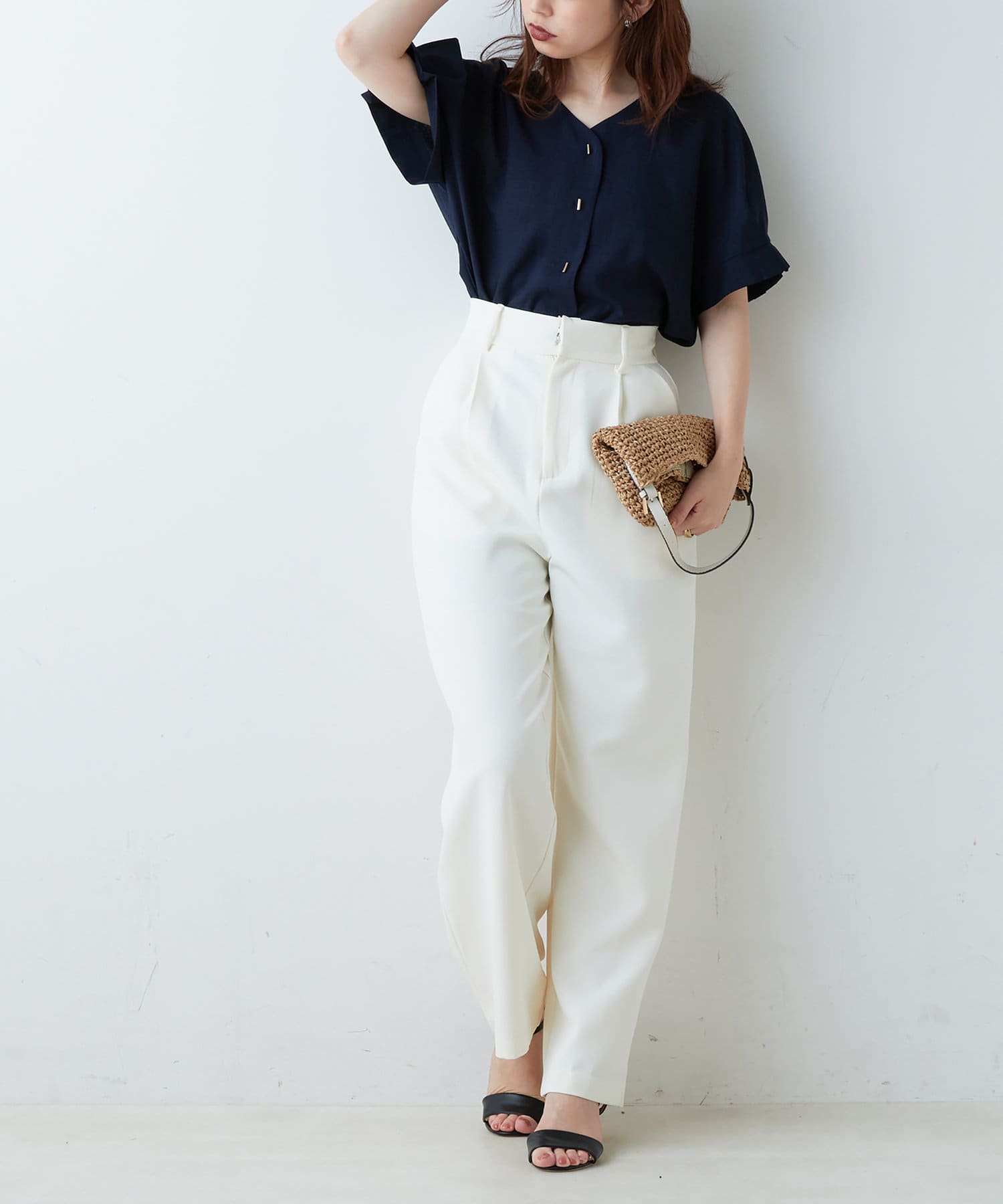 ハイウエストデザインのボトムスにウエストインしてすっきり合わせて頂くのはもちろん、