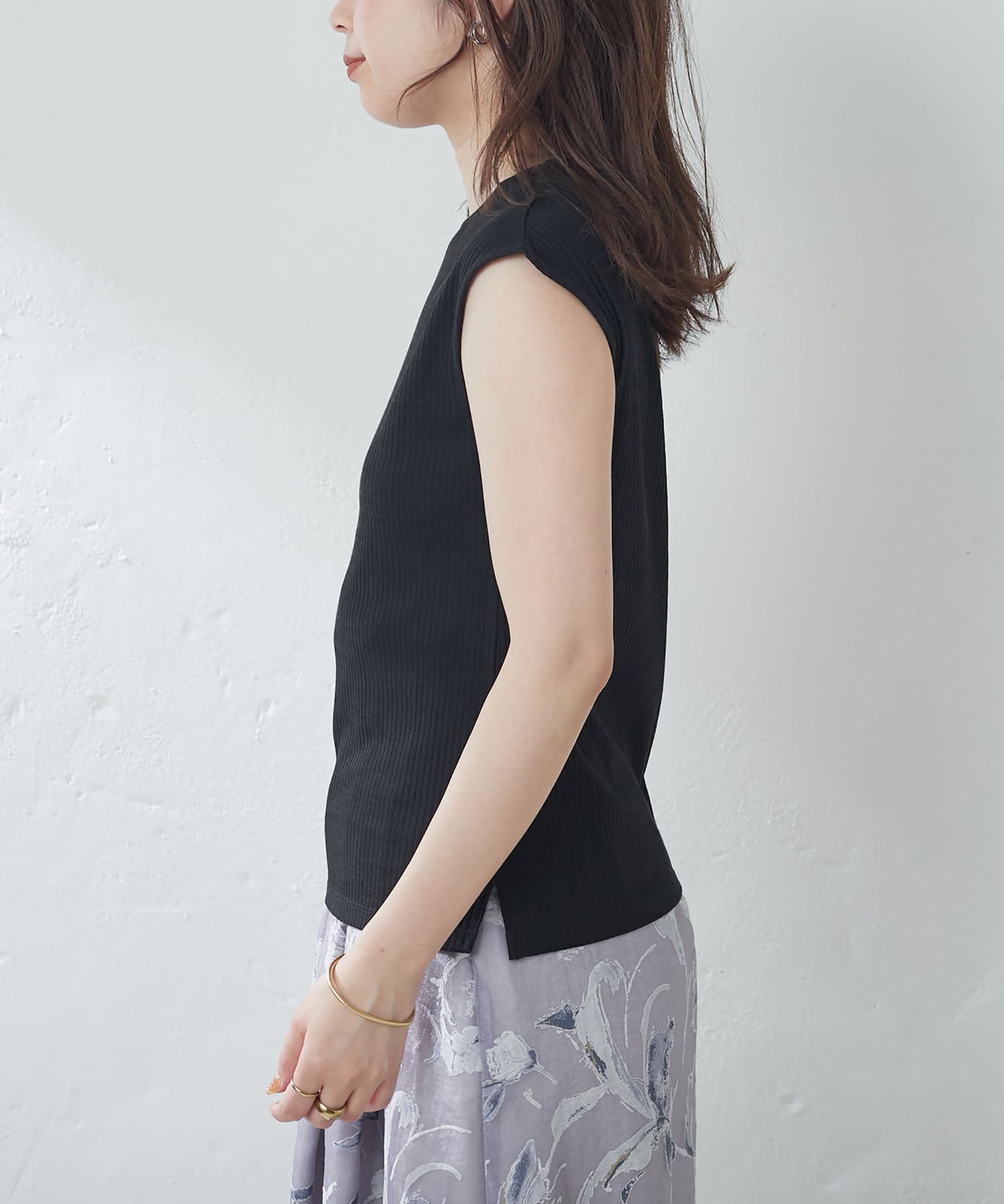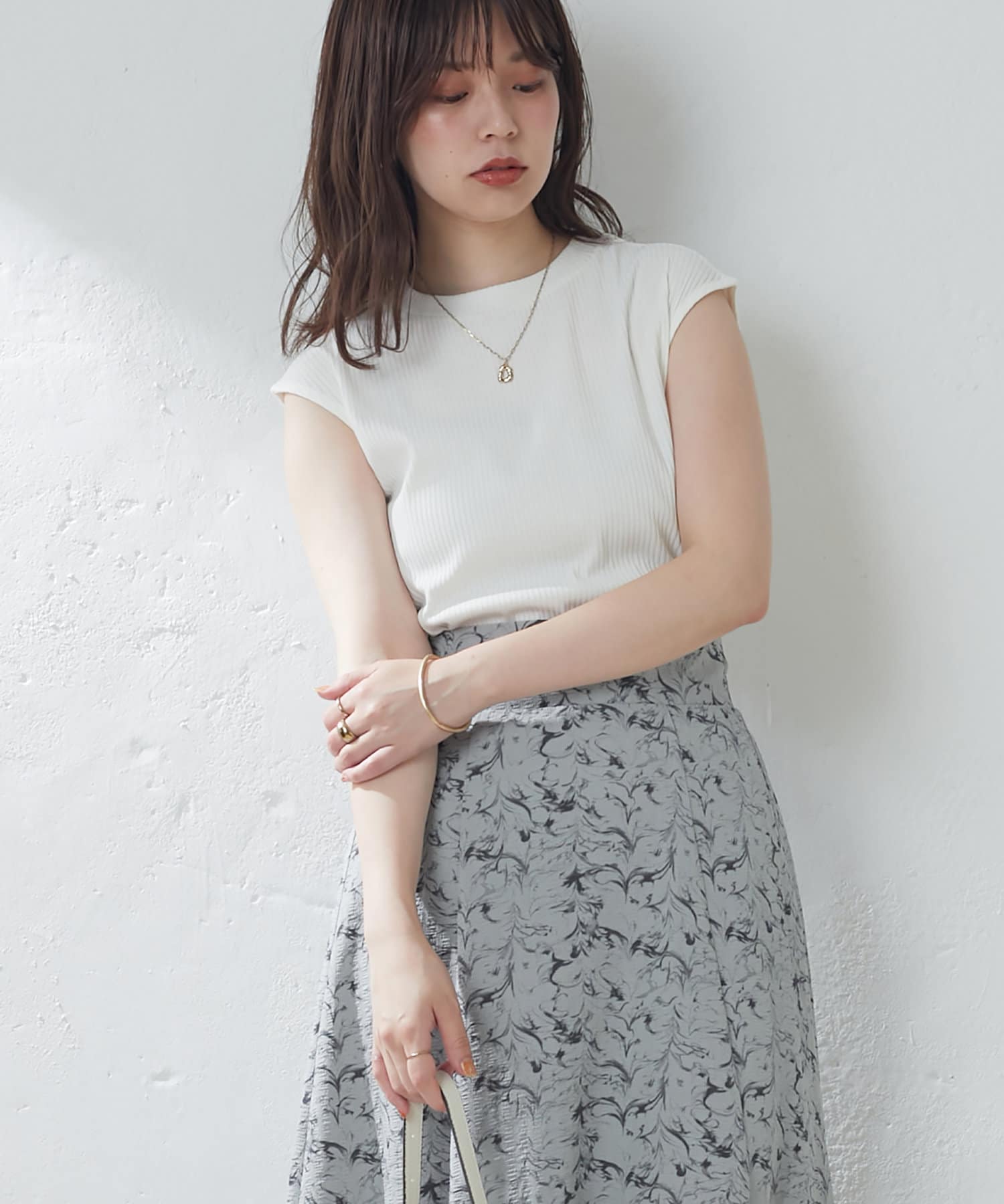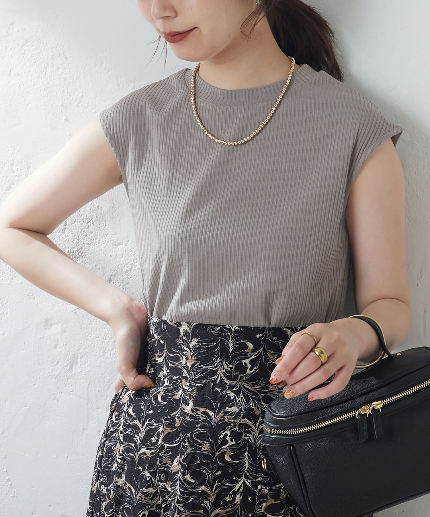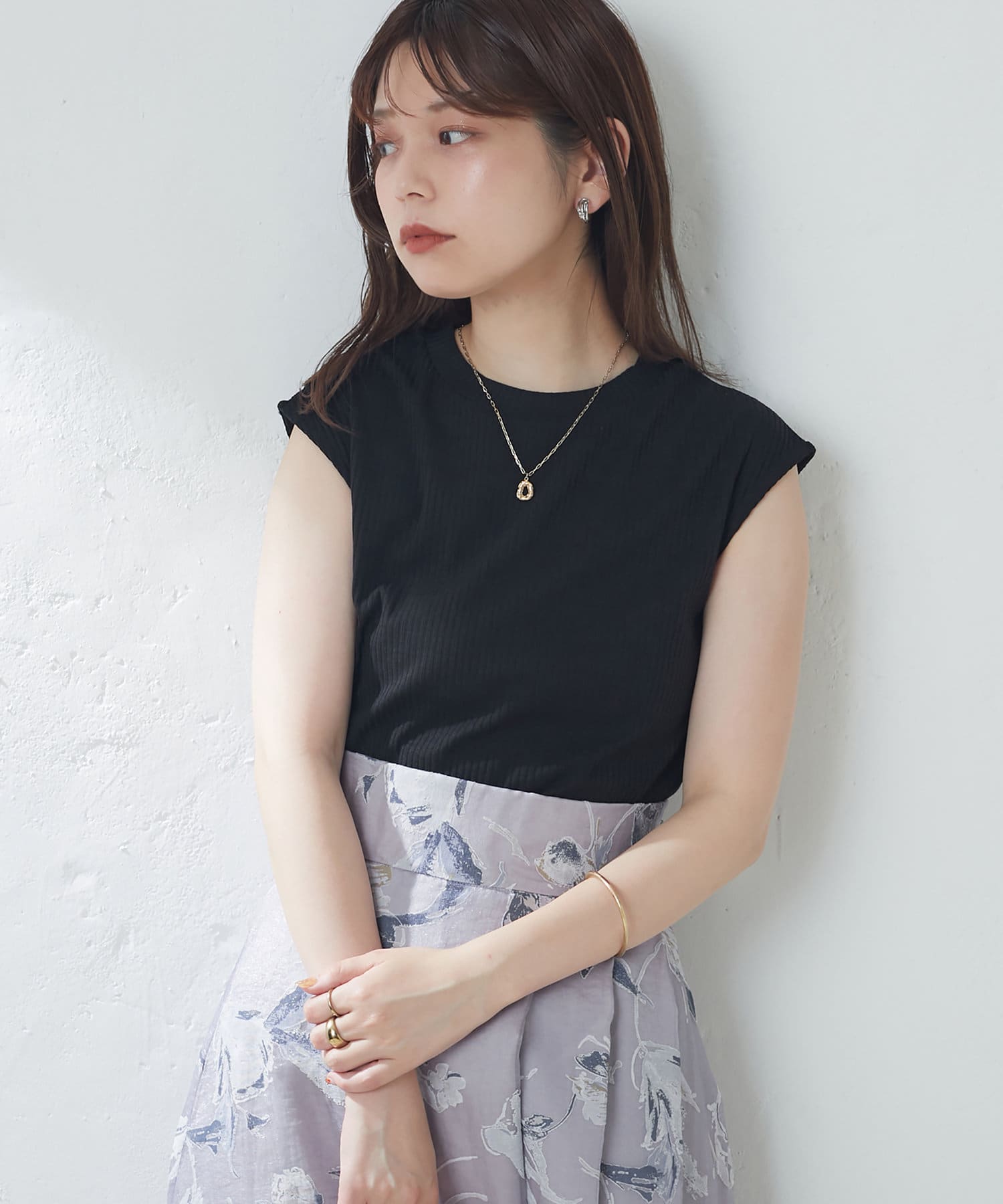 袖が少しフレンチになっていて二の腕が少し隠せるところがいいです。リブ素材なのできれいめにも着れて万能です。夏にたくさん着まわせるトップスだと思います!