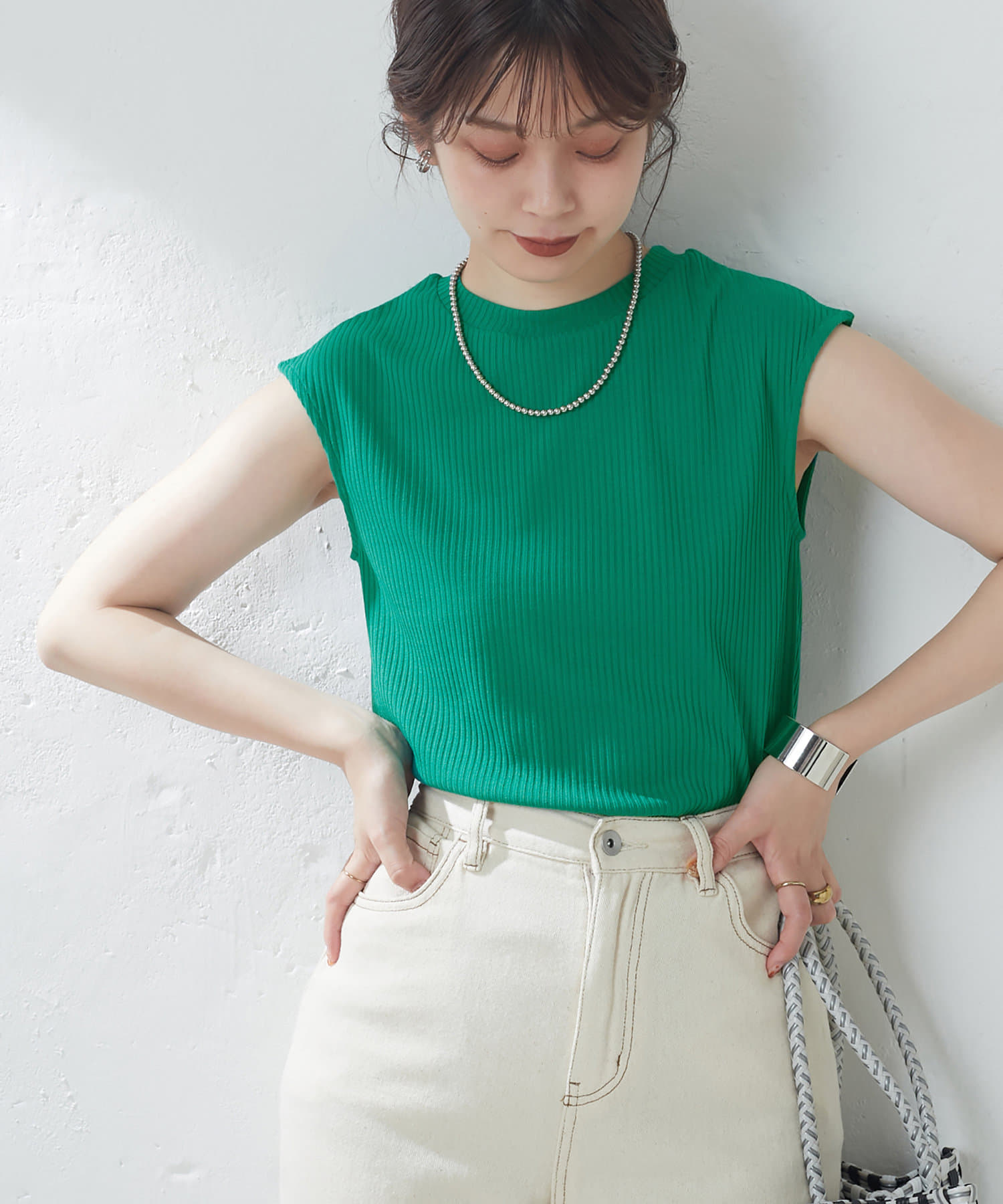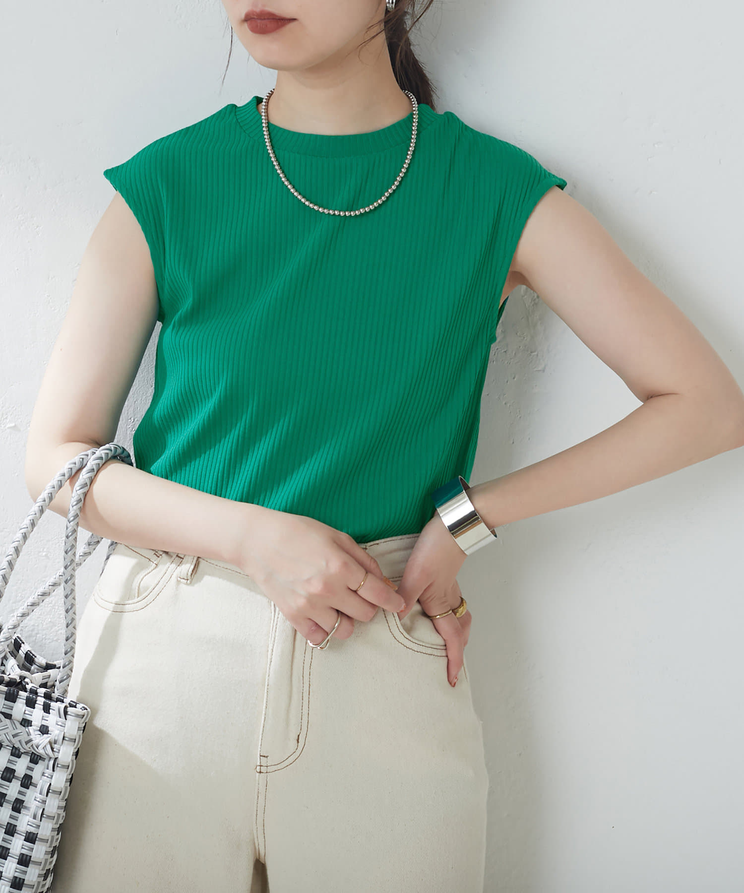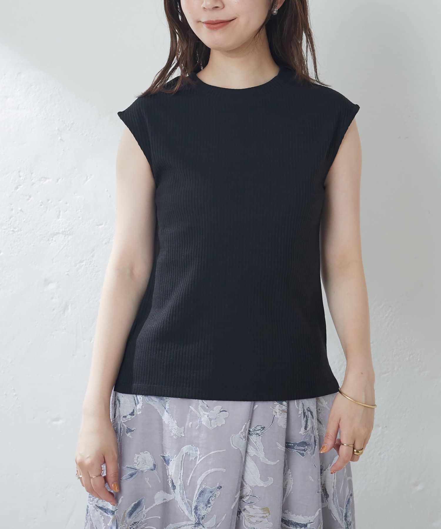 袖が少しフレンチになっていて二の腕が少し隠せるところがいいです。リブ素材なのできれいめにも着れて万能です。夏にたくさん着まわせるトップスだと思います!