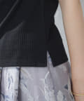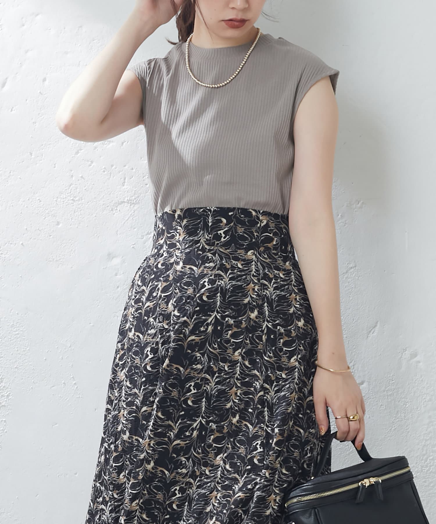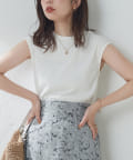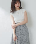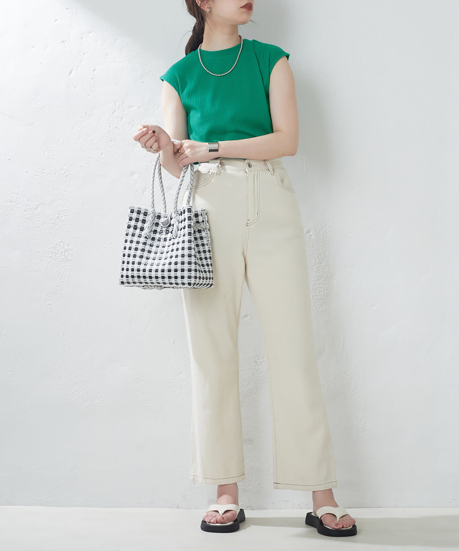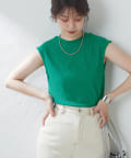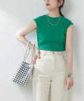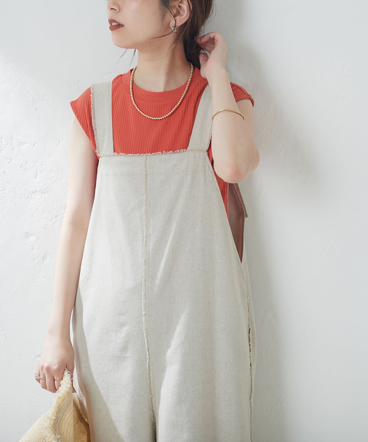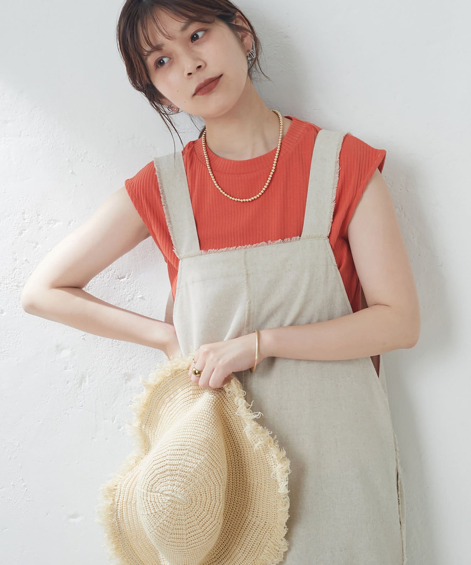 袖が少しフレンチになっていて二の腕が少し隠せるところがいいです。リブ素材なのできれいめにも着れて万能です。夏にたくさん着まわせるトップスだと思います!