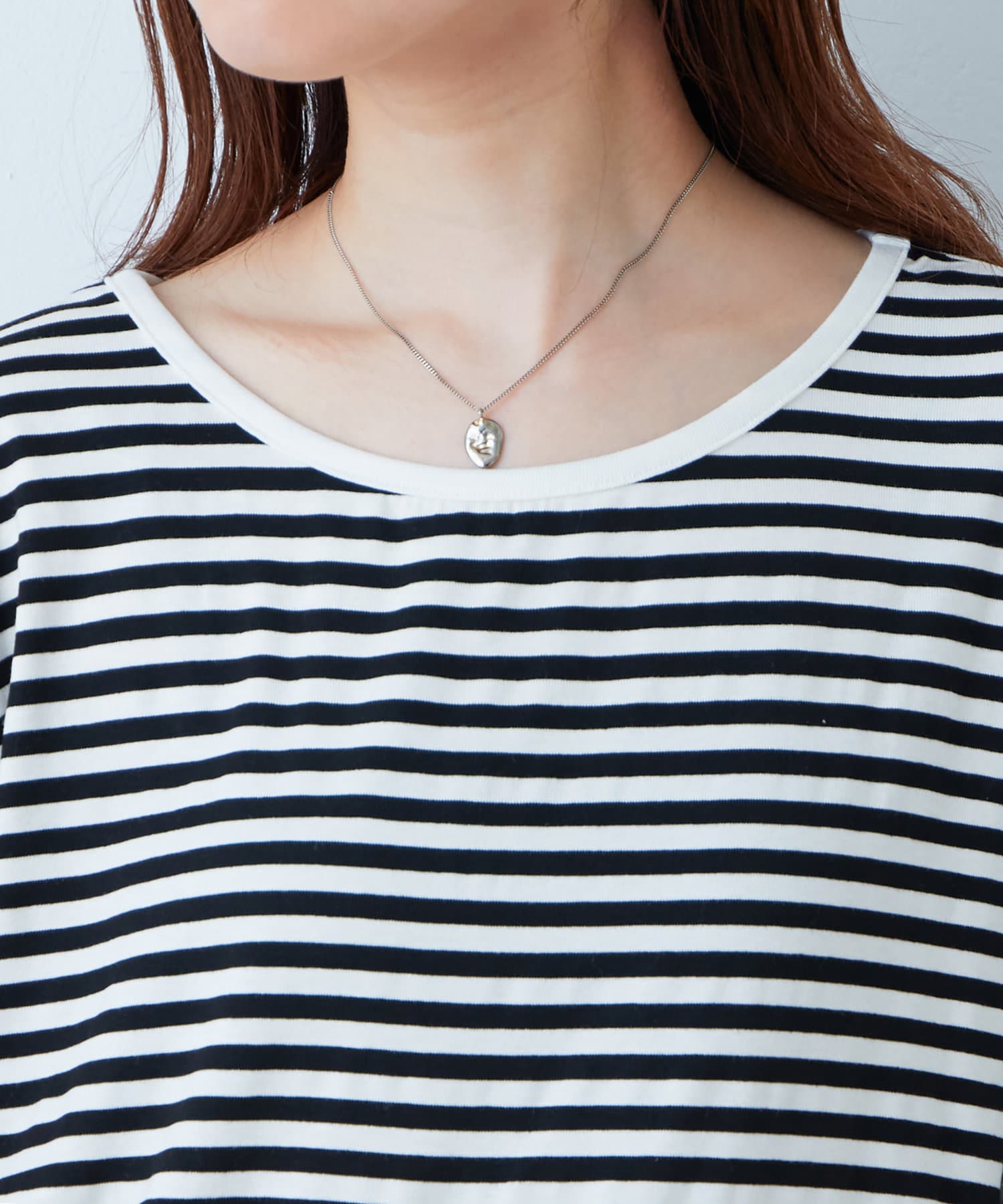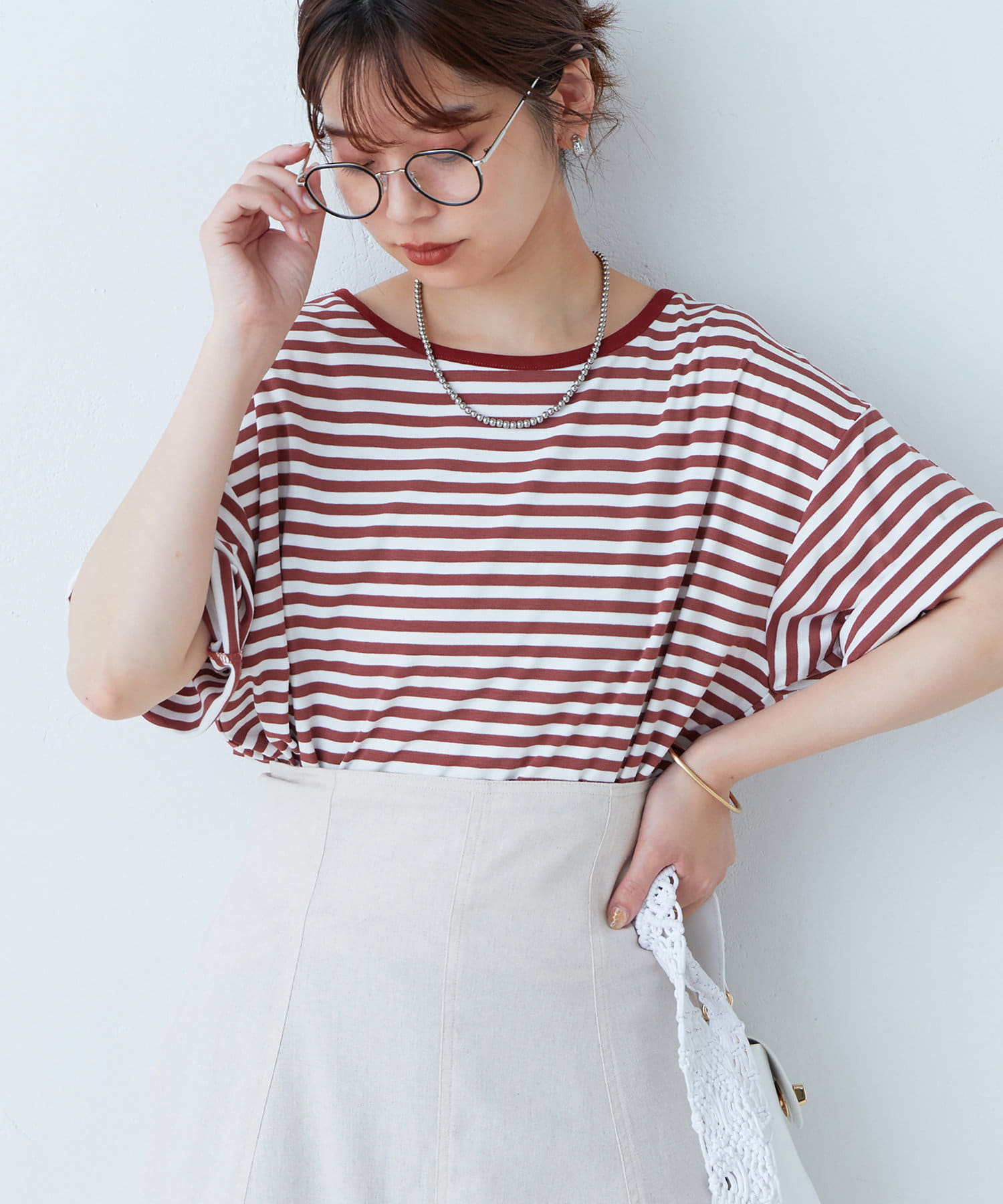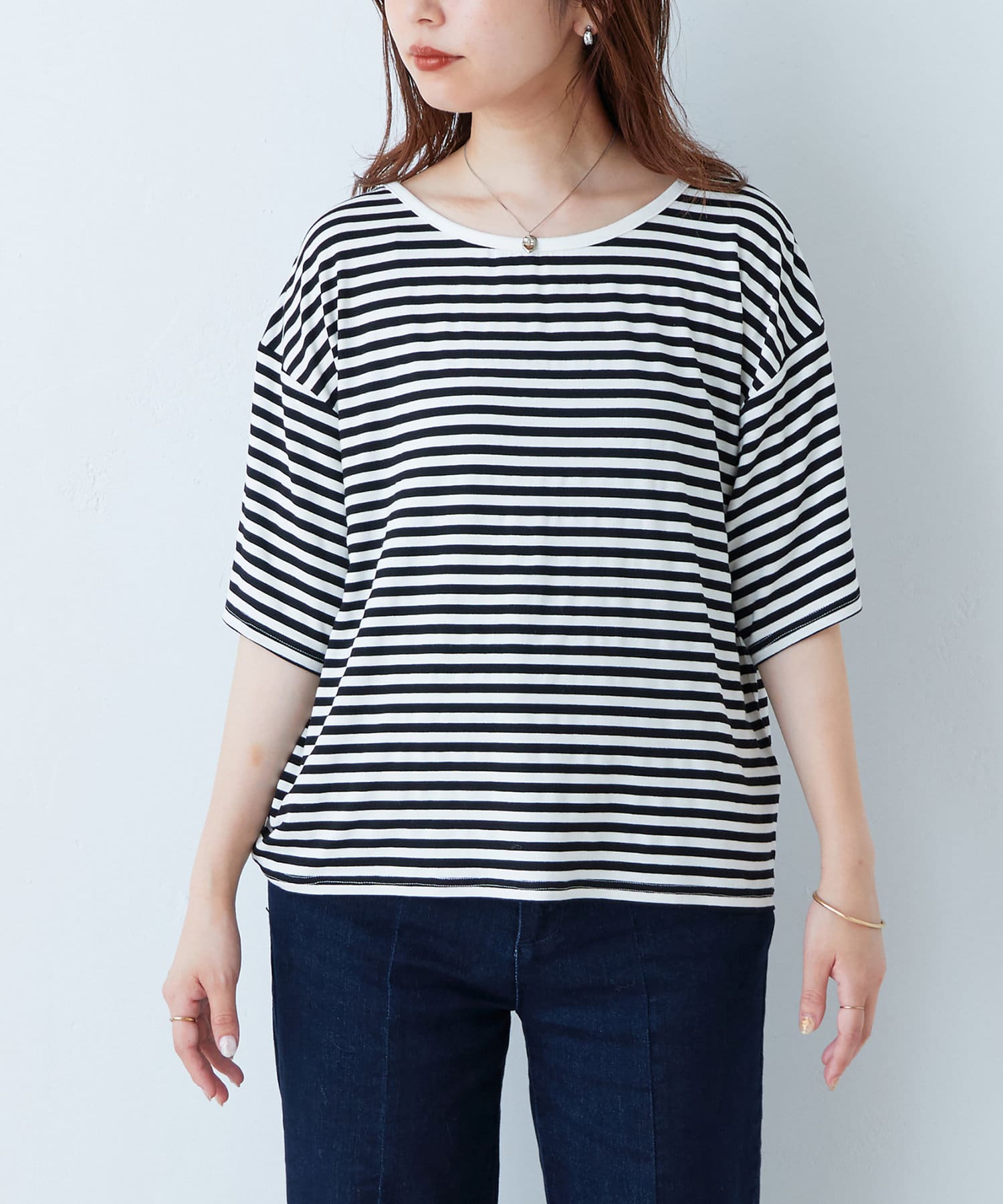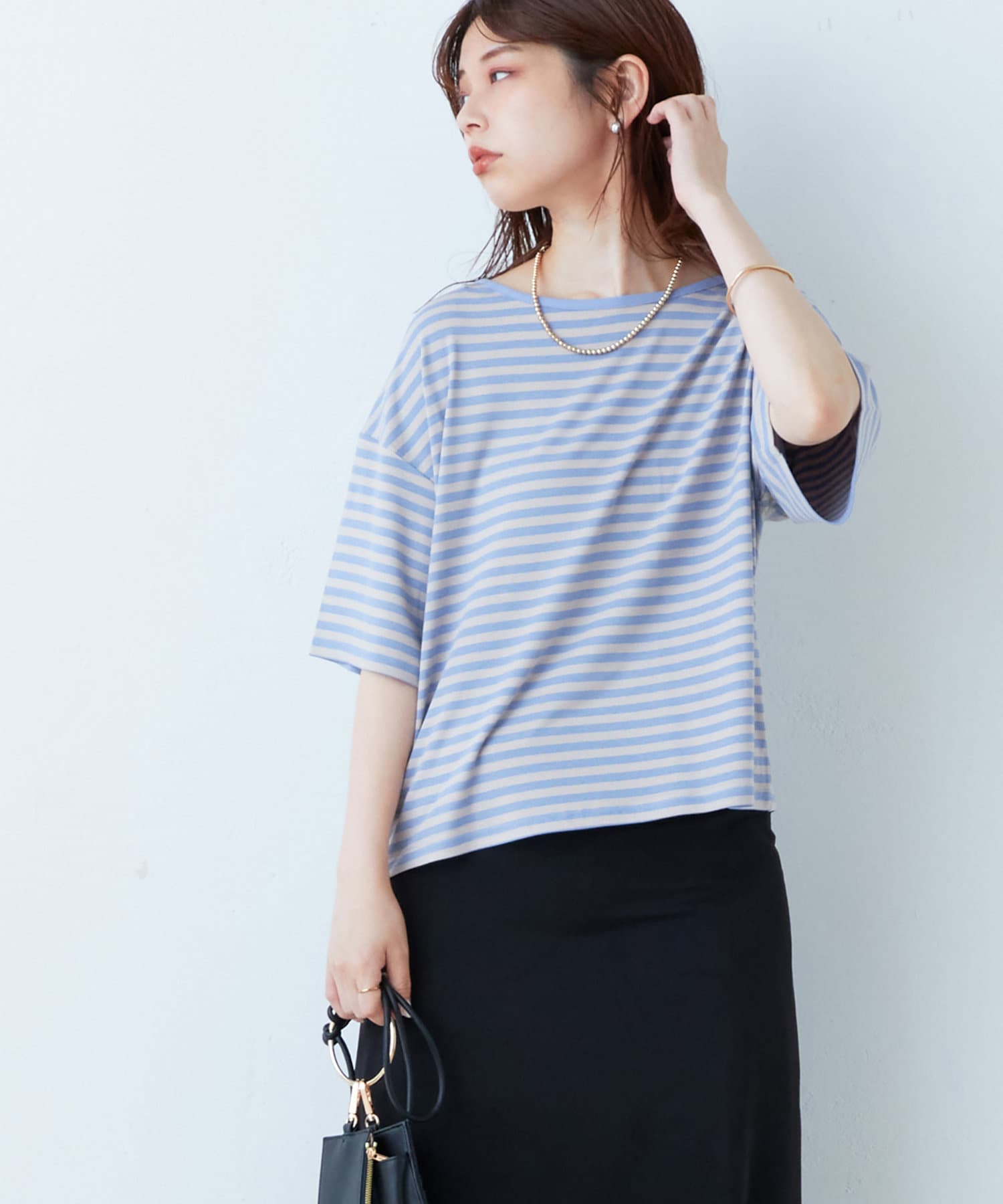 カジュアルな印象のボーダーTを、すっきりとしたネックラインで女性らしく仕上げ、