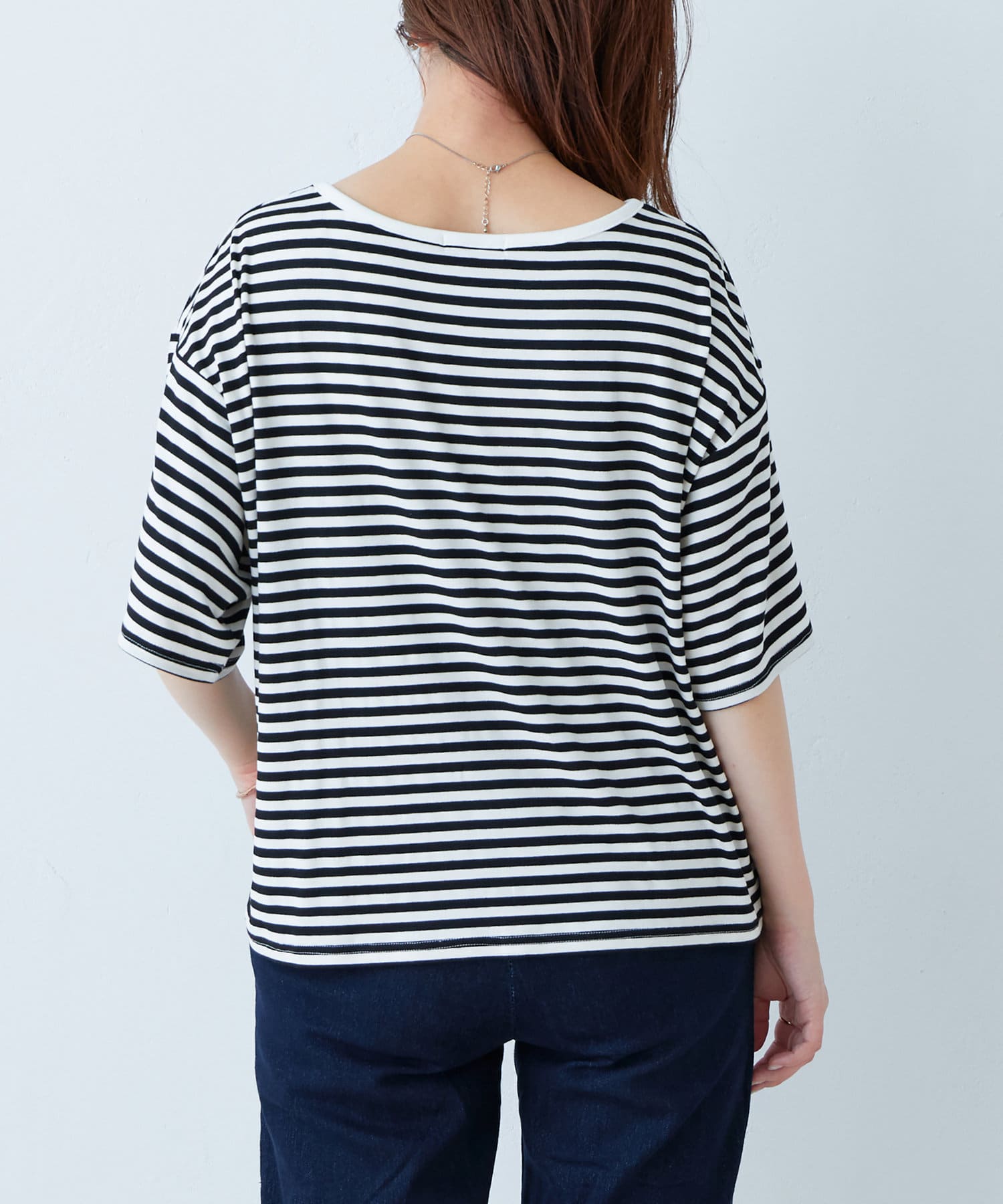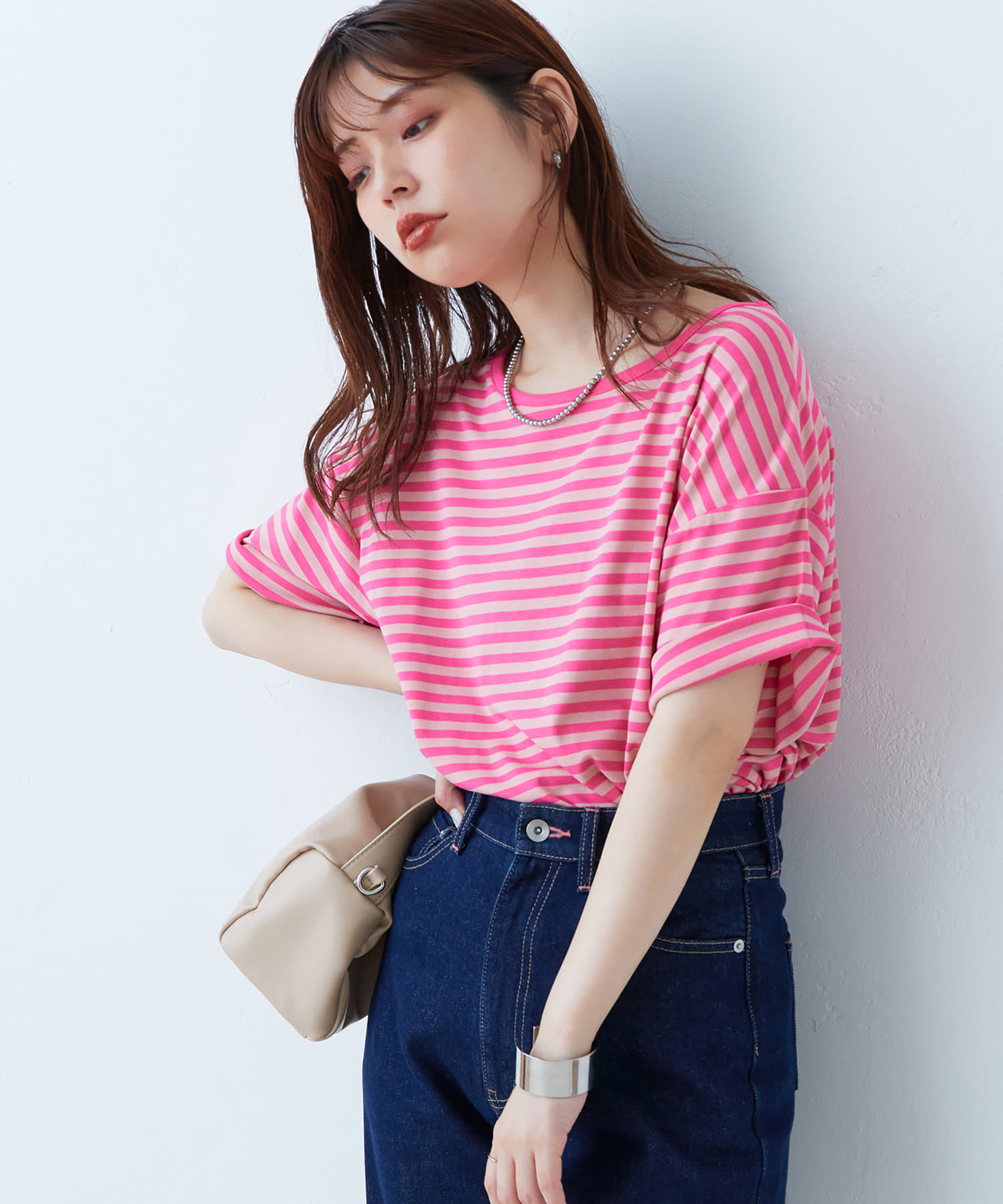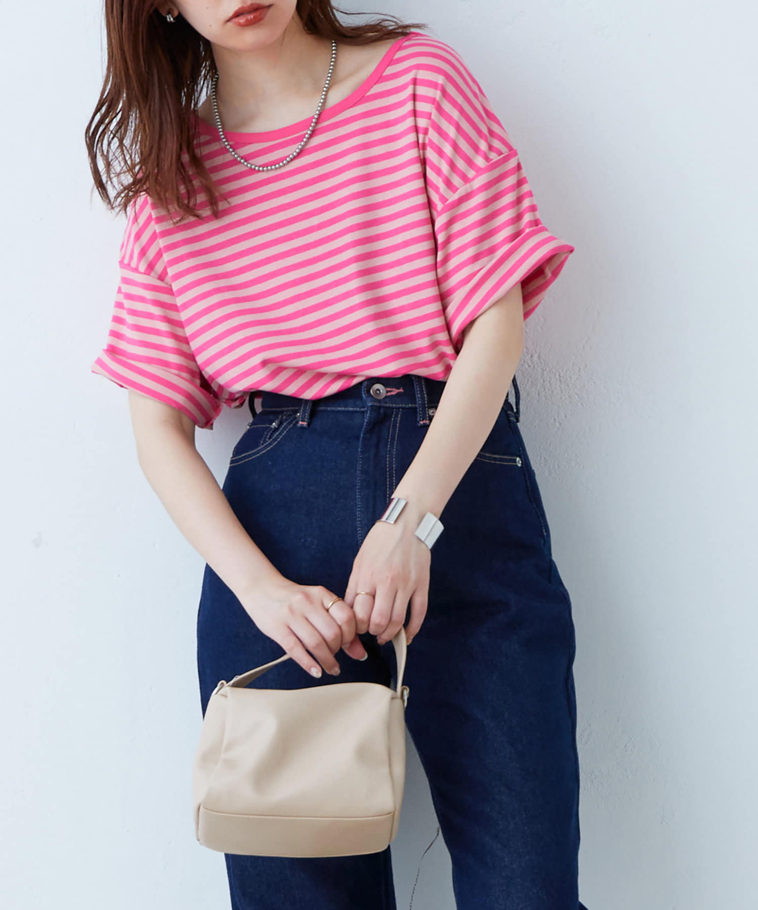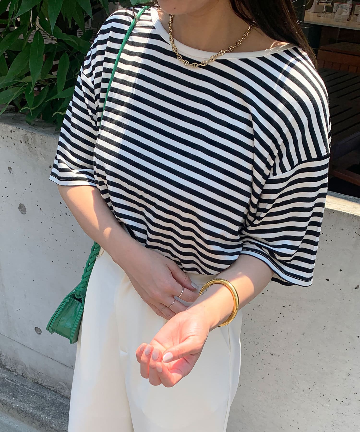 カジュアルな印象のボーダーTを、すっきりとしたネックラインで女性らしく仕上げ、