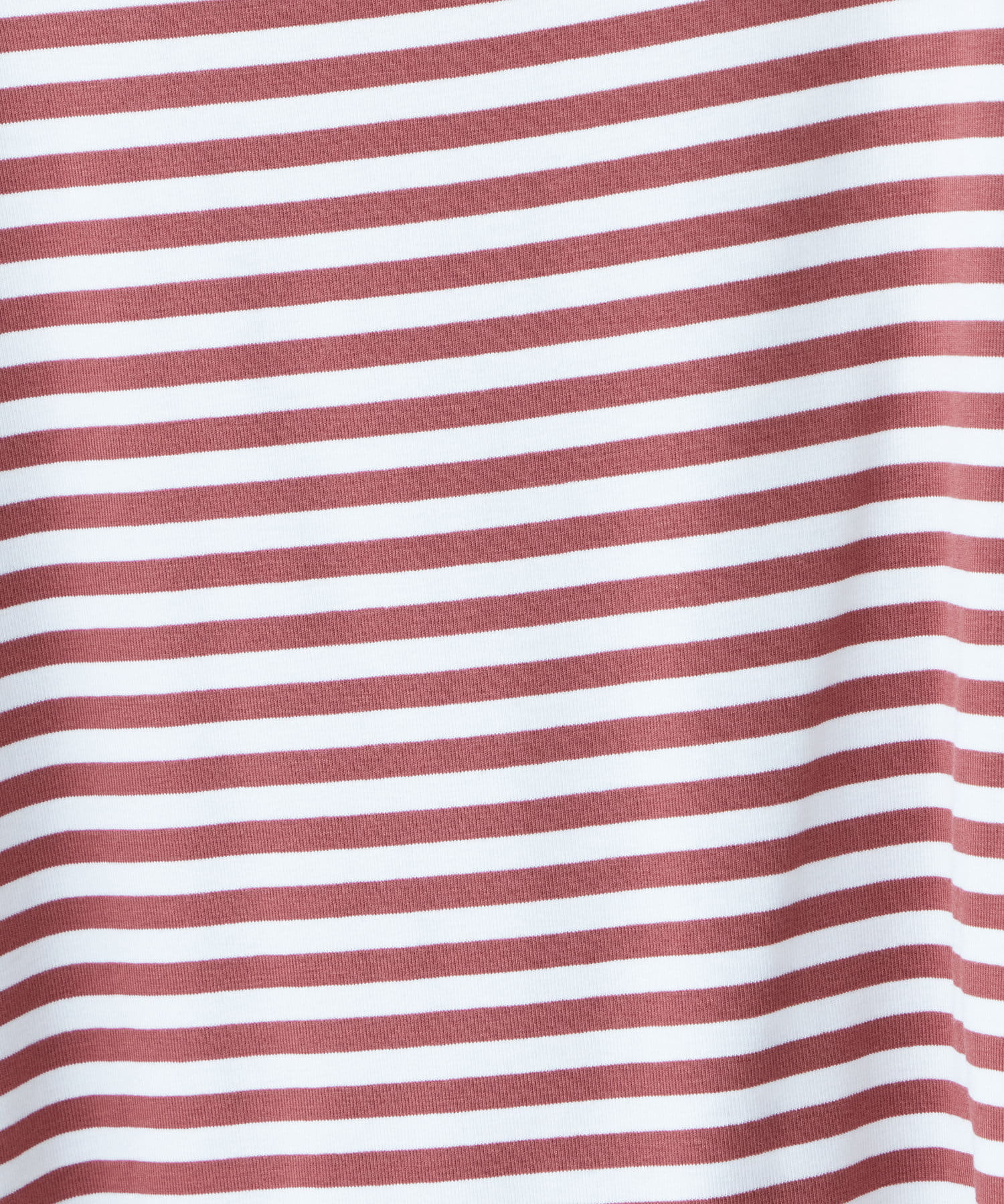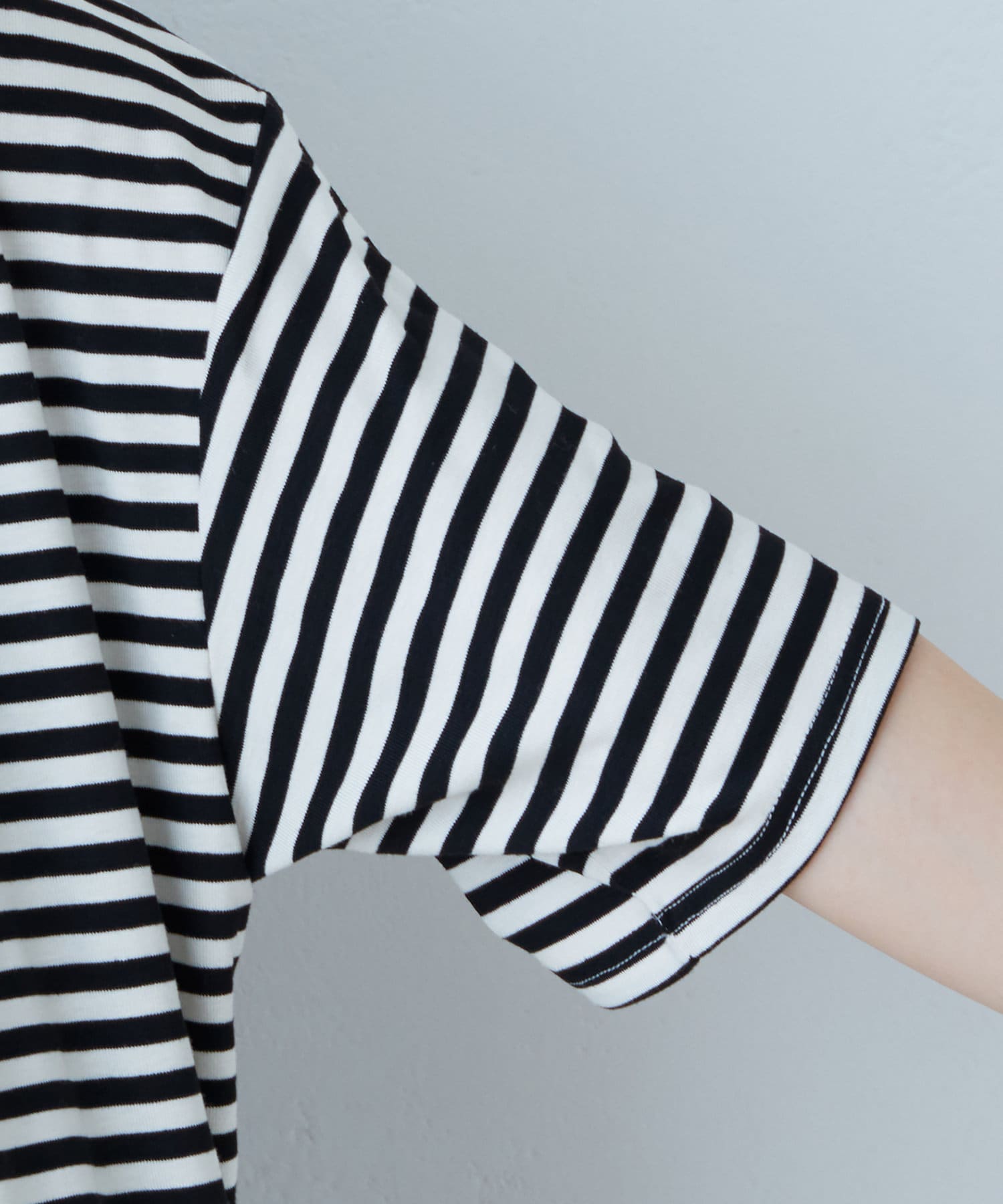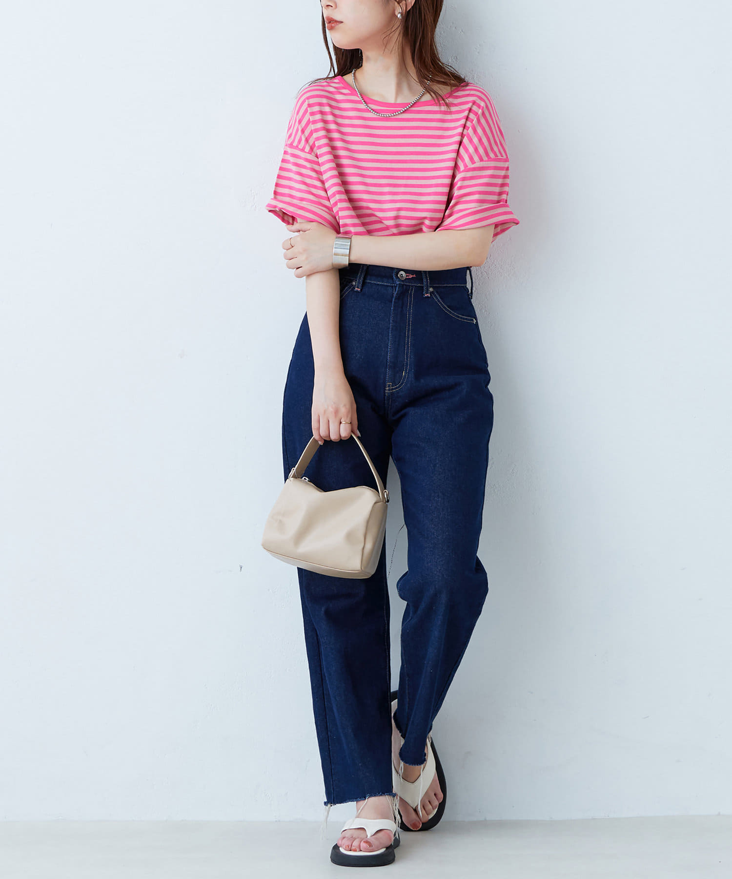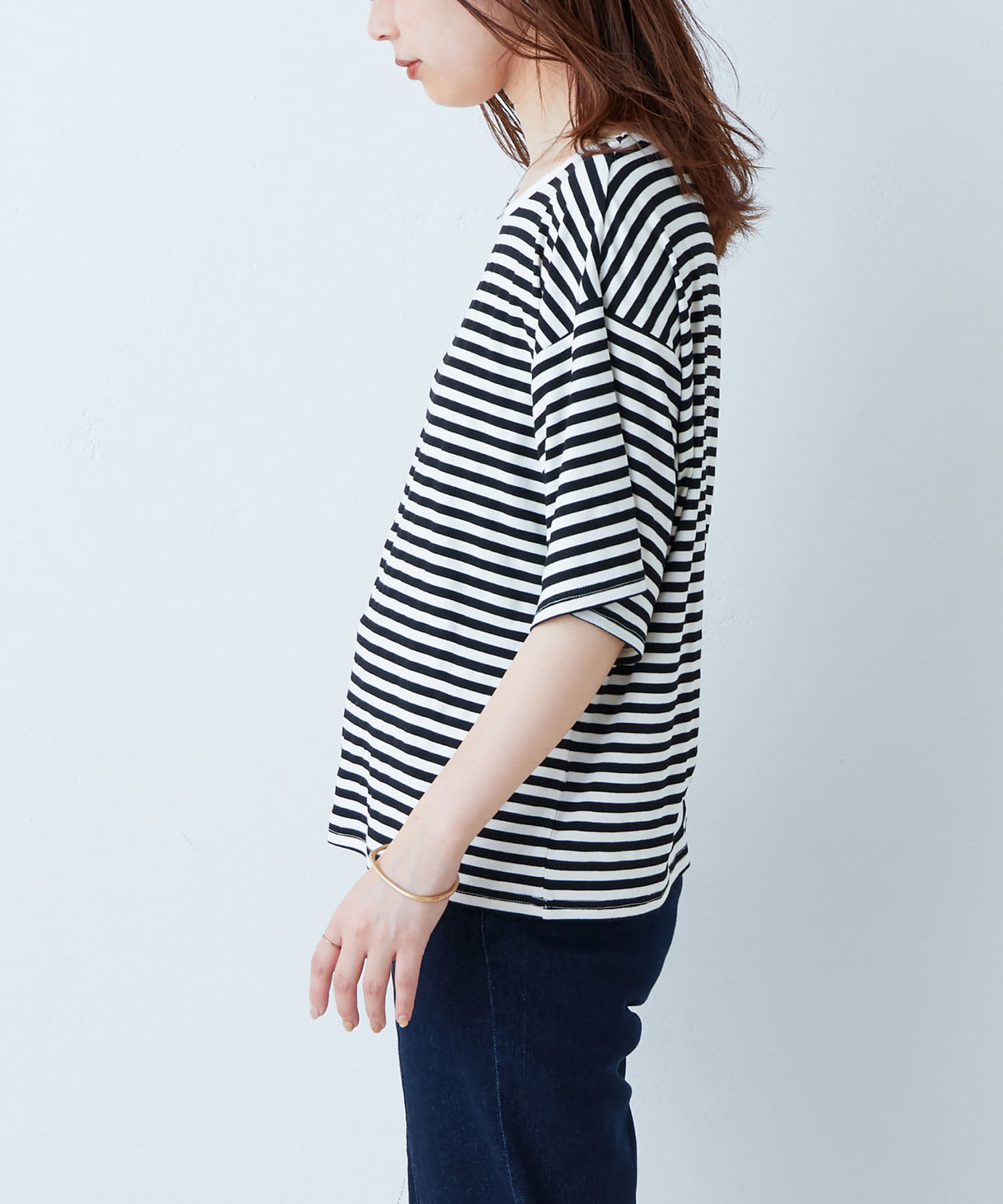 カジュアルな印象のボーダーTを、すっきりとしたネックラインで女性らしく仕上げ、