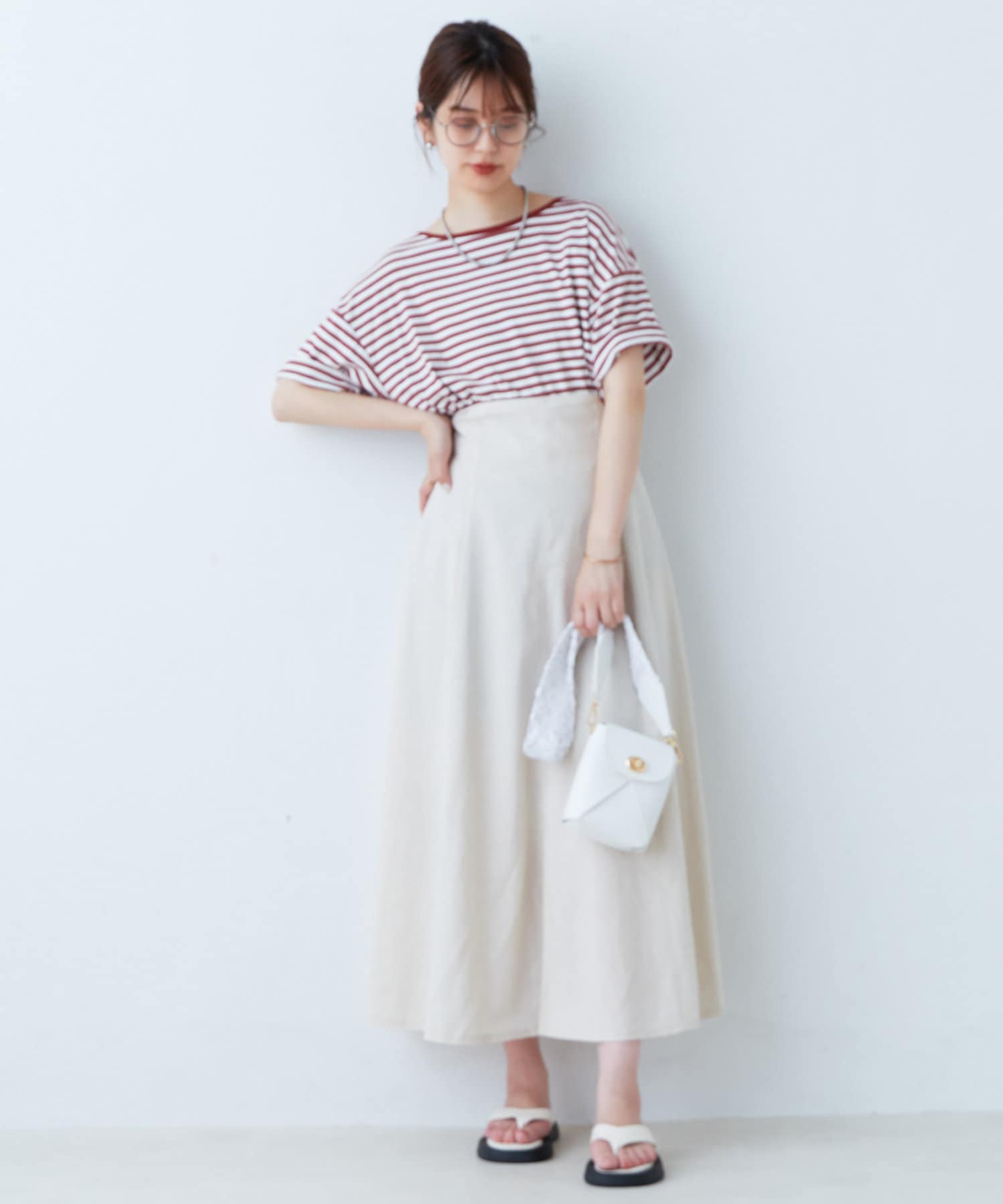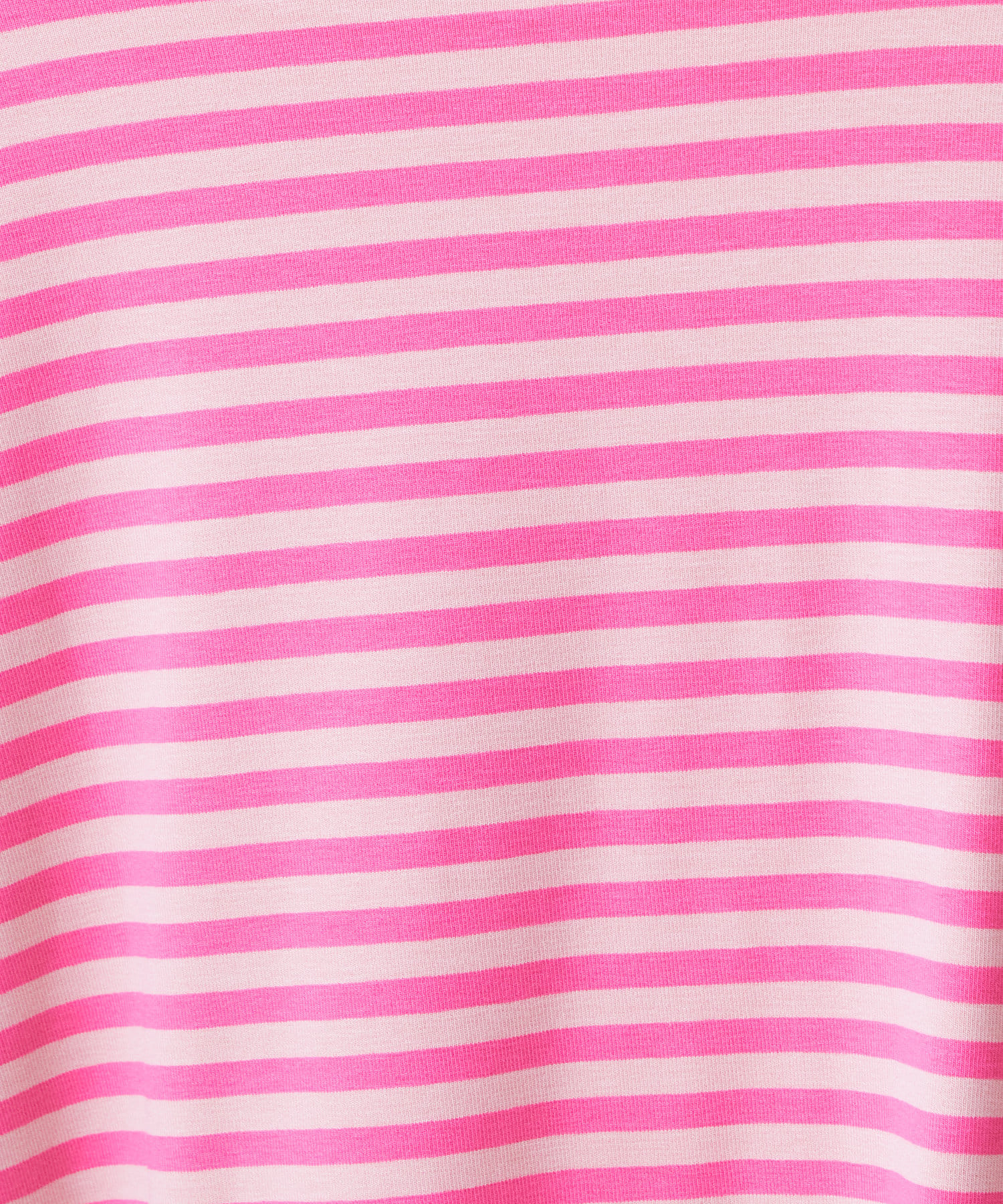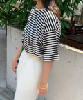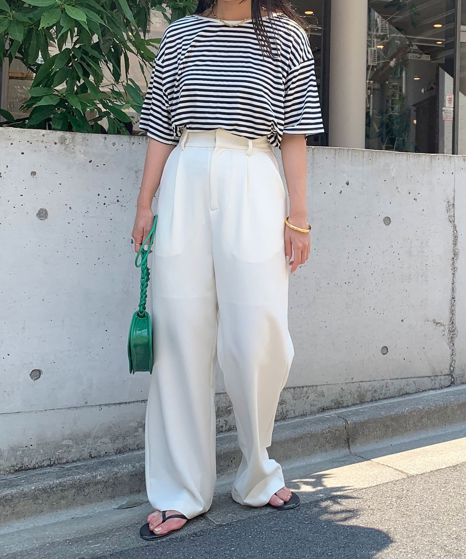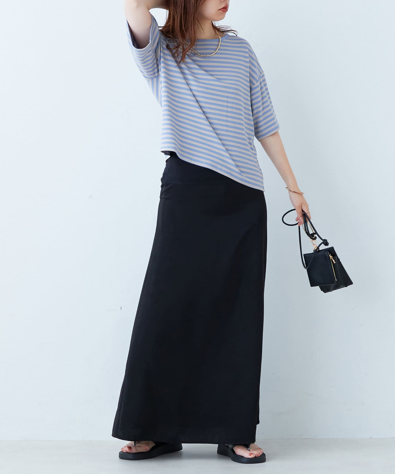 カジュアルな印象のボーダーTを、すっきりとしたネックラインで女性らしく仕上げ、