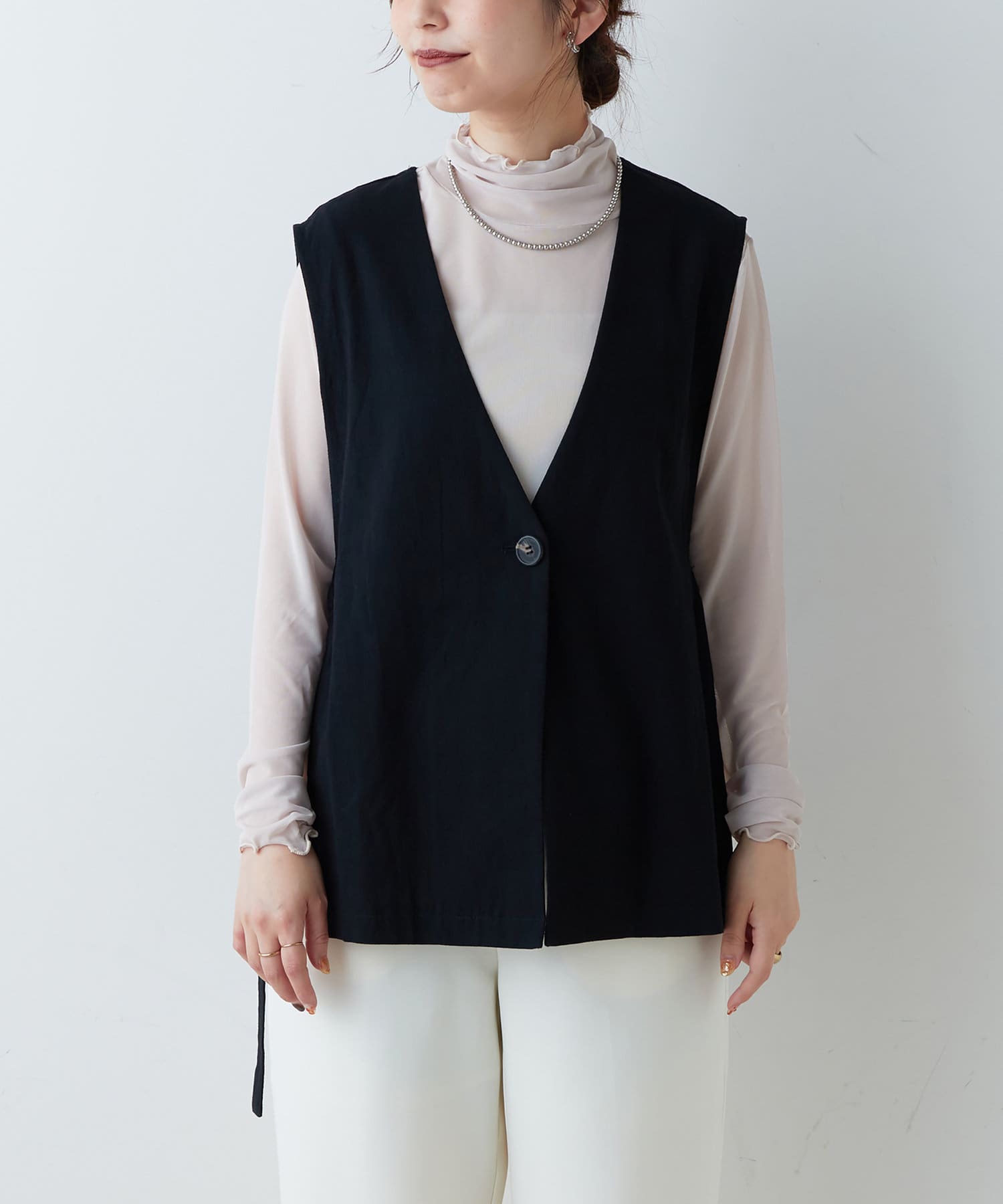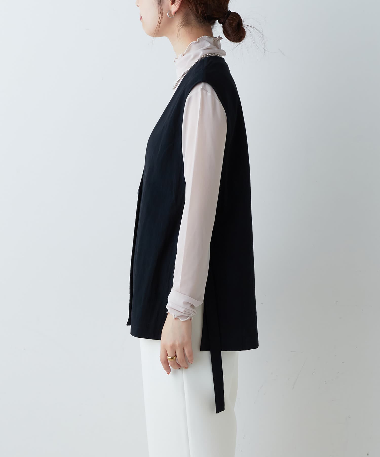 サイドには、調整可能なベルトを施し、ポイント見えと、合わせるアイテムによってお好みの雰囲気でお召し頂けます。