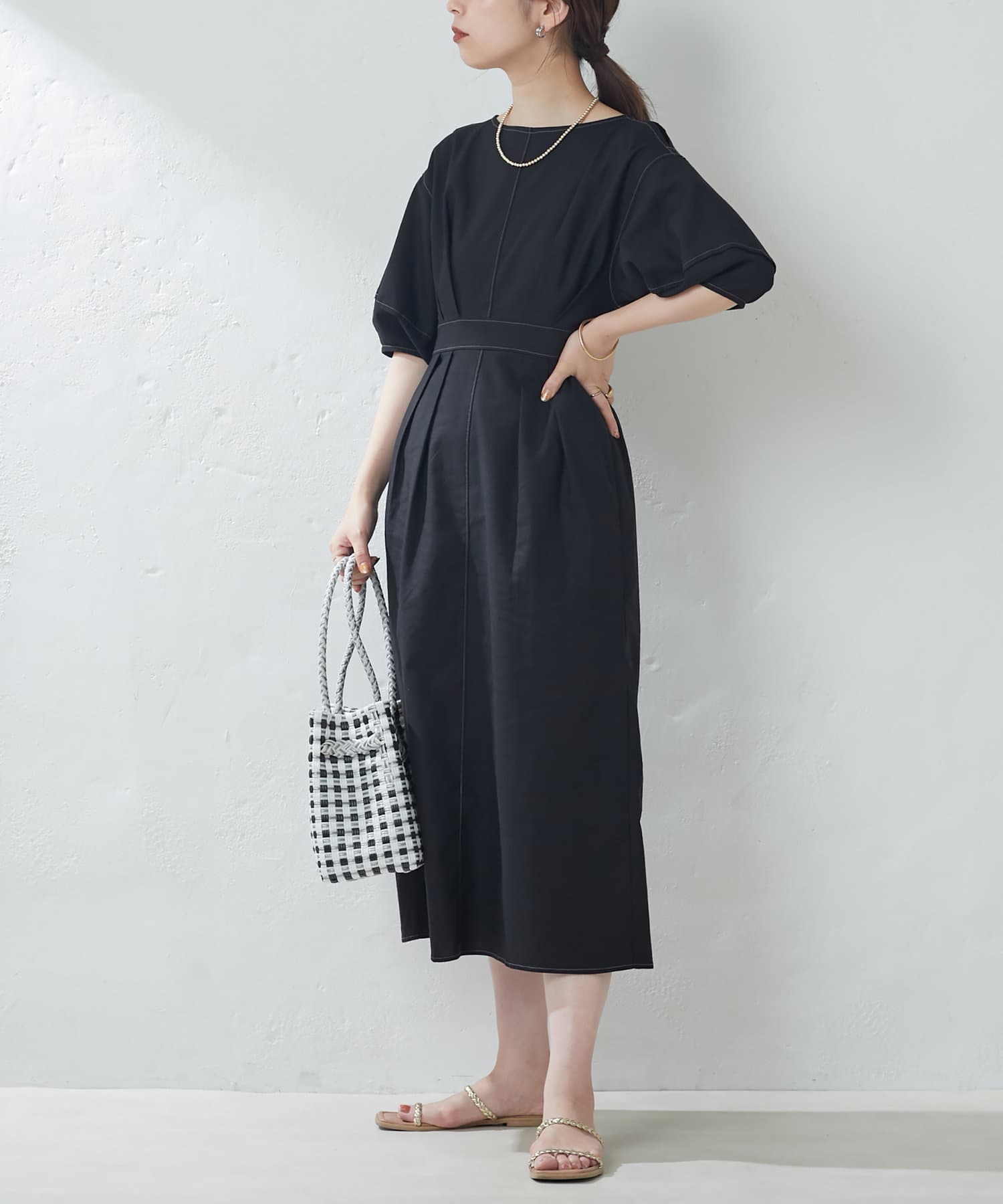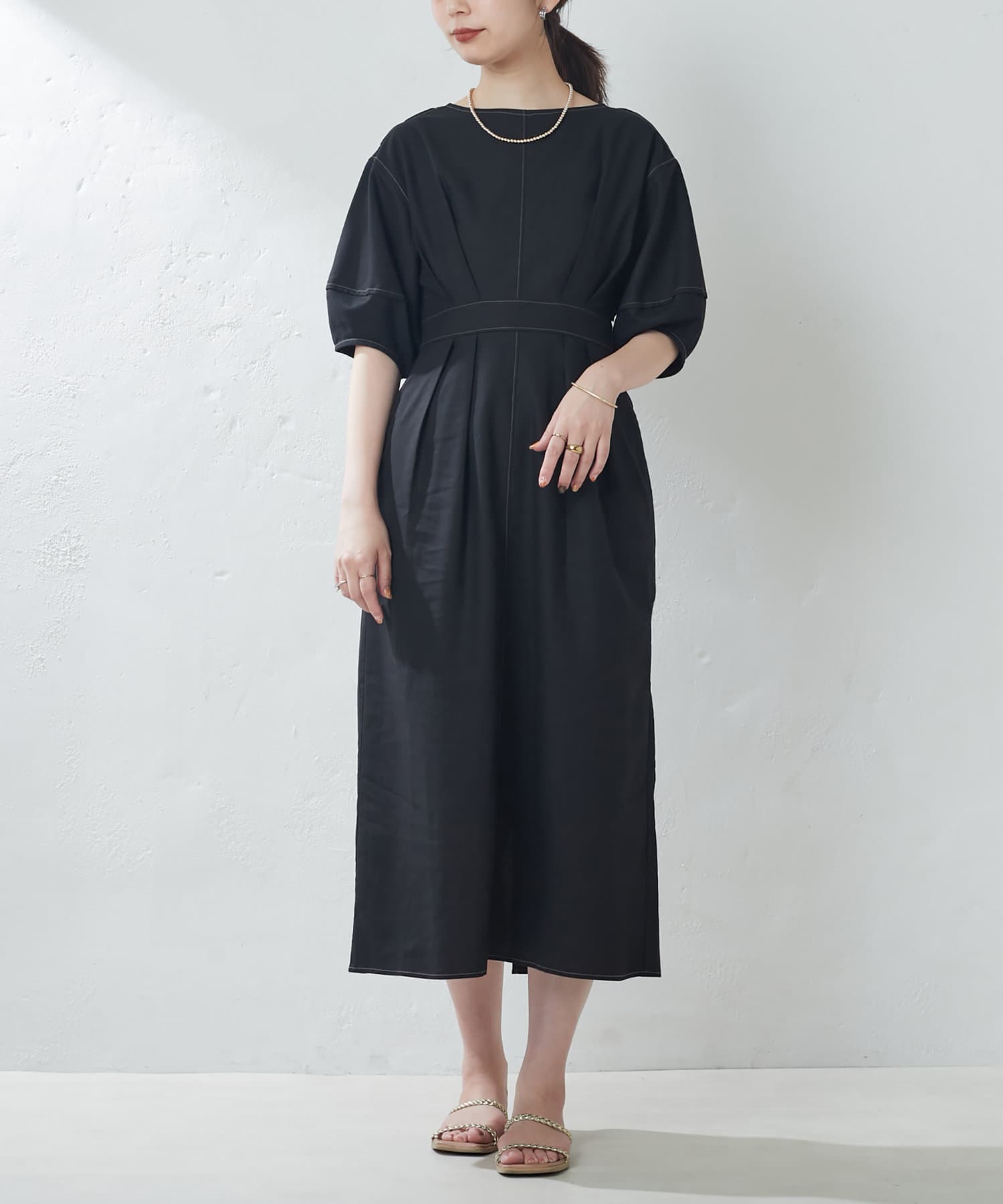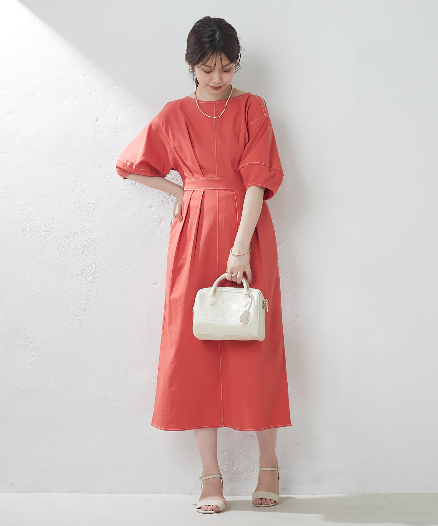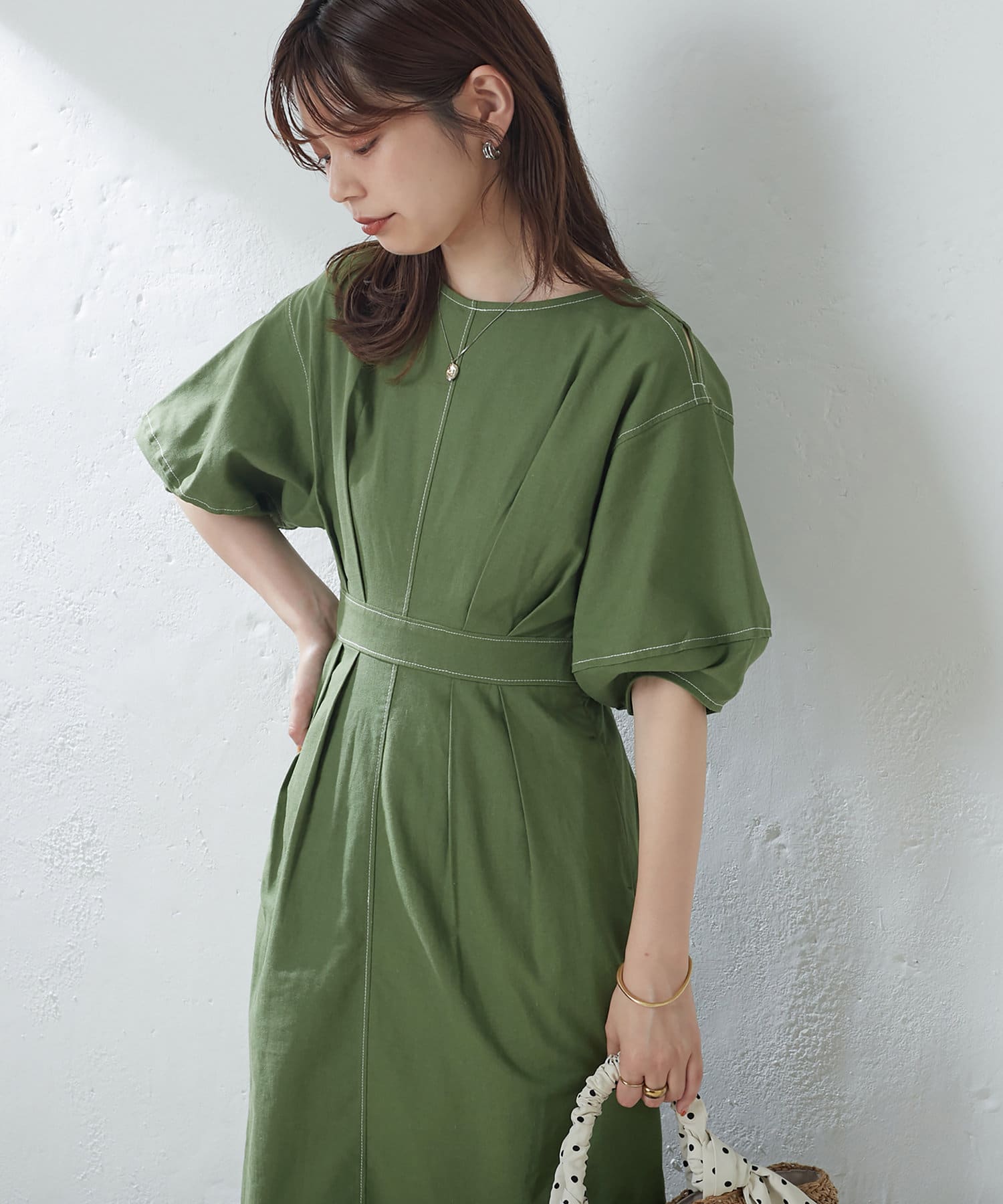上品なランタンスリーブデザインと、さりげないステッチ使いが魅力な、今季注目のワンピースの登場です。