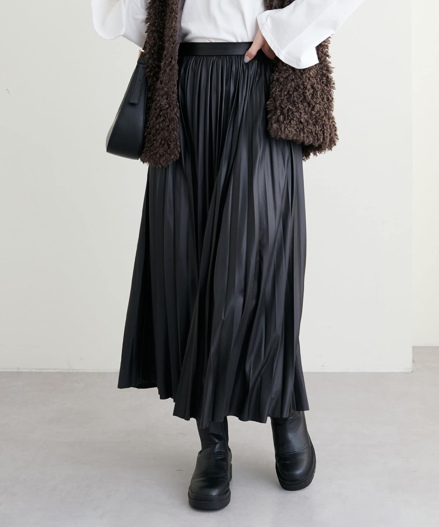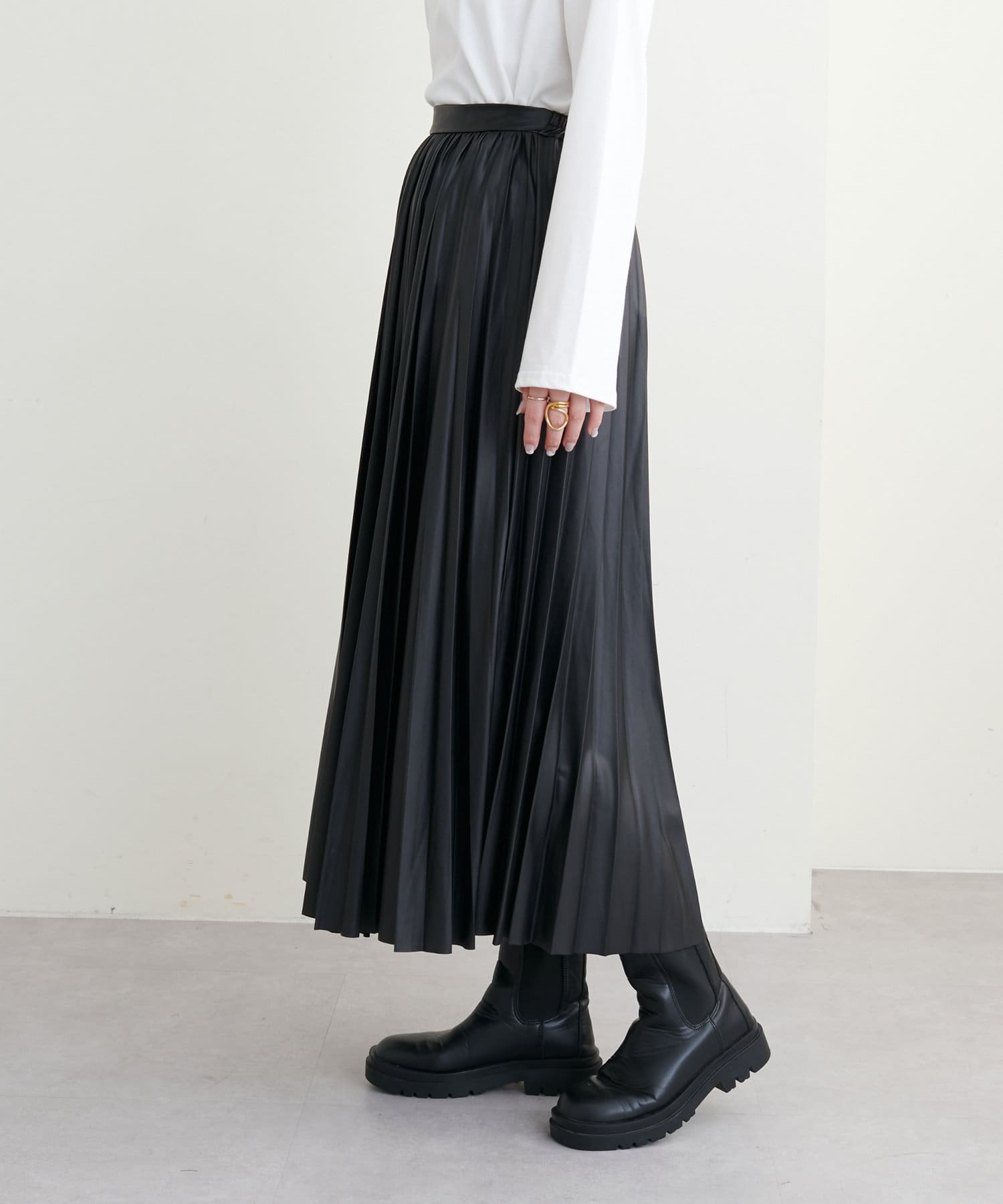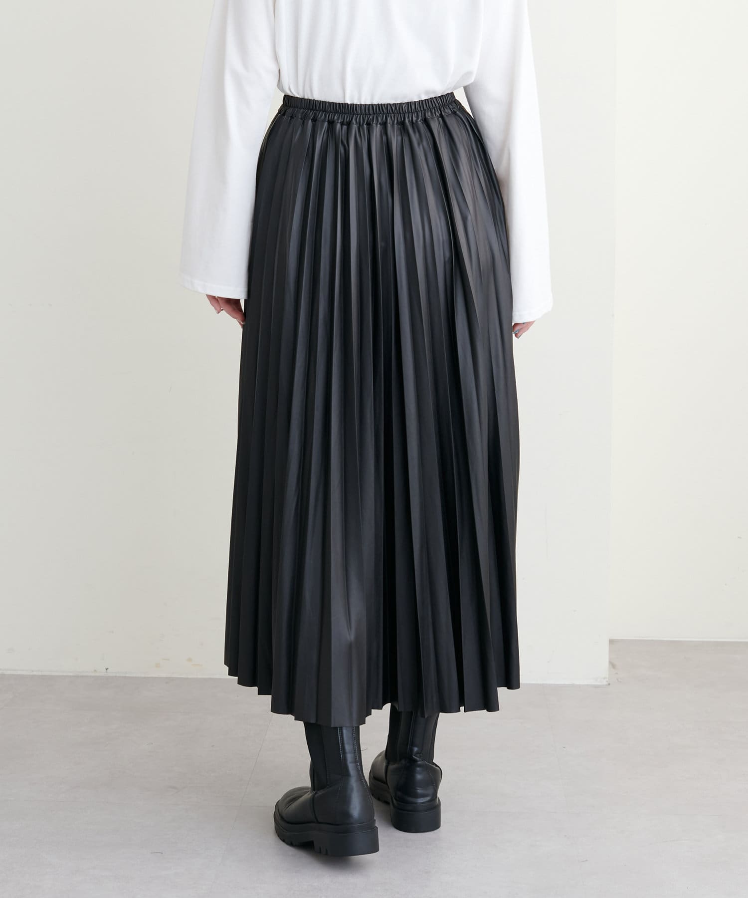 他にない質感でモードな雰囲気 薄手合皮プリーツスカート