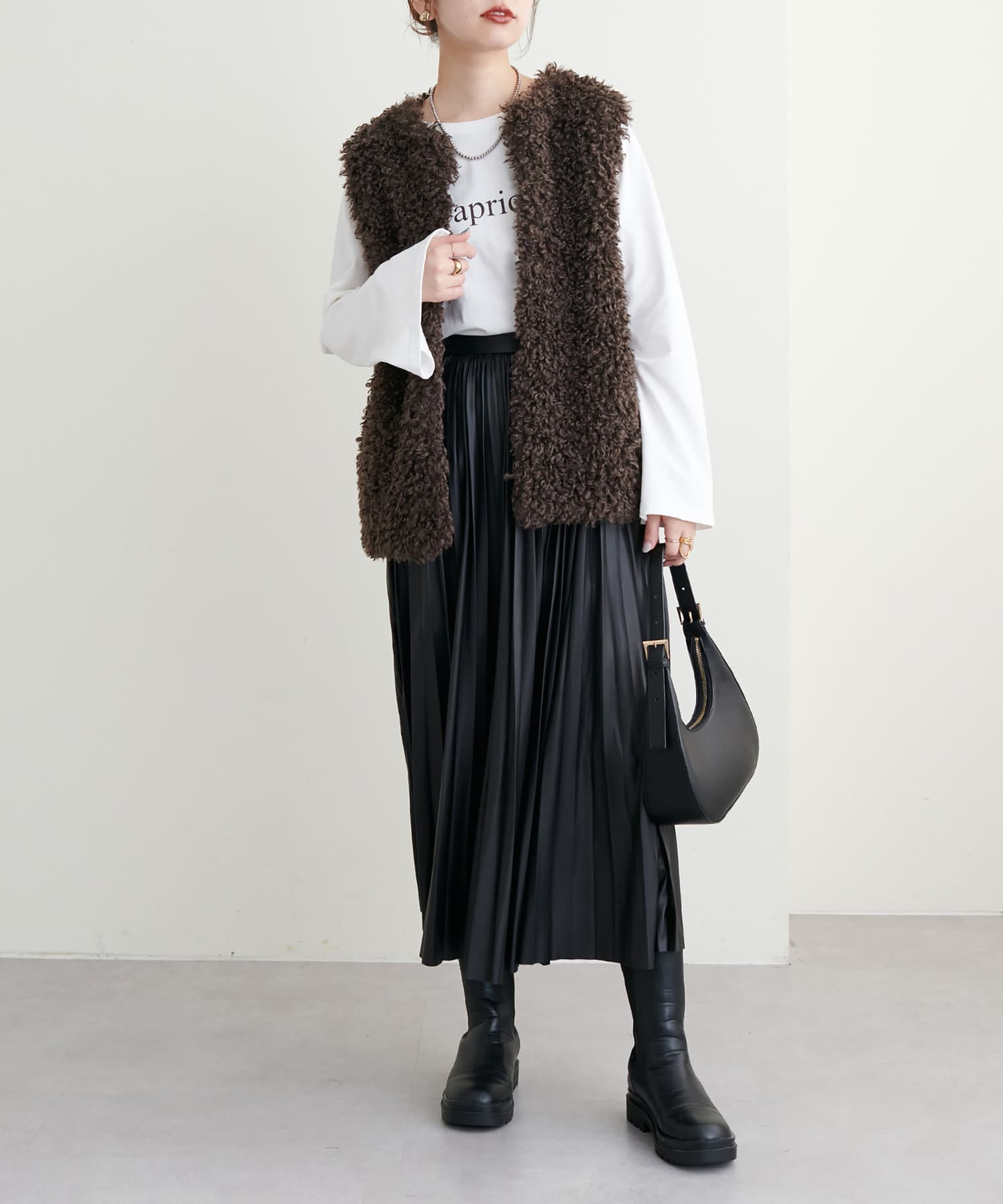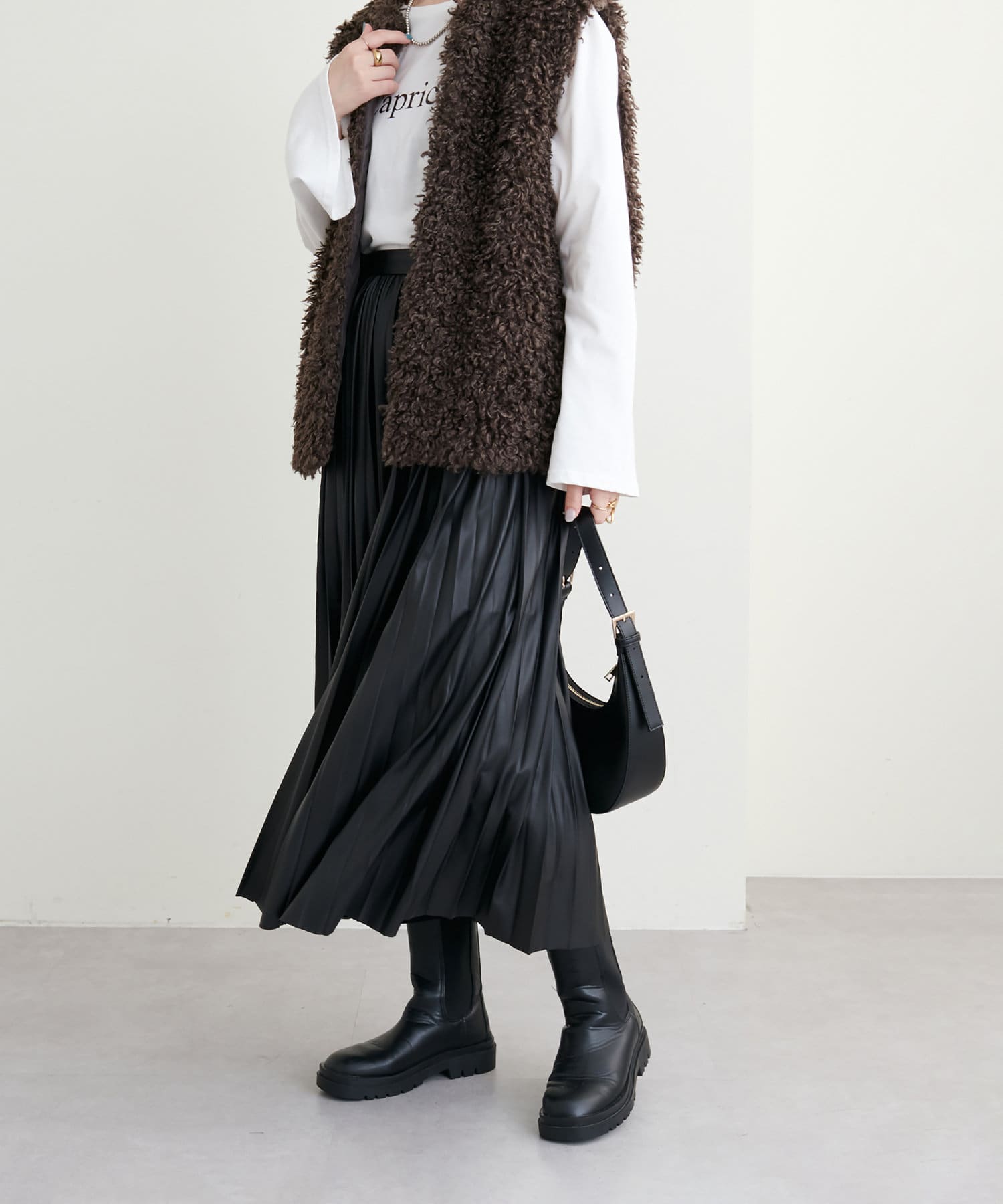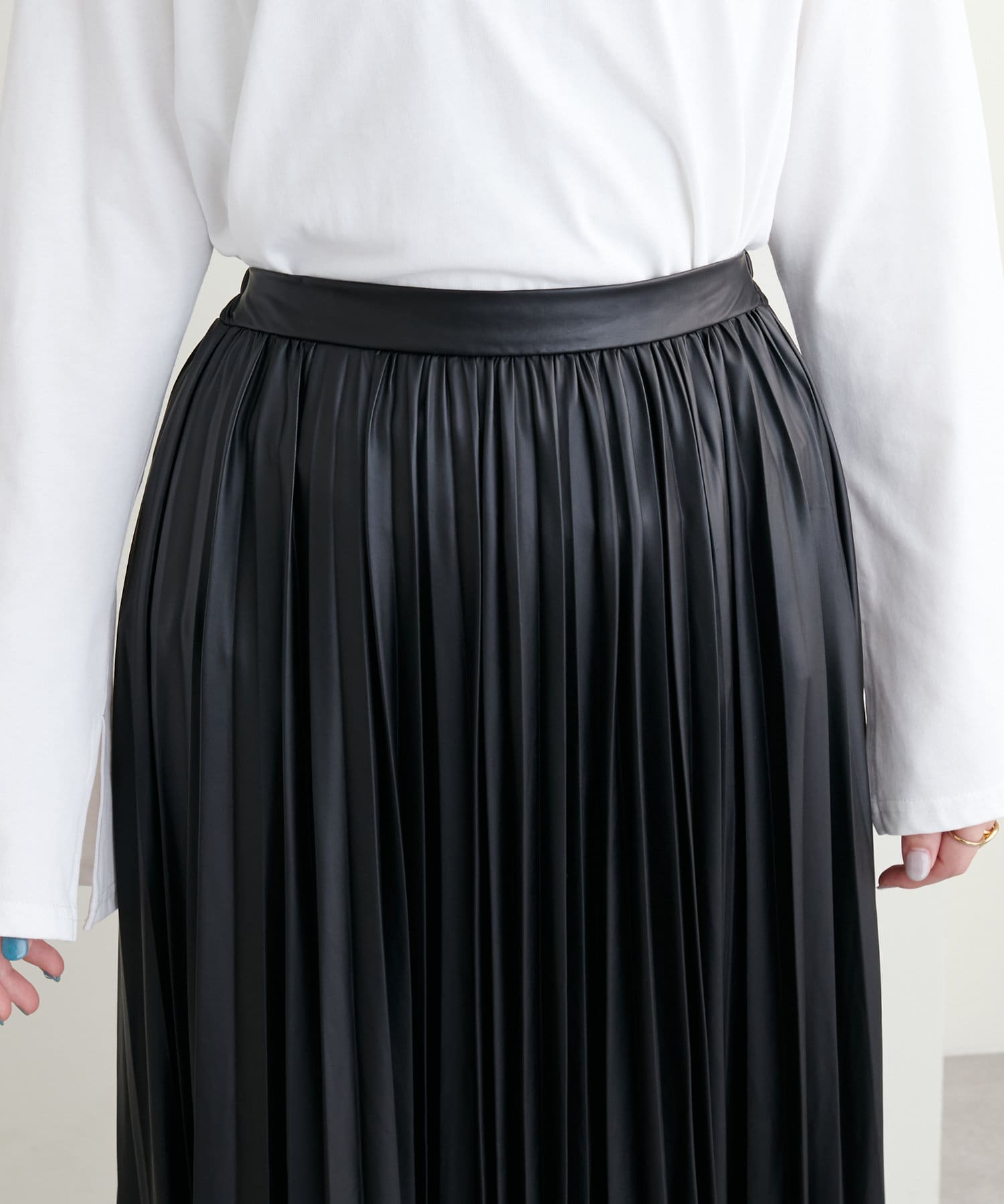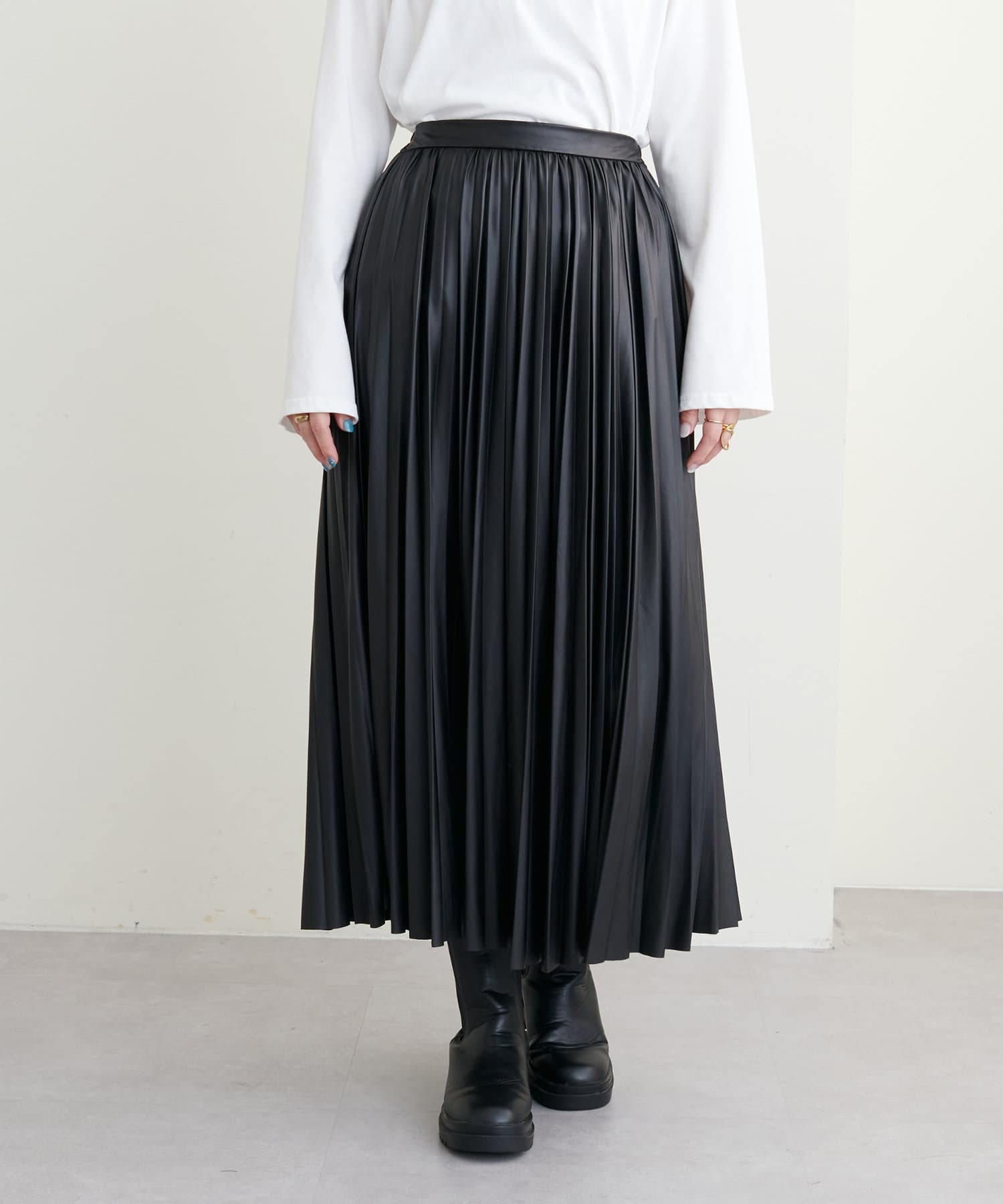 他にない質感でモードな雰囲気 薄手合皮プリーツスカート