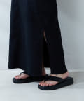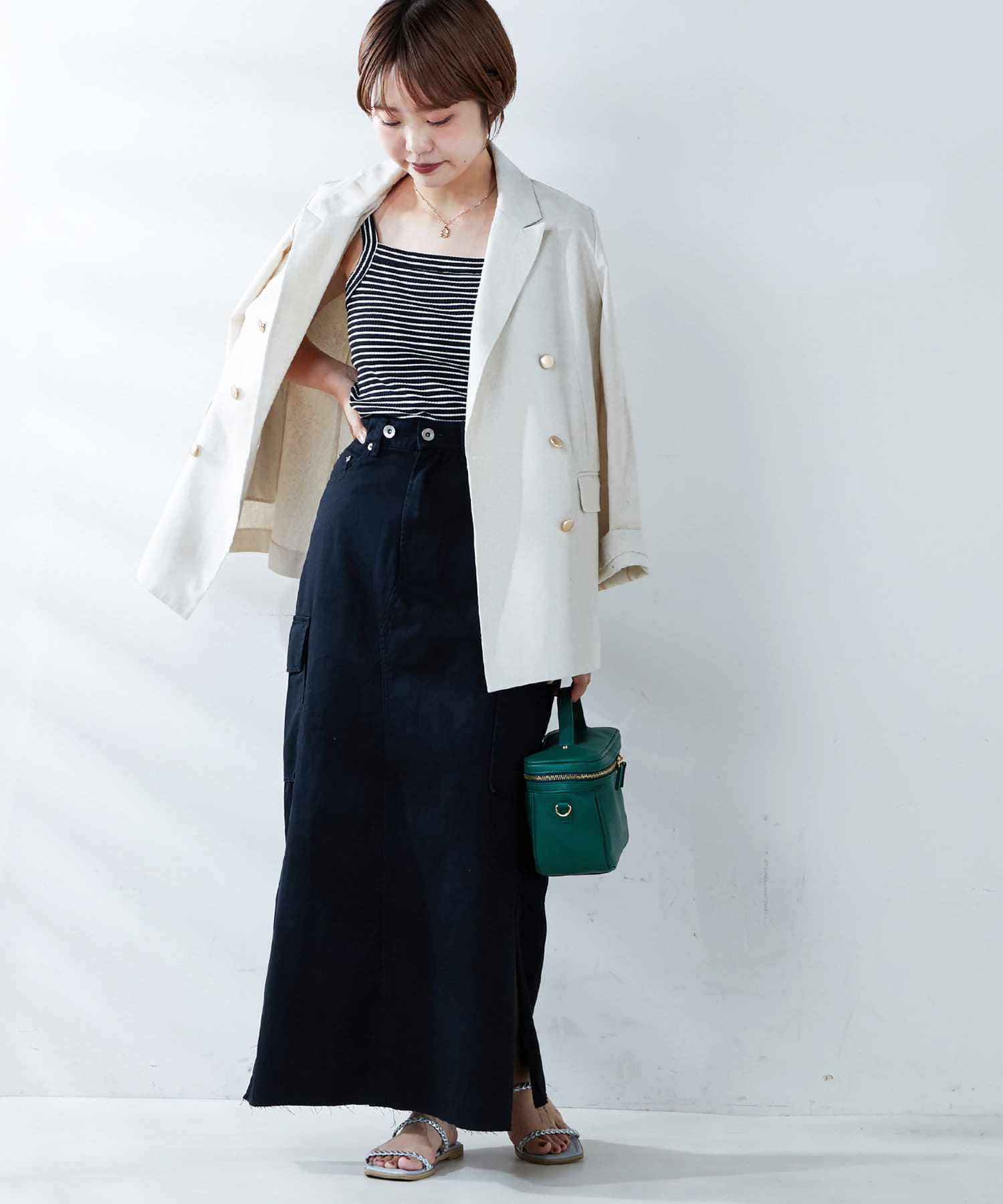 足元は、ストラップサンダルや雑材のミュール、フラットなサンダルを合わせると