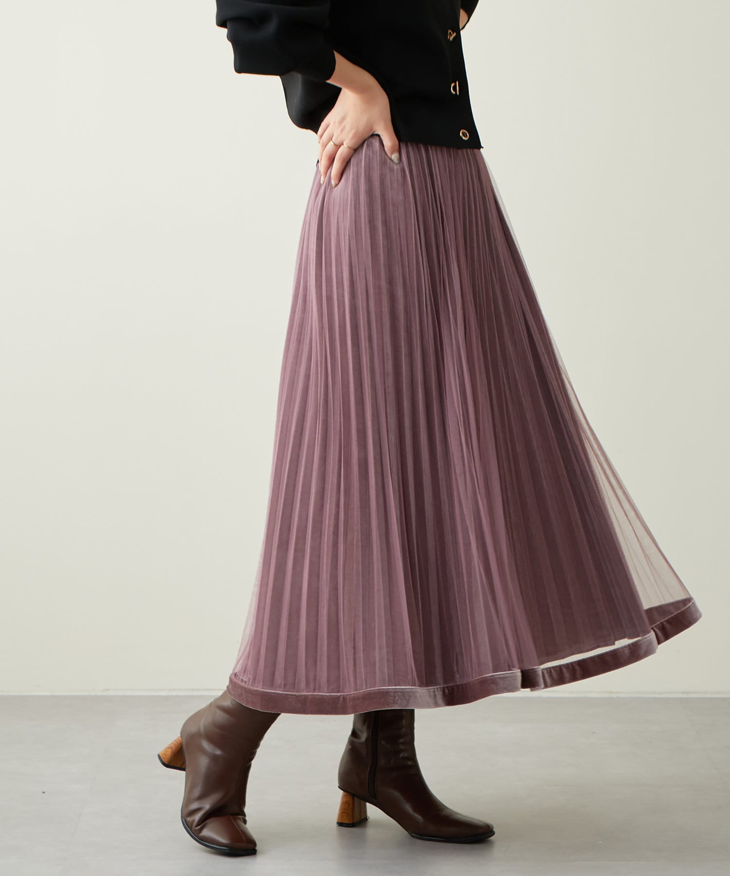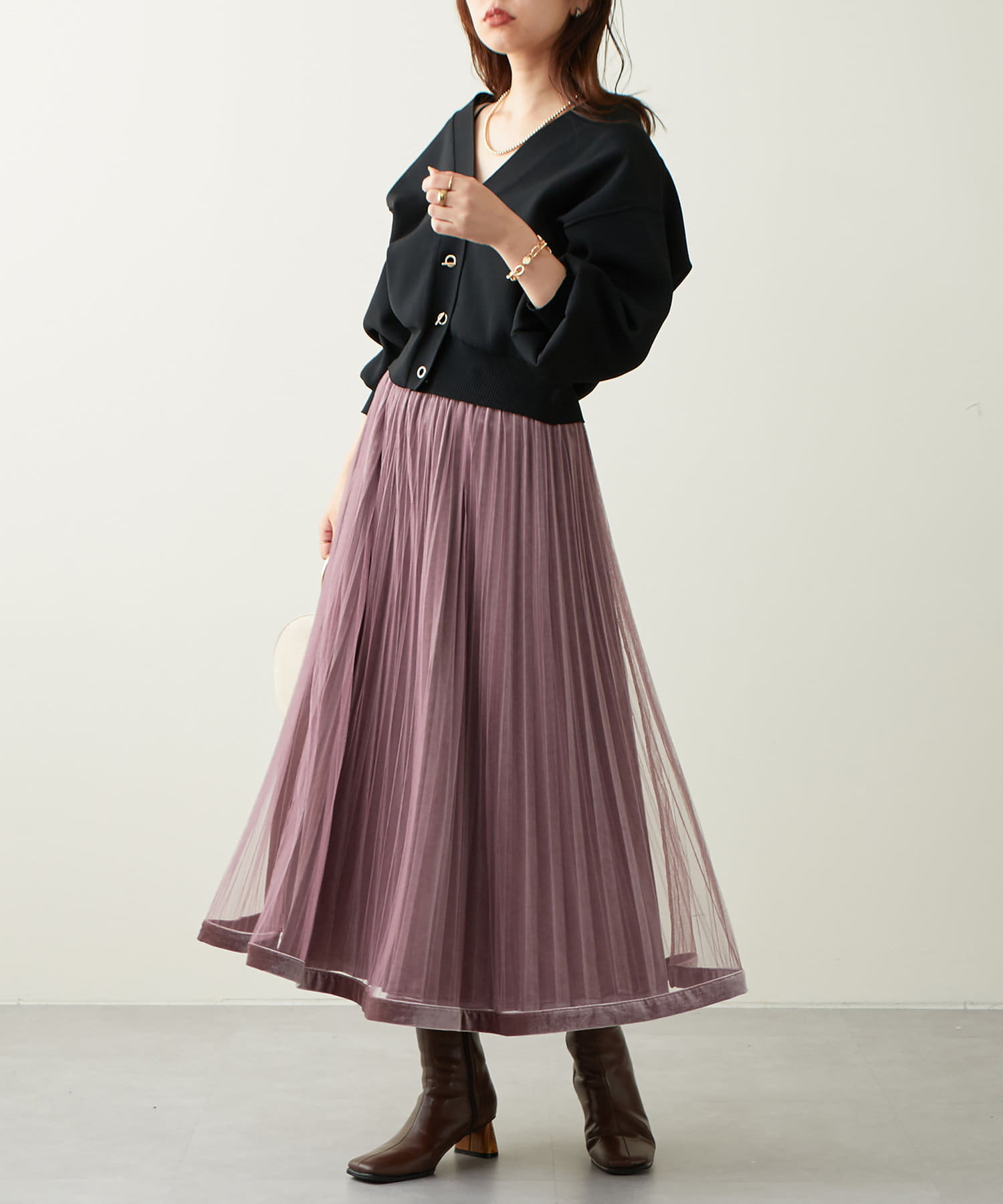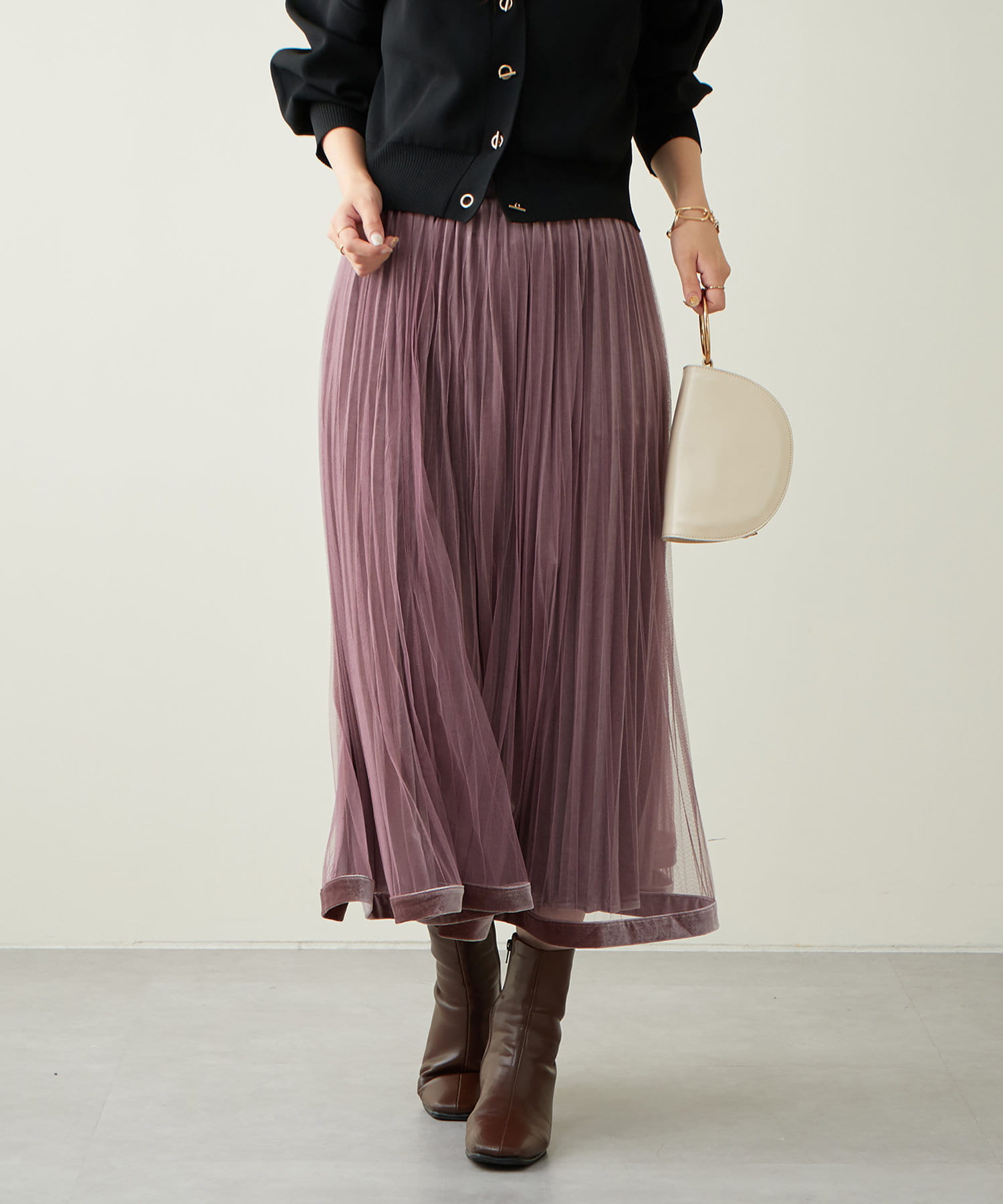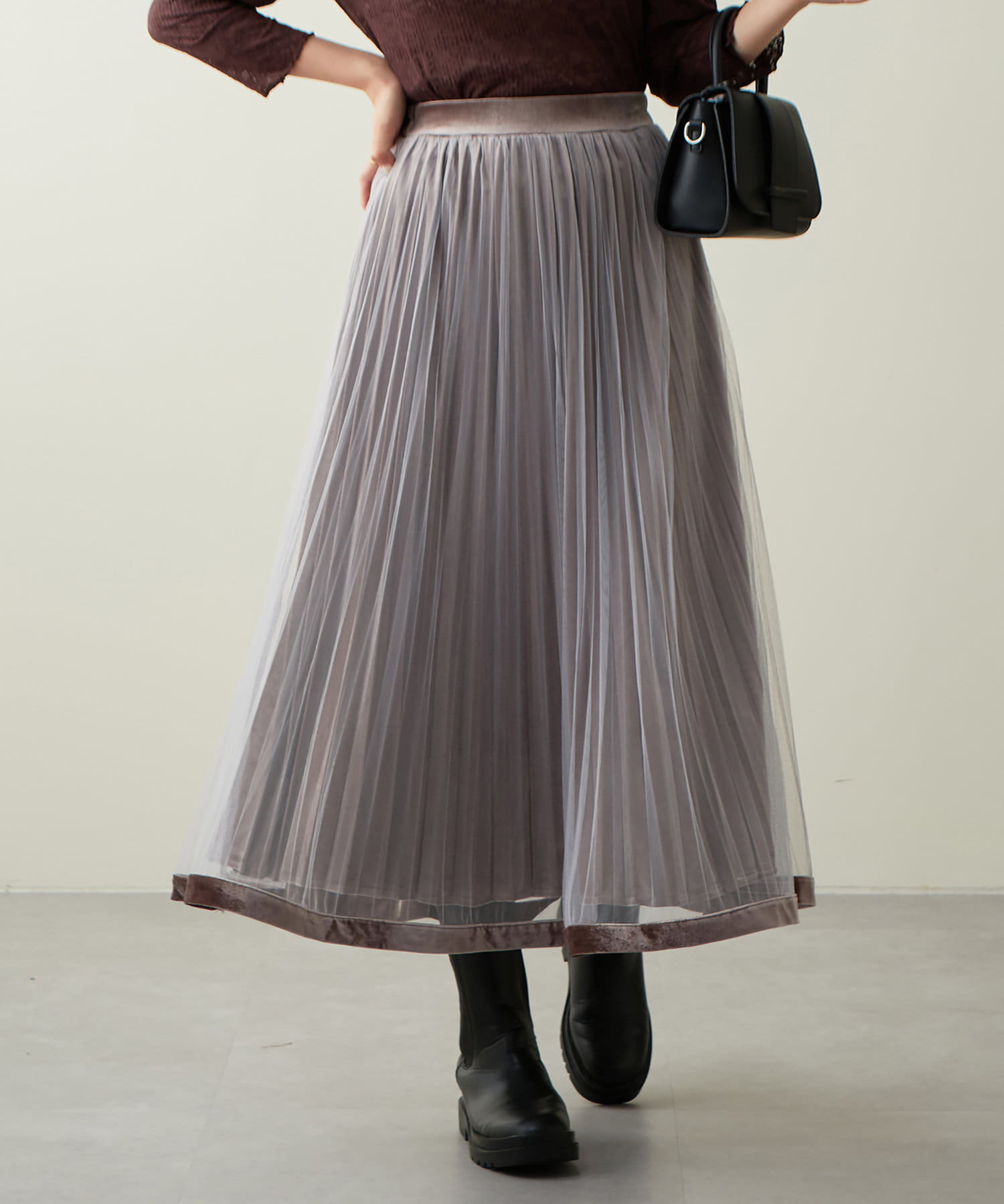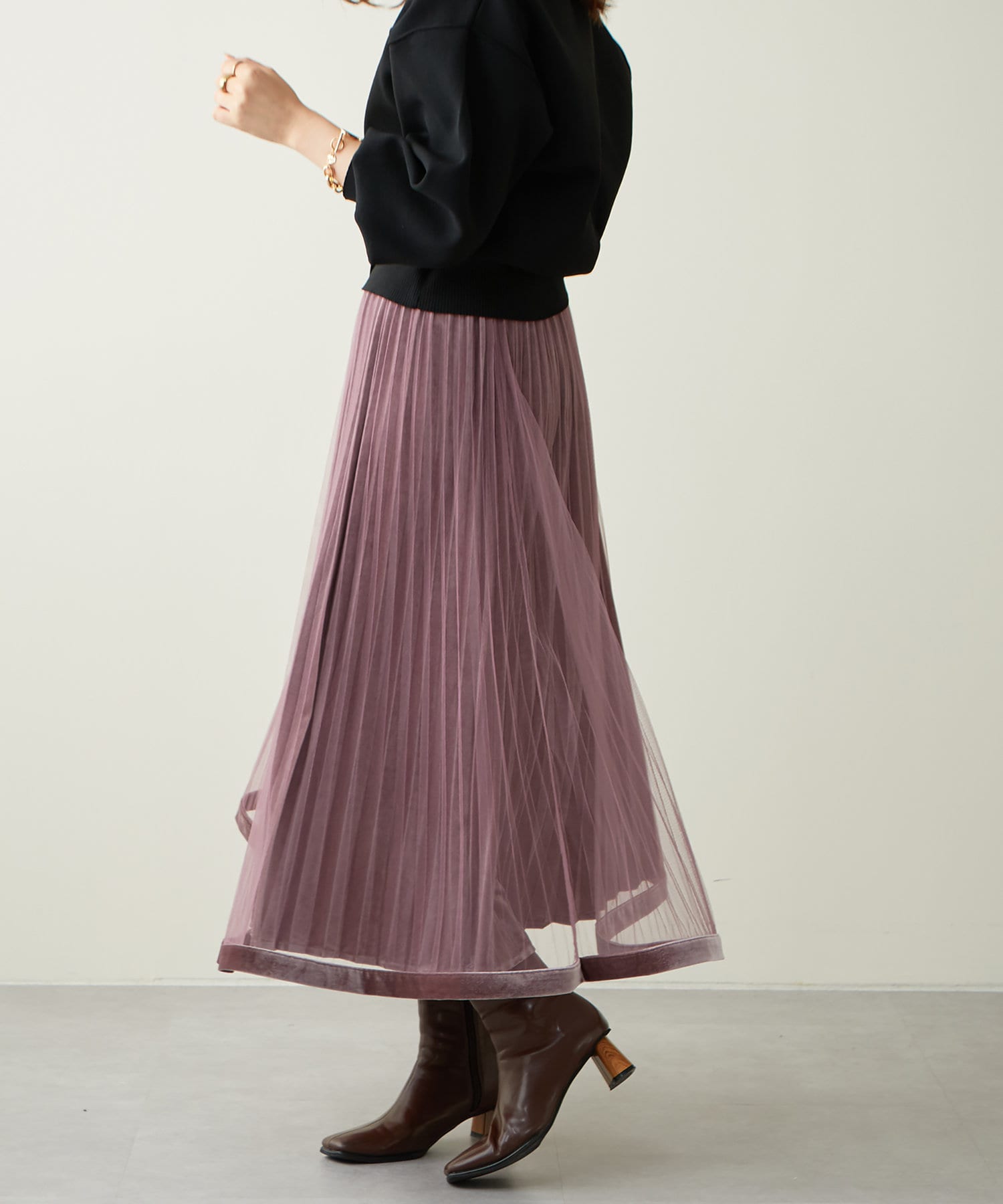 甘くなりがちなチュールスカートを、プリーツ加工と裾にベロアパイピングを施し、大人フェミニンに仕上げました。