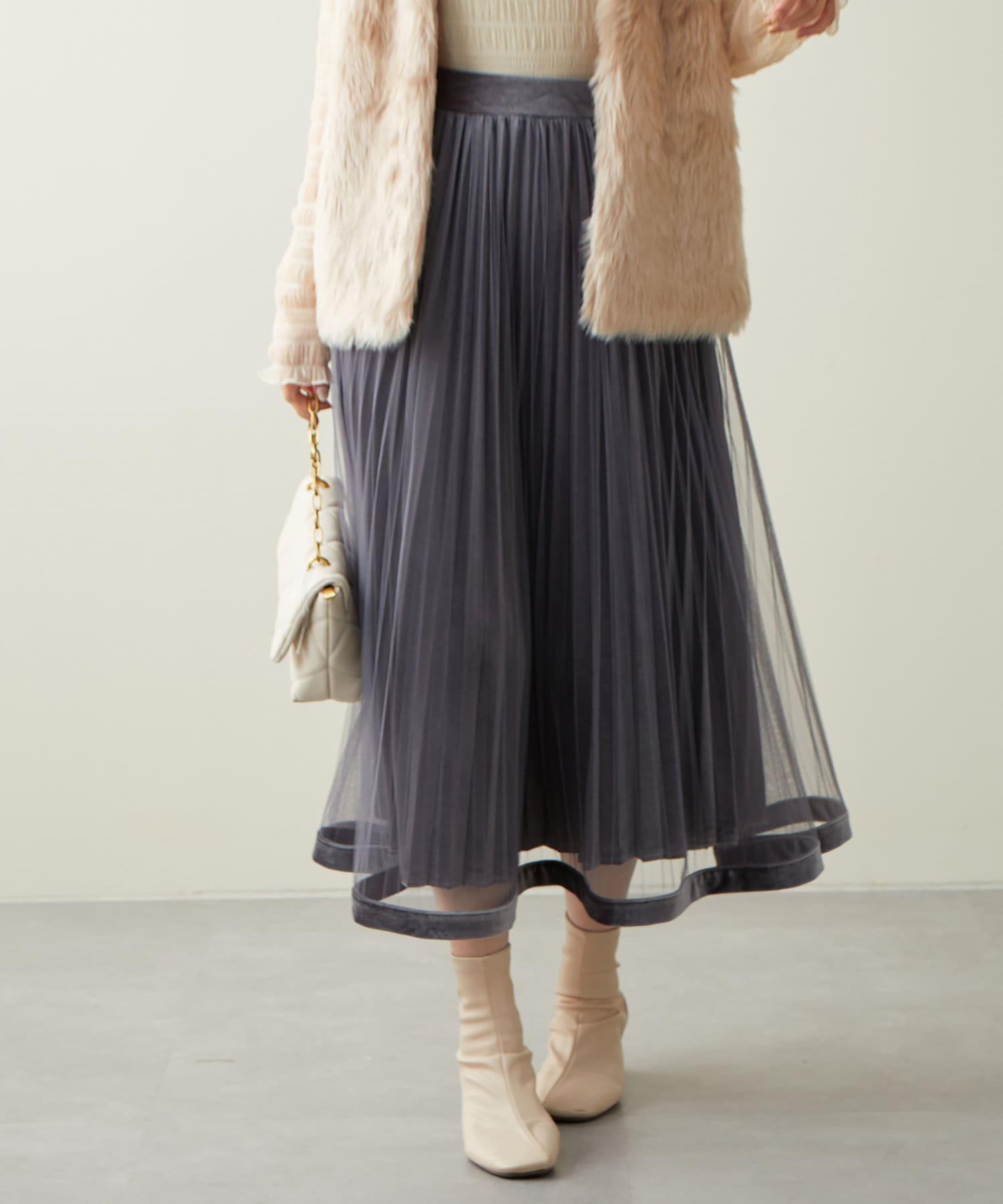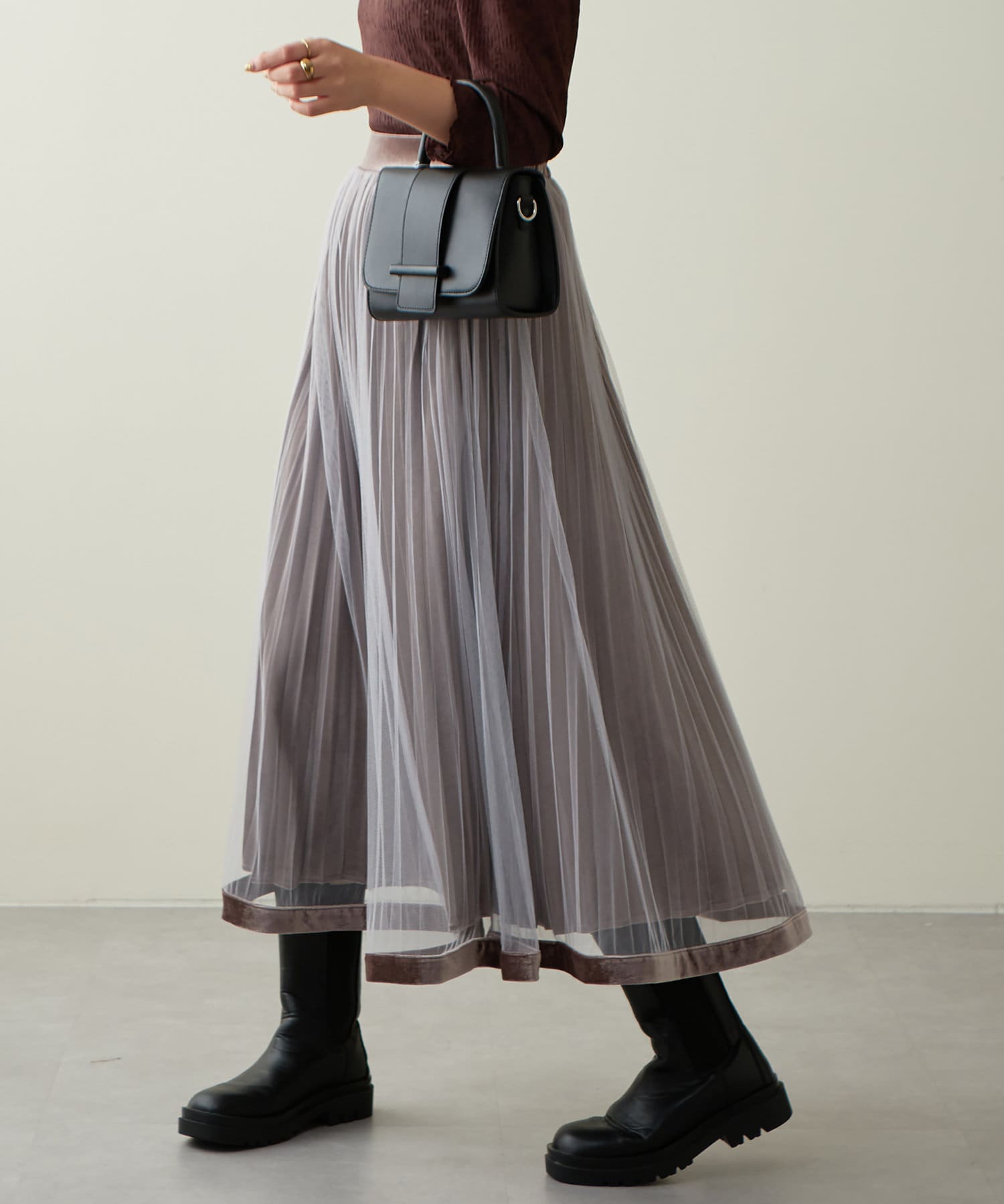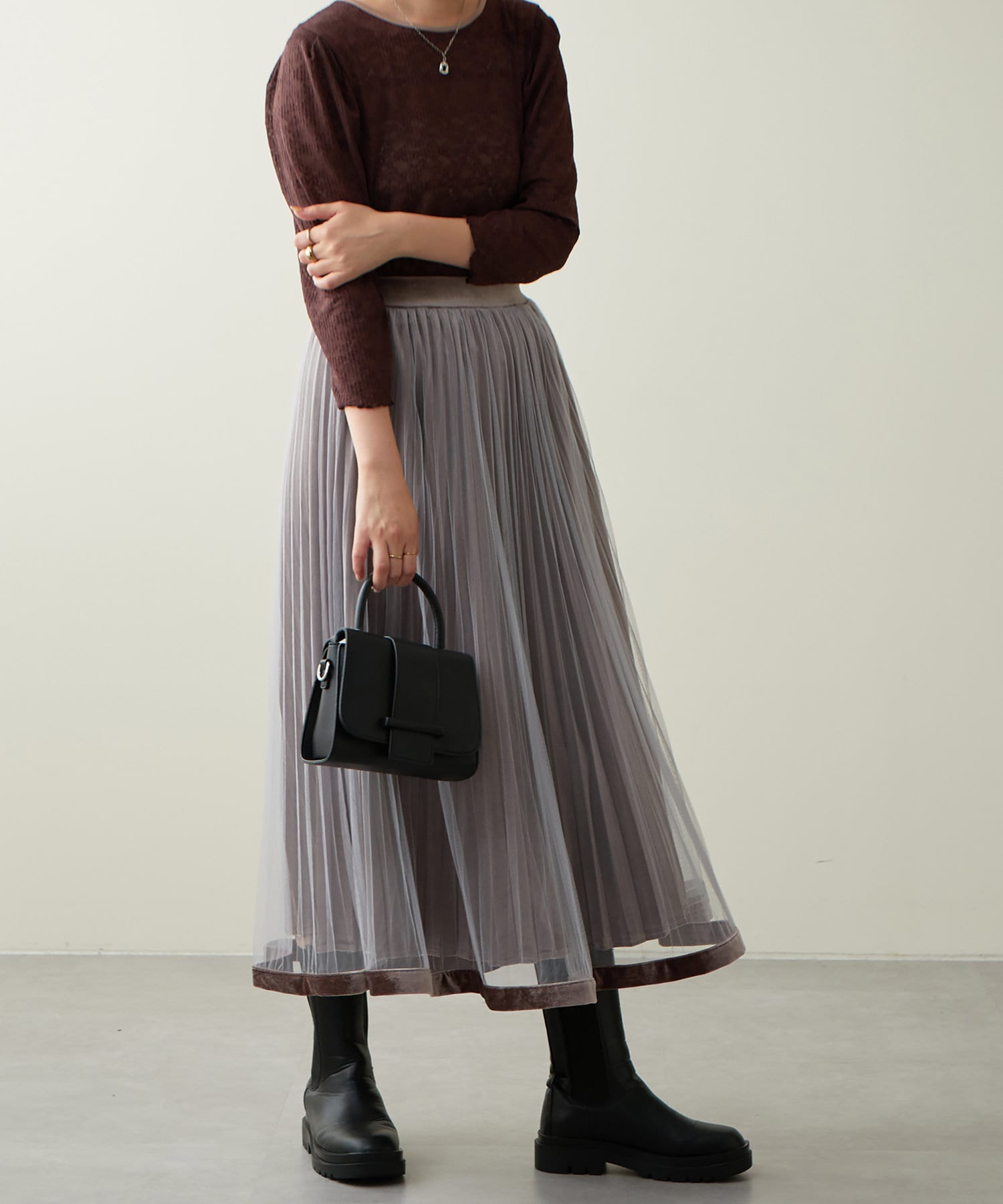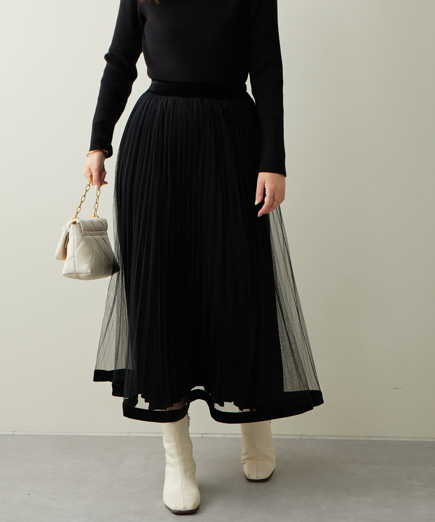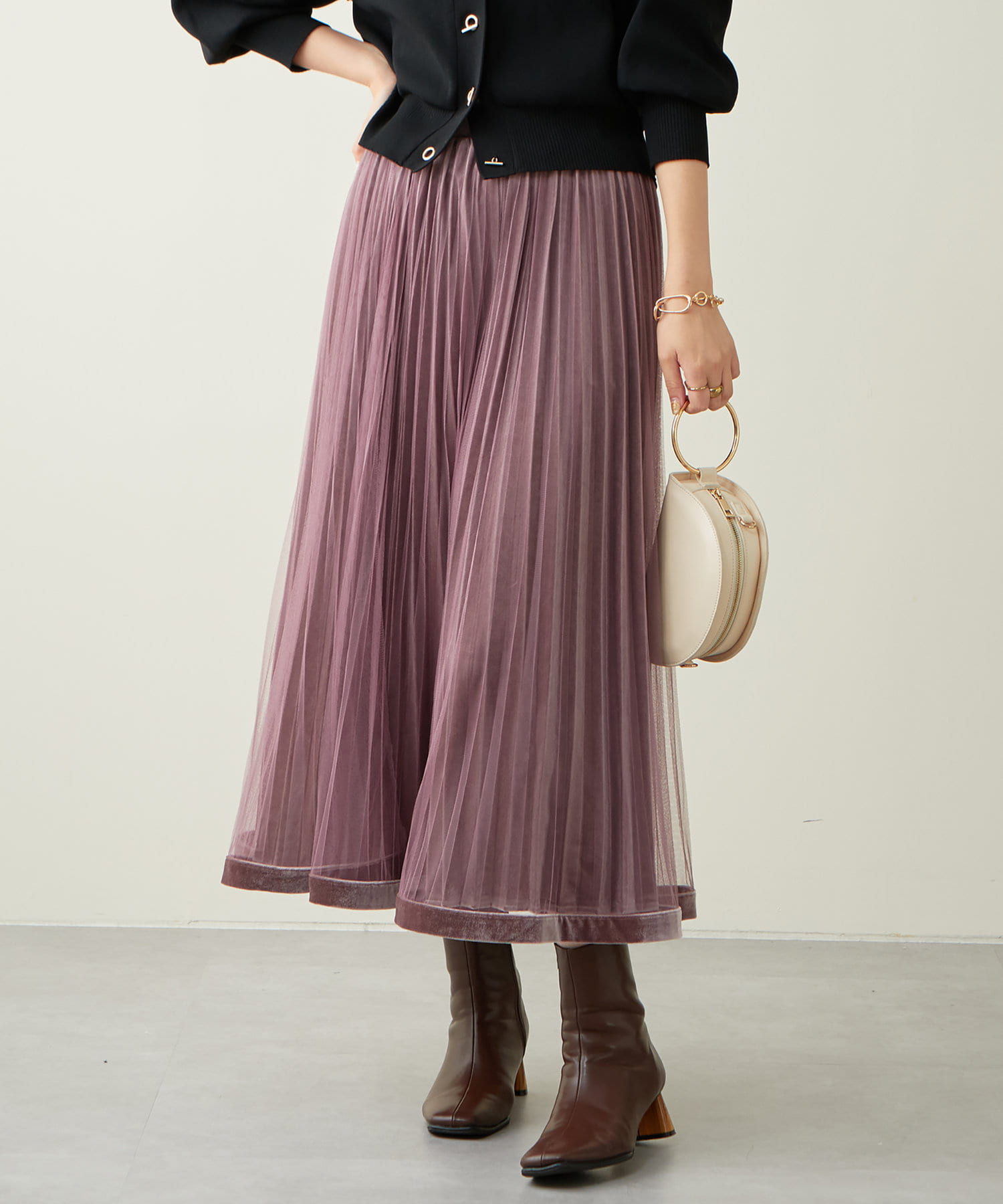 甘くなりがちなチュールスカートを、プリーツ加工と裾にベロアパイピングを施し、大人フェミニンに仕上げました。