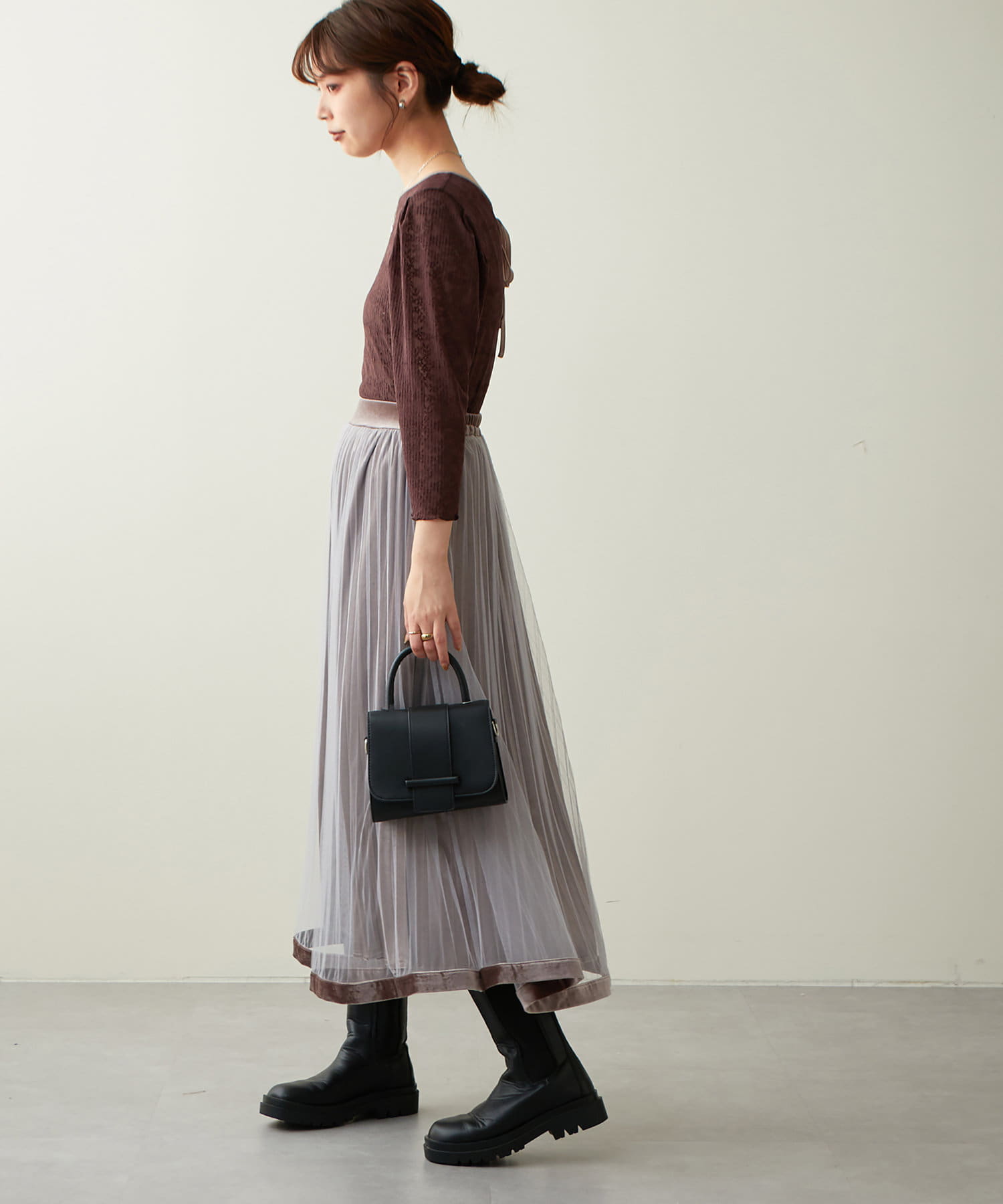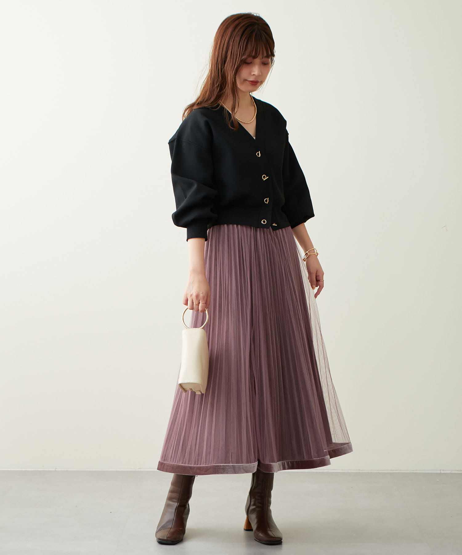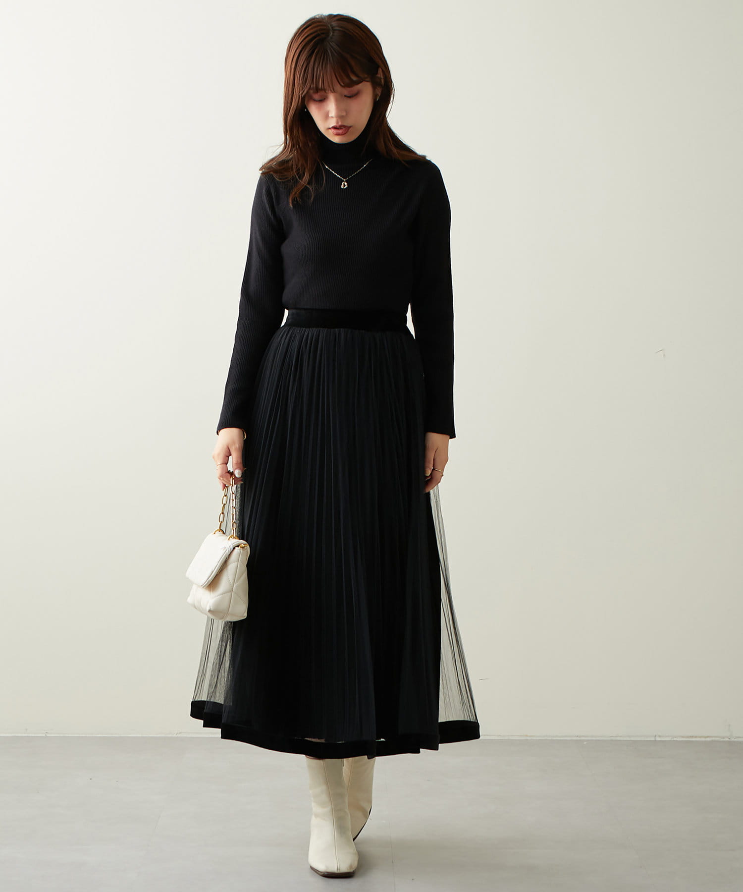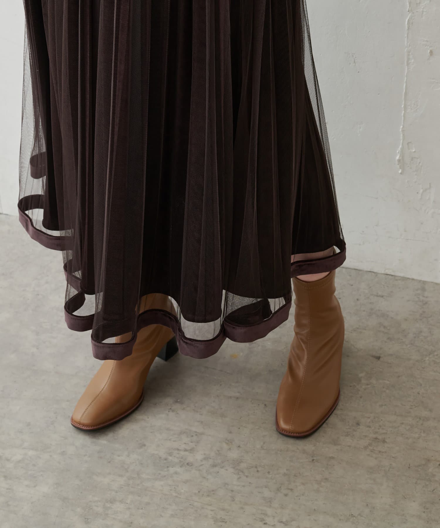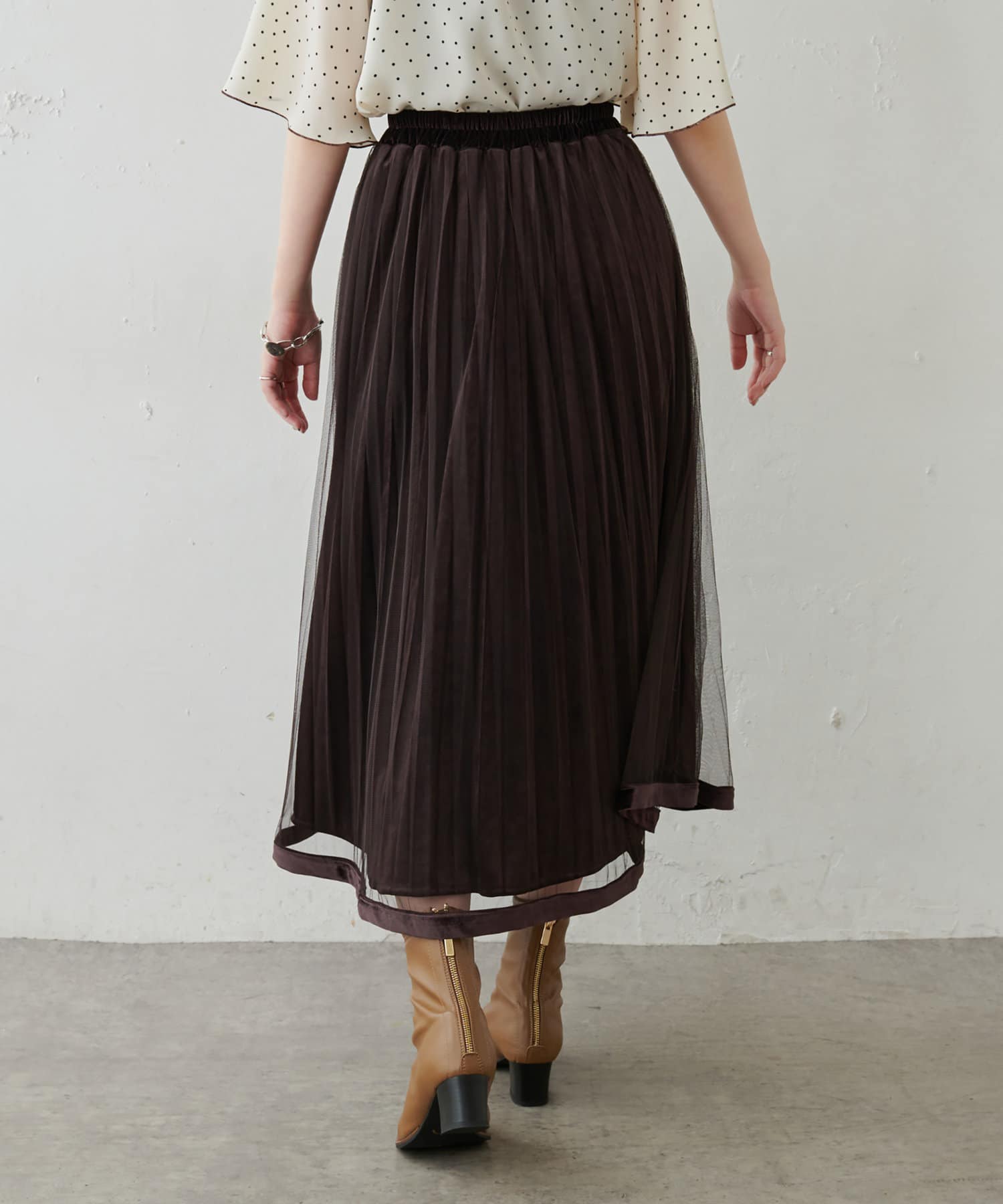 甘くなりがちなチュールスカートを、プリーツ加工と裾にベロアパイピングを施し、大人フェミニンに仕上げました。