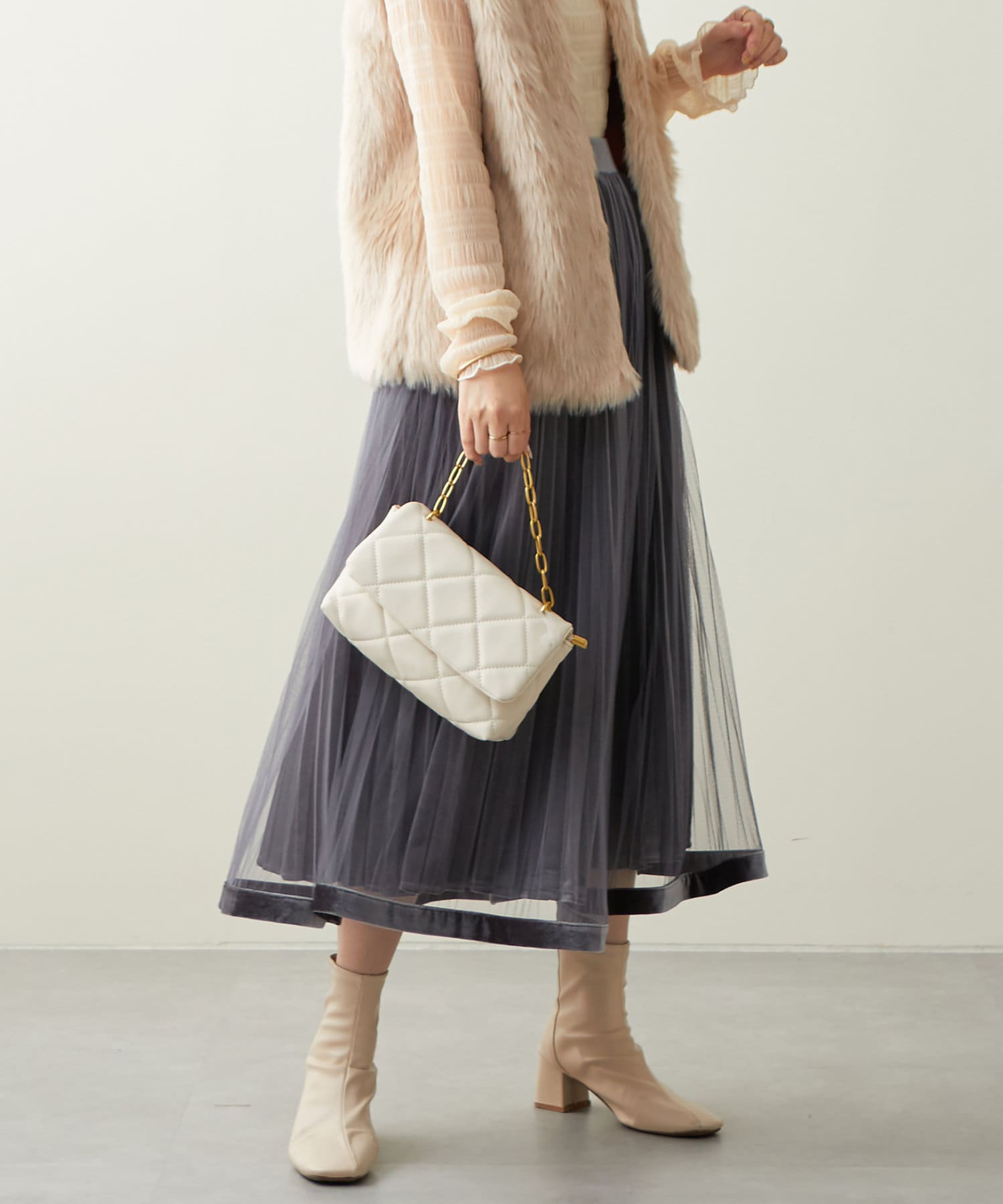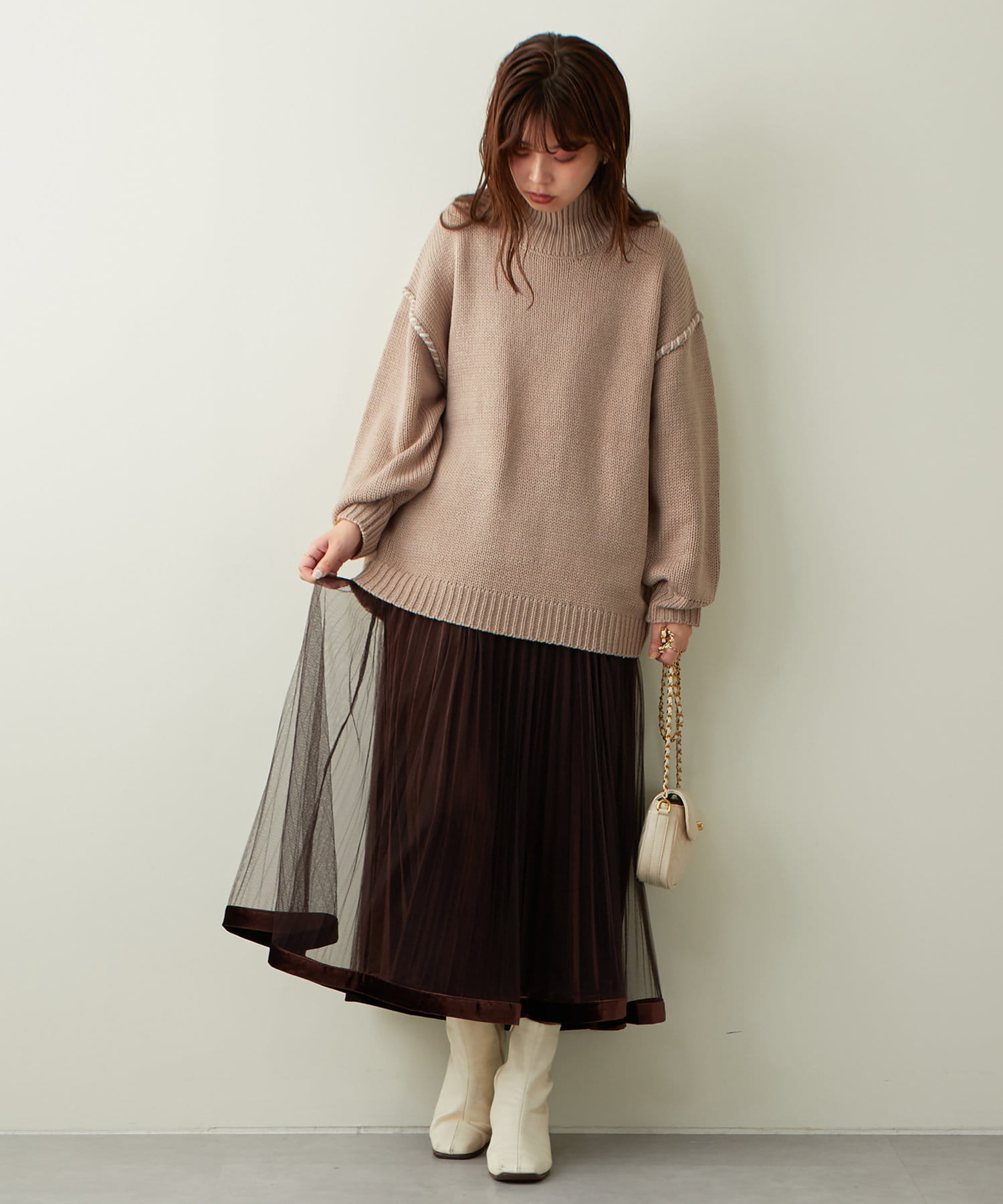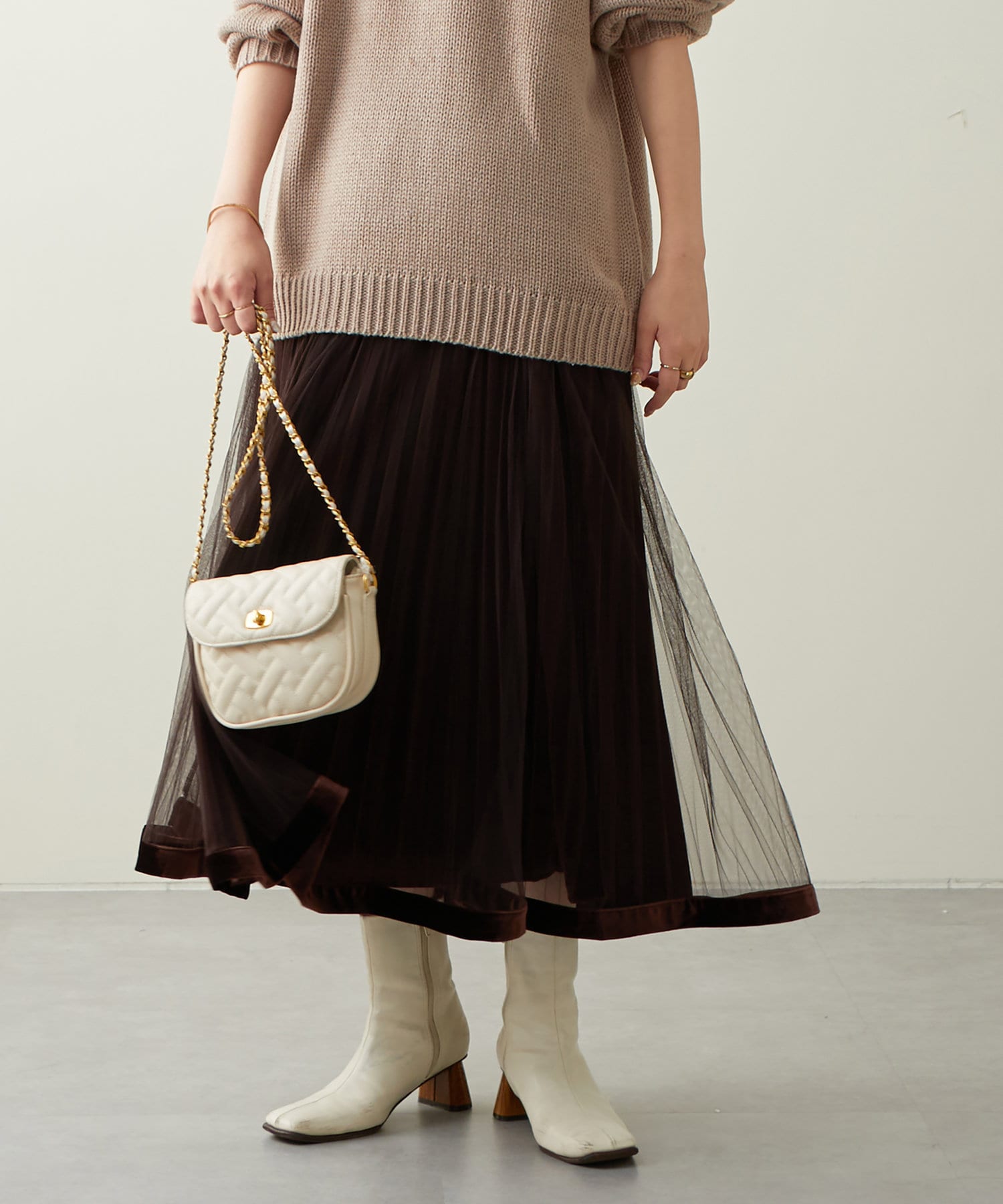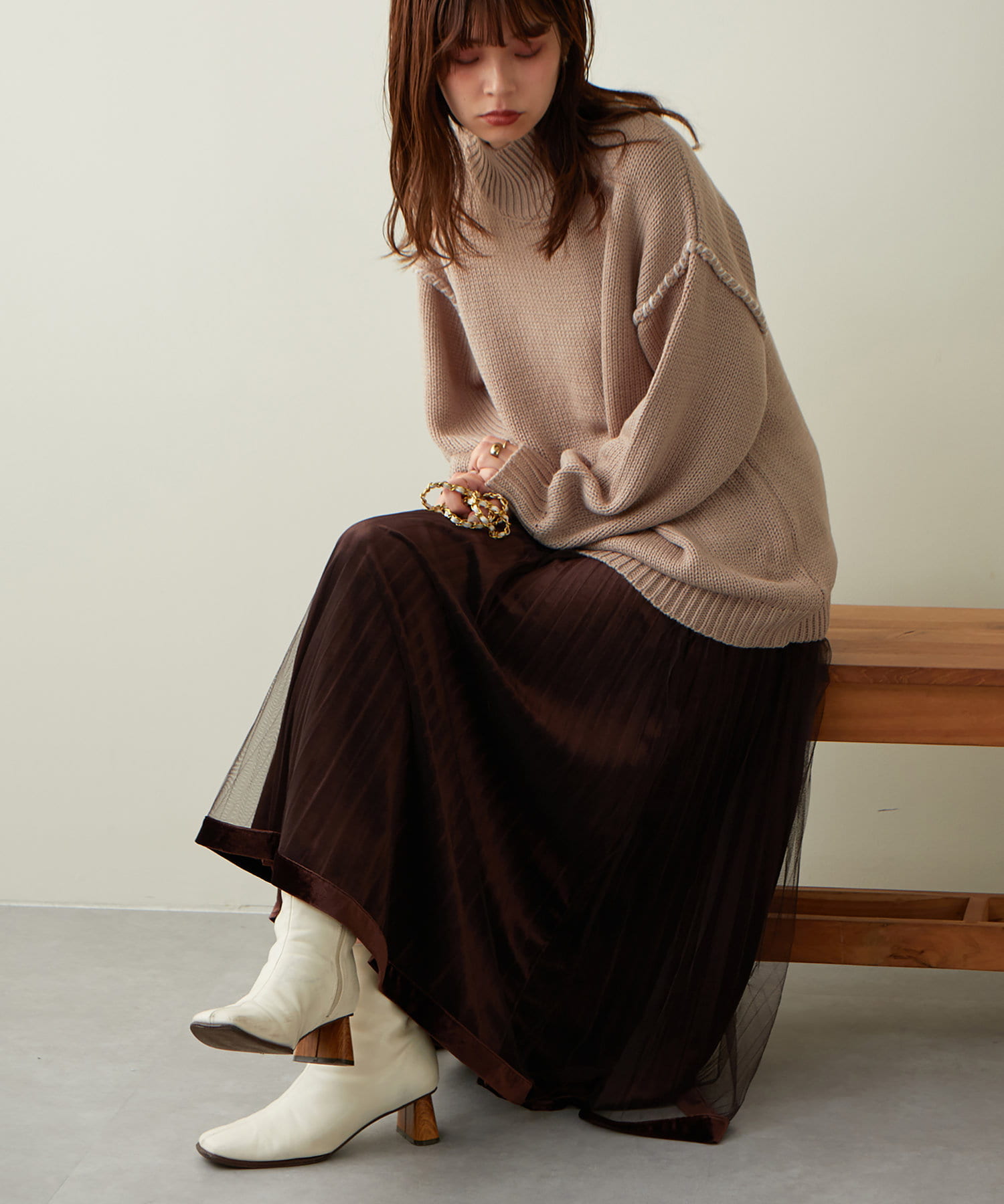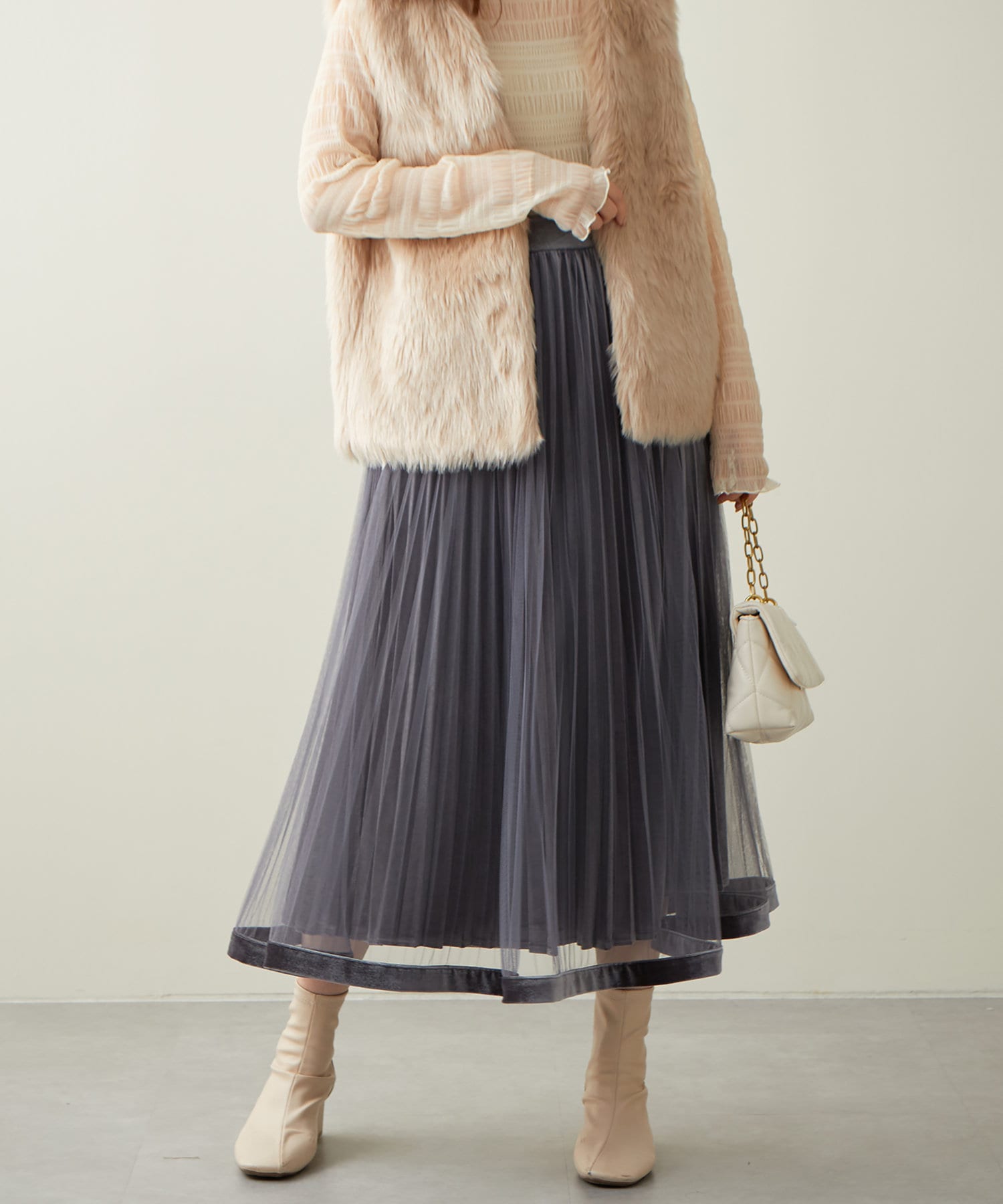甘くなりがちなチュールスカートを、プリーツ加工と裾にベロアパイピングを施し、大人フェミニンに仕上げました。