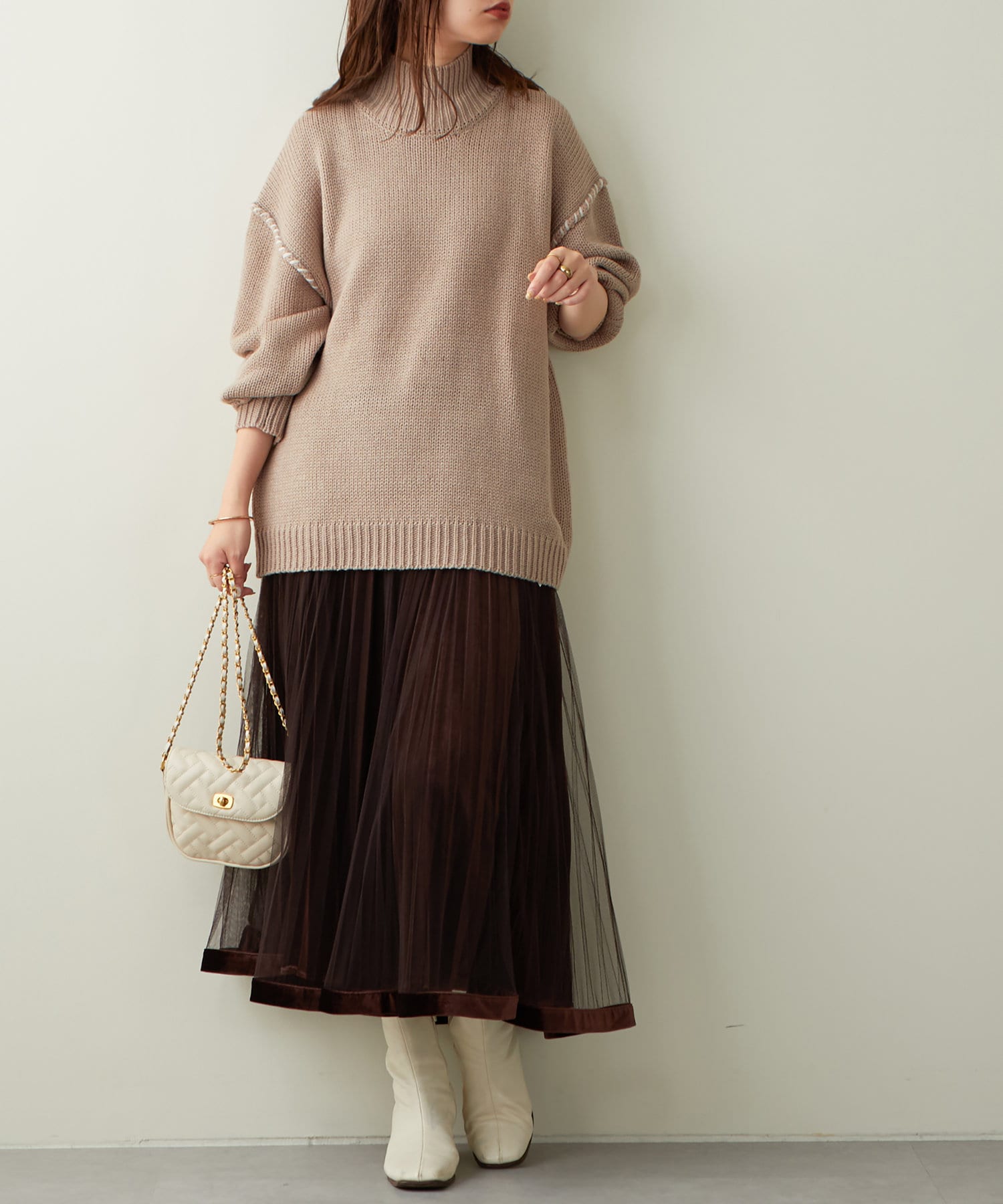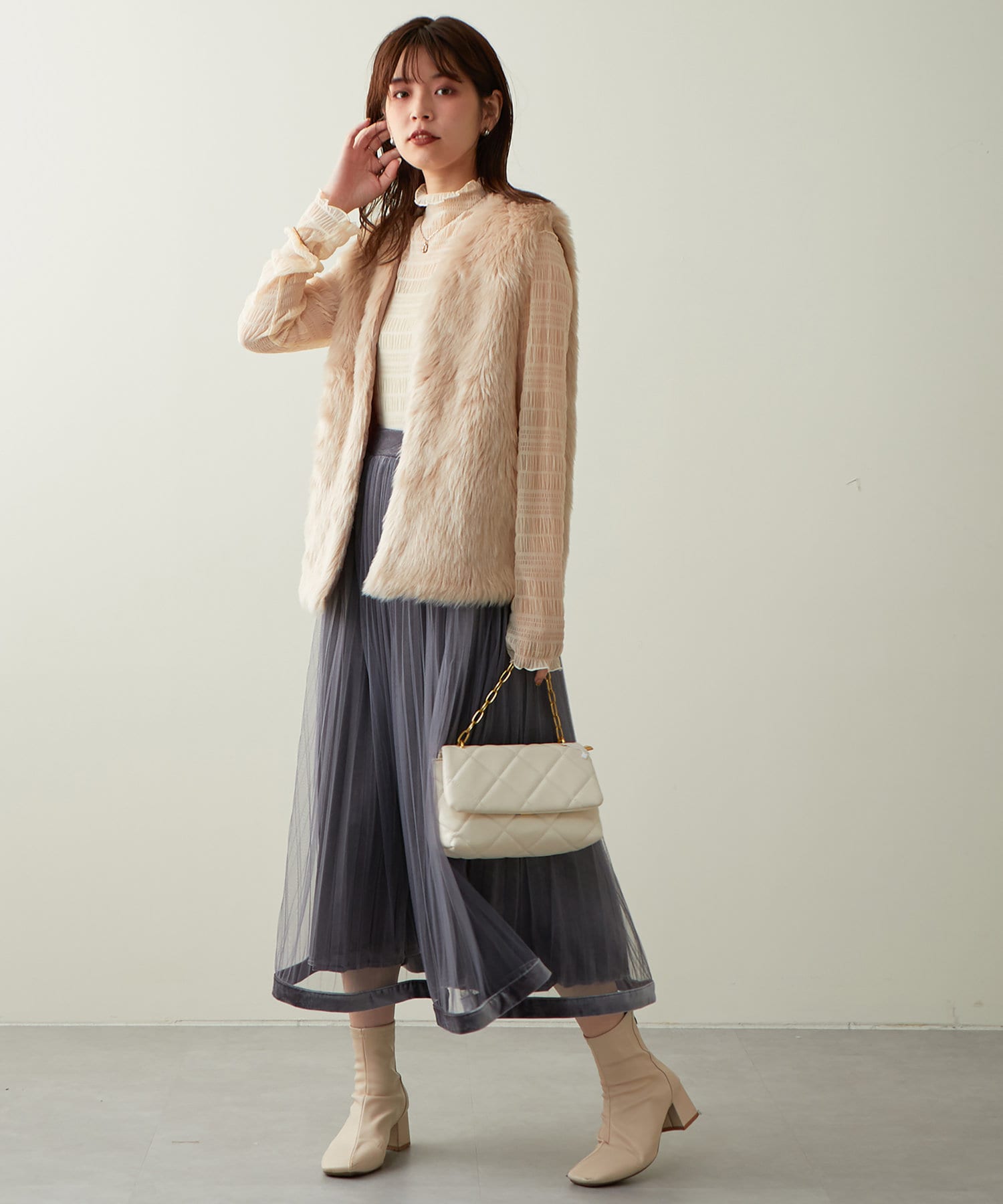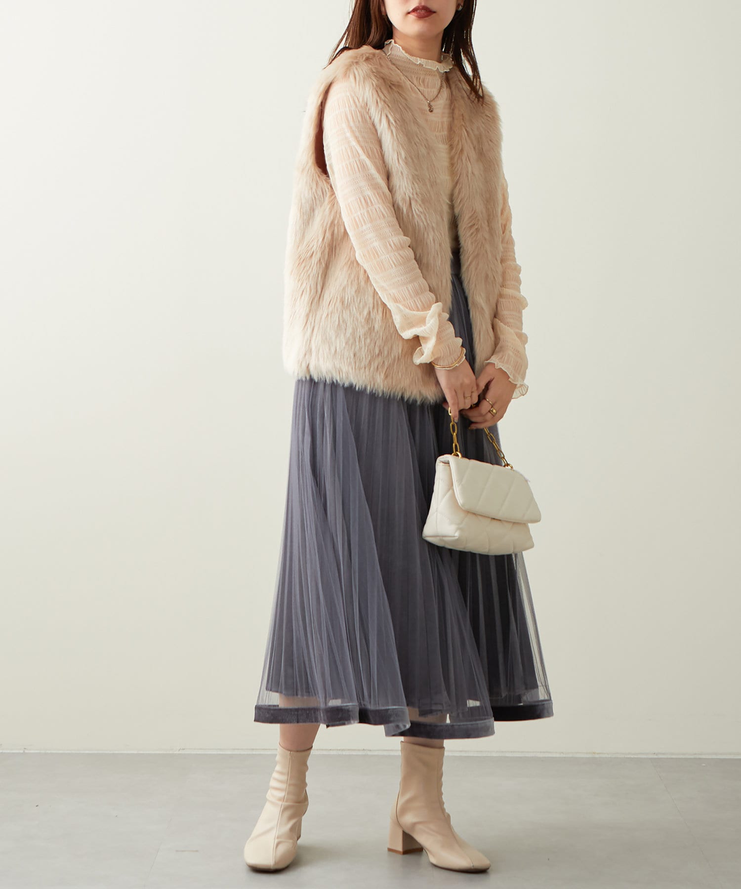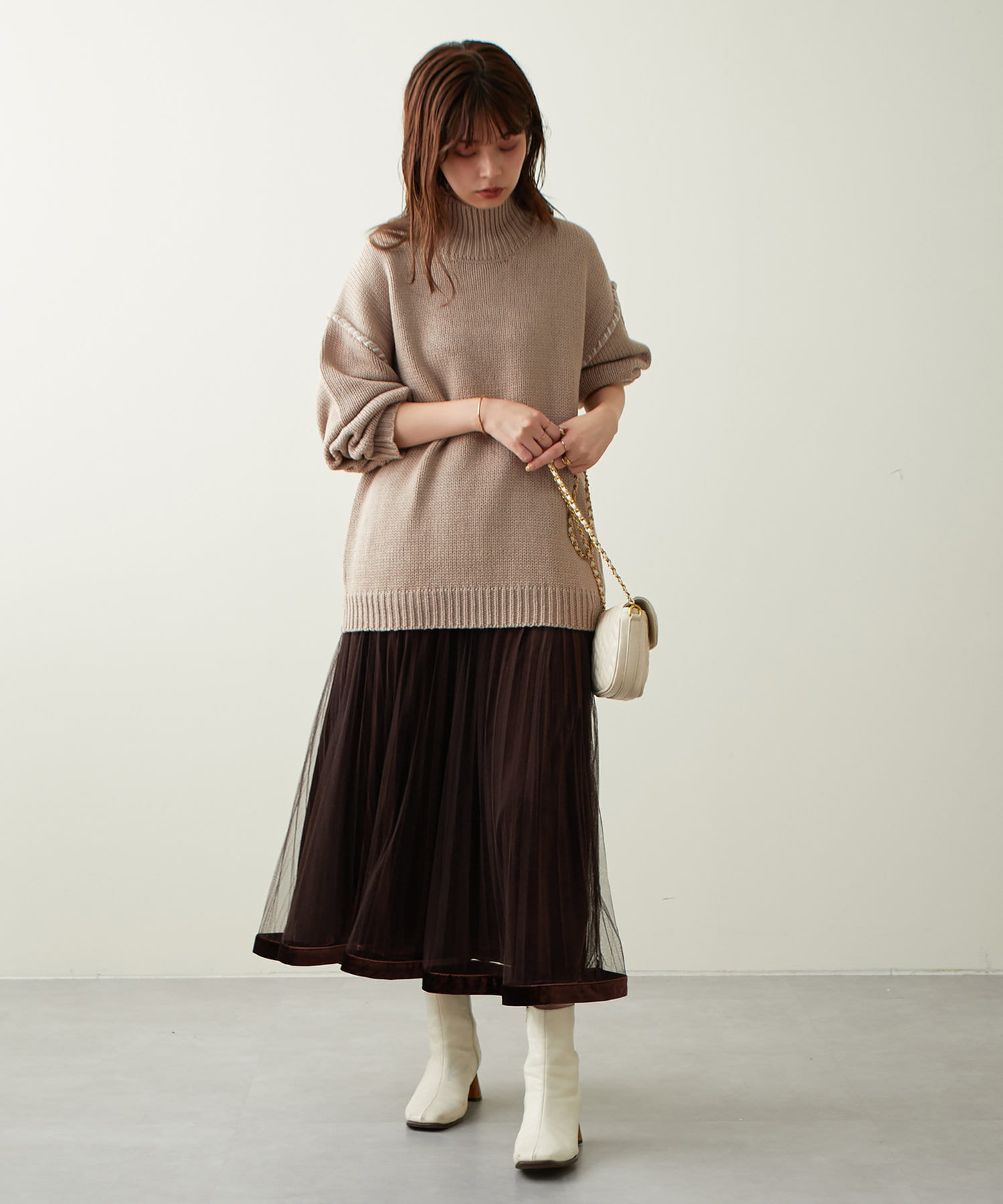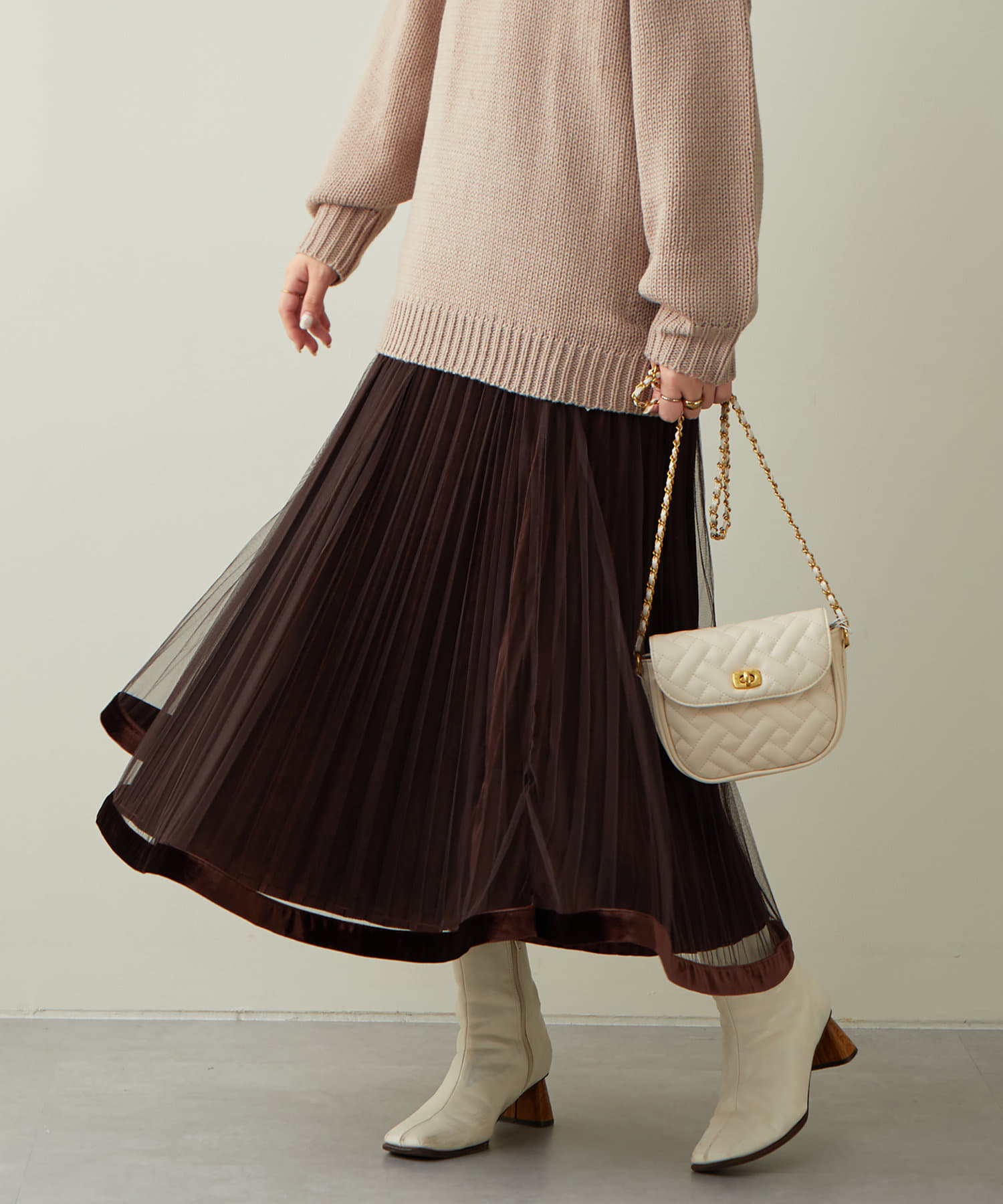 甘くなりがちなチュールスカートを、プリーツ加工と裾にベロアパイピングを施し、大人フェミニンに仕上げました。