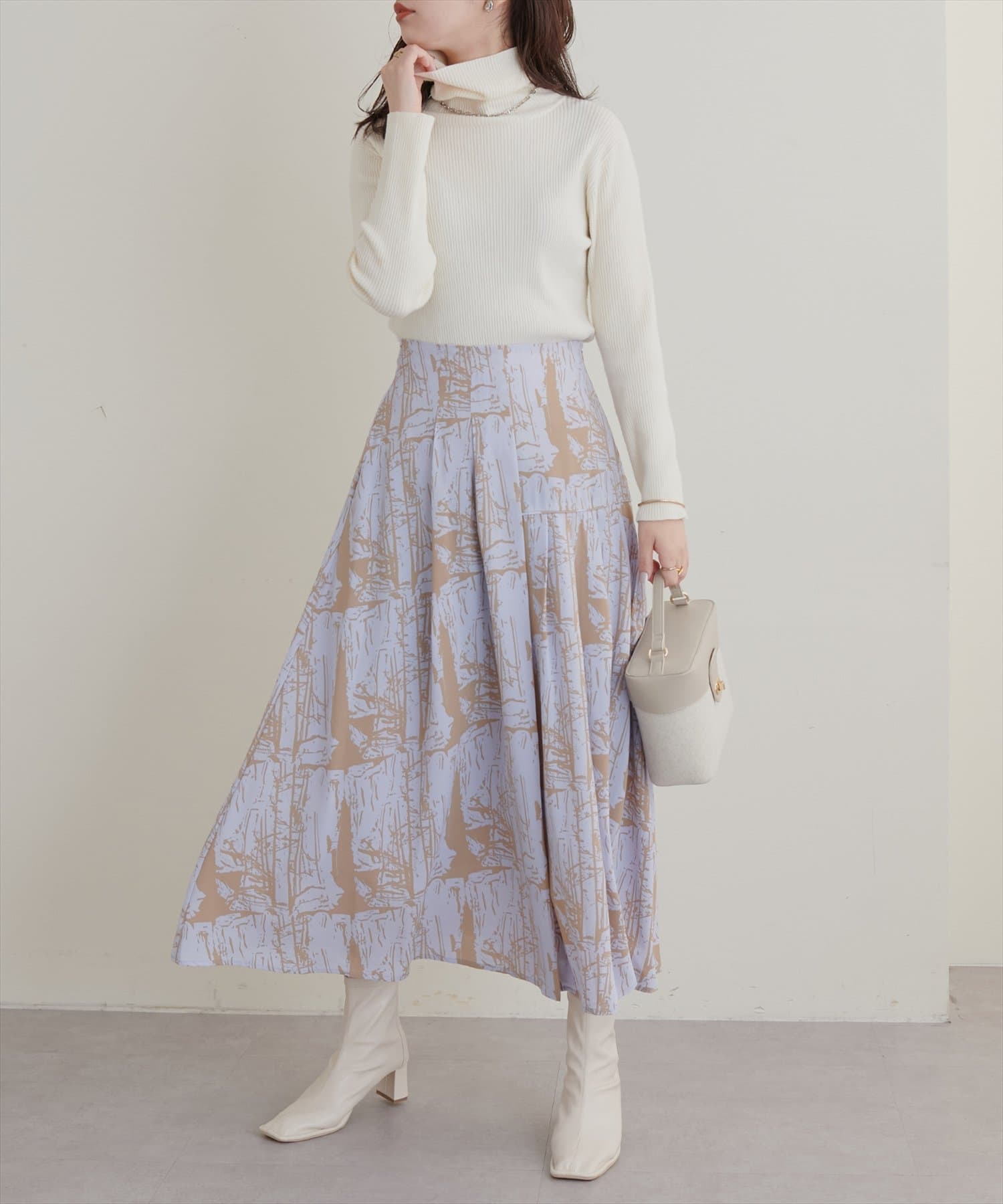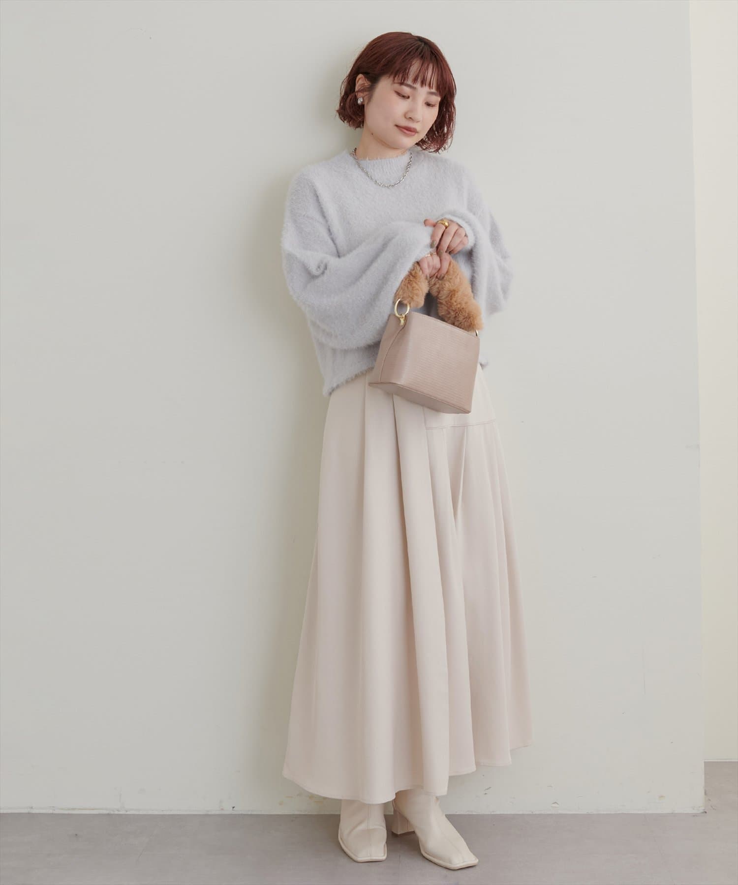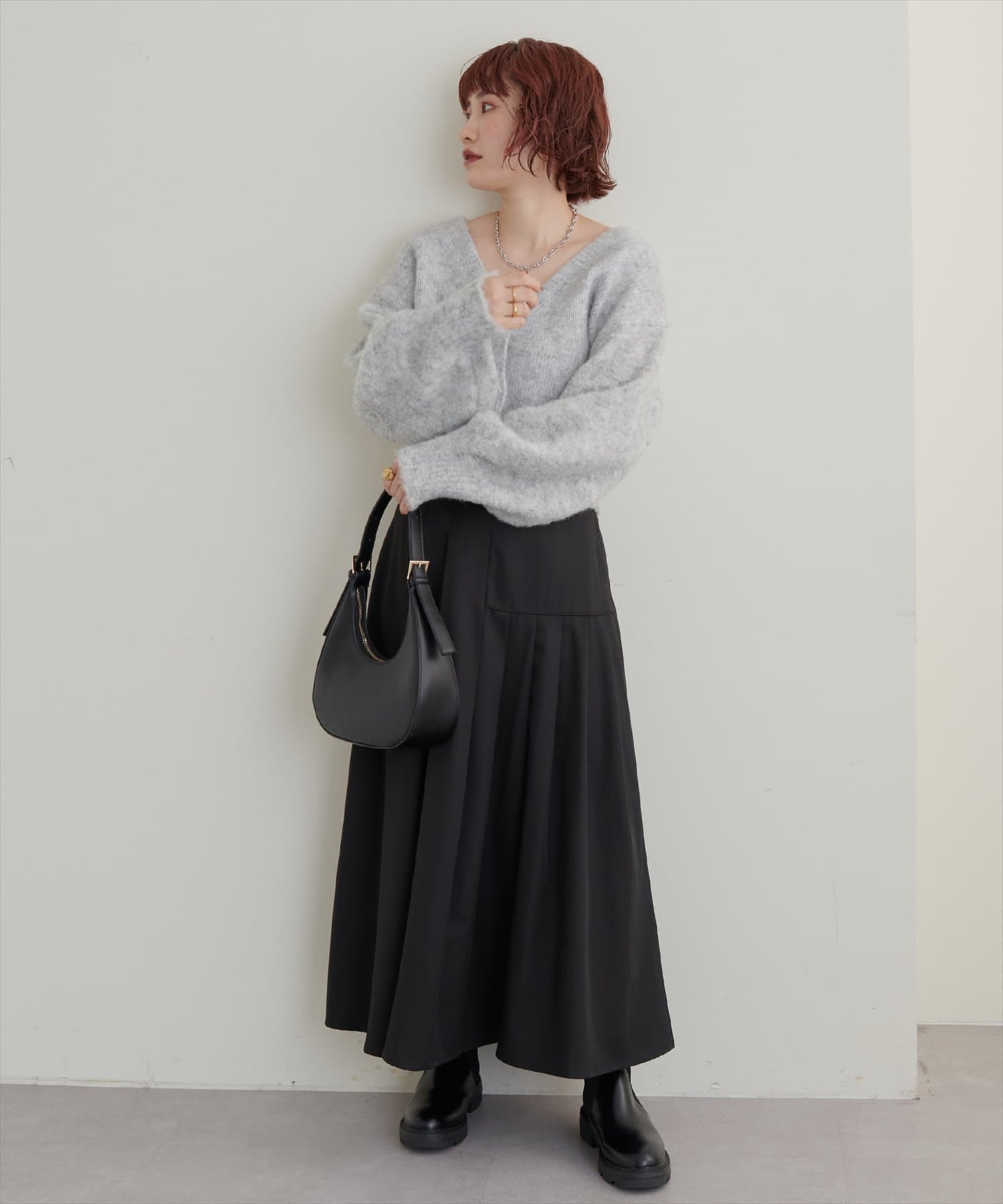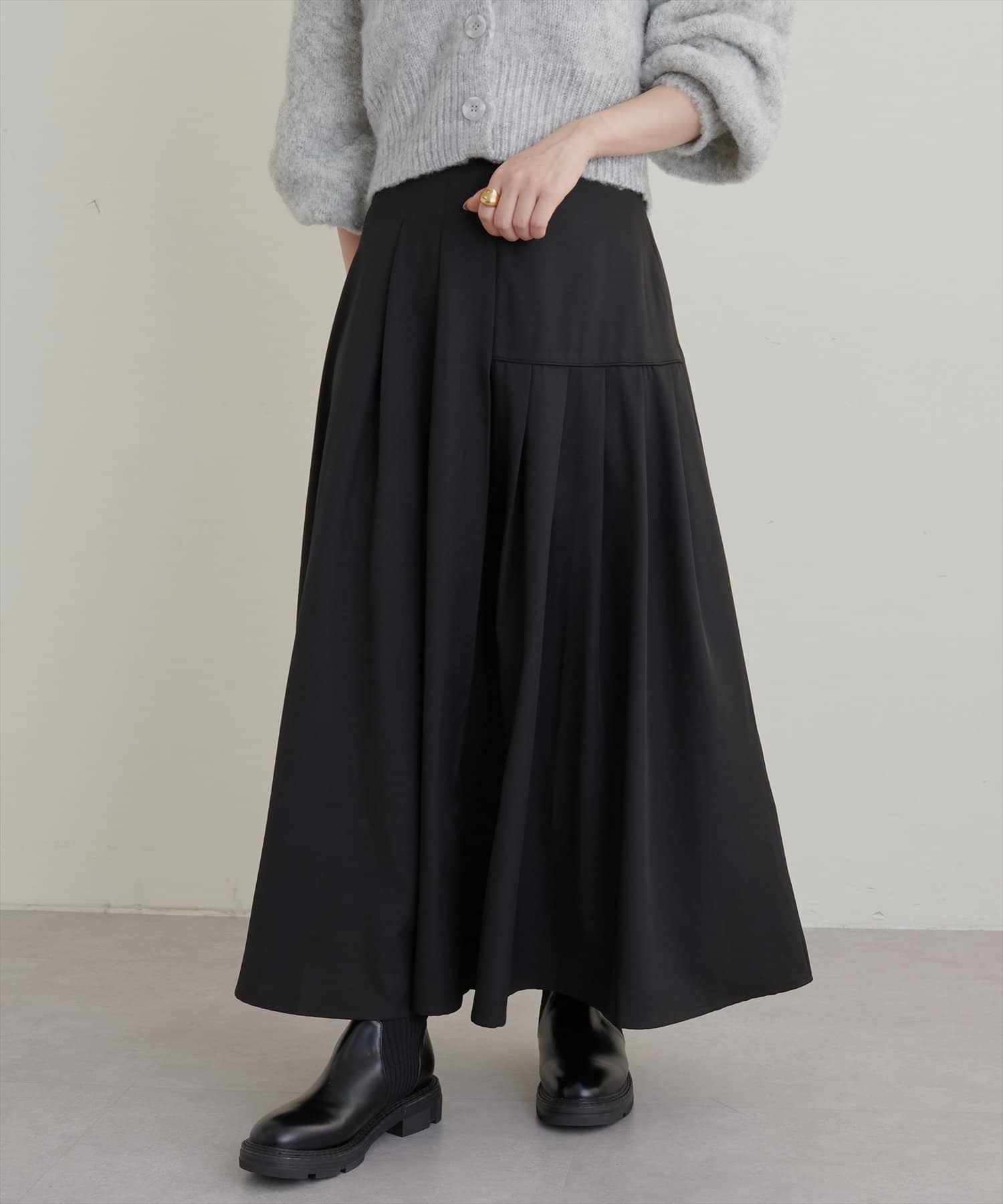 トレーナーでカジュアルにも、タイトニットでお上品にも合わせやすいです。あまり丈が長すぎるスカートは好まないのですが、このスカートは少し底厚めのスニーカーで足元に十分余裕がある長さで、ブーツじゃなくても合わせられるのが嬉しかったです。