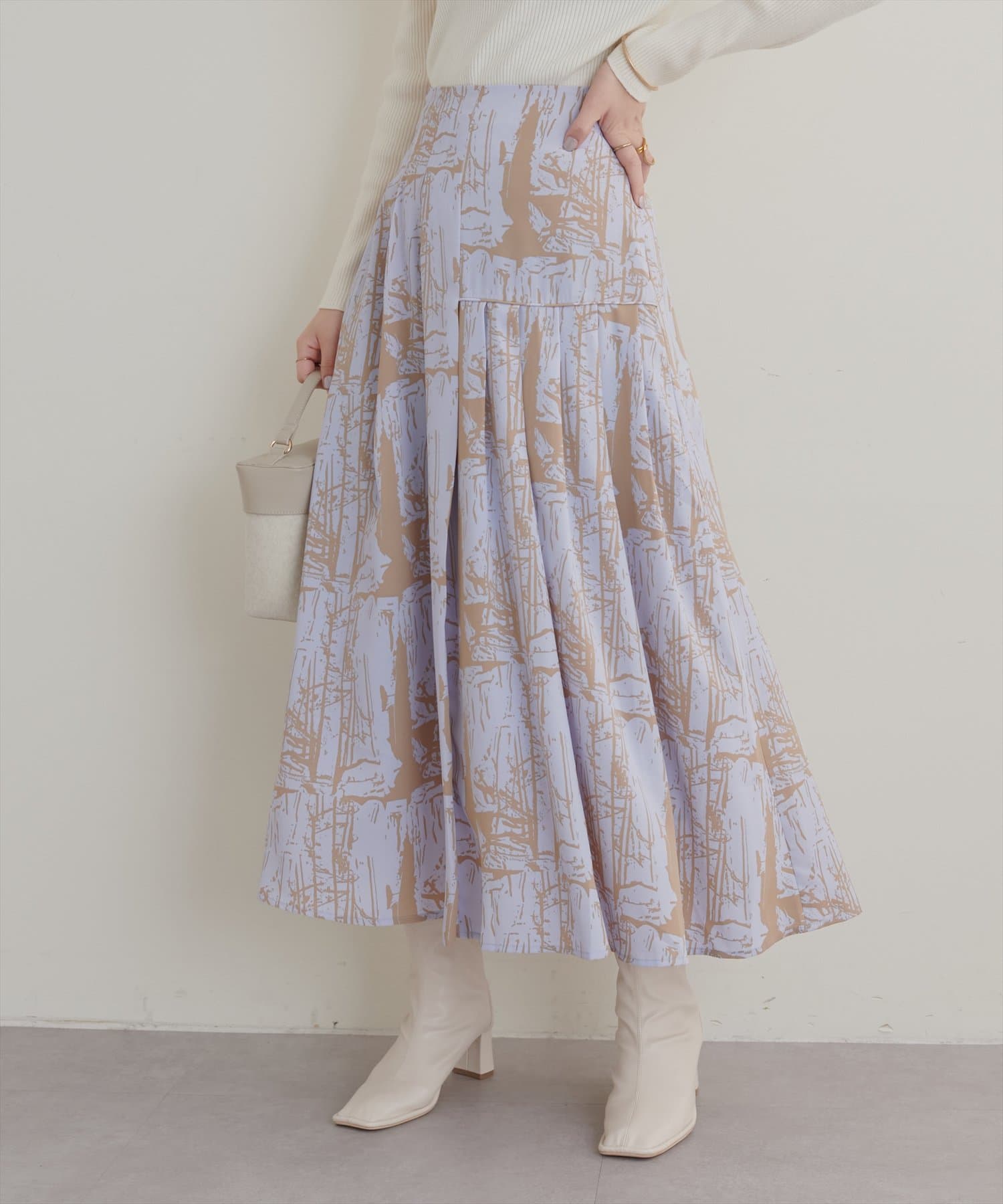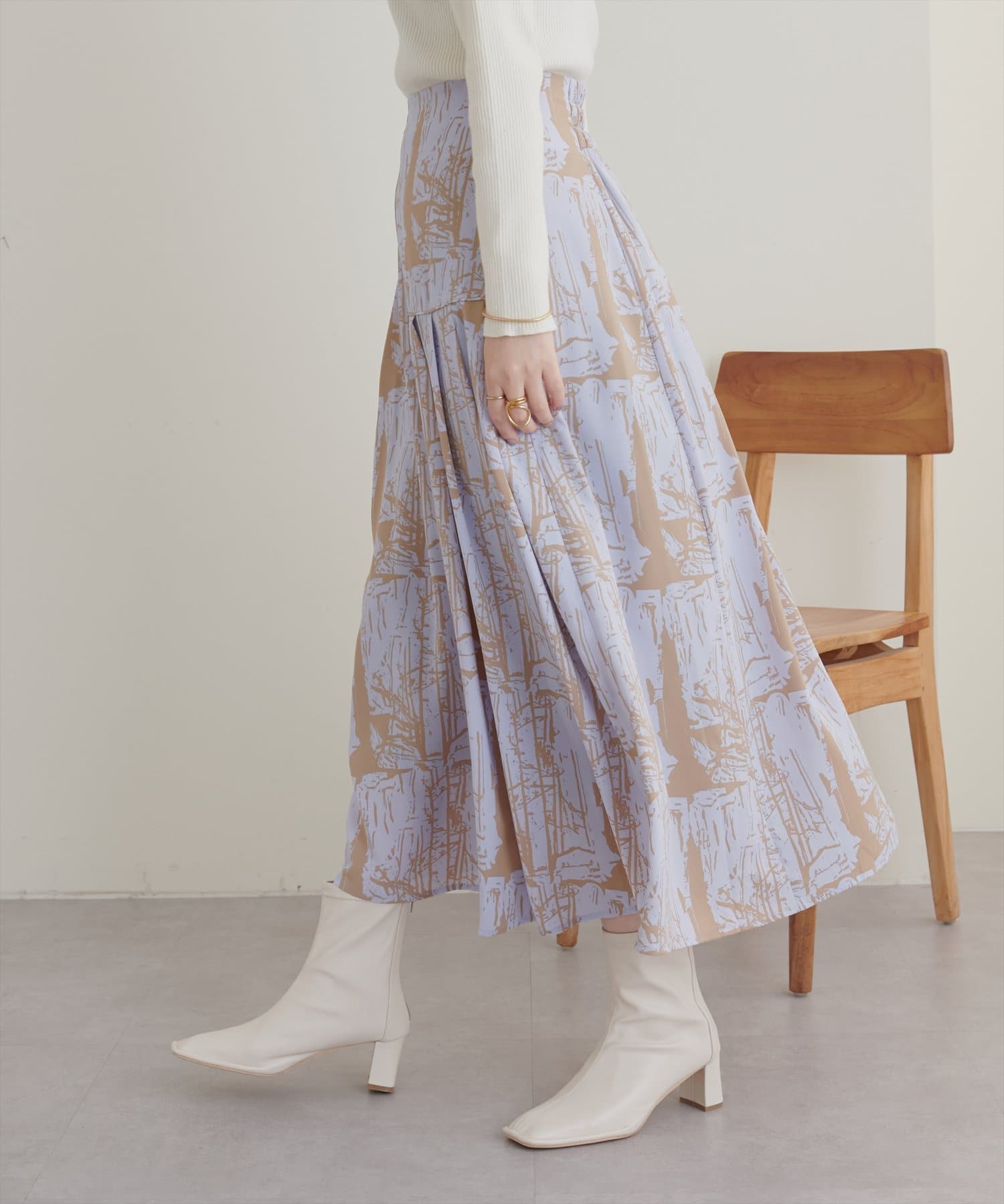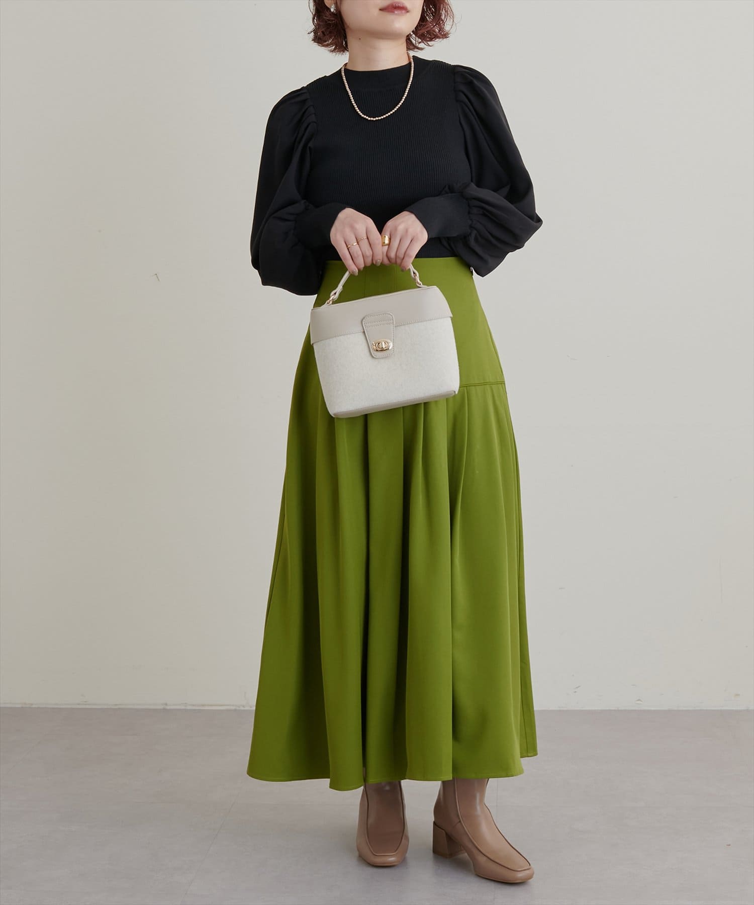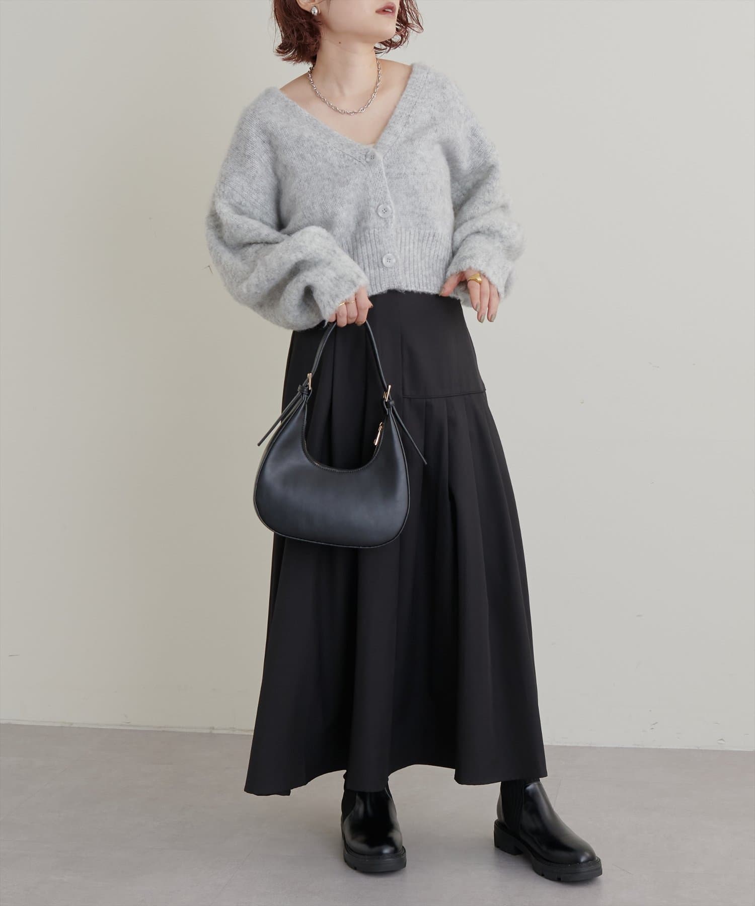 トレーナーでカジュアルにも、タイトニットでお上品にも合わせやすいです。あまり丈が長すぎるスカートは好まないのですが、このスカートは少し底厚めのスニーカーで足元に十分余裕がある長さで、ブーツじゃなくても合わせられるのが嬉しかったです。