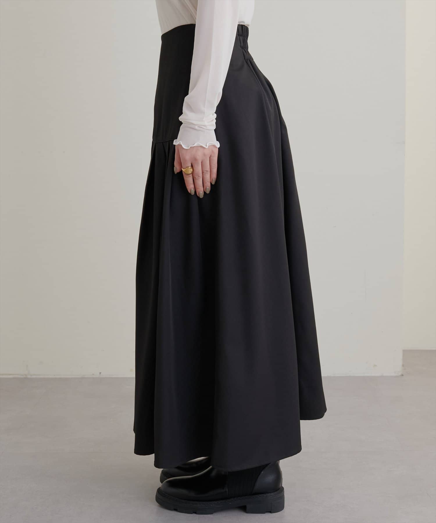シンプルなトップスに合わせて頂くとスカートのデザインがより引き立ち、モードな雰囲気で着こなして頂けます。