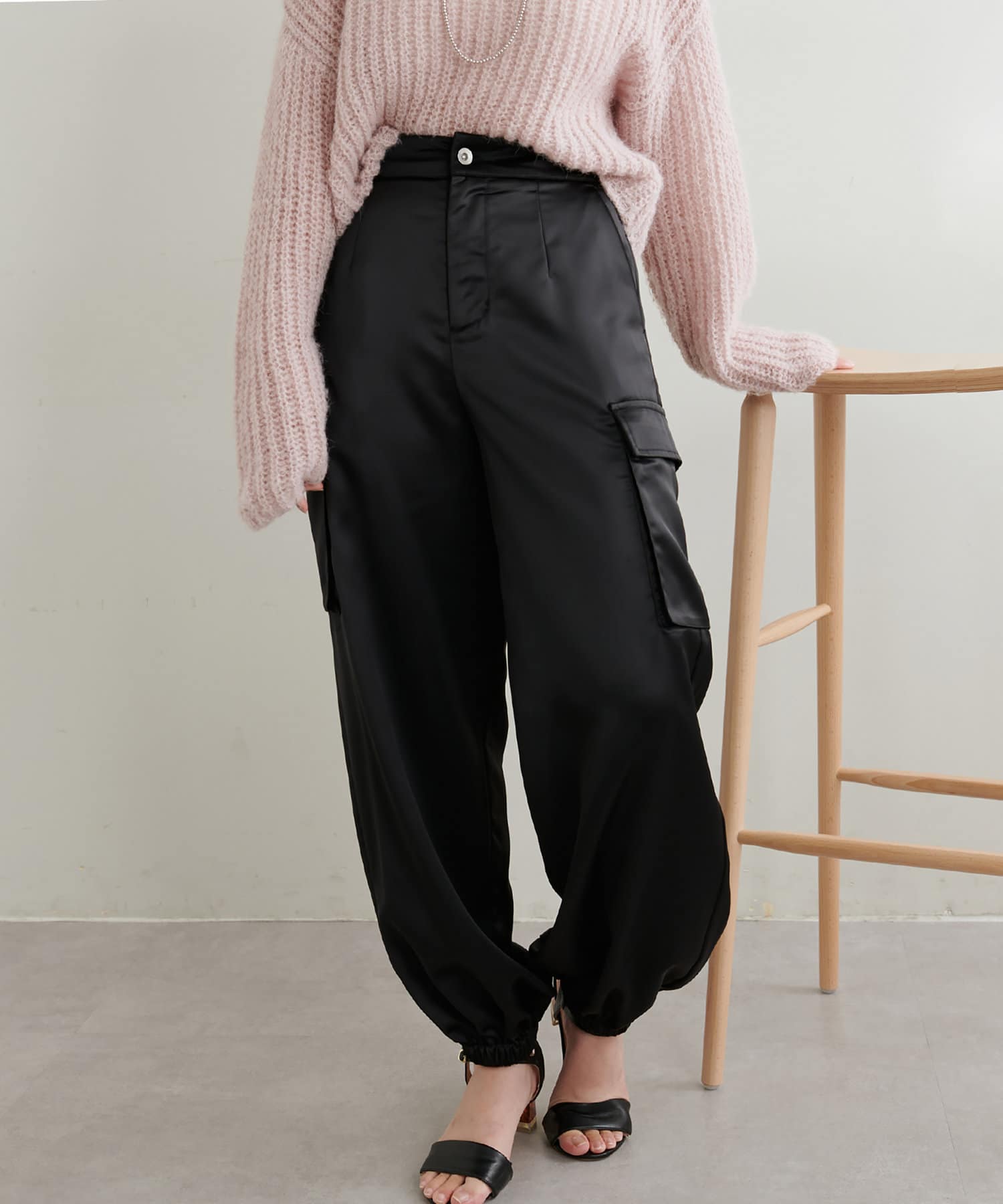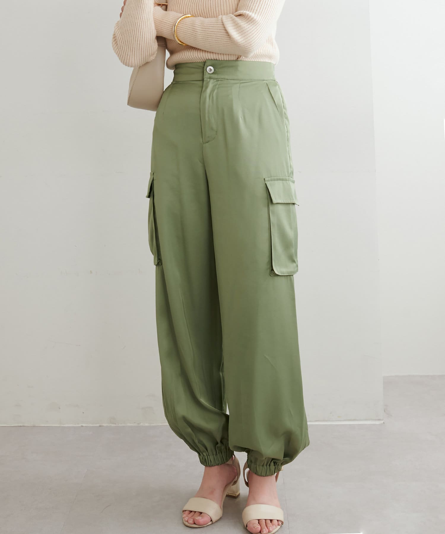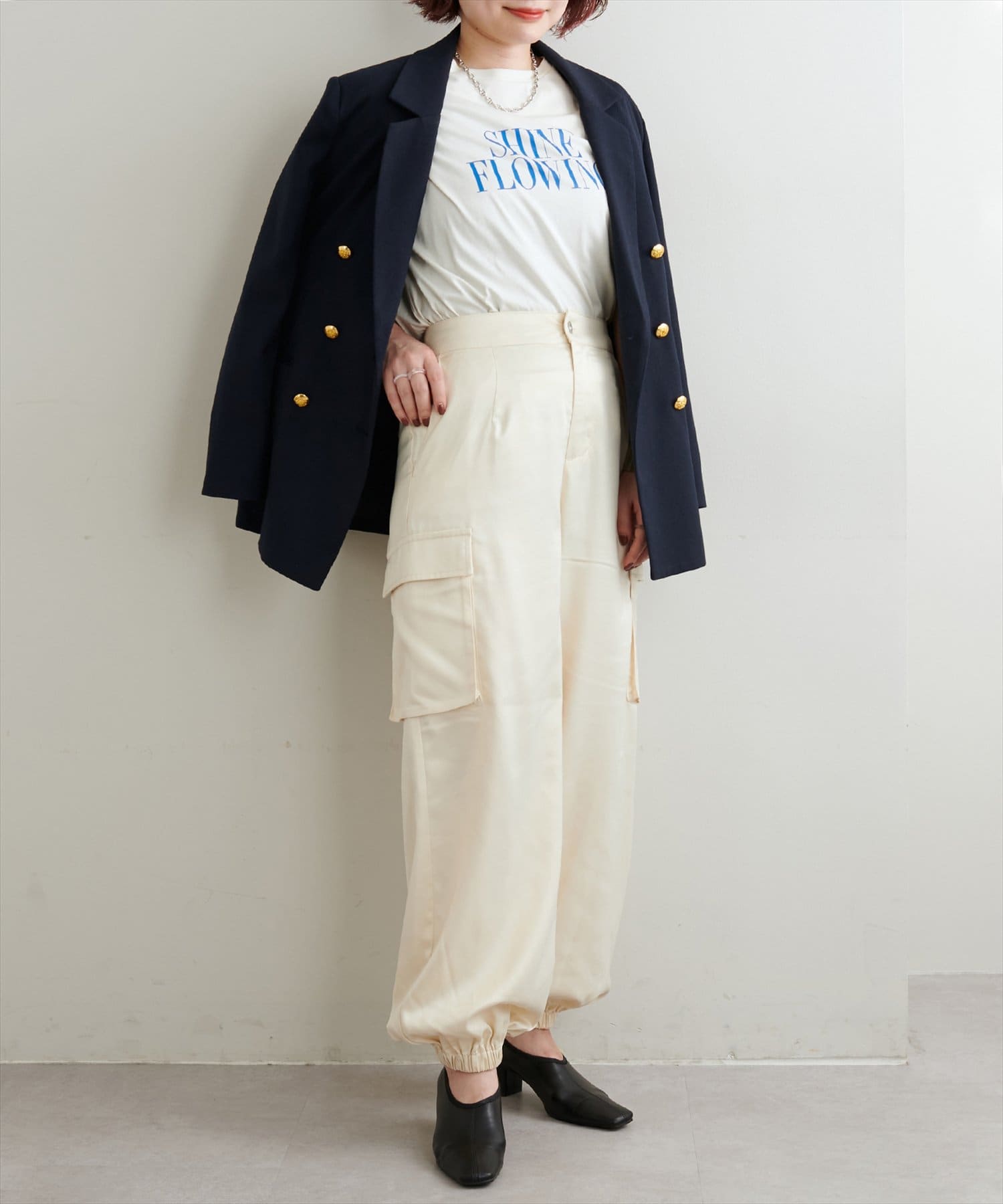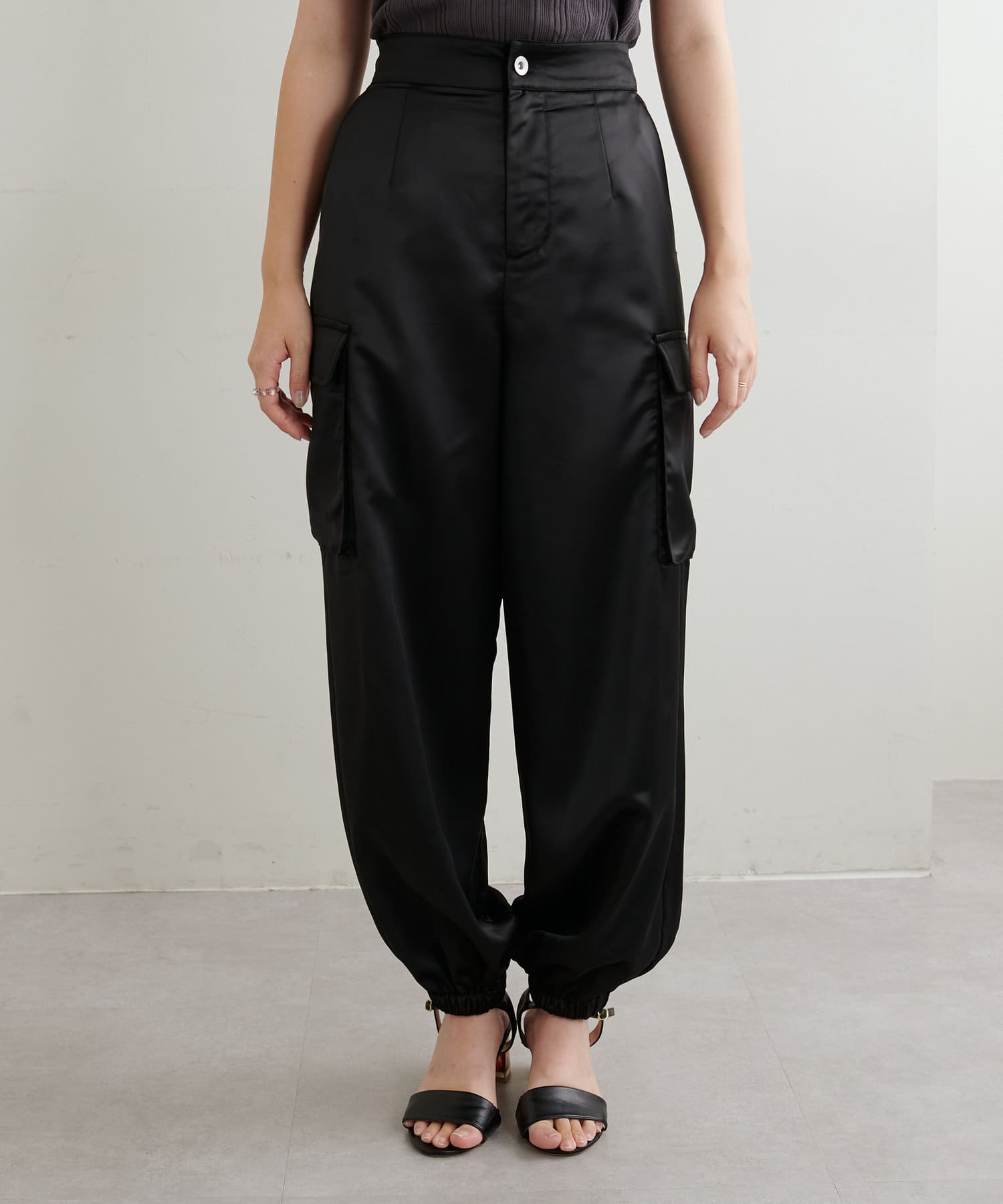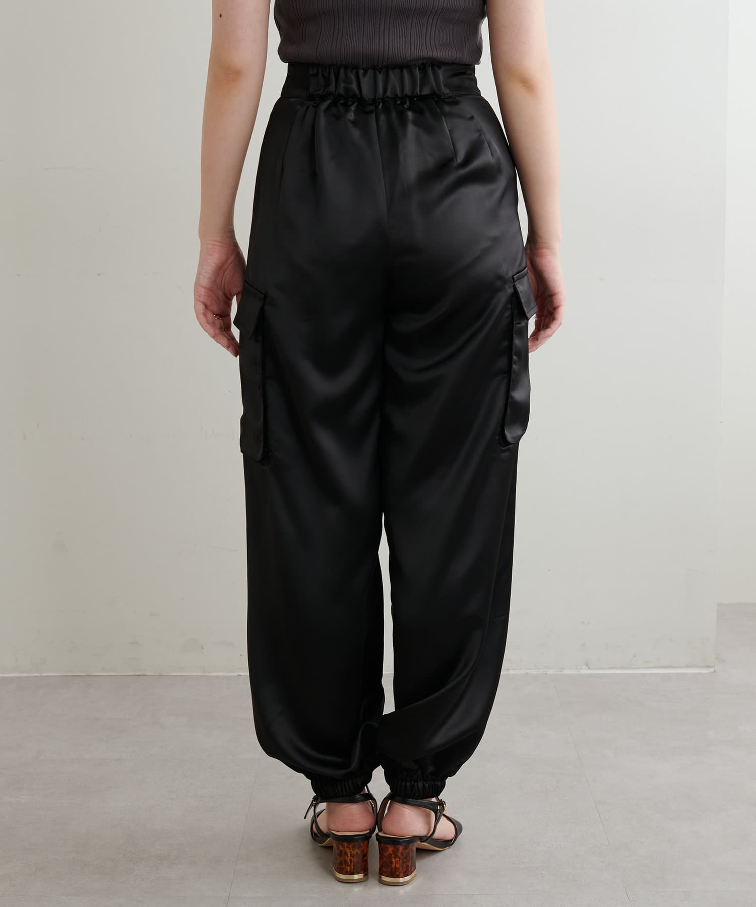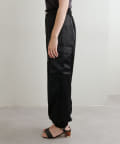 カジュアルなパラシュートパンツもサテン地を使用する事で