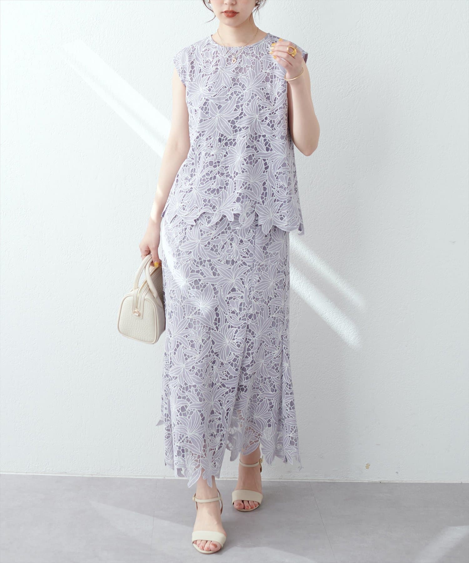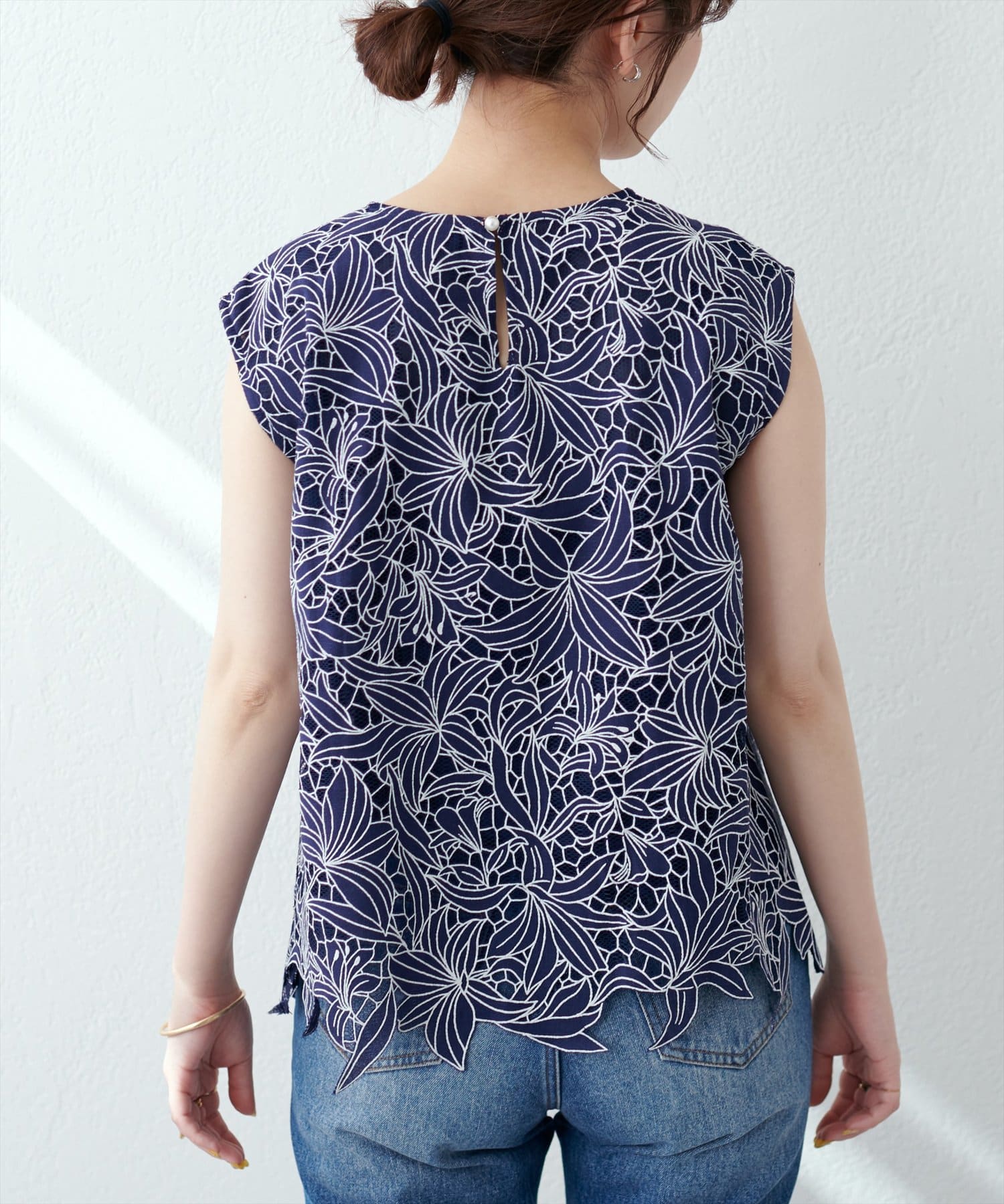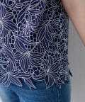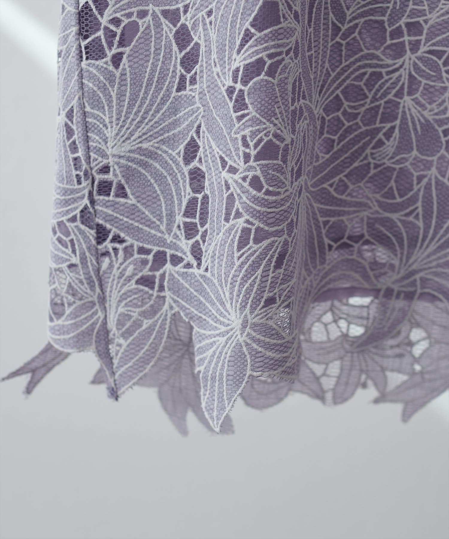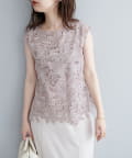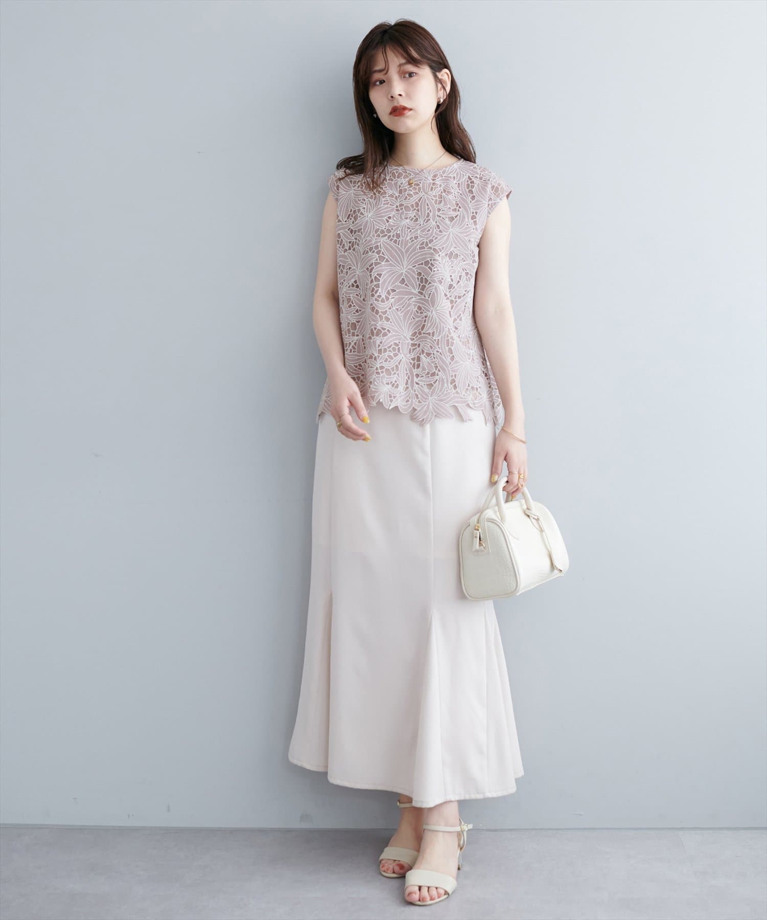裾は敢えてレースの凹凸感を残し、ボトムスにウエストアウトで合わせても上品な印象に。