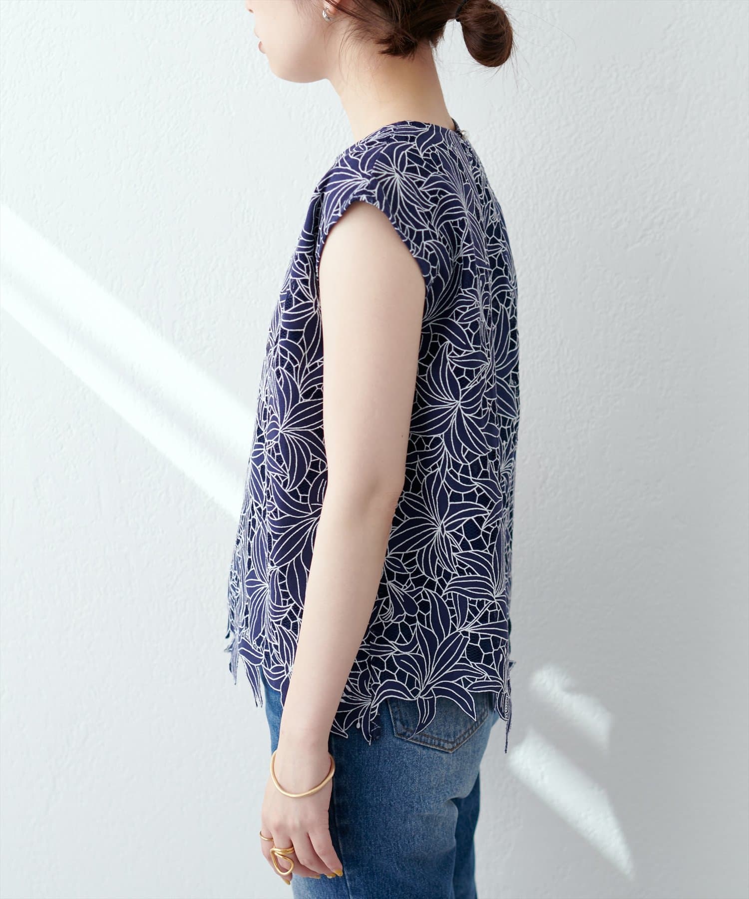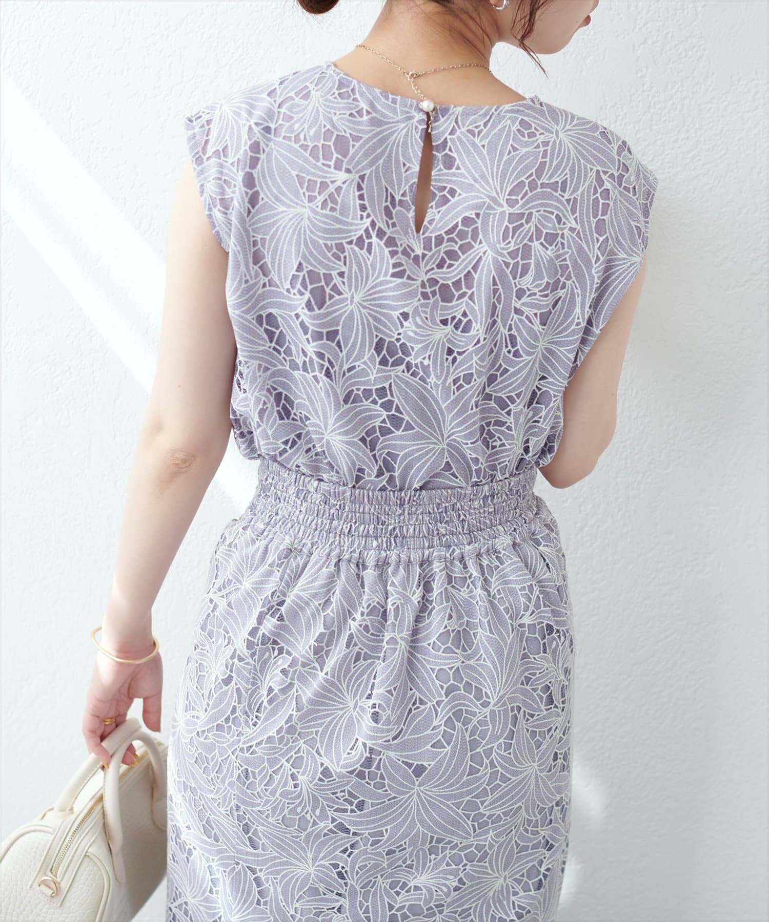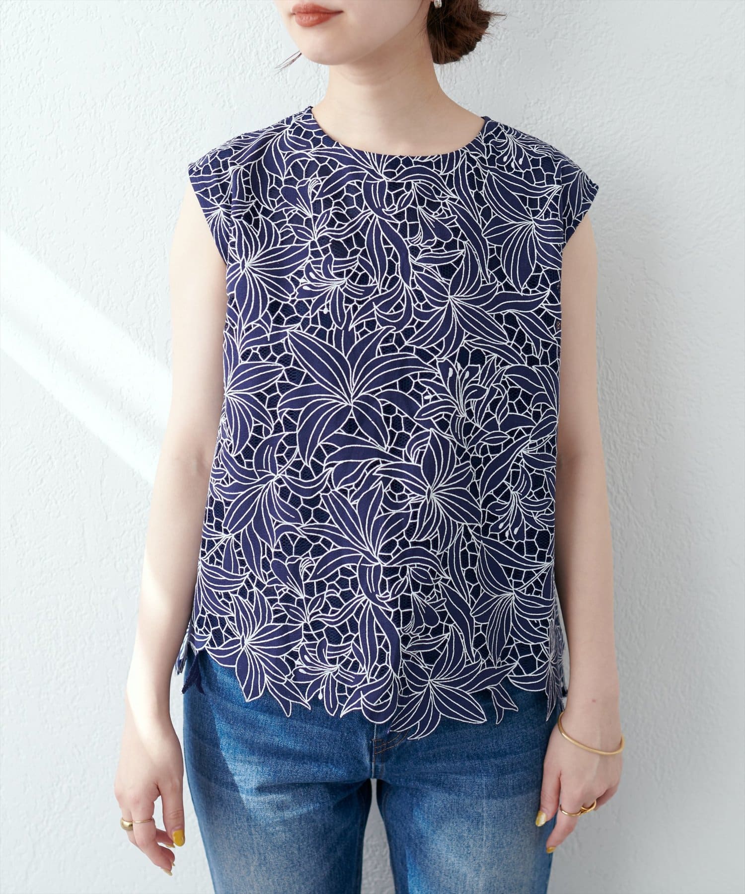 裾は敢えてレースの凹凸感を残し、ボトムスにウエストアウトで合わせても上品な印象に。
