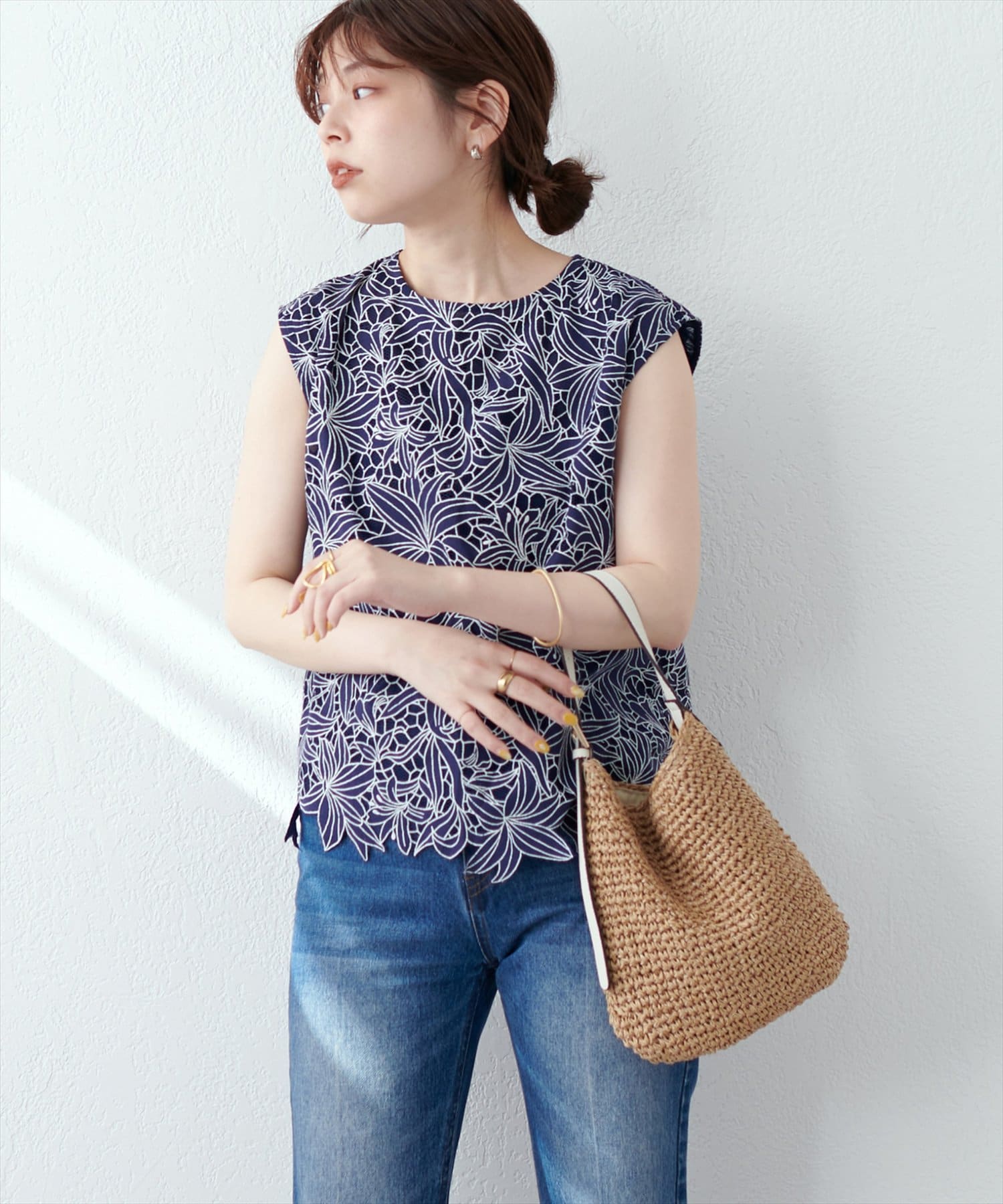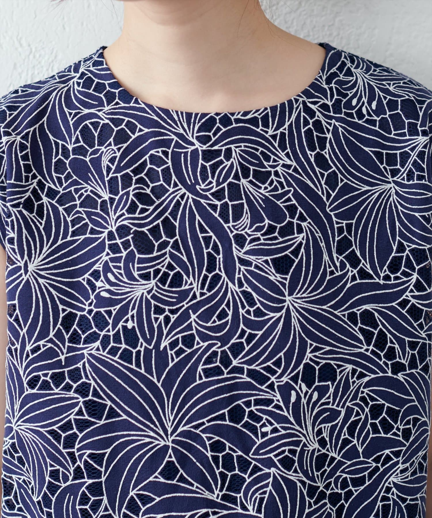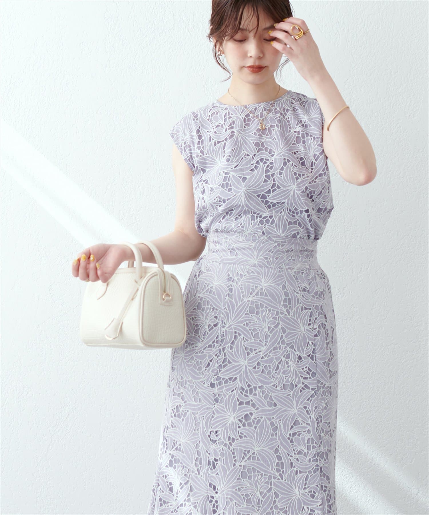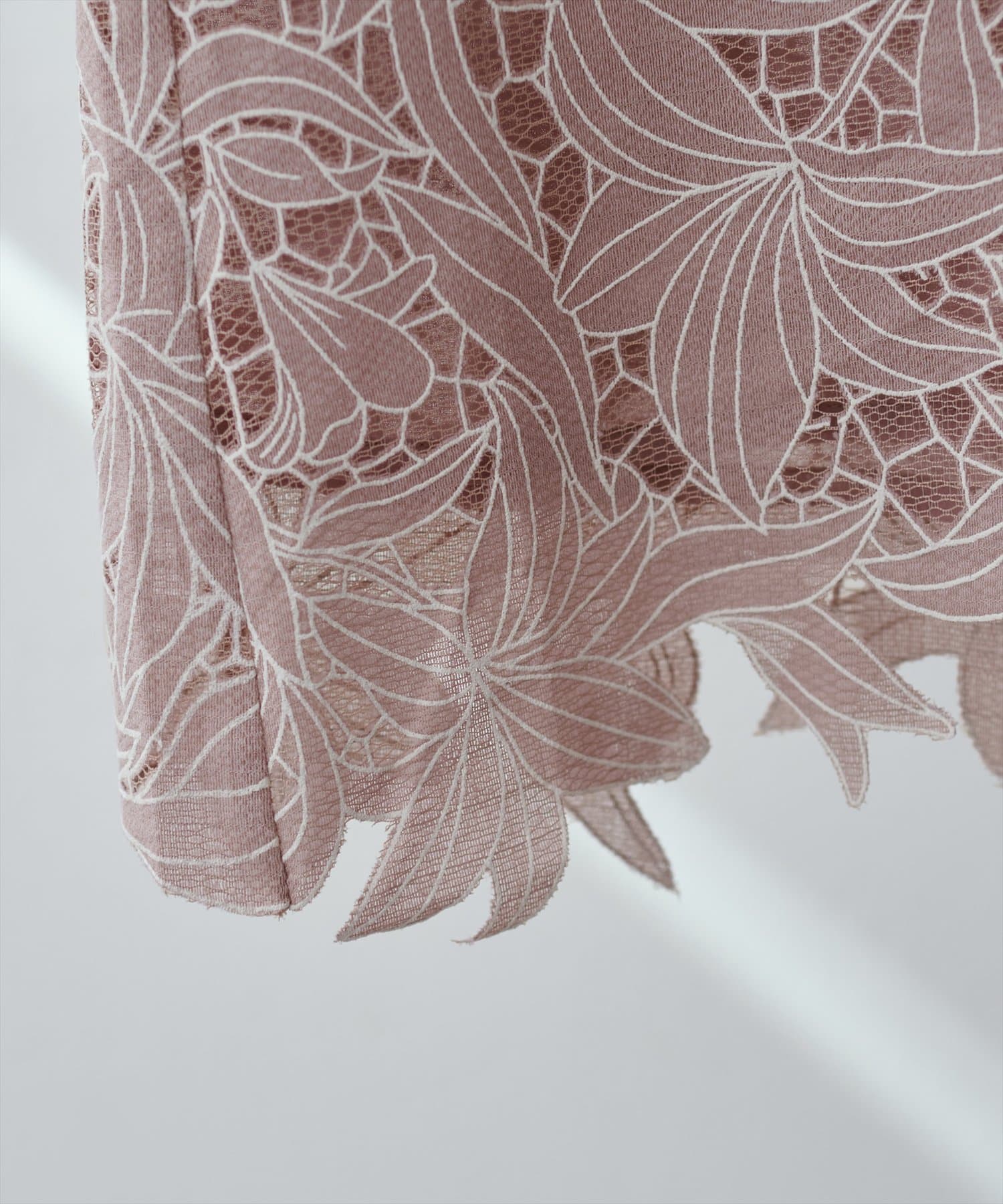 裾は敢えてレースの凹凸感を残し、ボトムスにウエストアウトで合わせても上品な印象に。
