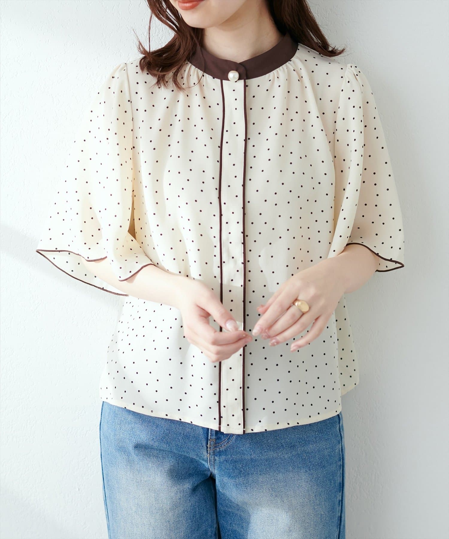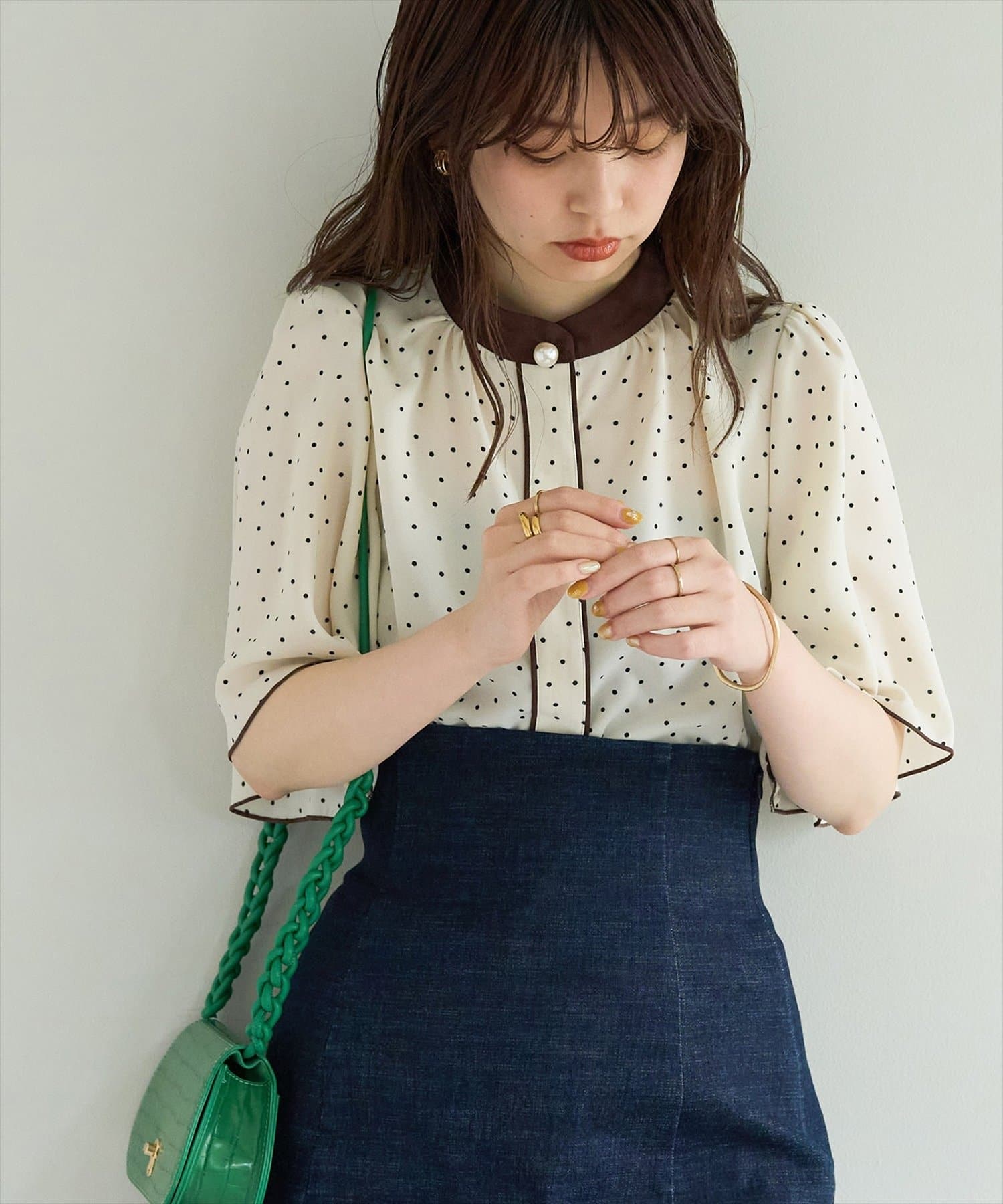 TOP > natural couture > レディース > トップス > シャツ/ブラウス(ボタン) > 大人気リバイバルアイテム/パール釦ポイントバイカラーフレア5分袖ブラウス