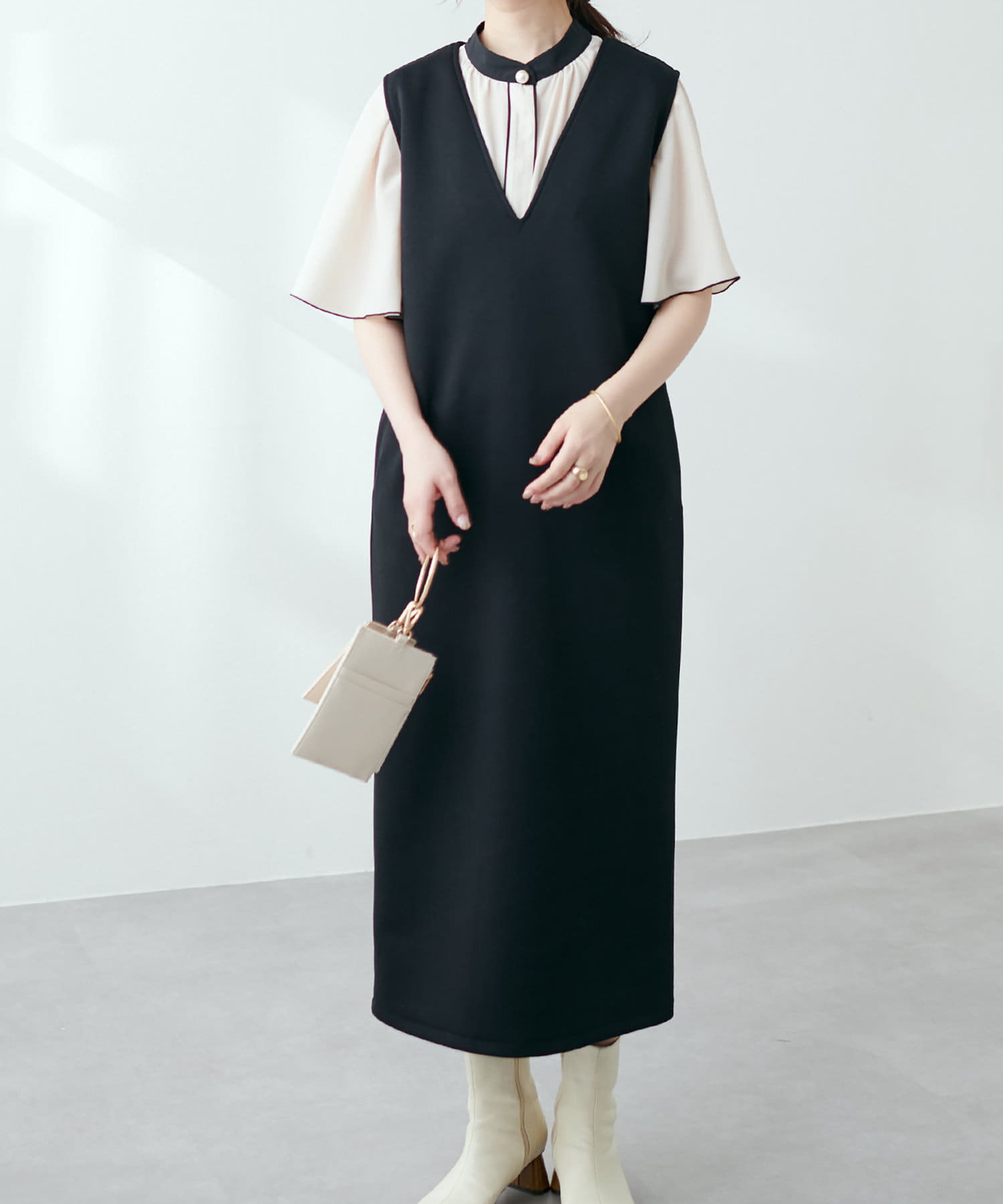 シンプルなバイカラーデザインに、ネックのパールボタンを