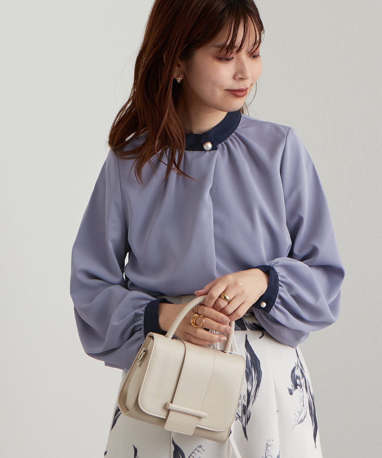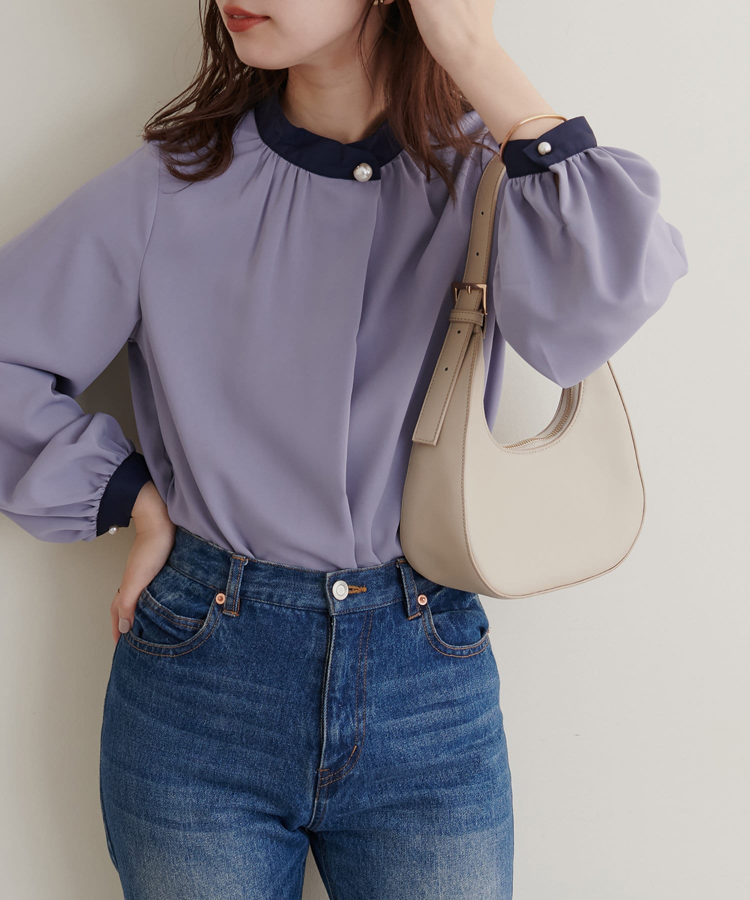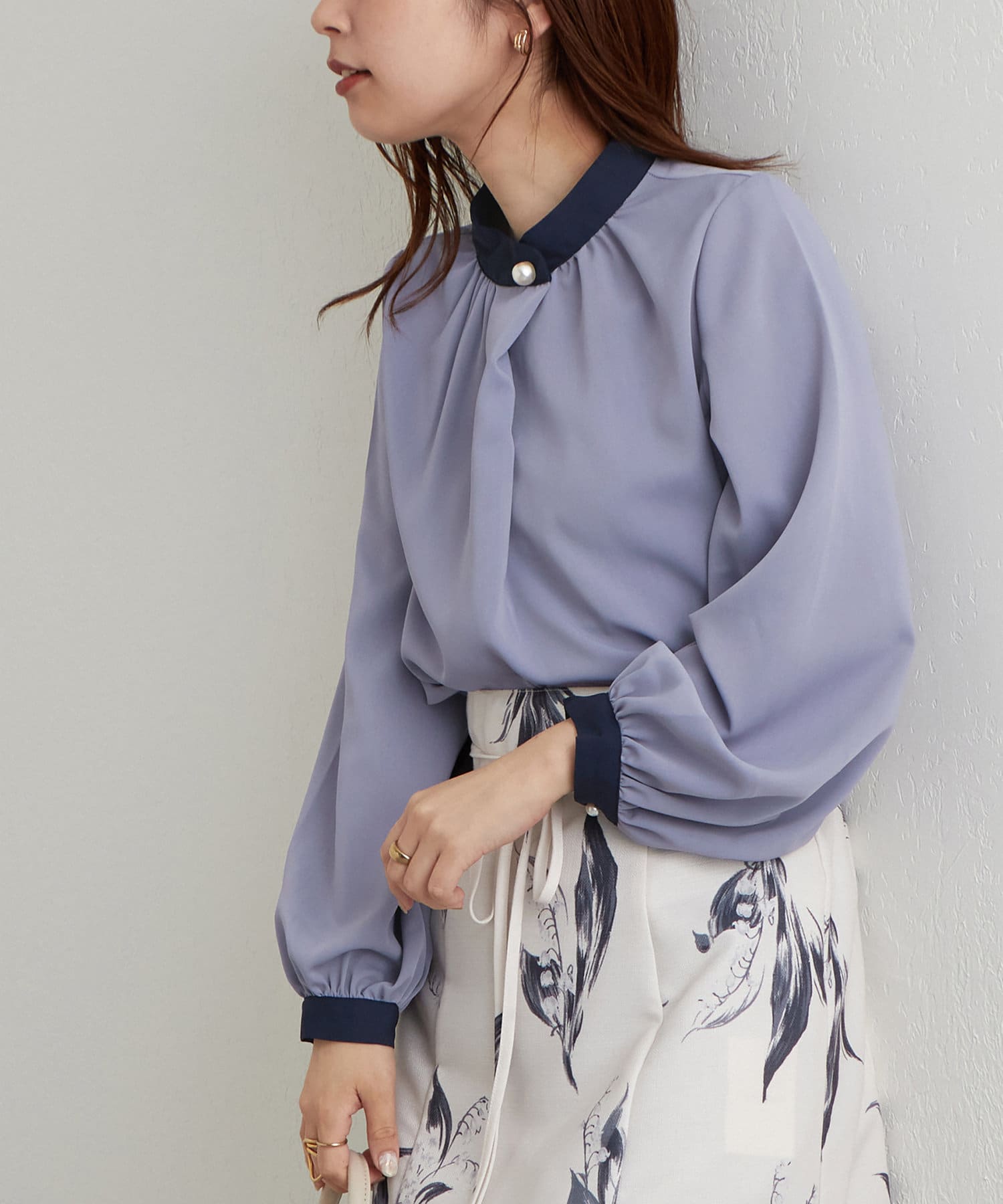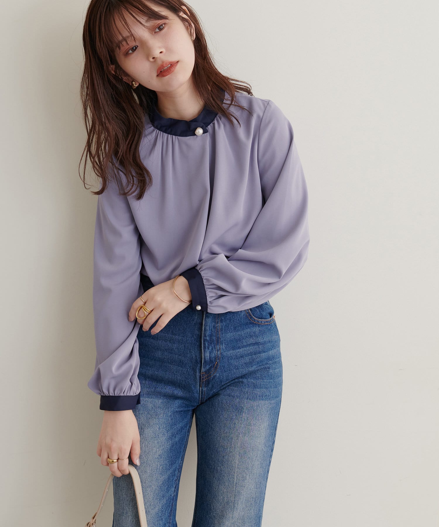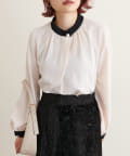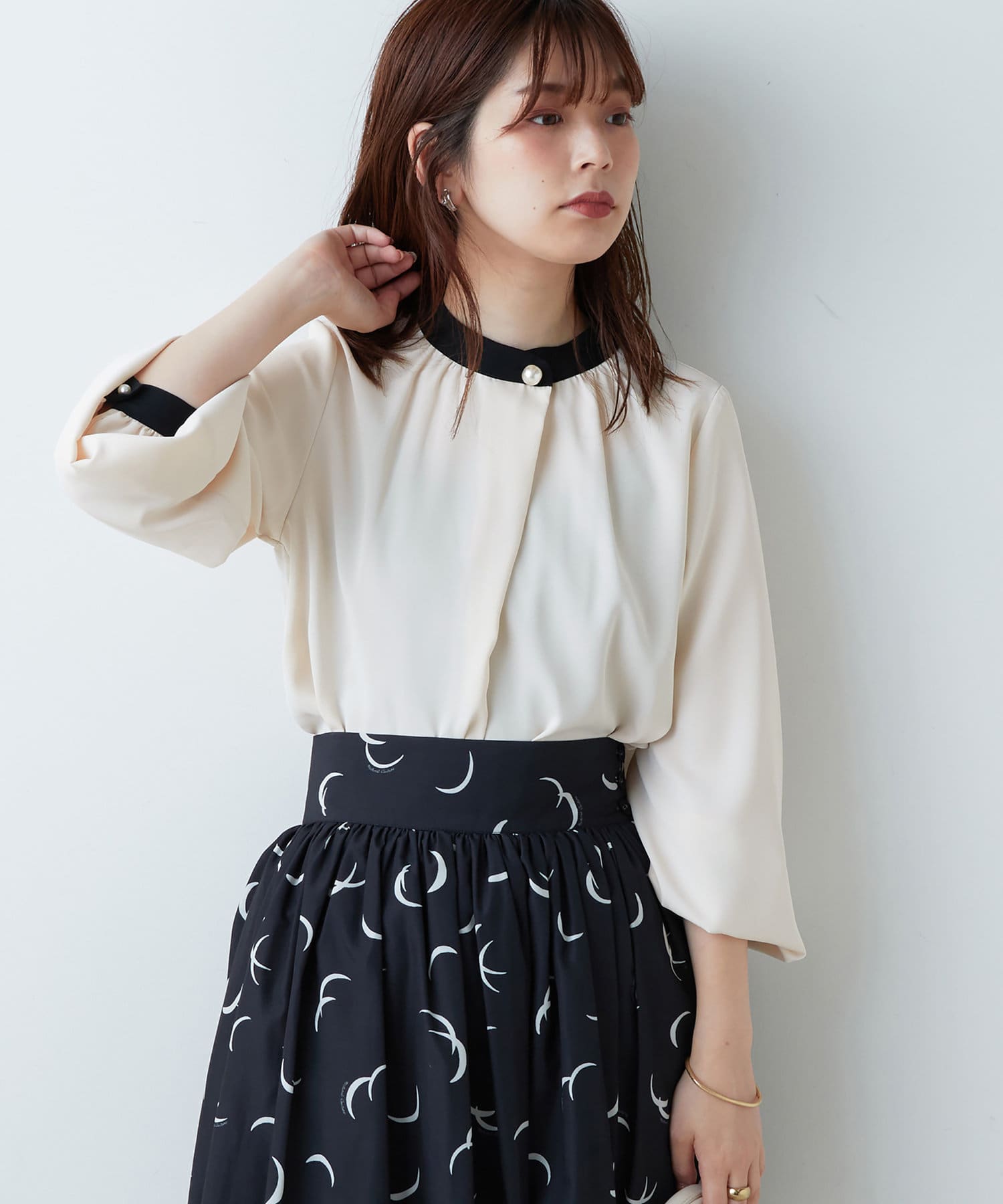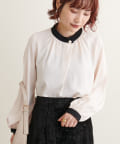 配色のトリミングをアクセントにメリハリをつけたフェミニンブラウス。