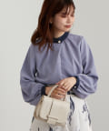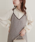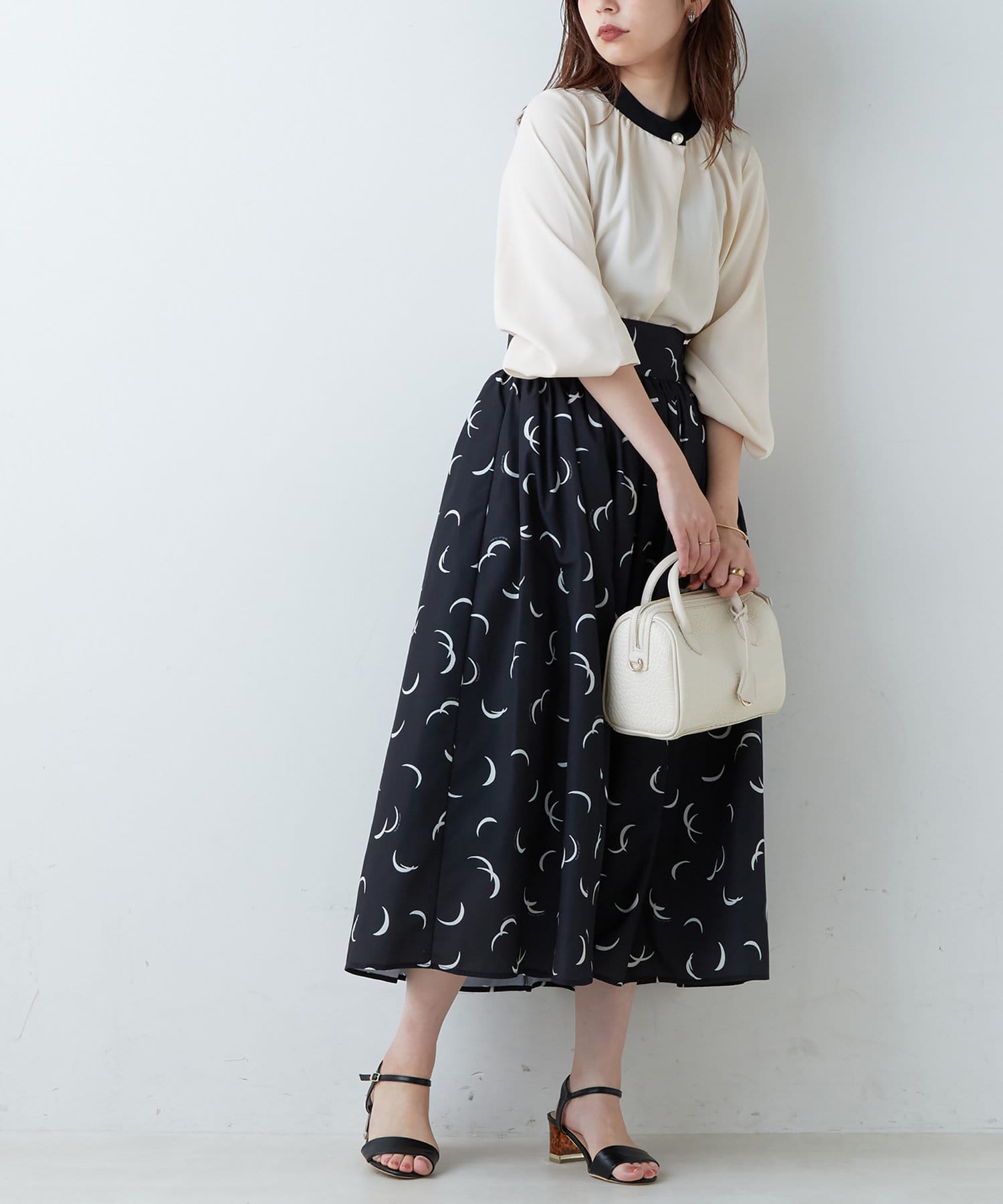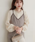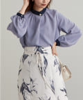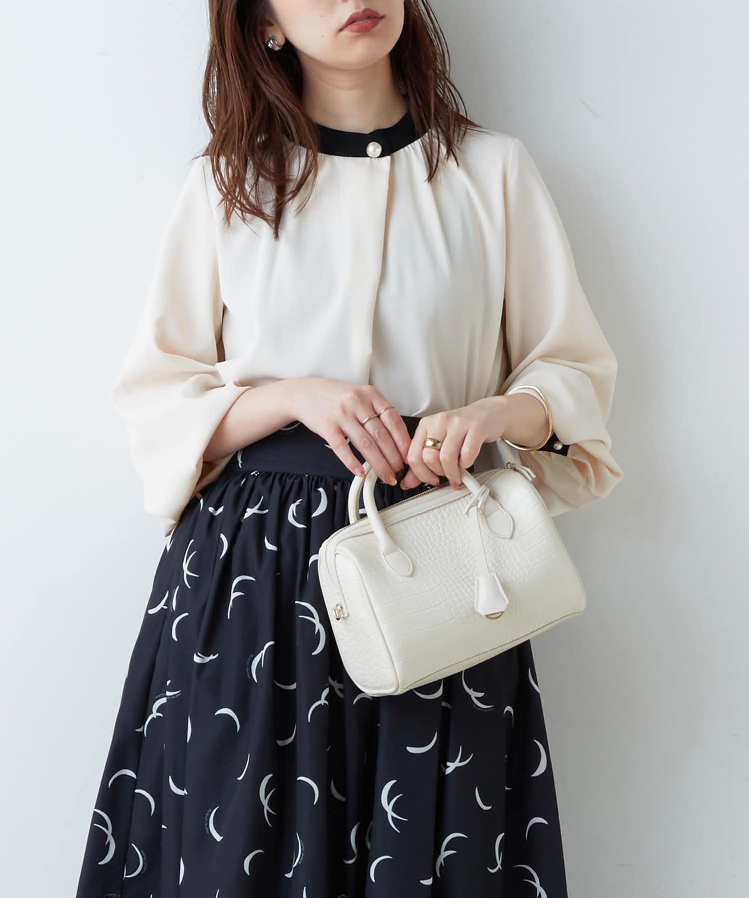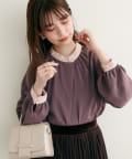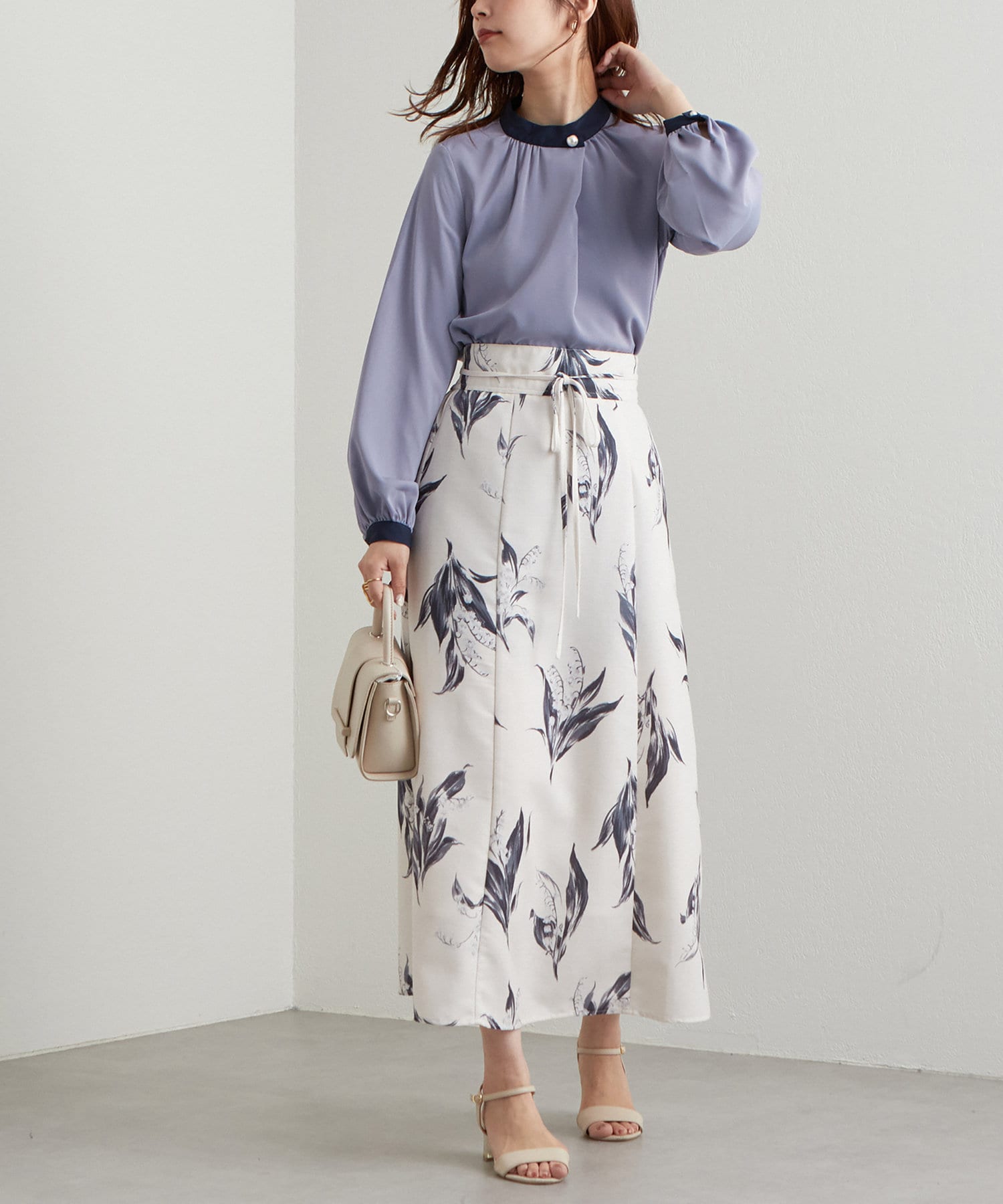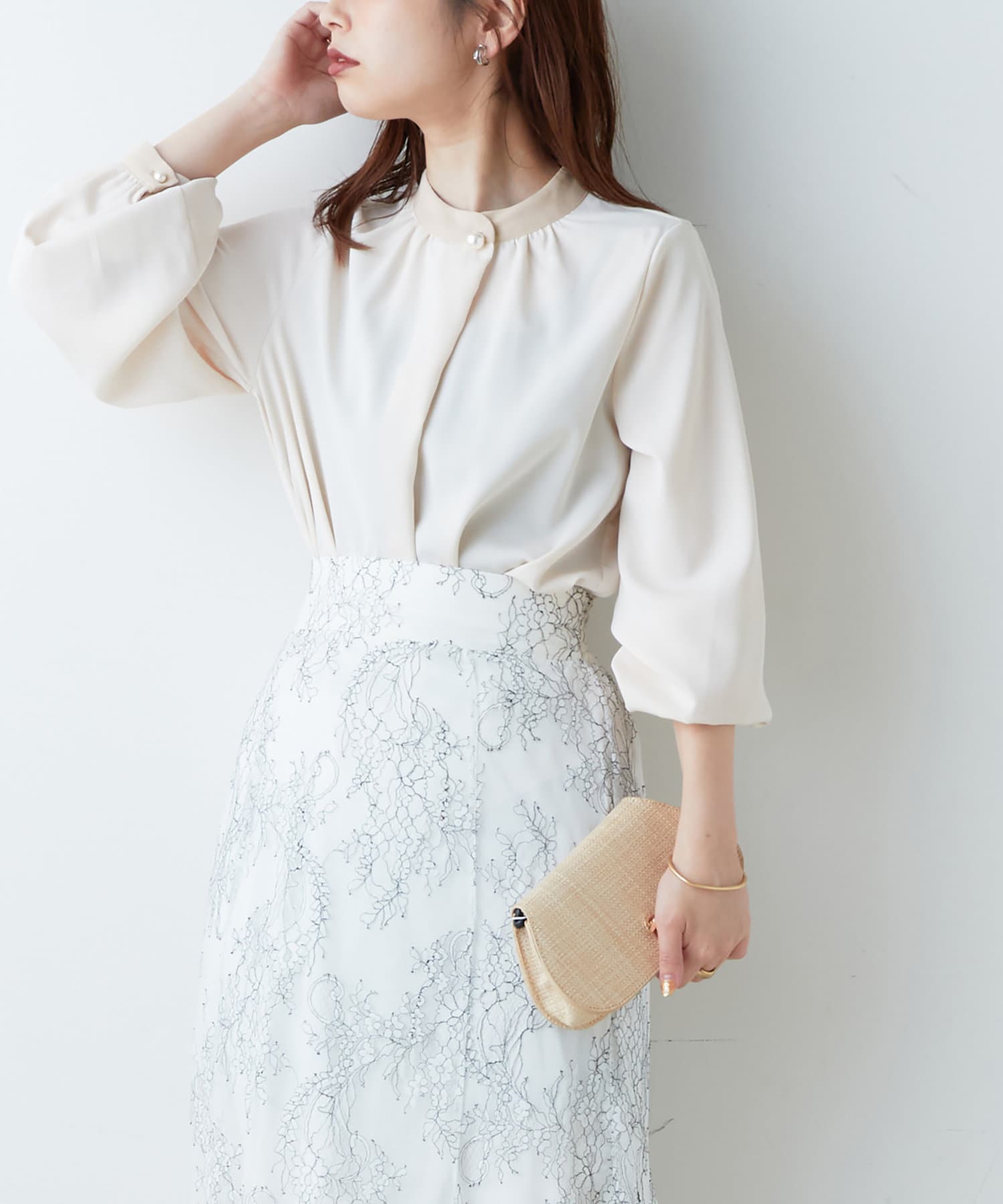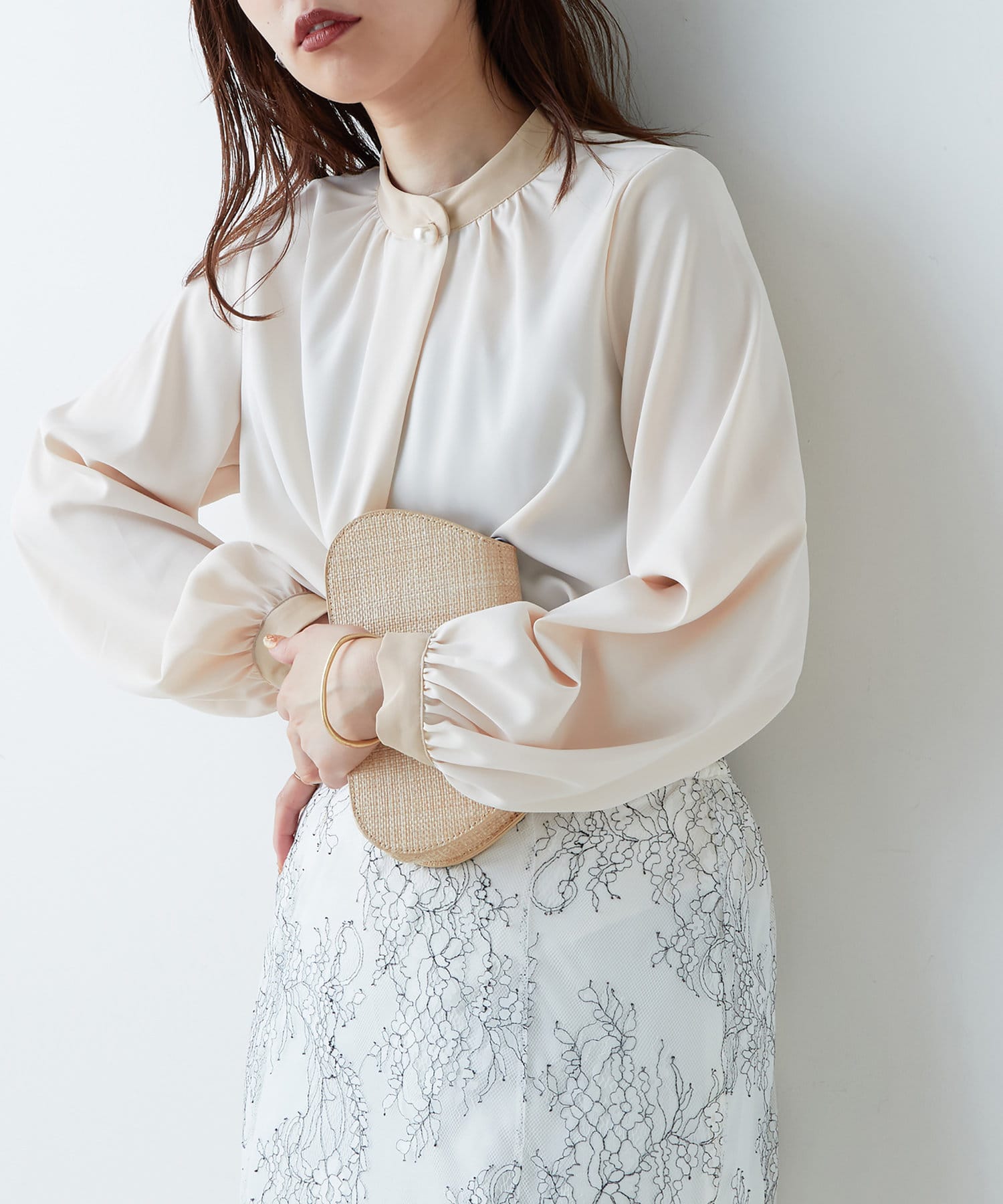 配色のトリミングをアクセントにメリハリをつけたフェミニンブラウス。