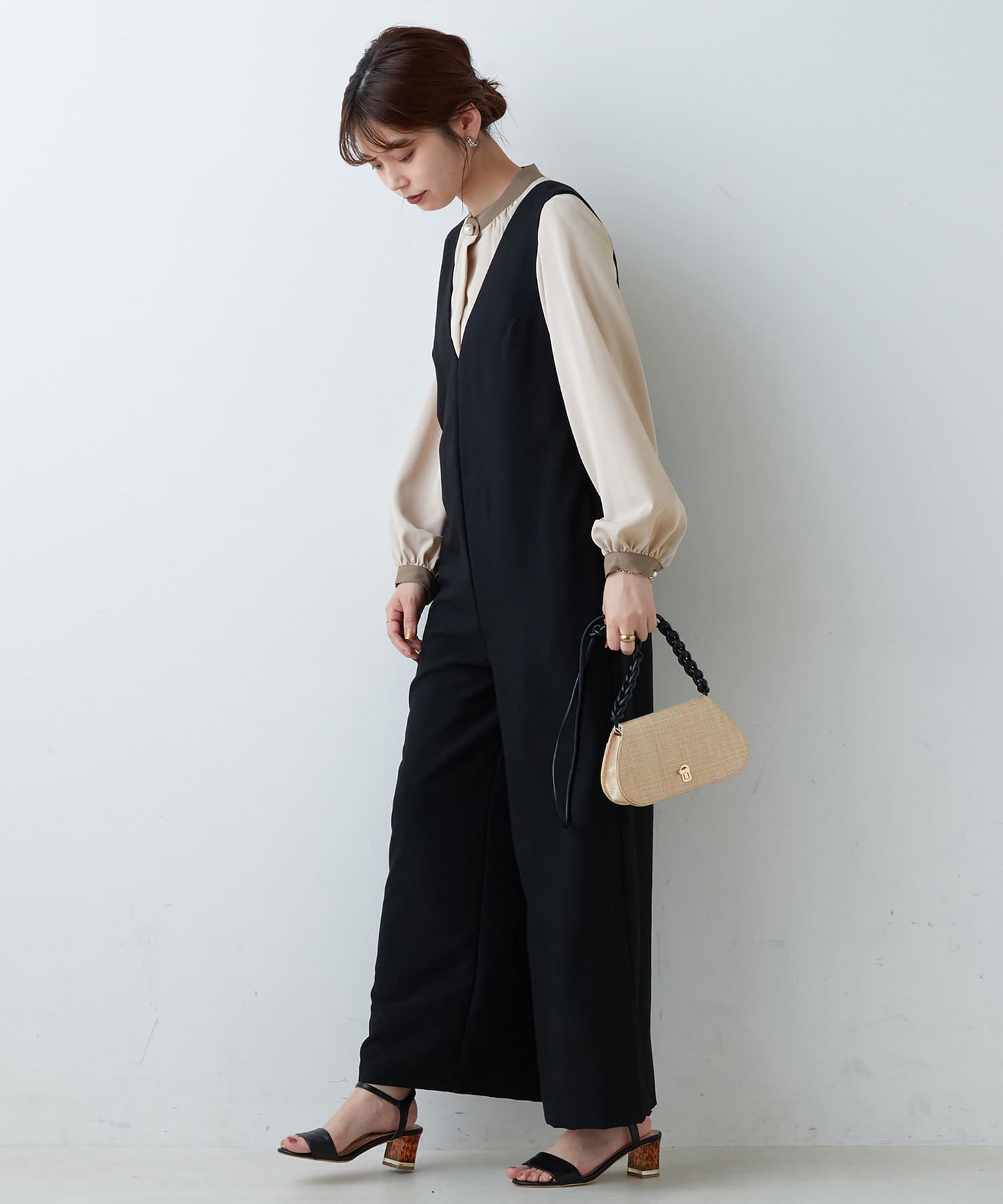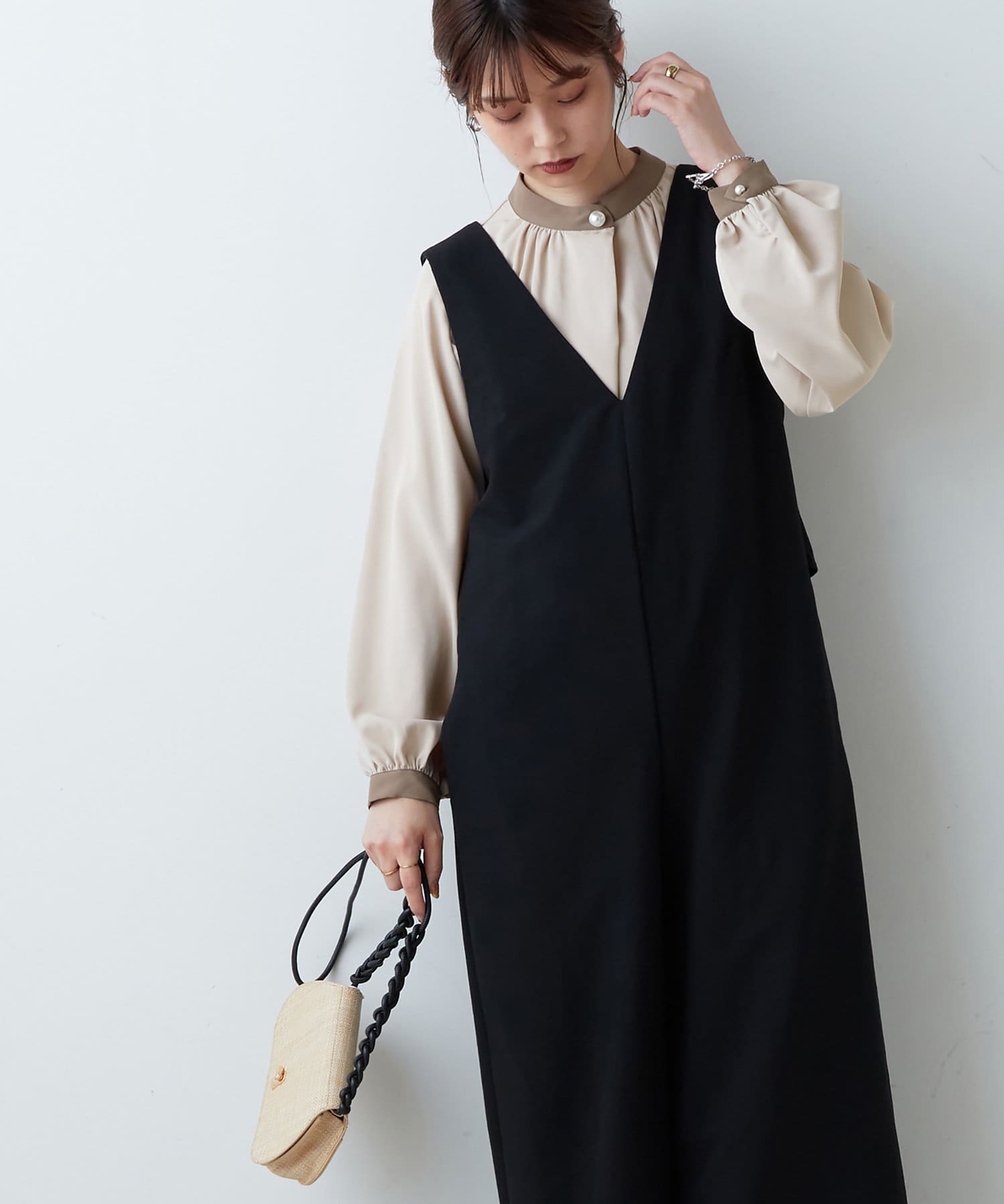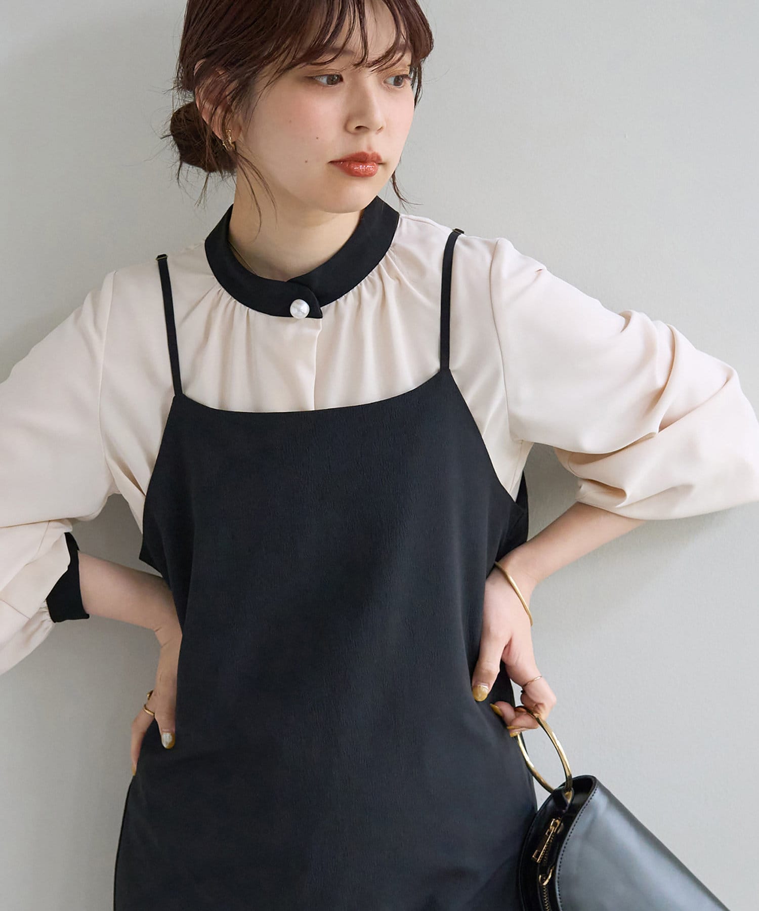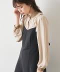 サラッとしたブラウスで、襟元と袖がバイカラーでキュッと引き締めてくれる上、パールボタンが可愛さを出してくれます。襟元はホックが2つで安心。重なった胸元のニュアンスが大人っぽいです。袖の膨らみは可愛らしくて、女性らしいブラウスに大満足です。