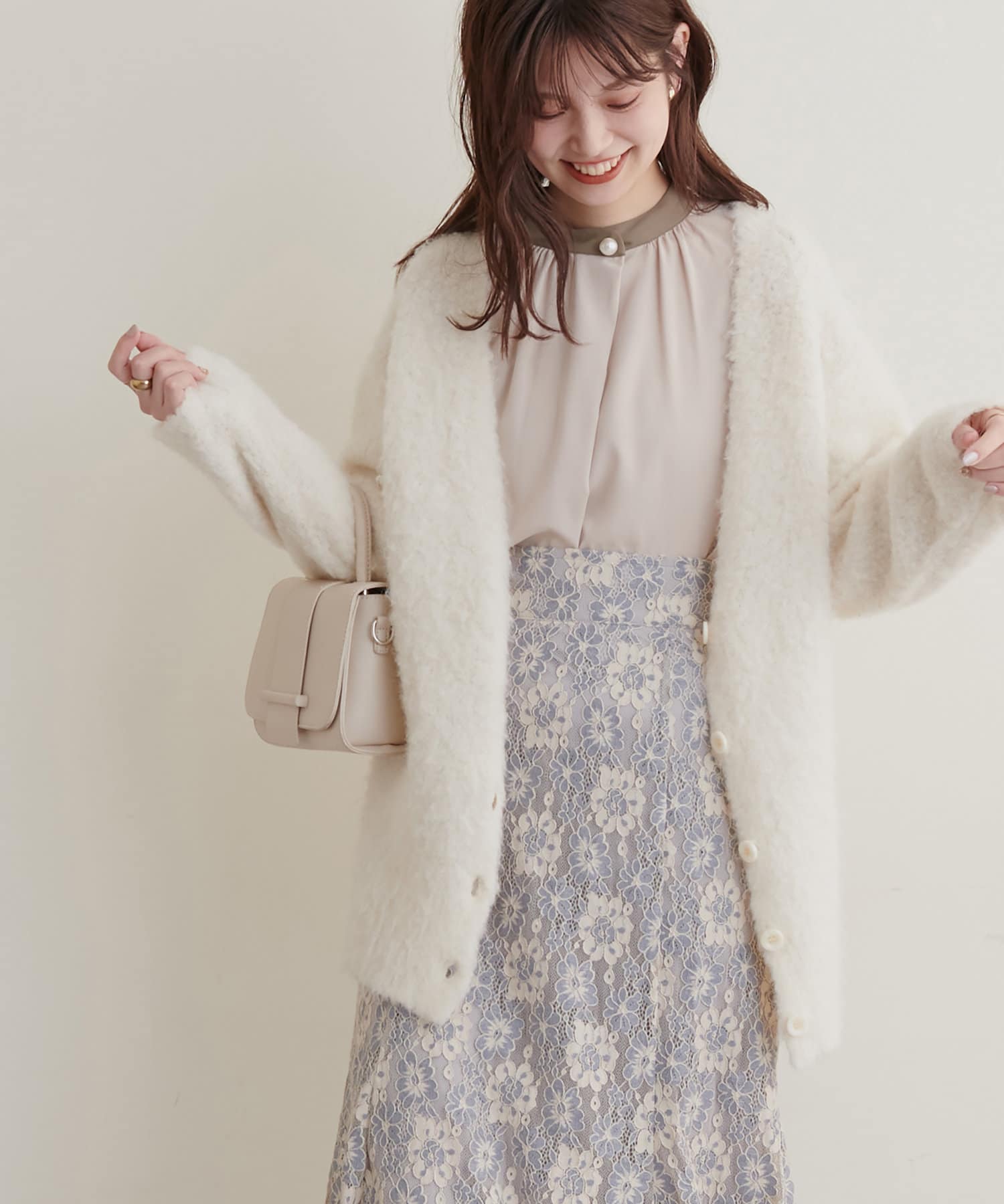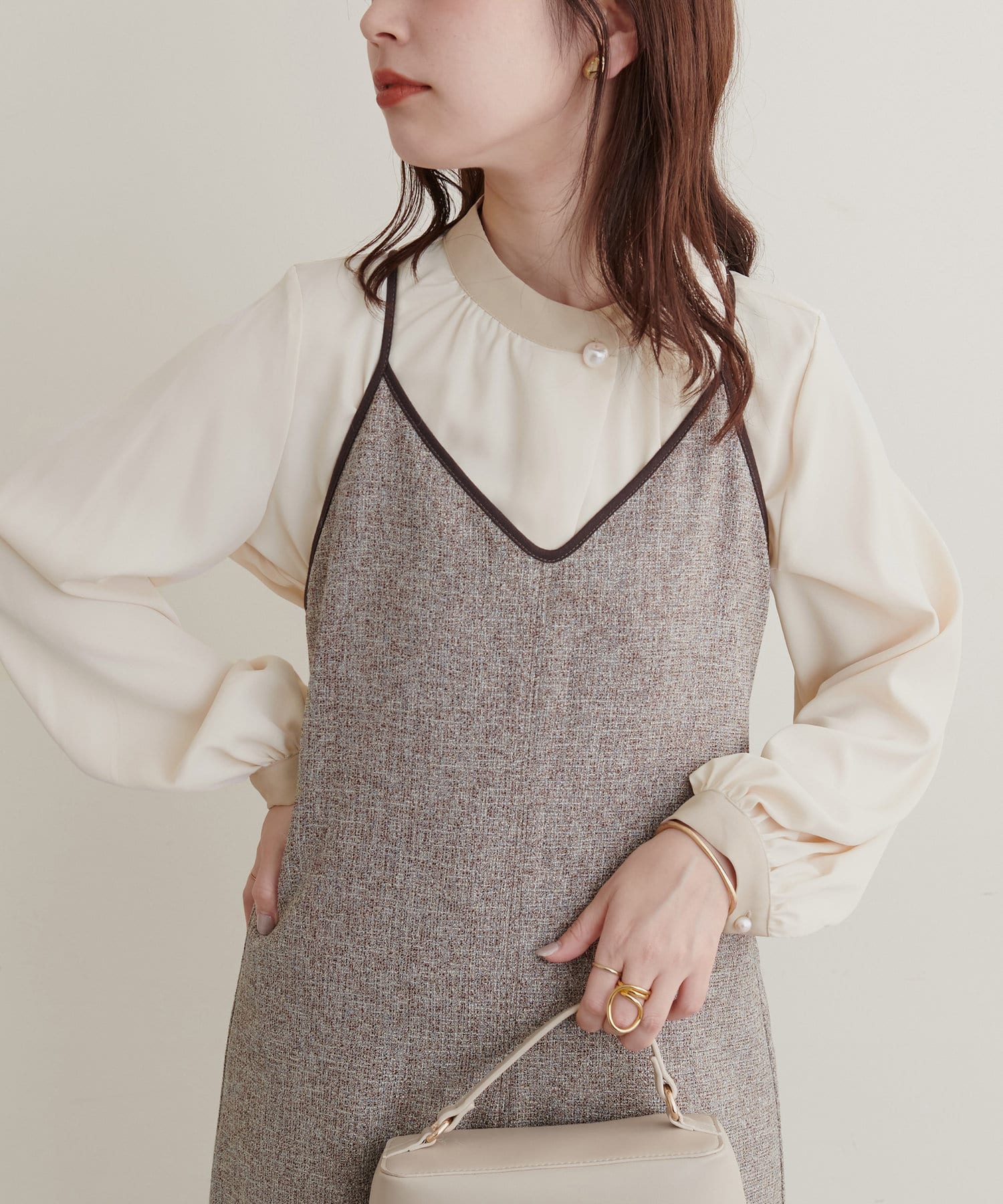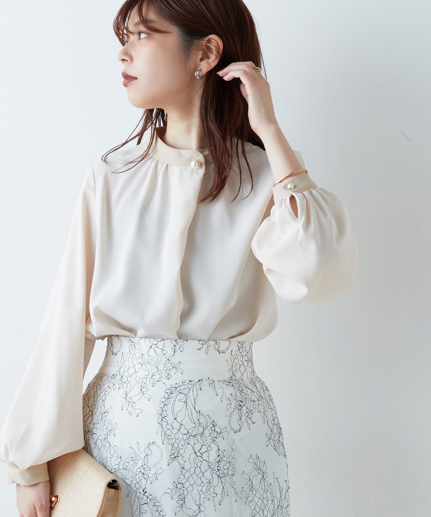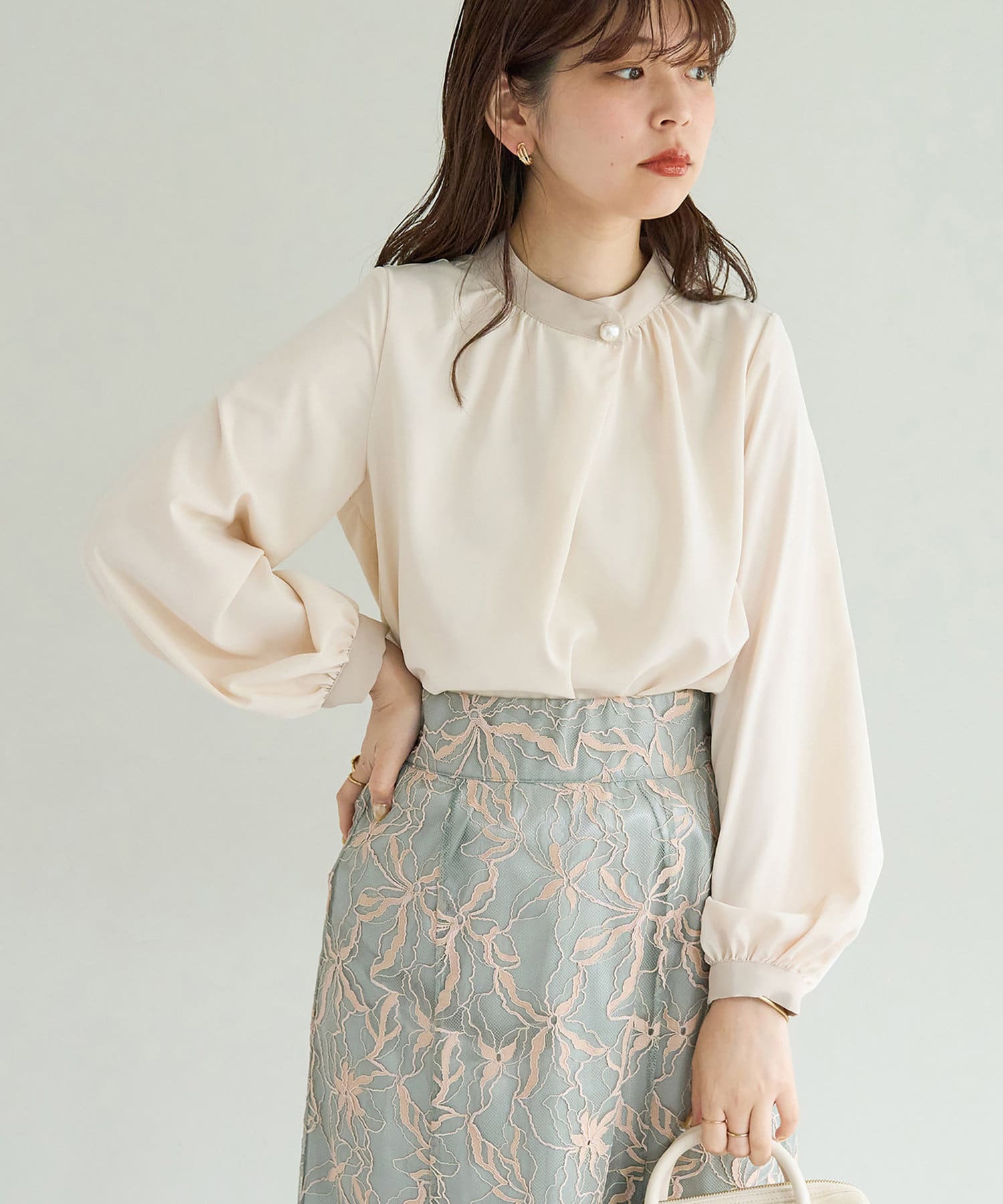 ジャンスカに合わせるブラウスを探してて、春にピッタリでカーデガンと合わせて着ようと思います。首元にパールがついているので華やかになりネックレスいらずです。