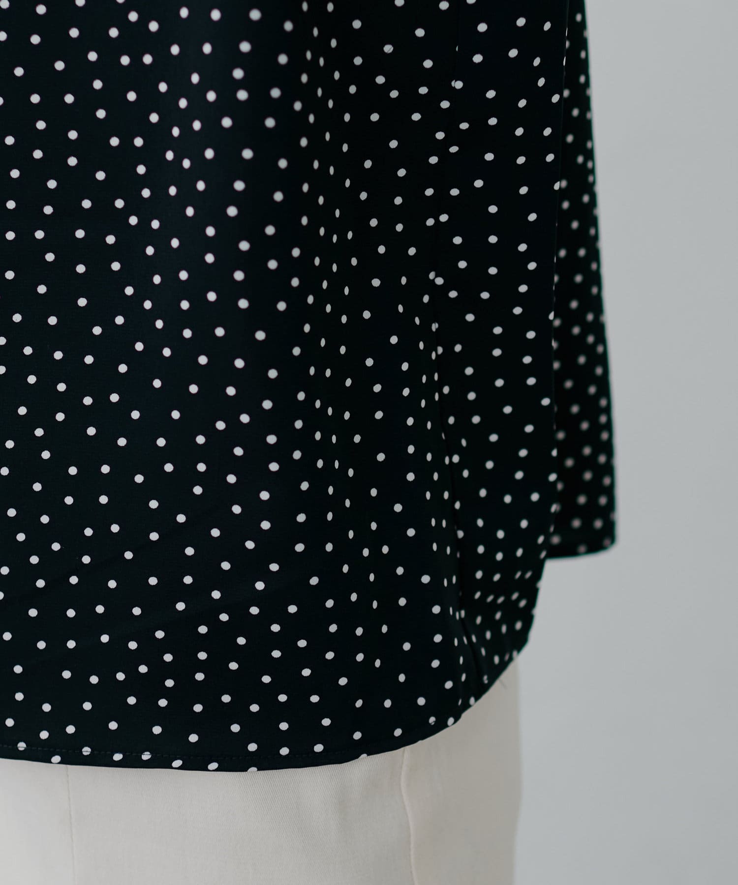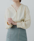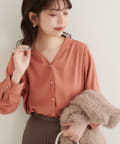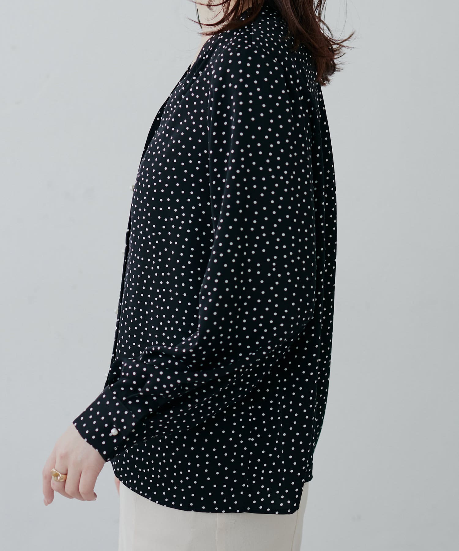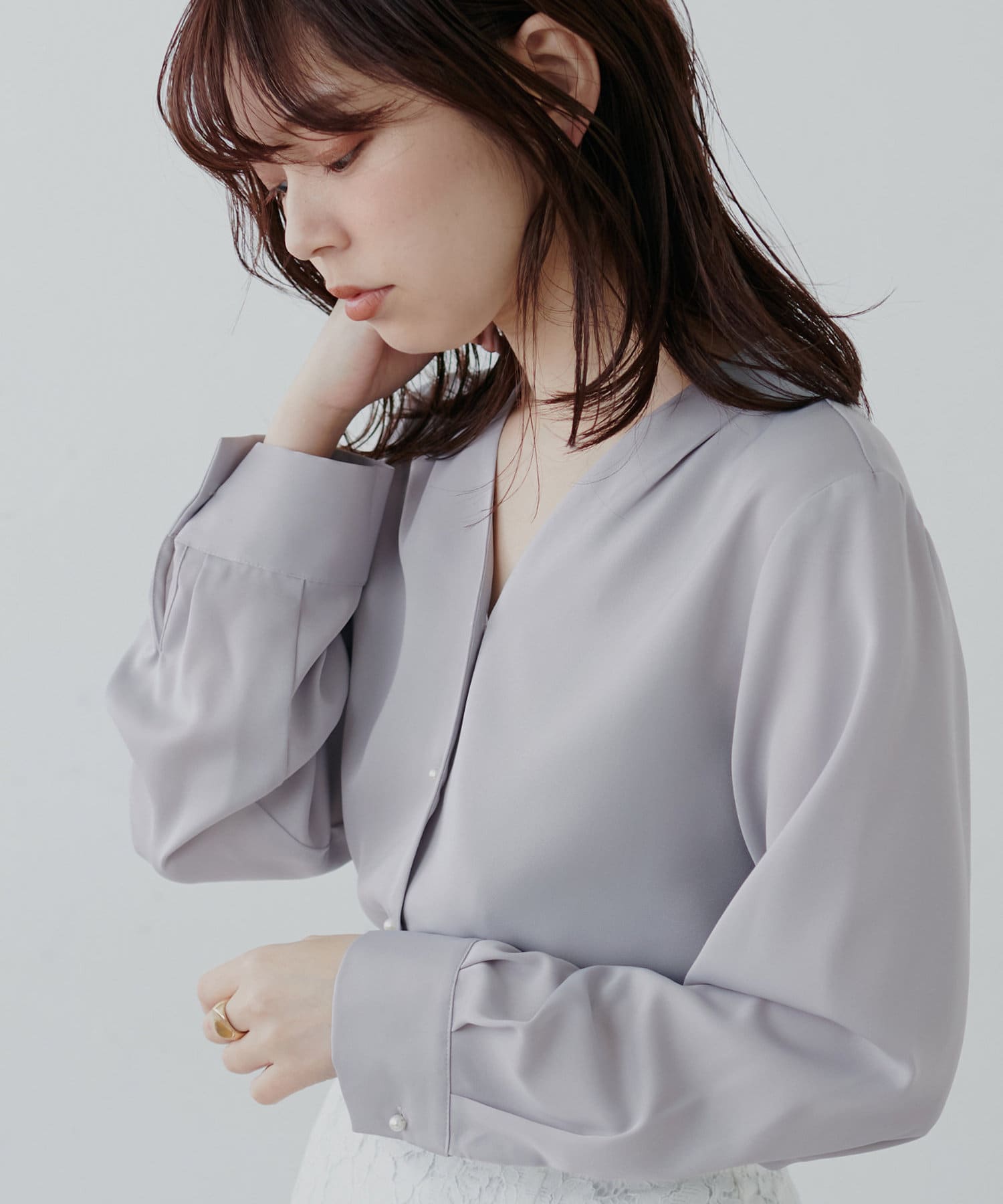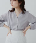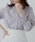 滑らかで落ち感のある着心地の良い生地に、フロントをパール釦使いに仕上げた、大人上品なブラウス。