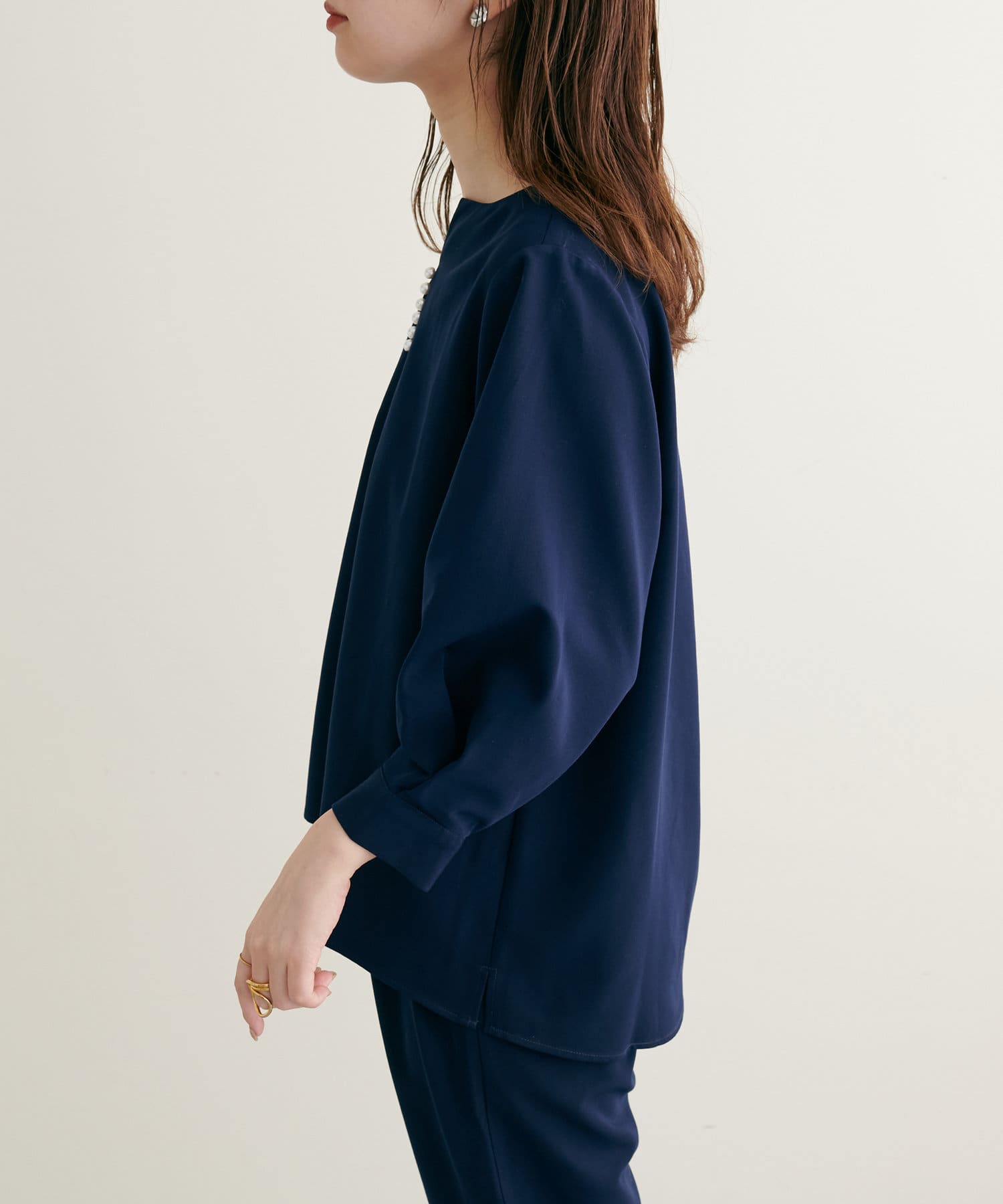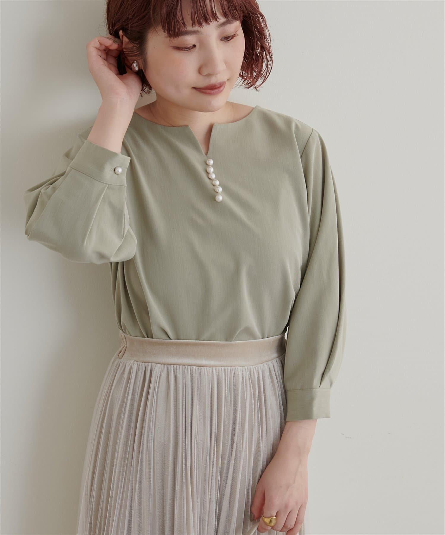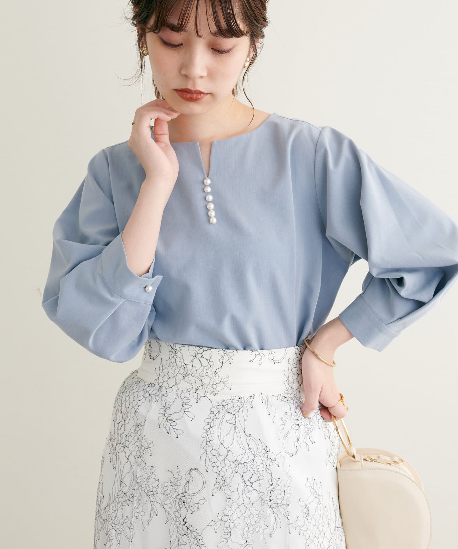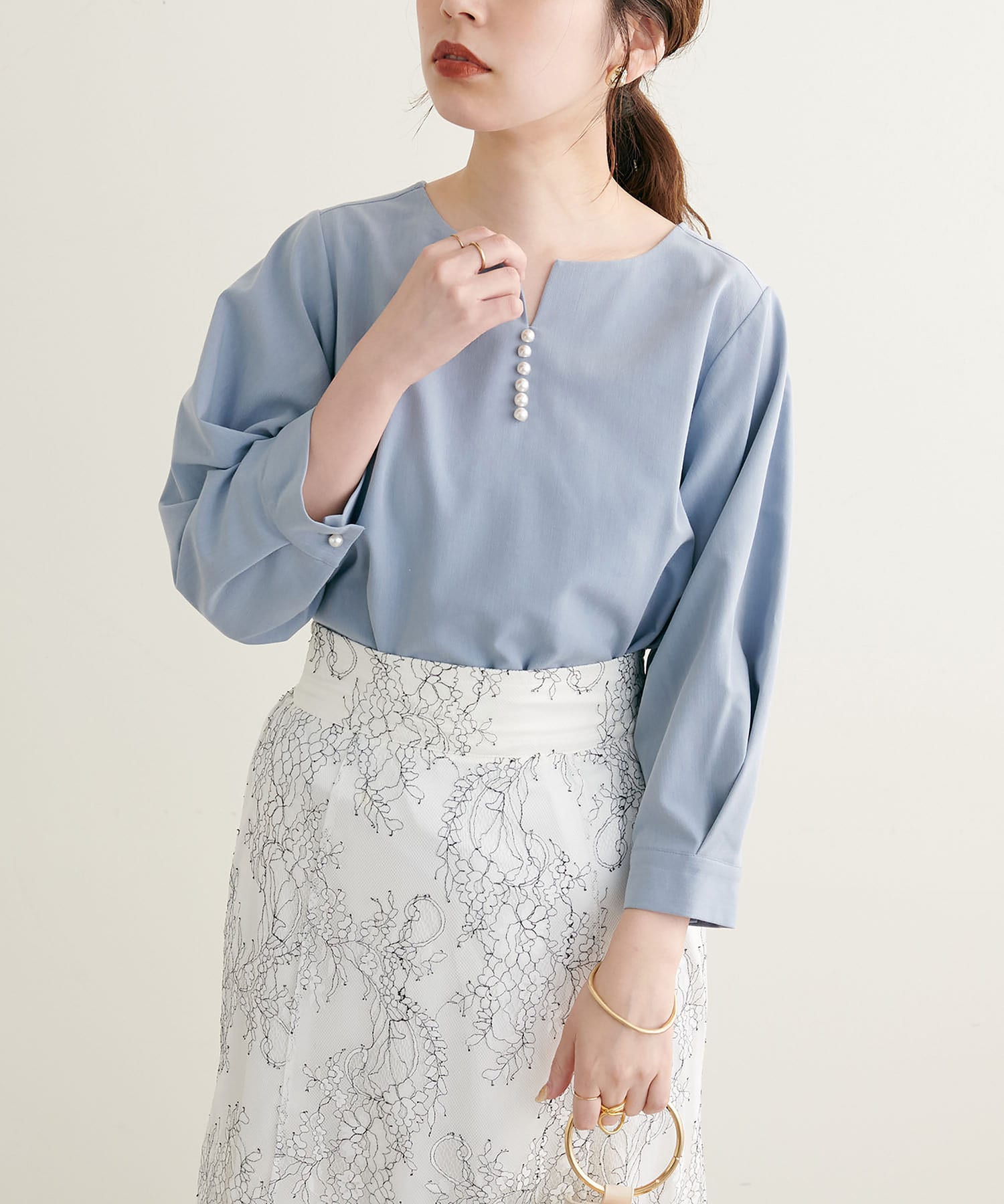 ネックラインをすっきりと見せてくれる程良いスキッパーデザインに、パールを施した大人上品なブラウス。