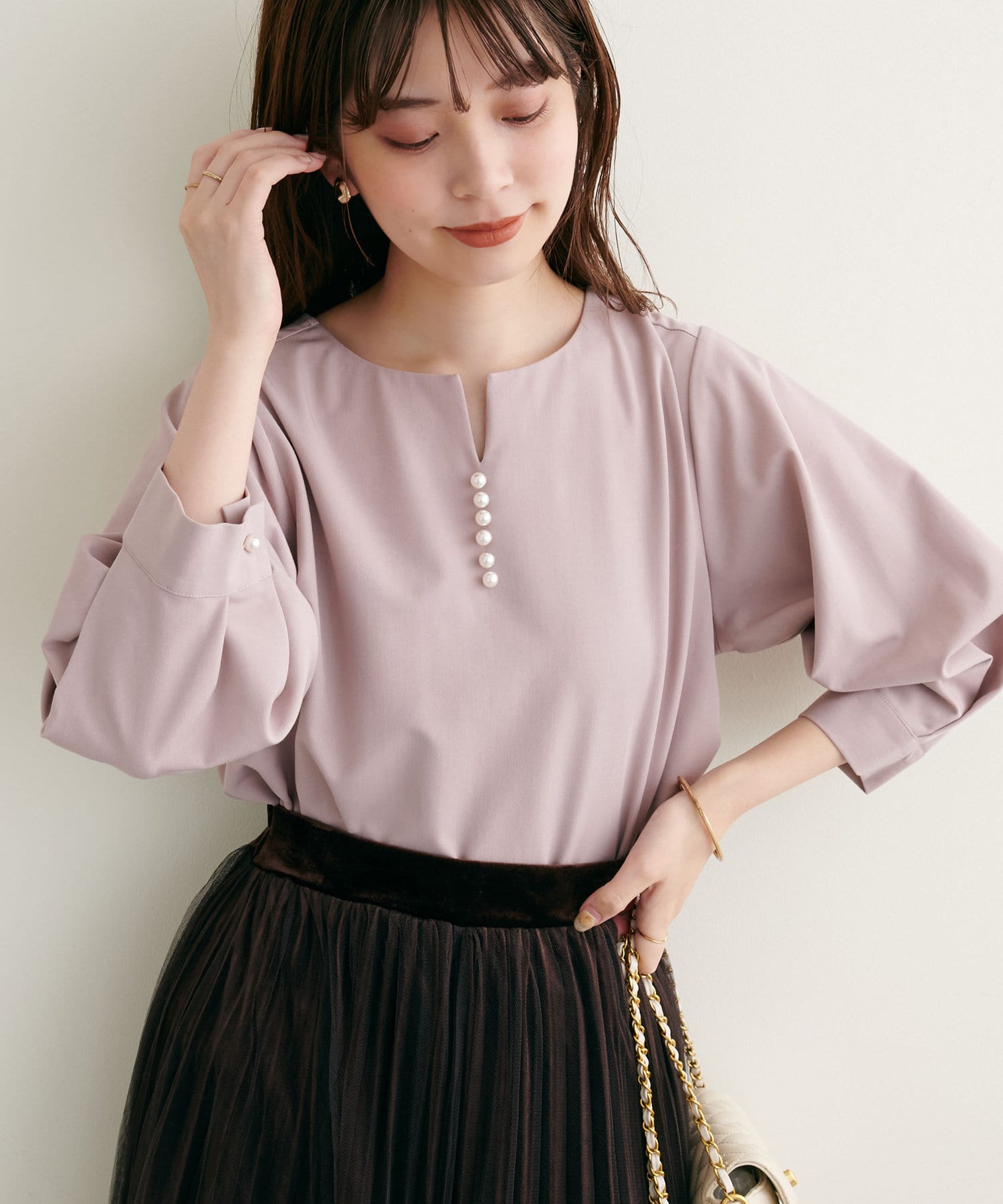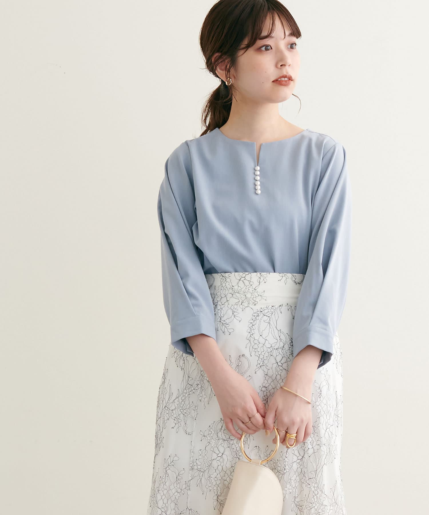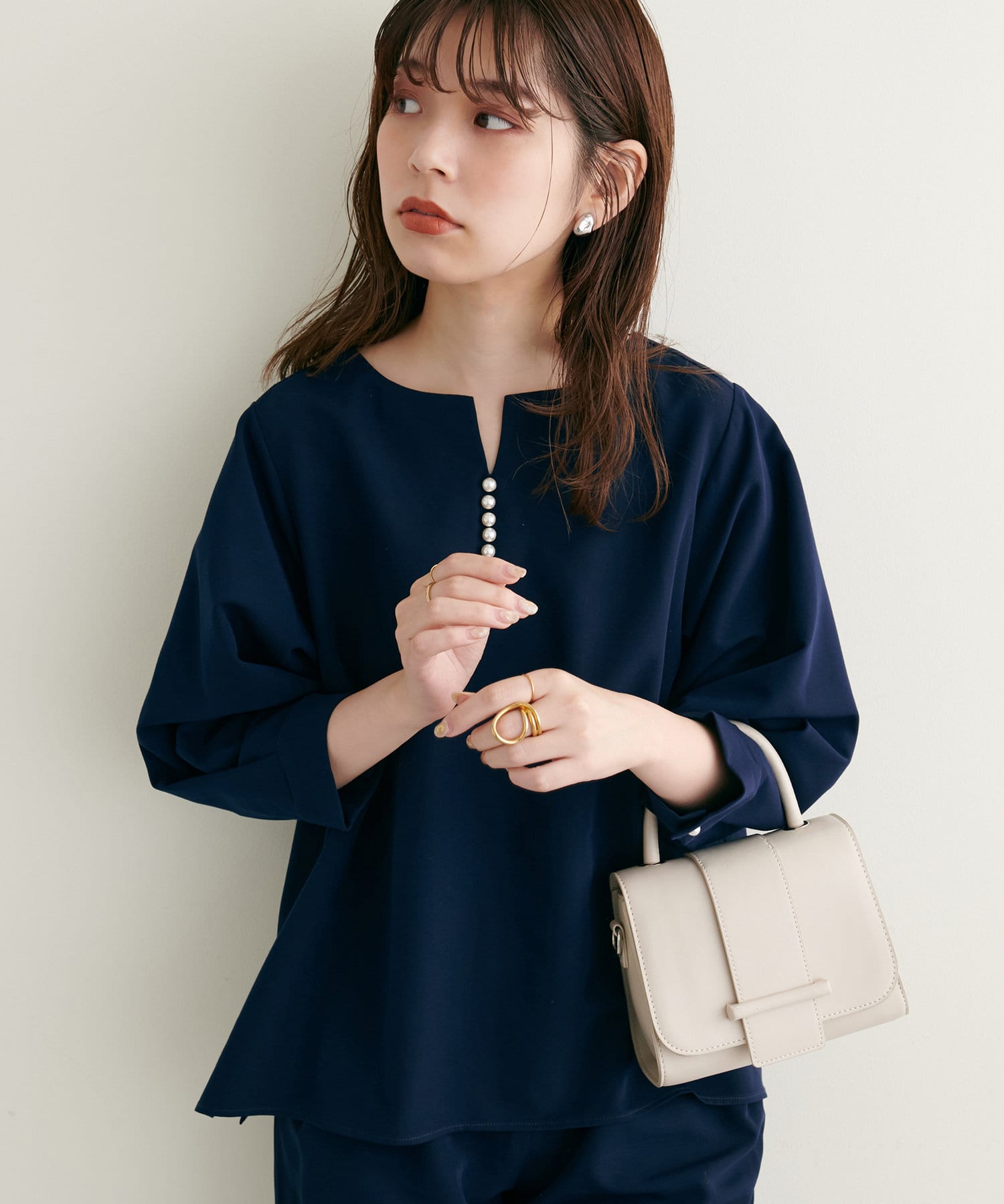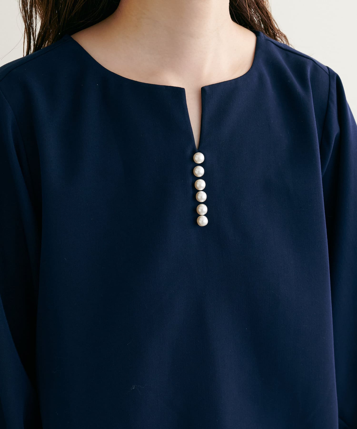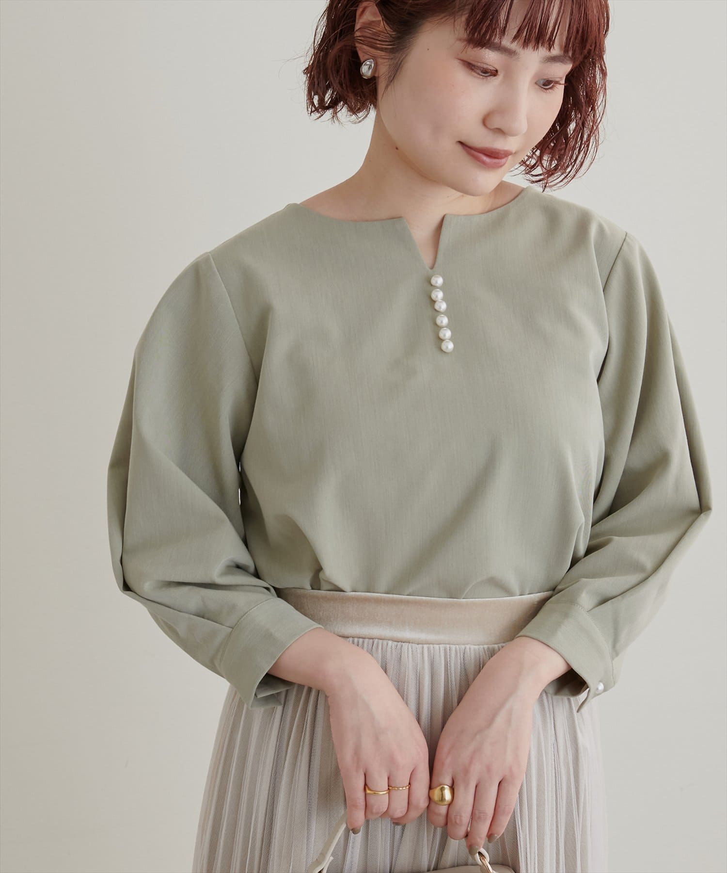 ネックラインをすっきりと見せてくれる程良いスキッパーデザインに、パールを施した大人上品なブラウス。