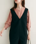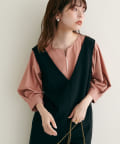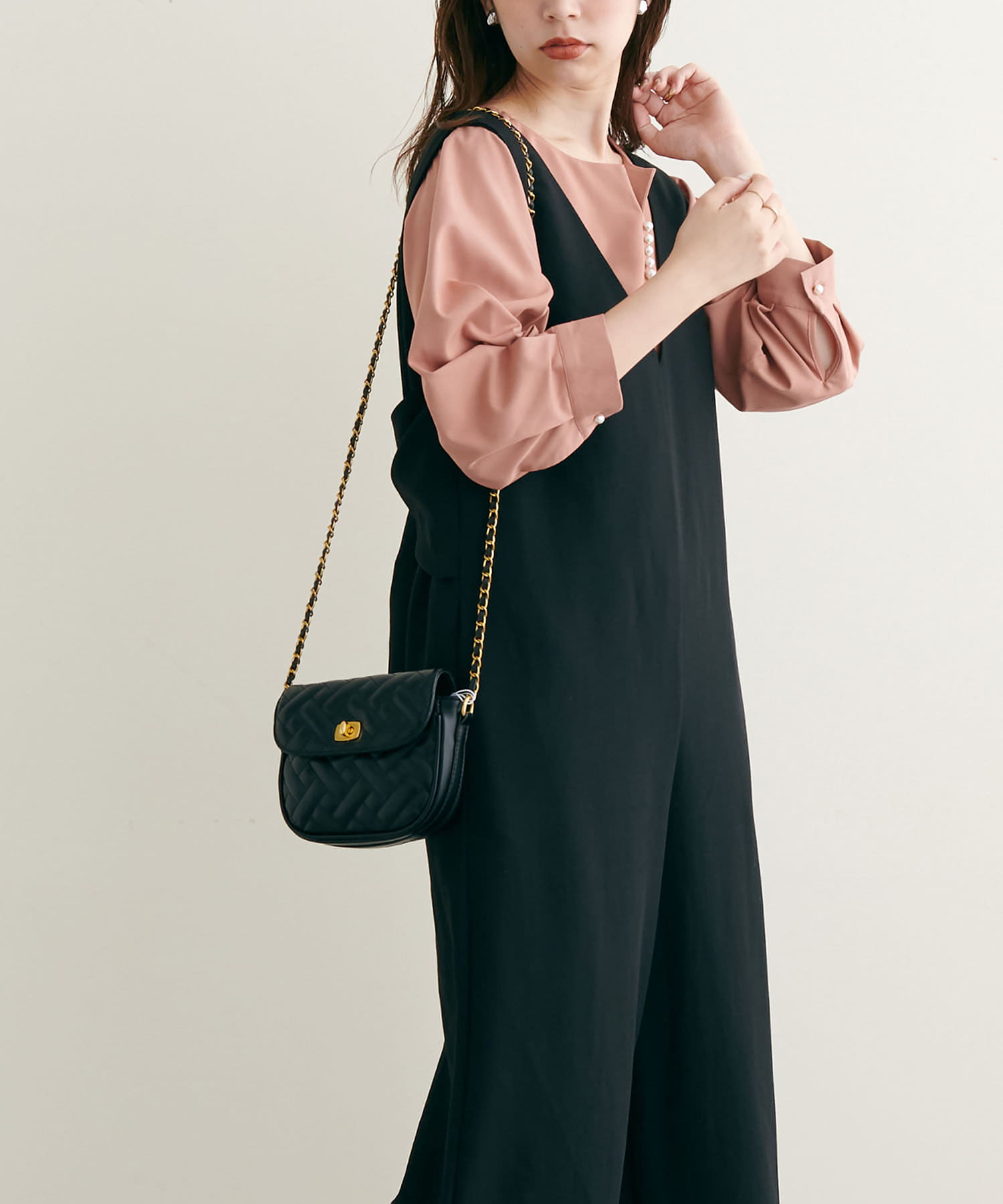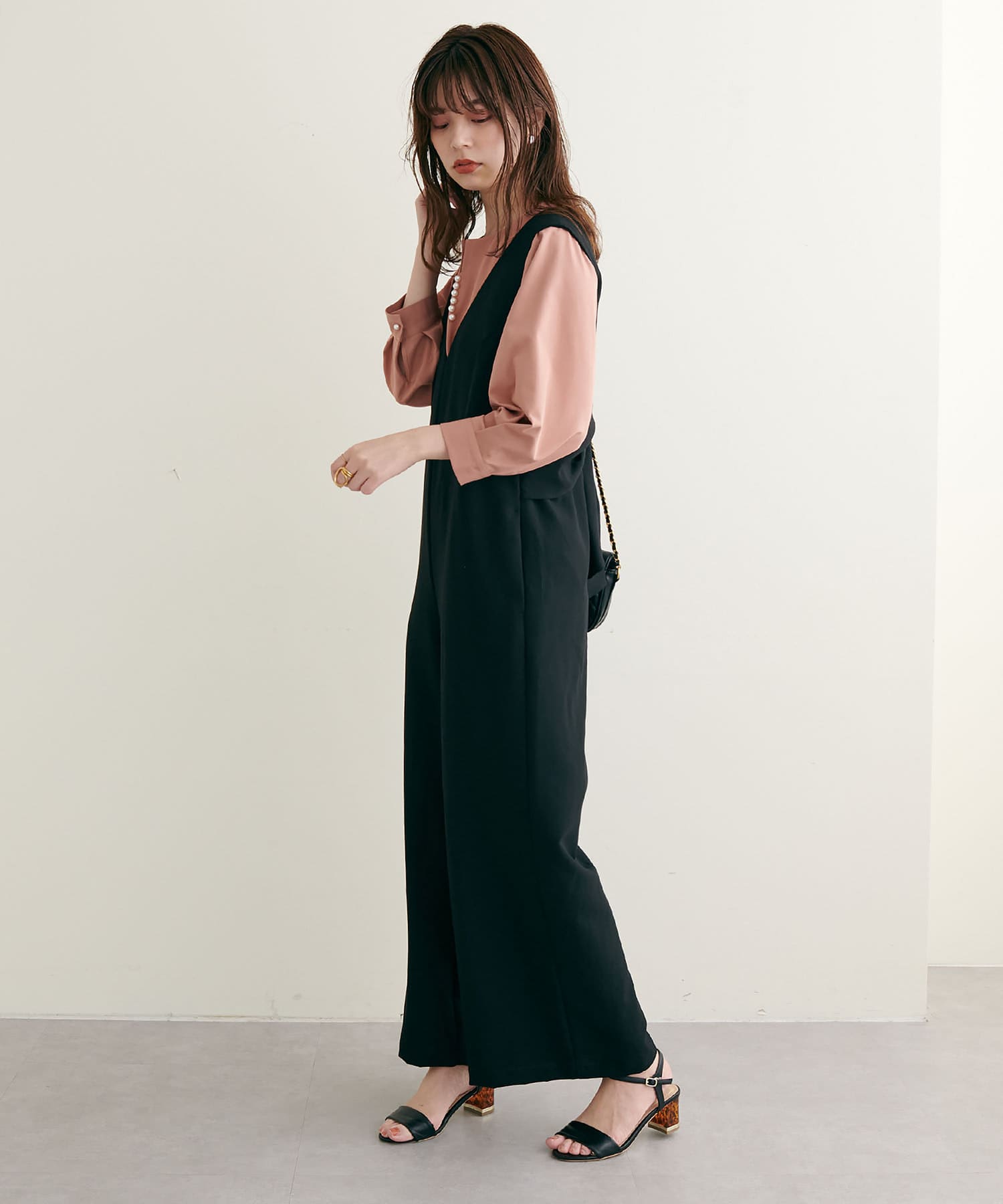 ゆるっとした深Vデザインのサロペットにインナーとして合わせても、フロントのパールがポイント見えして◎