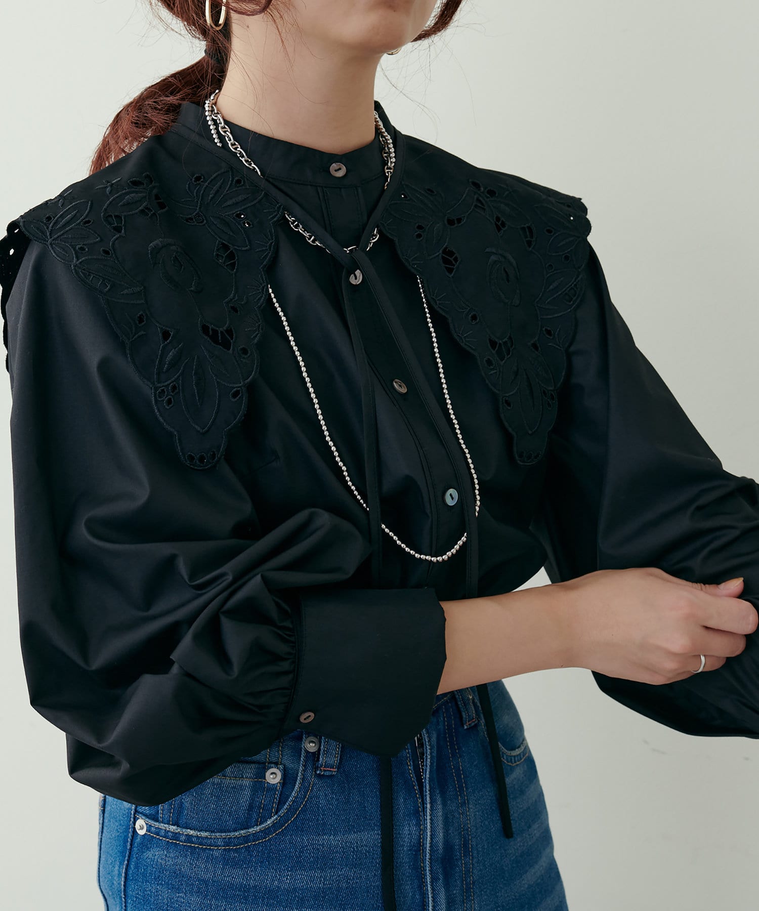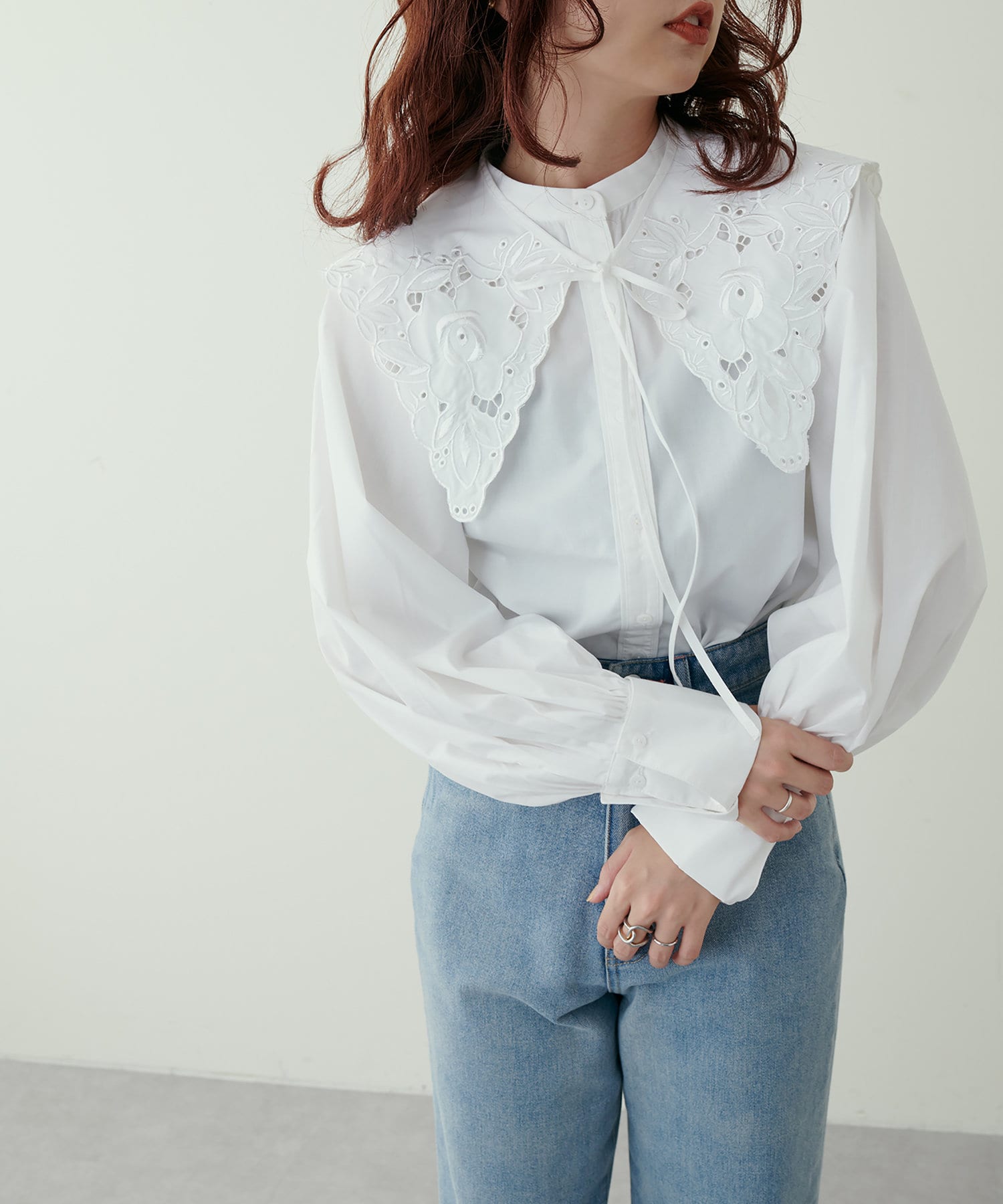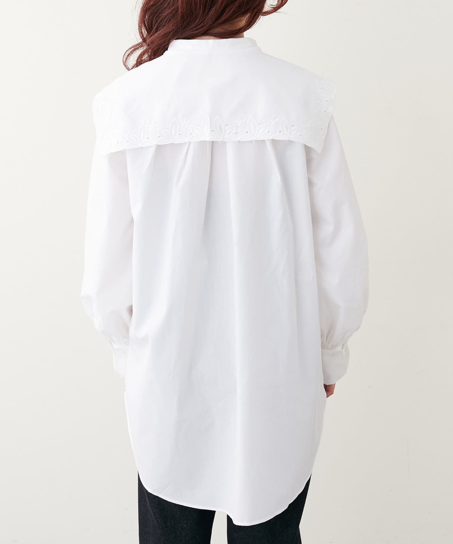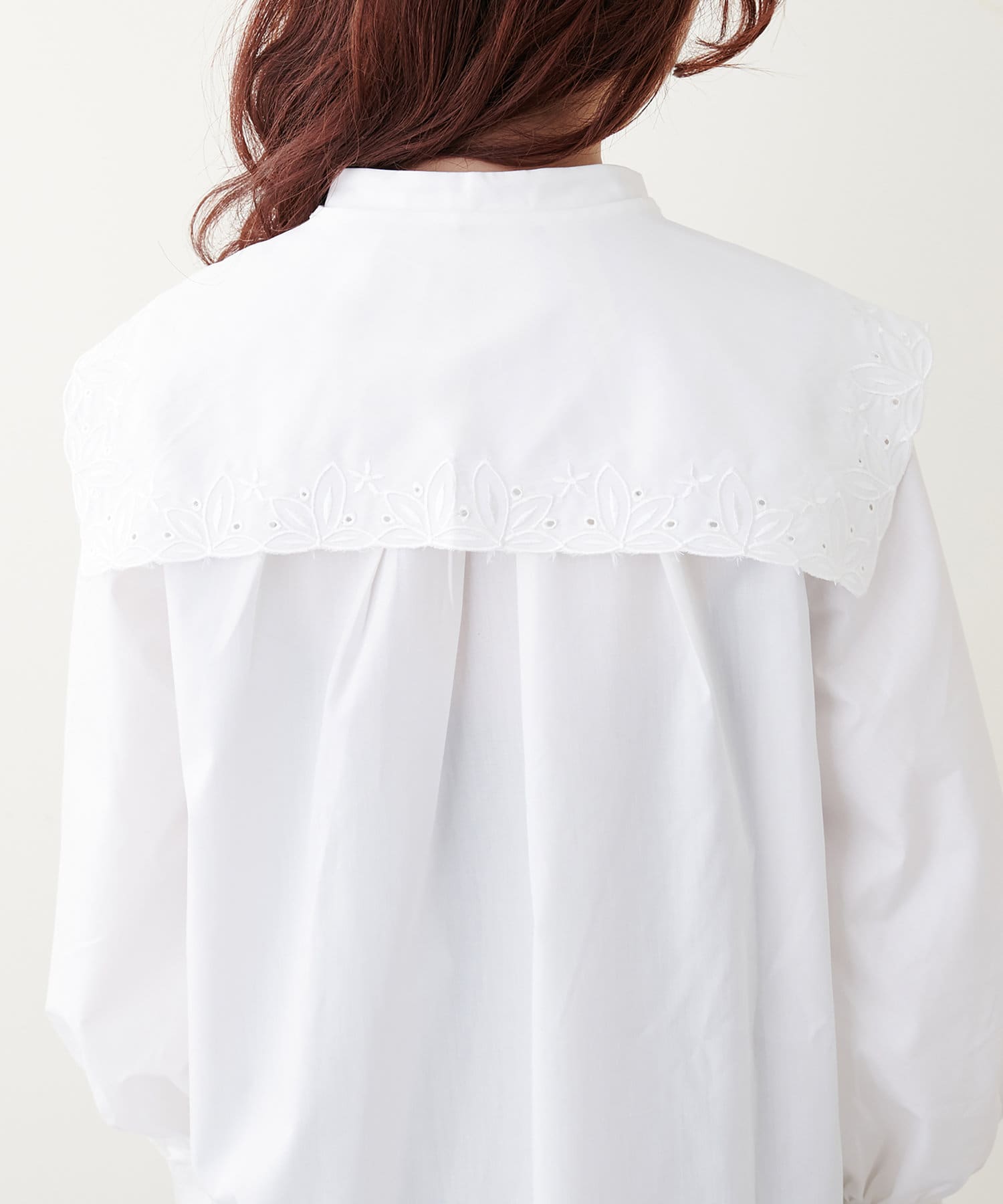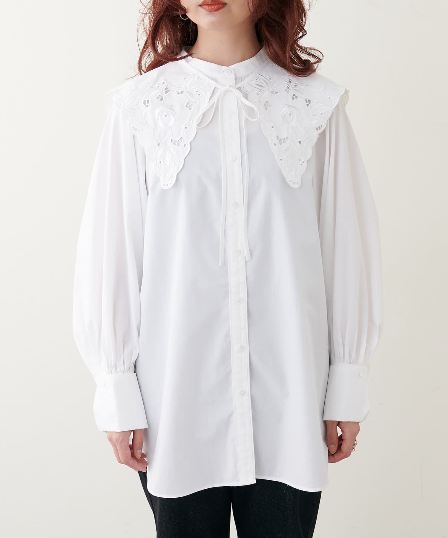 セーラーカラーのようなレース衿が付いたバンドカラーシャツ。