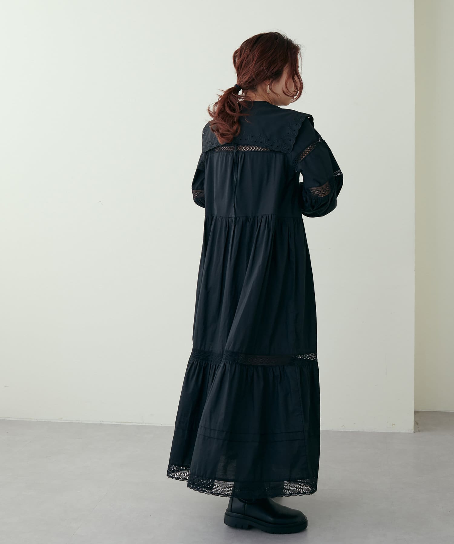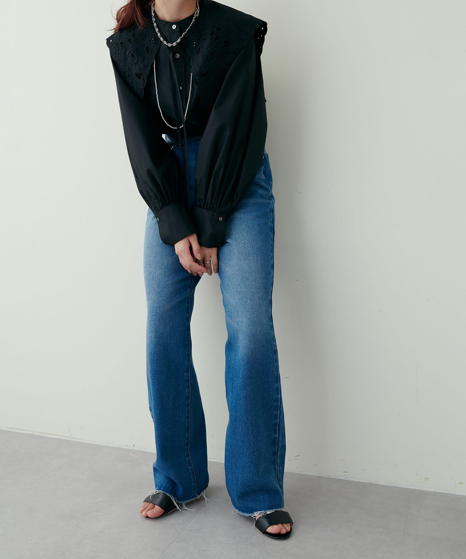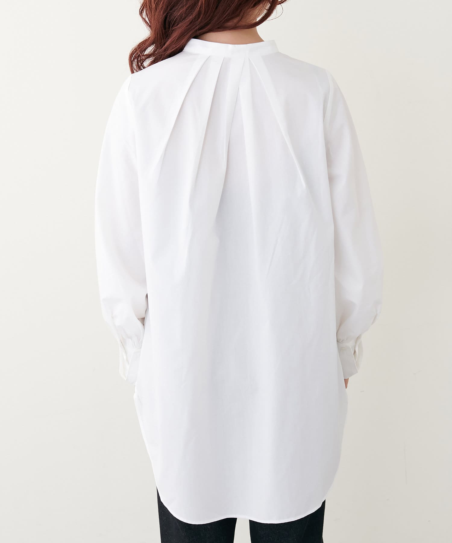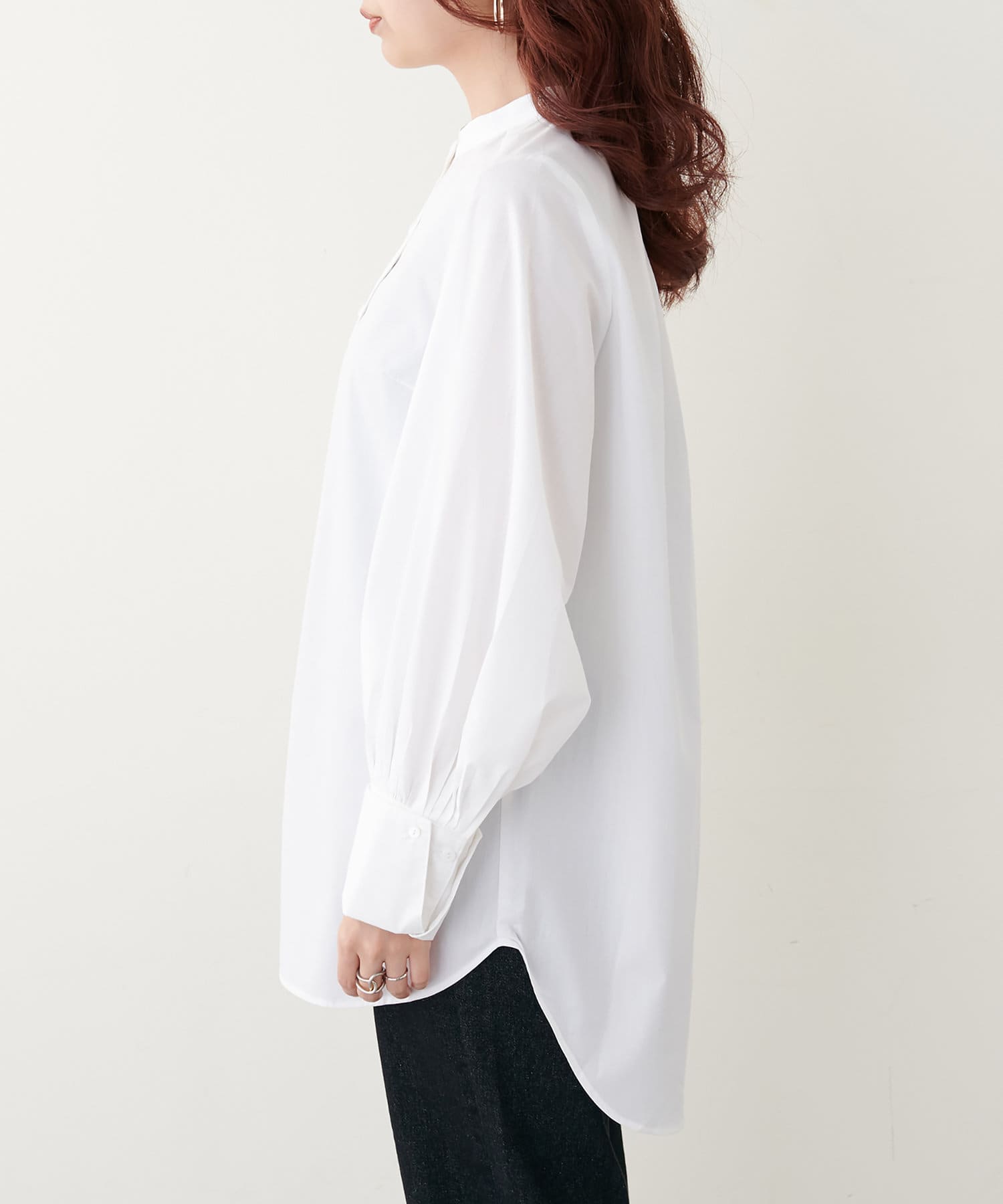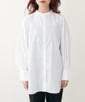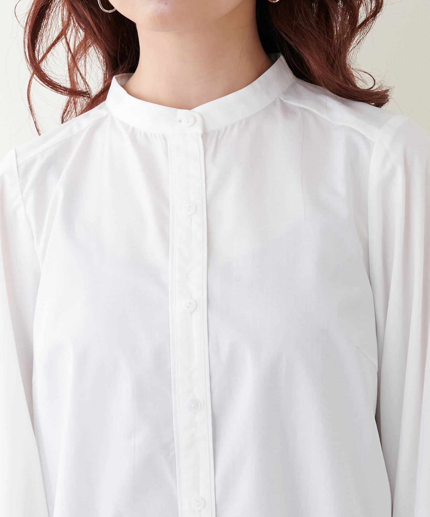 セーラーカラーのようなレース衿が付いたバンドカラーシャツ。