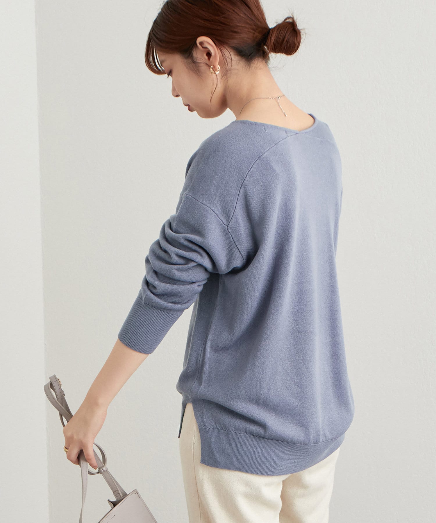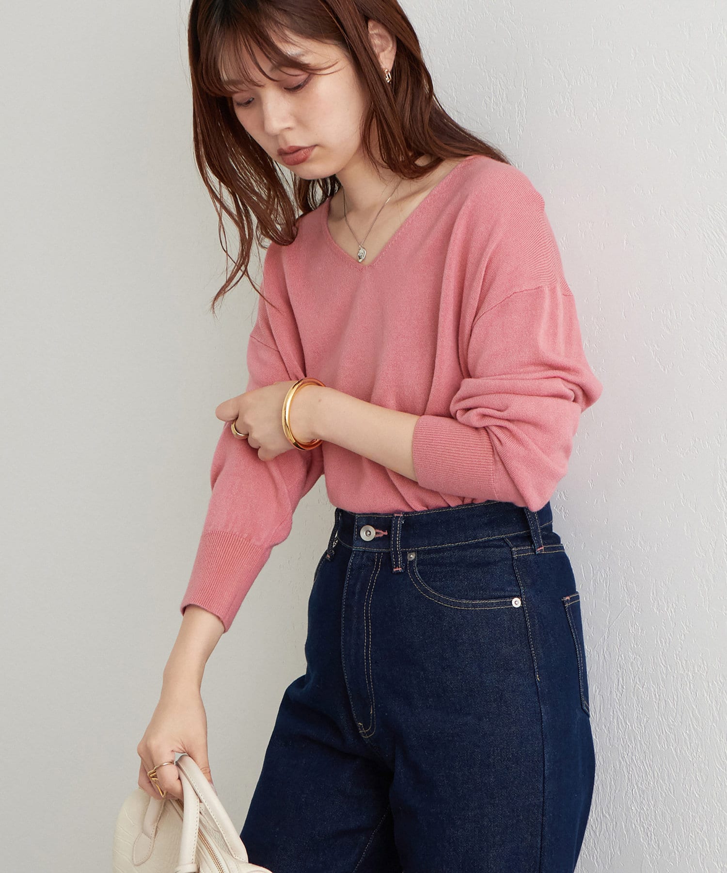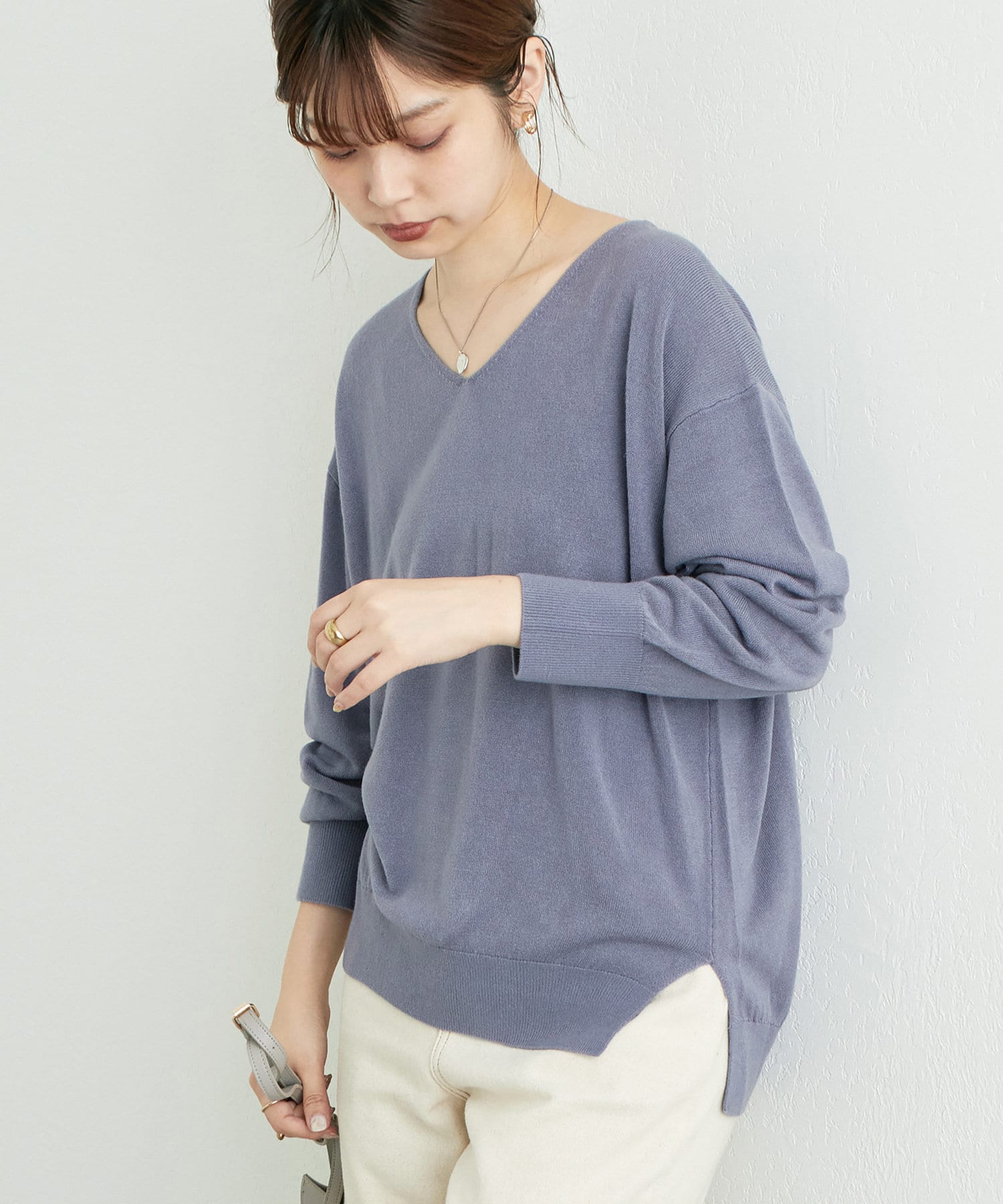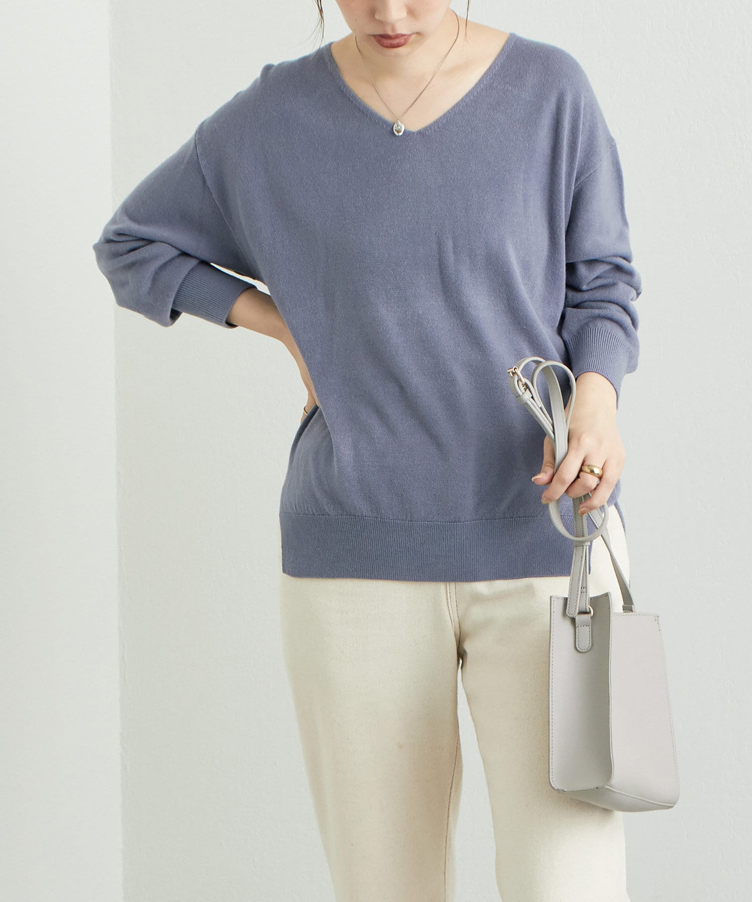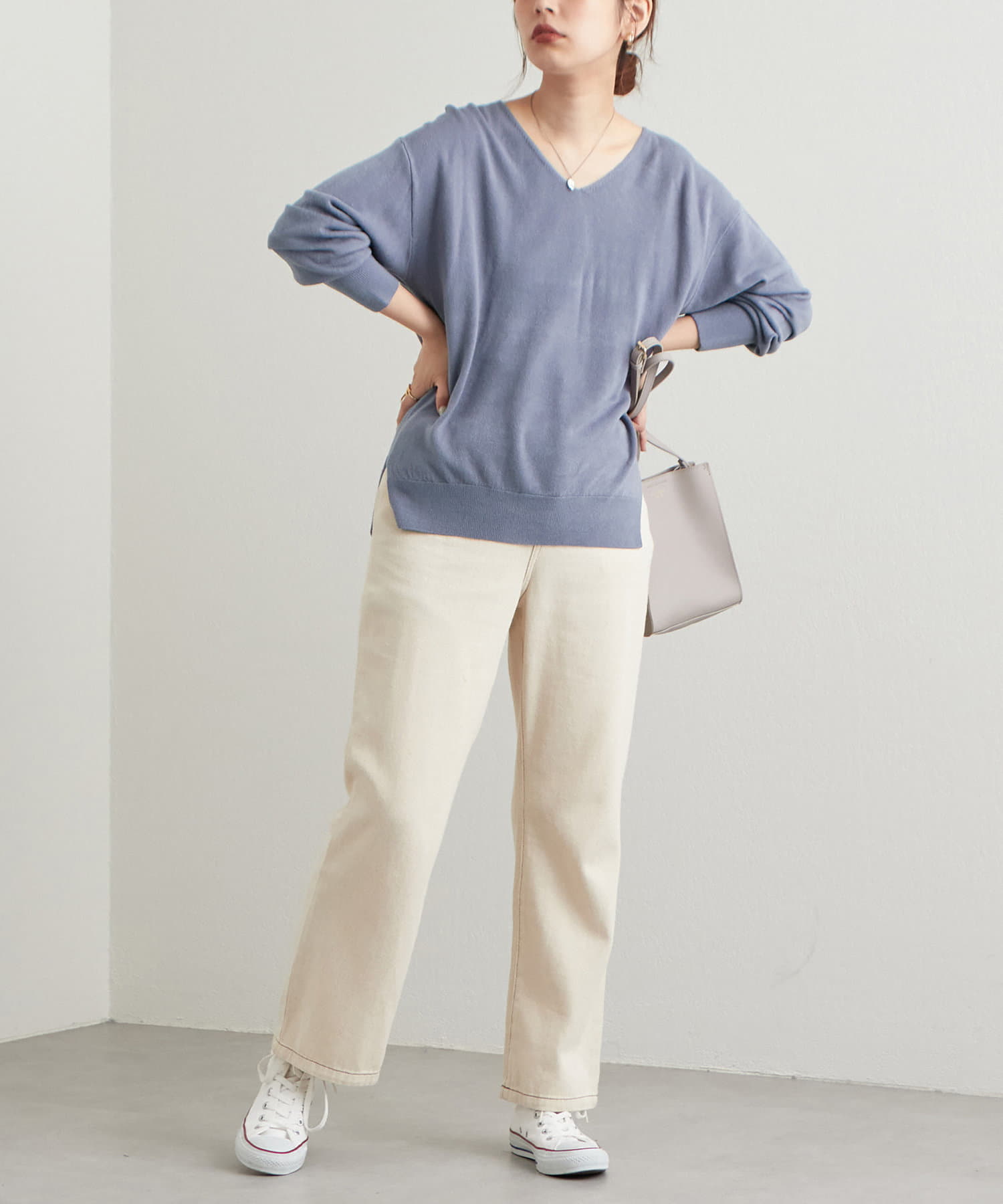 顔まわりをシャープに見せるVネックに、体のラインを拾いすぎないシルエットが重宝する1枚です。