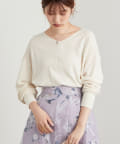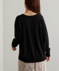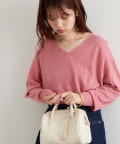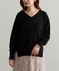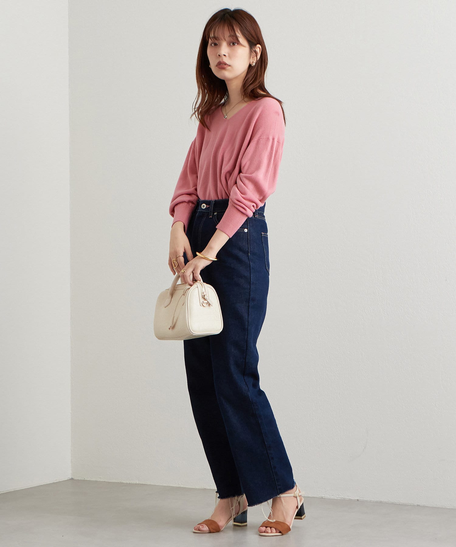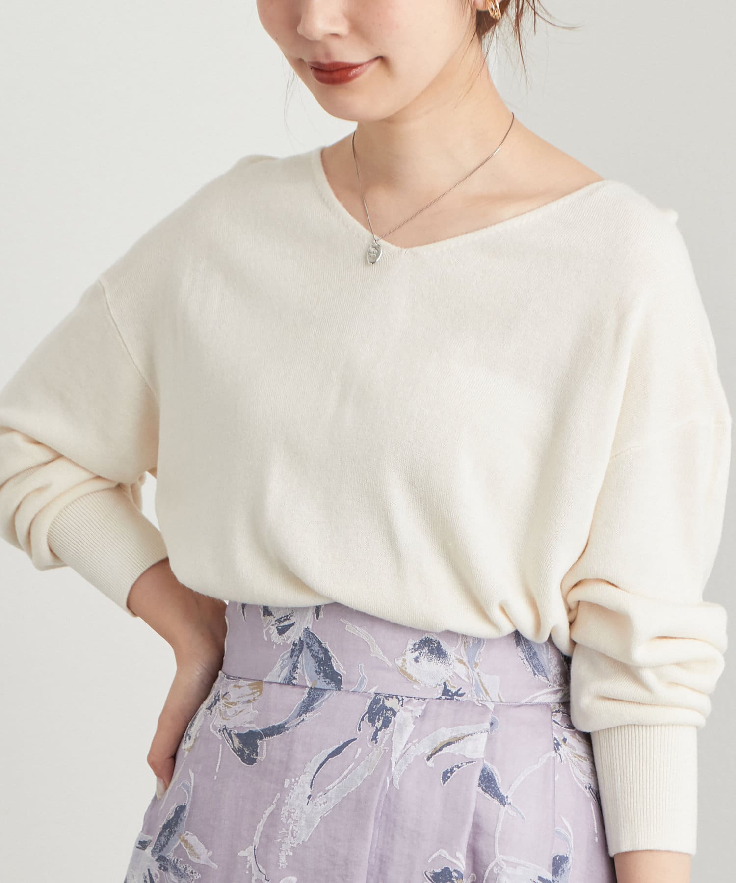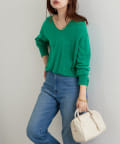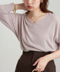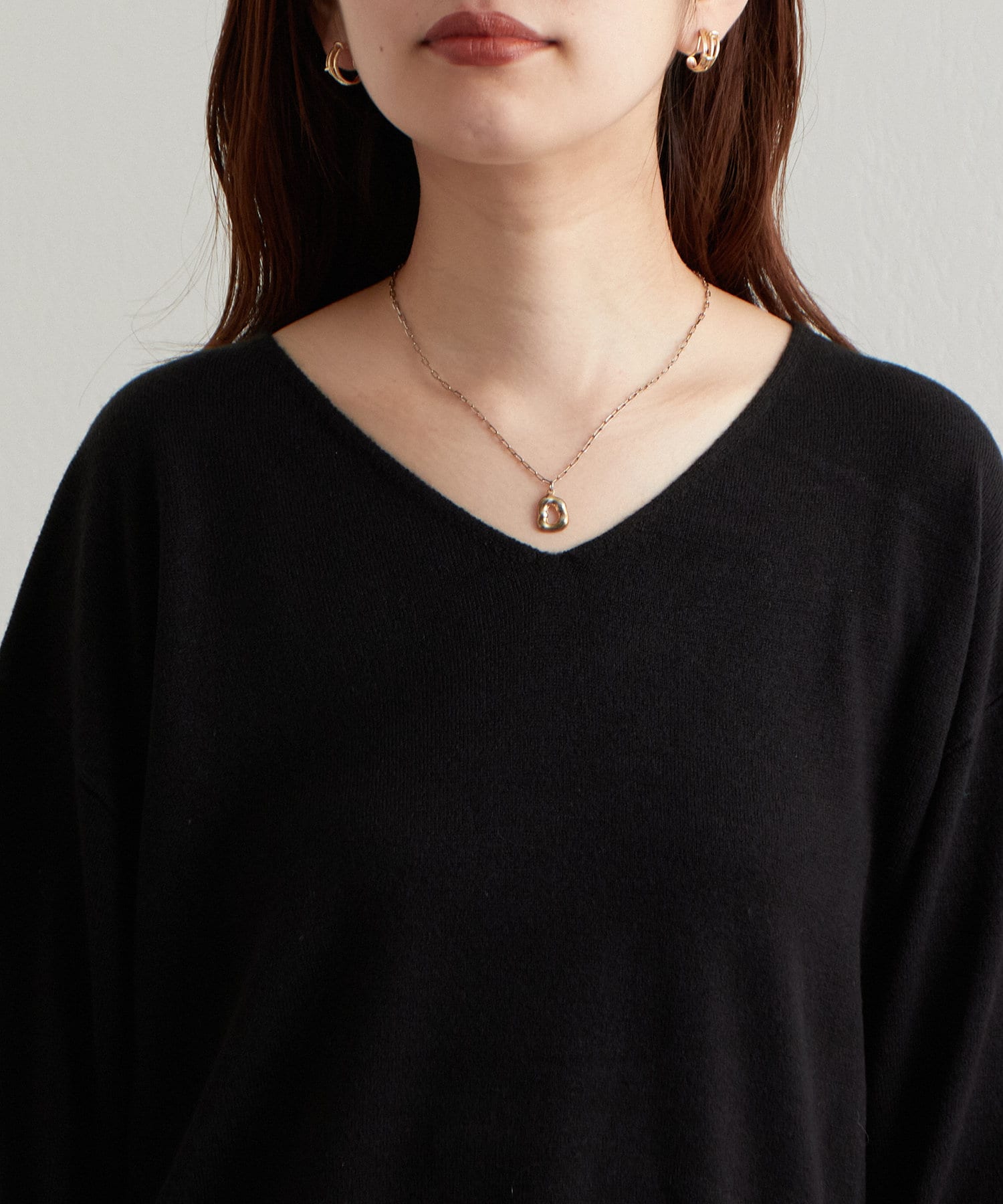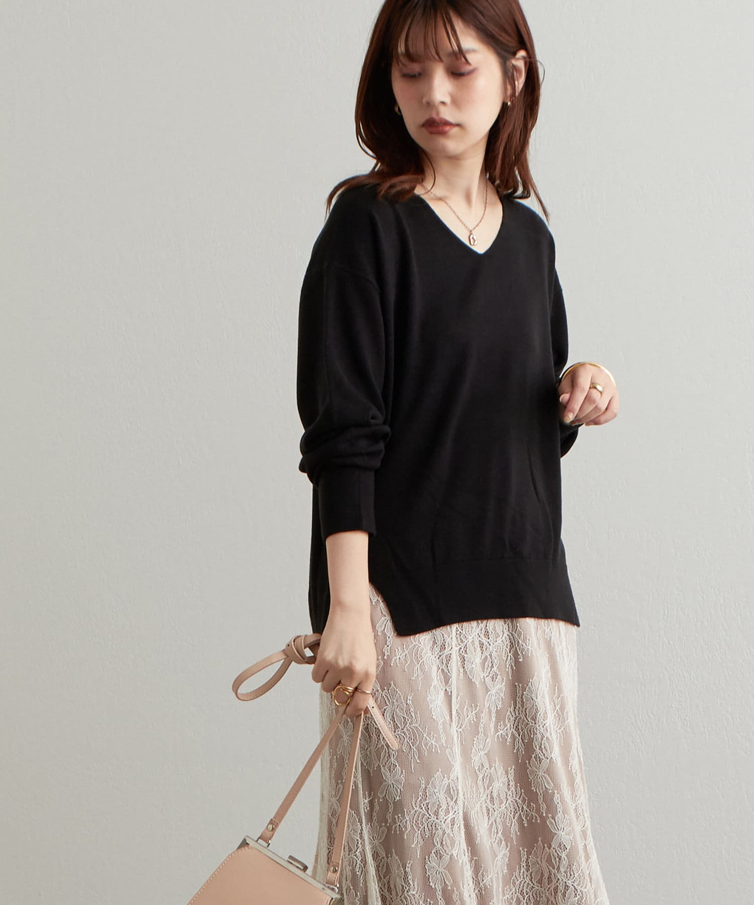 顔まわりをシャープに見せるVネックに、体のラインを拾いすぎないシルエットが重宝する1枚です。