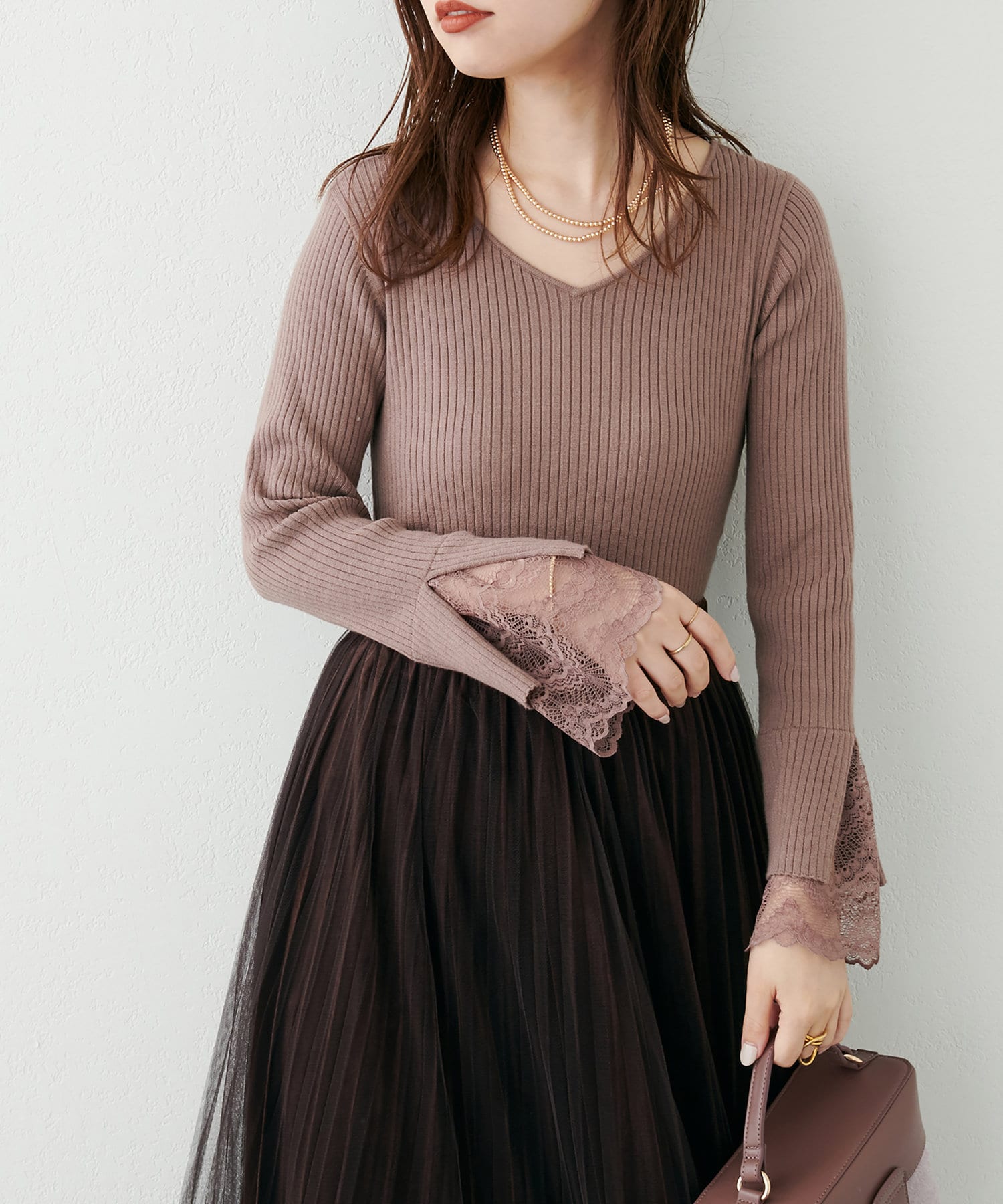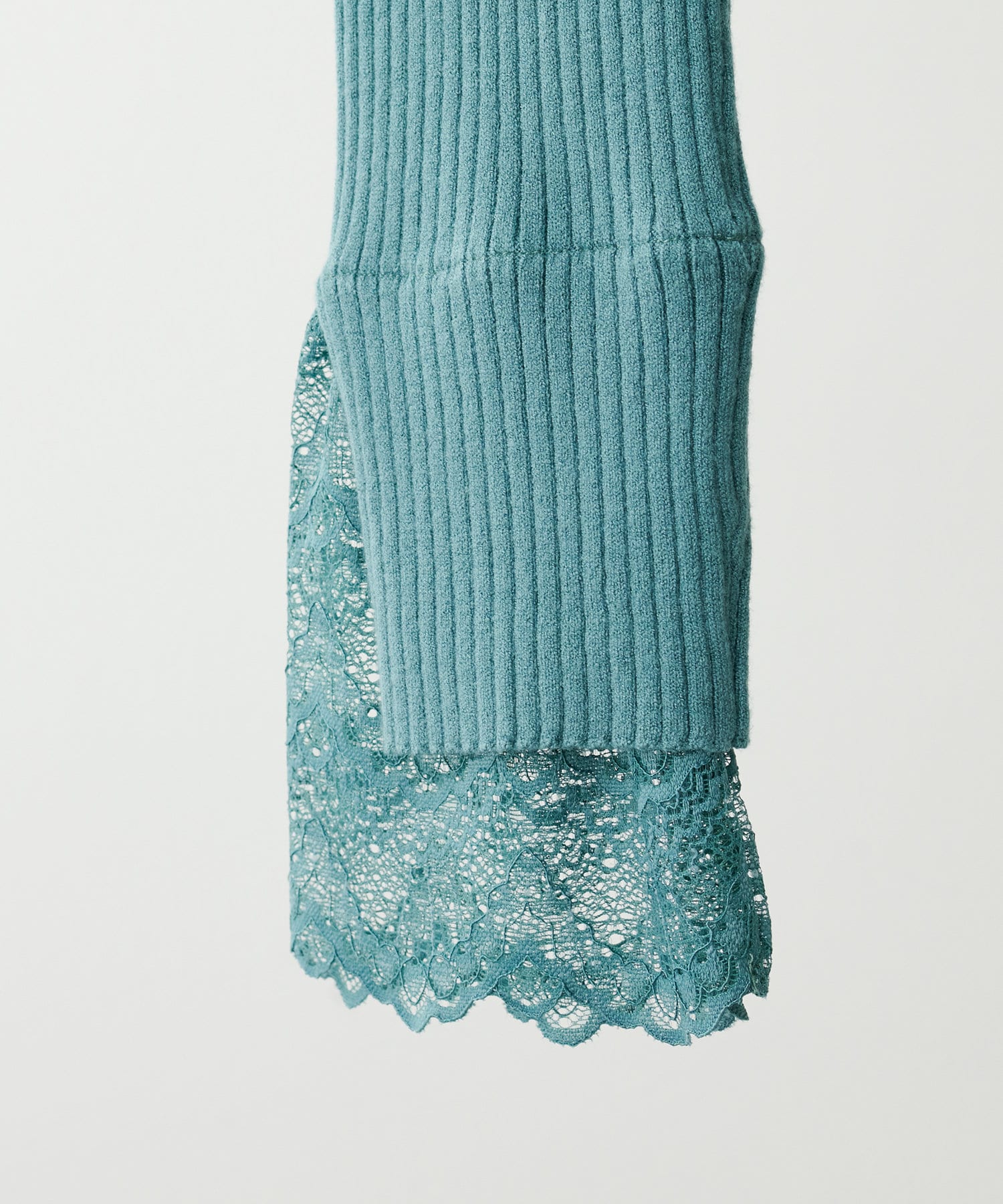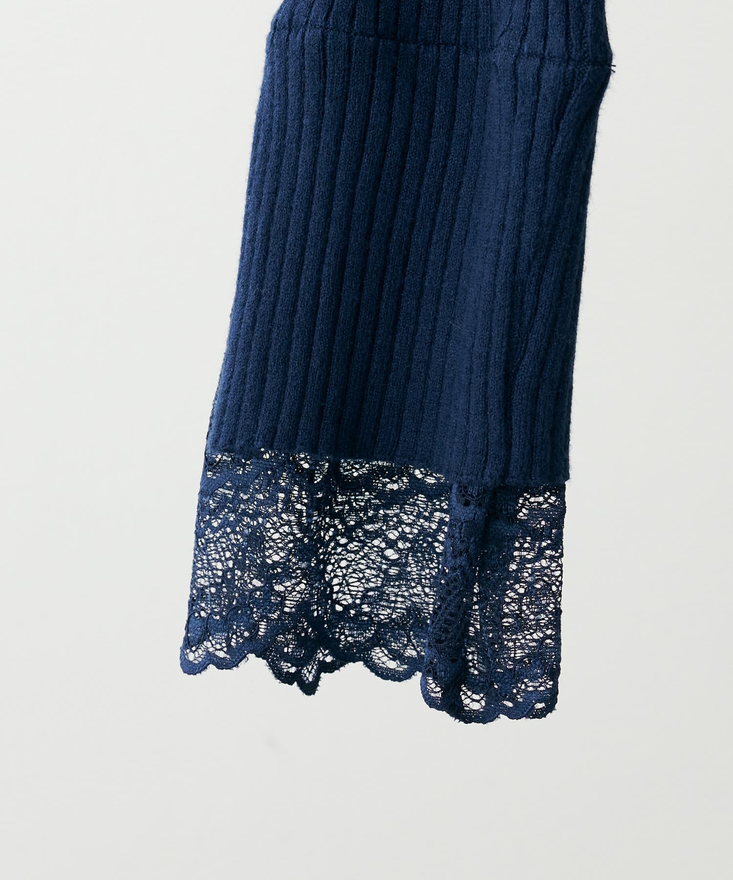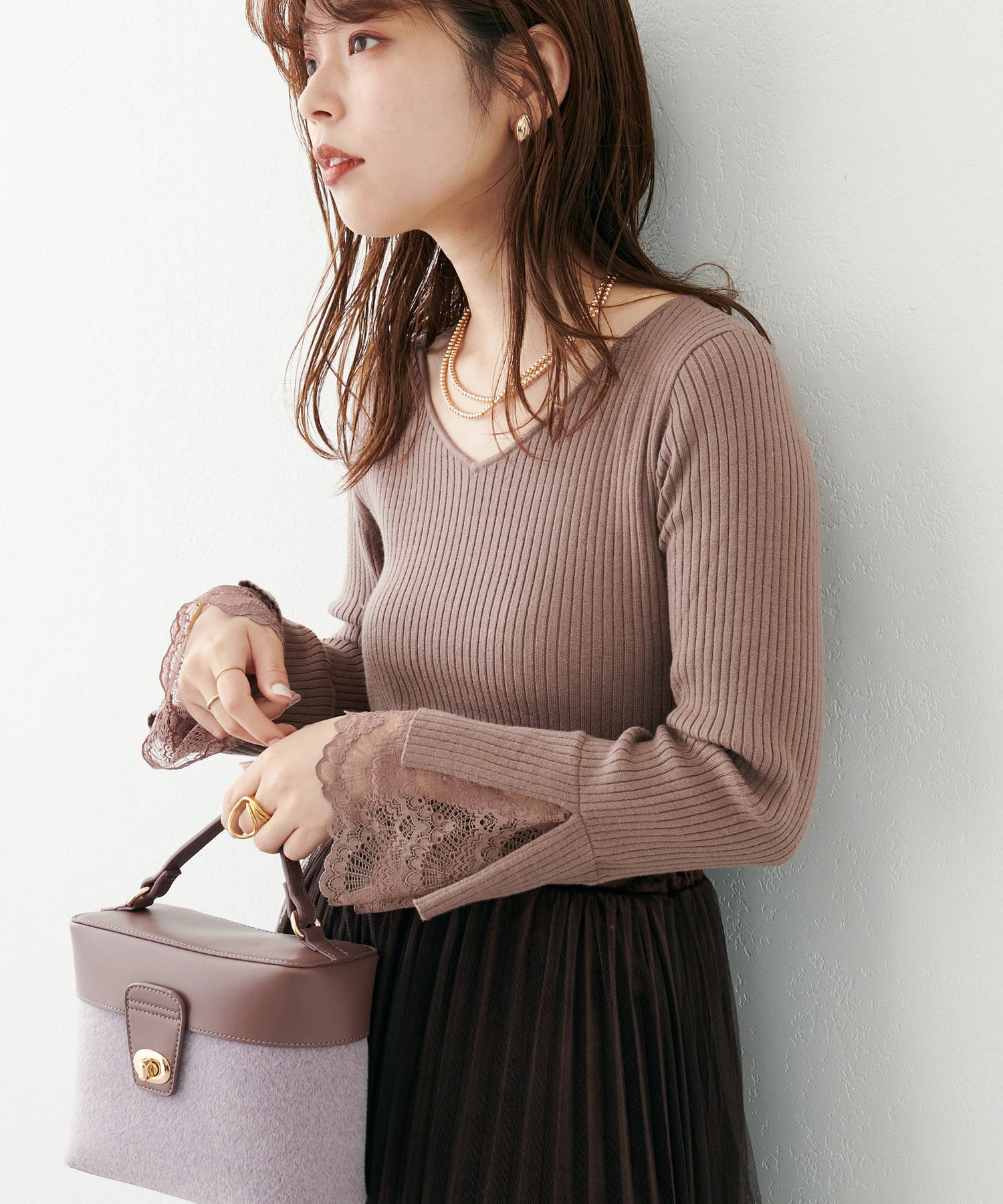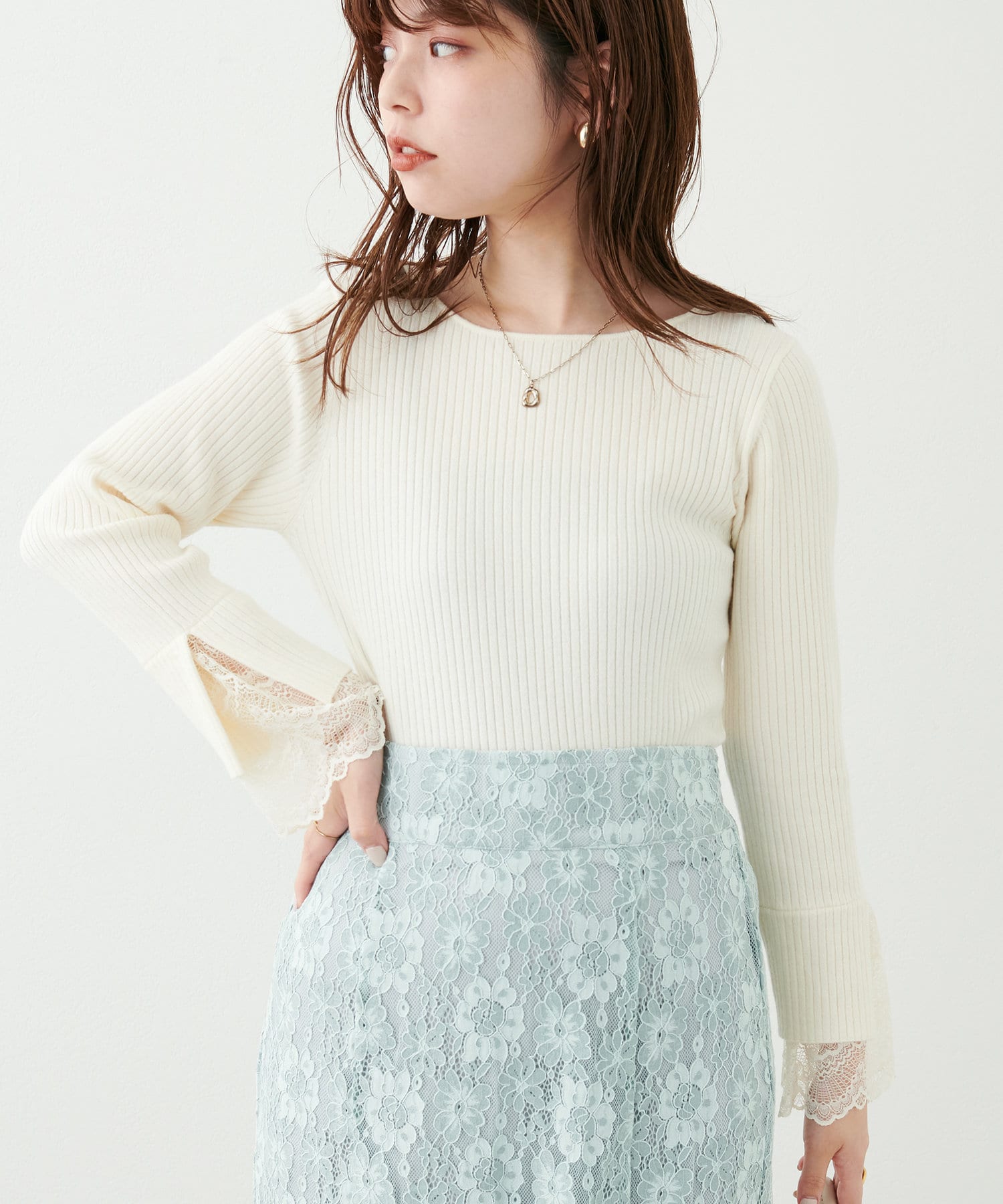 ニットの袖口には大きく切り込みをいれ、内側のレースでほんのり甘さもプラス。